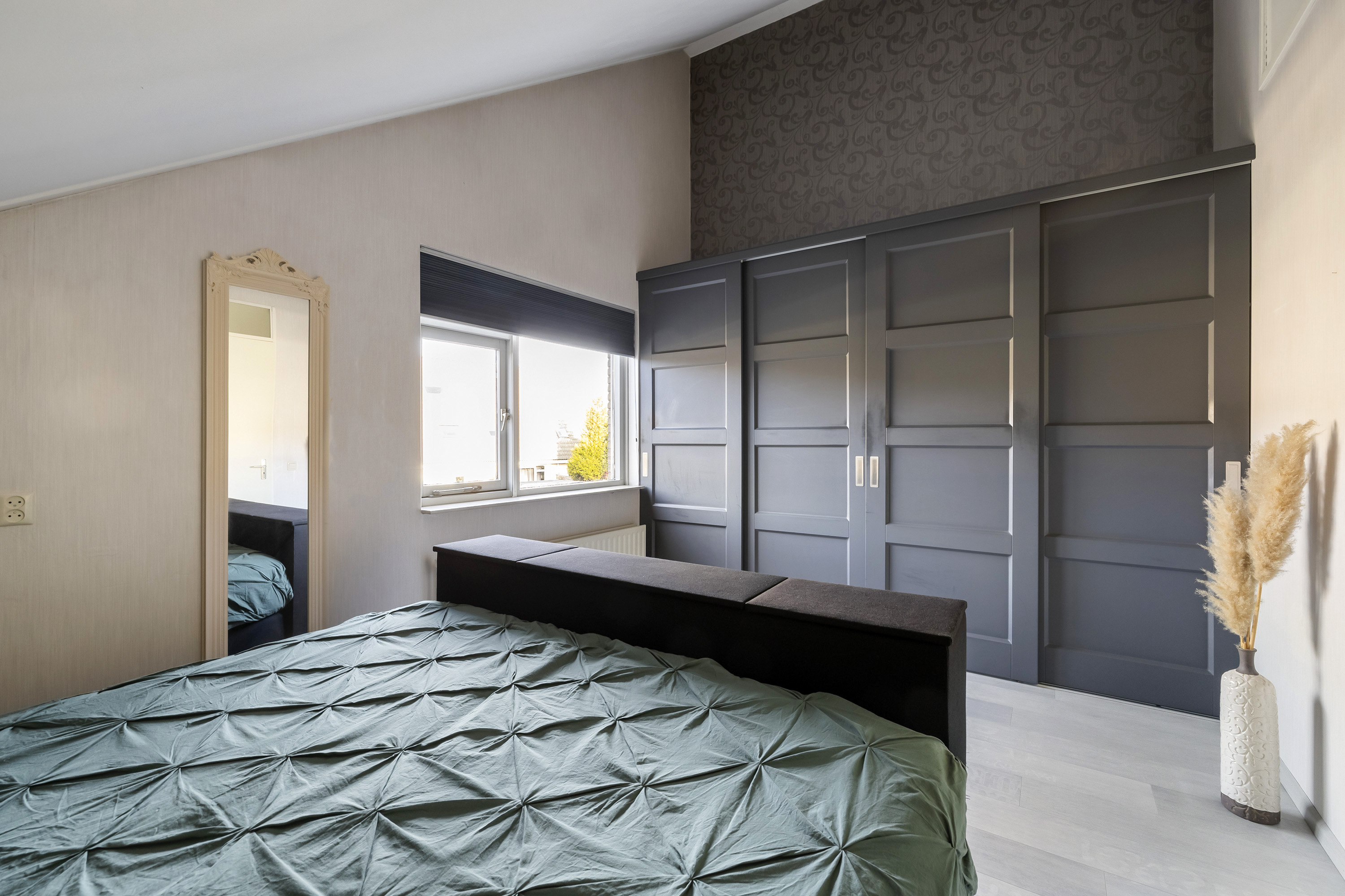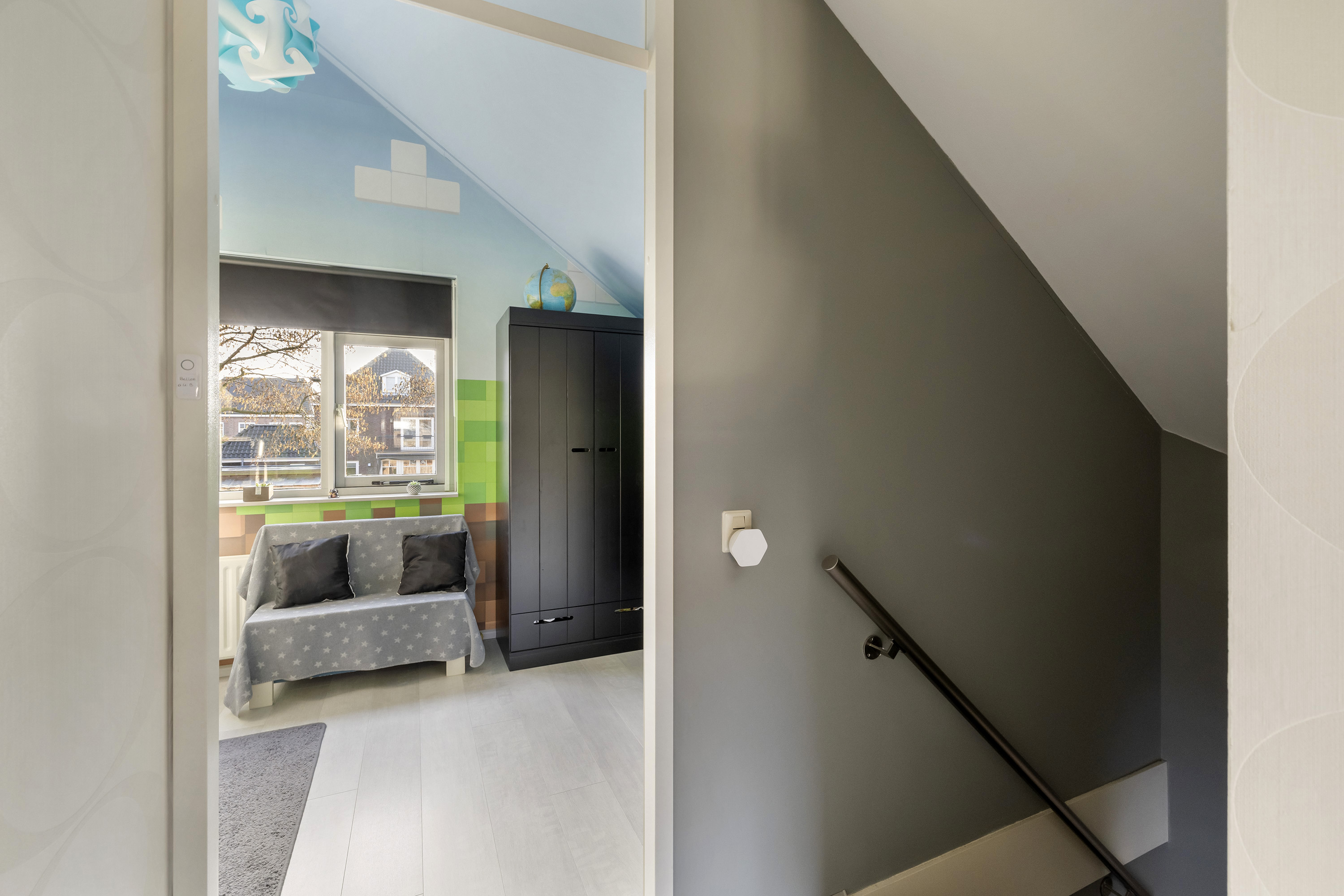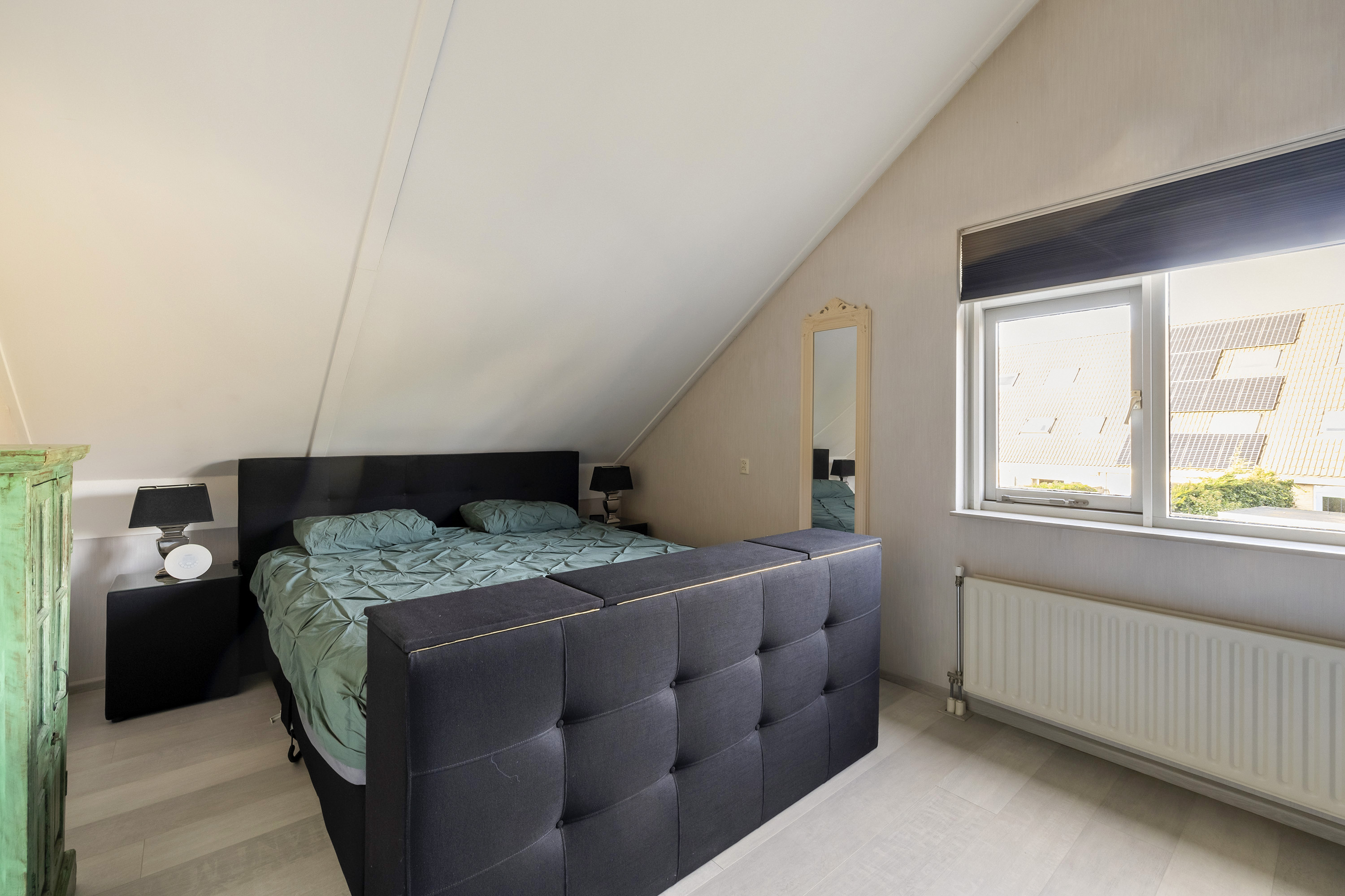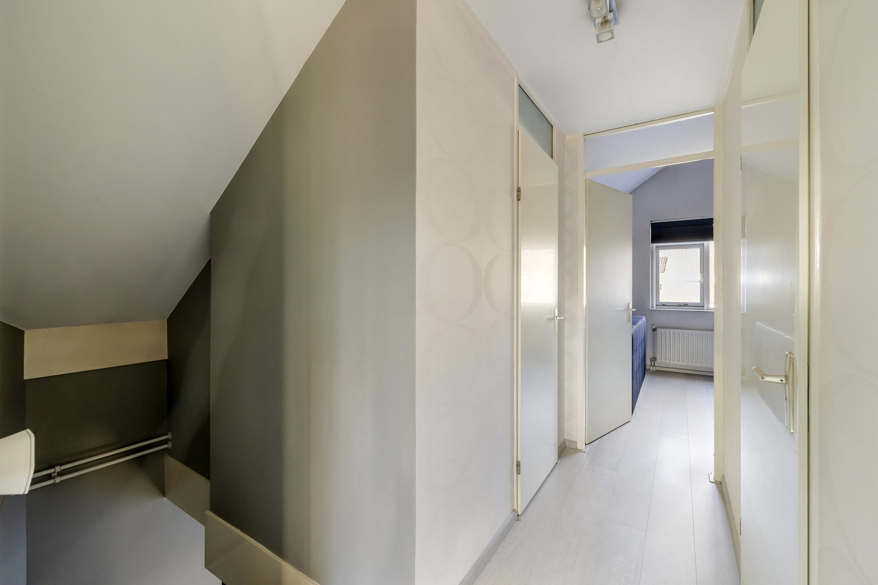 De overloop biedt toegang tot twee slaapkamers, de badkamer en de technische ruimte. De hoofdslaapkamer is gelegen aan de achterzijde van de woning en beschikt over een vaste schuifdeurkast. Vanuit deze slaapkamer is de bergvliering in de nok bereikbaar, waar de mechanische ventilatie-unit is opgesteld. De tweede slaapkamer ligt aan de voorzijde van de woning en is voorzien van knieschotbergruimte. De badkamer is voorzien van een ligbad met douche voorziening, toilet en wastafel. In de technische ruimte bevinden zich de warmtepomp met boiler (6 kW, 250 liter Daikin, 2024). De verdieping is afgewerkt met een laminaat vloer.