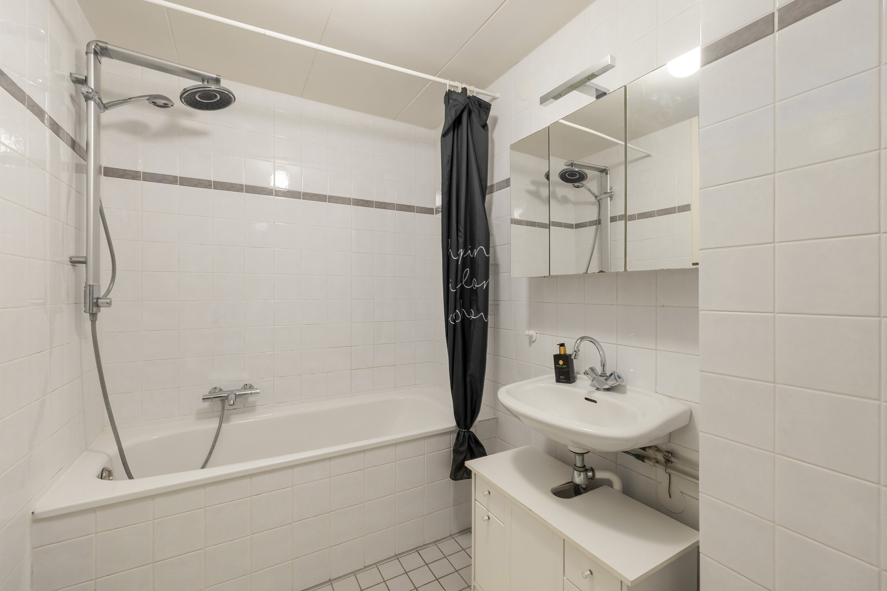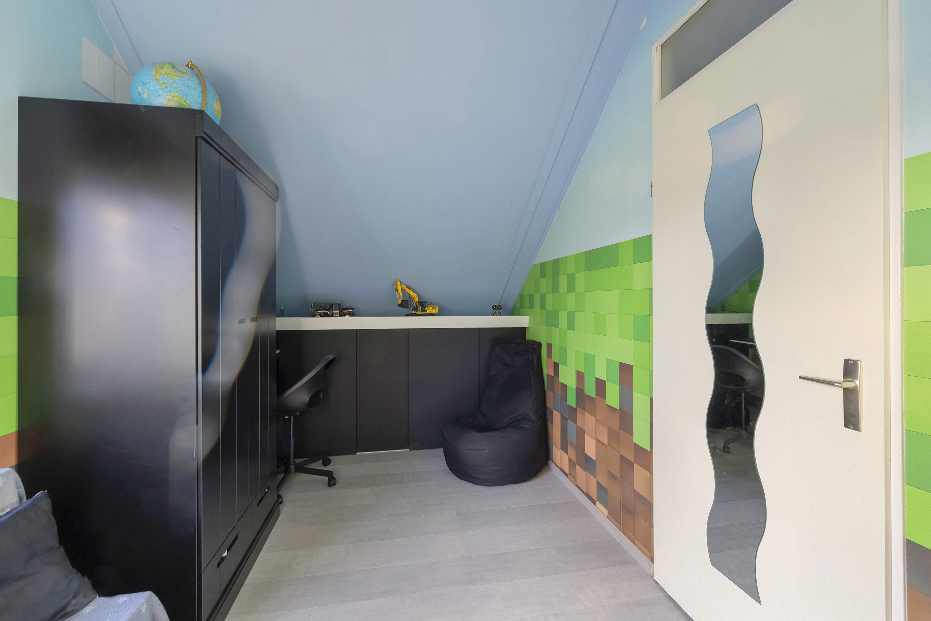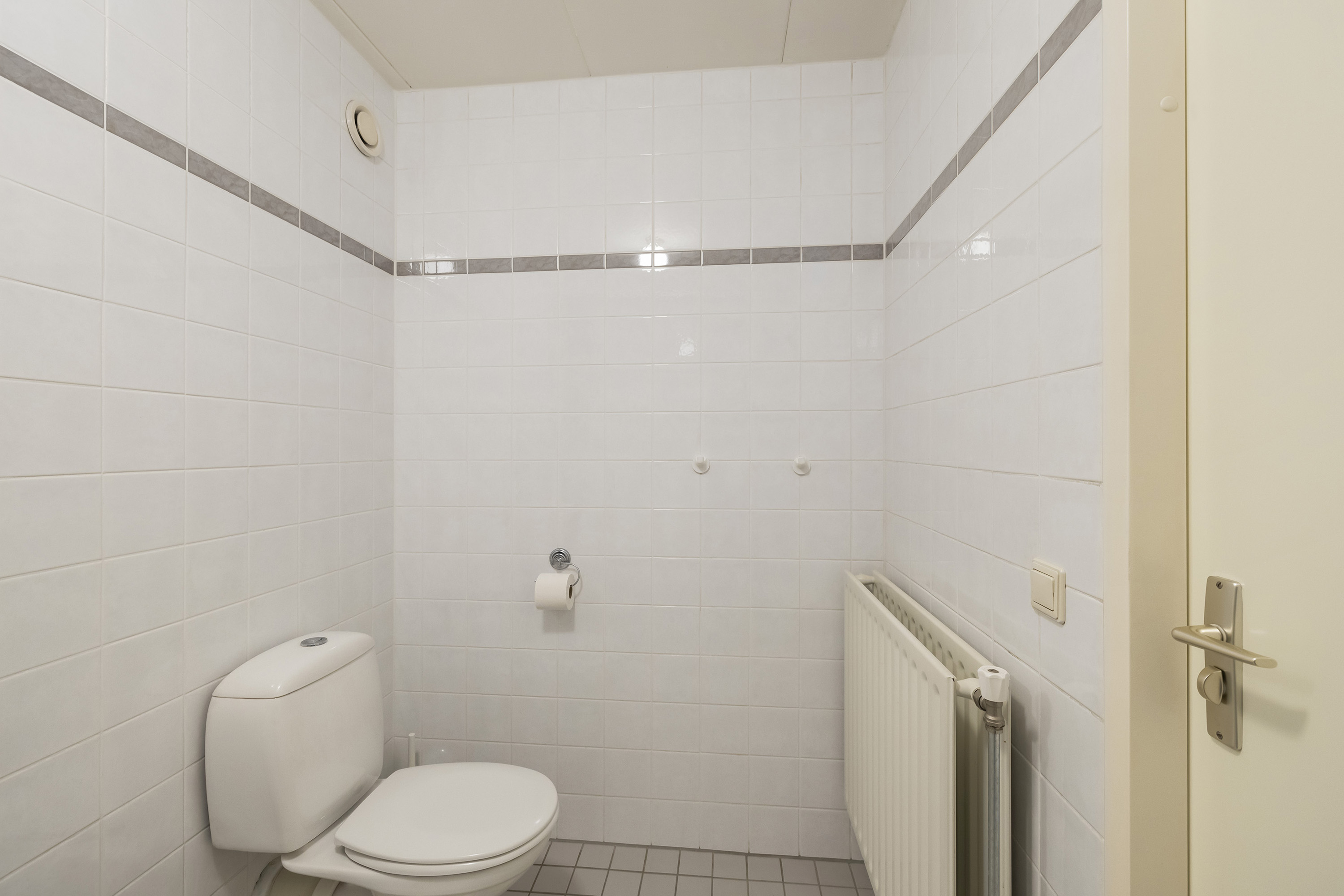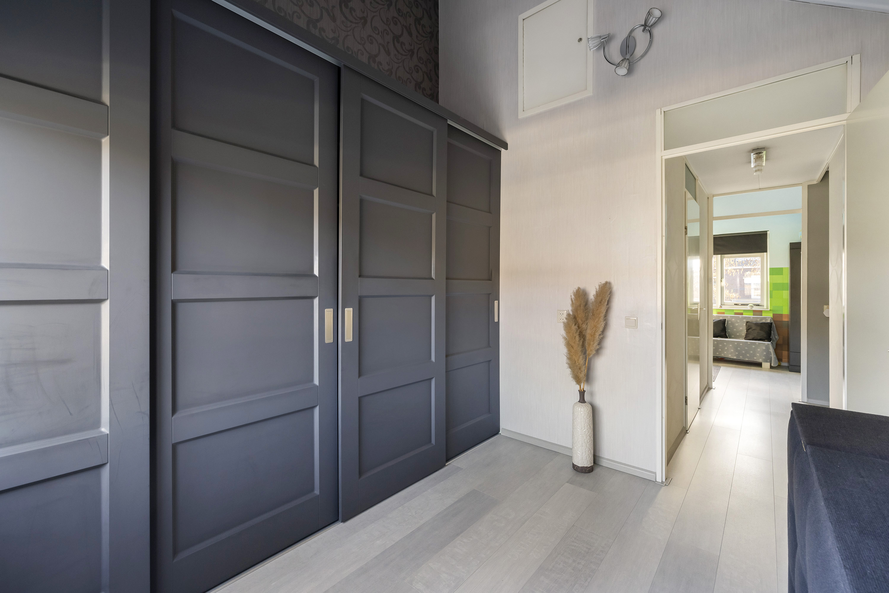 De overloop biedt toegang tot twee slaapkamers, de badkamer en de technische ruimte. De hoofdslaapkamer is gelegen aan de achterzijde van de woning en beschikt over een vaste schuifdeurkast. Vanuit deze slaapkamer is de bergvliering in de nok bereikbaar, waar de mechanische ventilatie-unit is opgesteld. De tweede slaapkamer ligt aan de voorzijde van de woning en is voorzien van knieschotbergruimte. De badkamer is voorzien van een ligbad met douche voorziening, toilet en wastafel. In de technische ruimte bevinden zich de warmtepomp met boiler (6 kW, 250 liter Daikin, 2024). De verdieping is afgewerkt met een laminaat vloer.