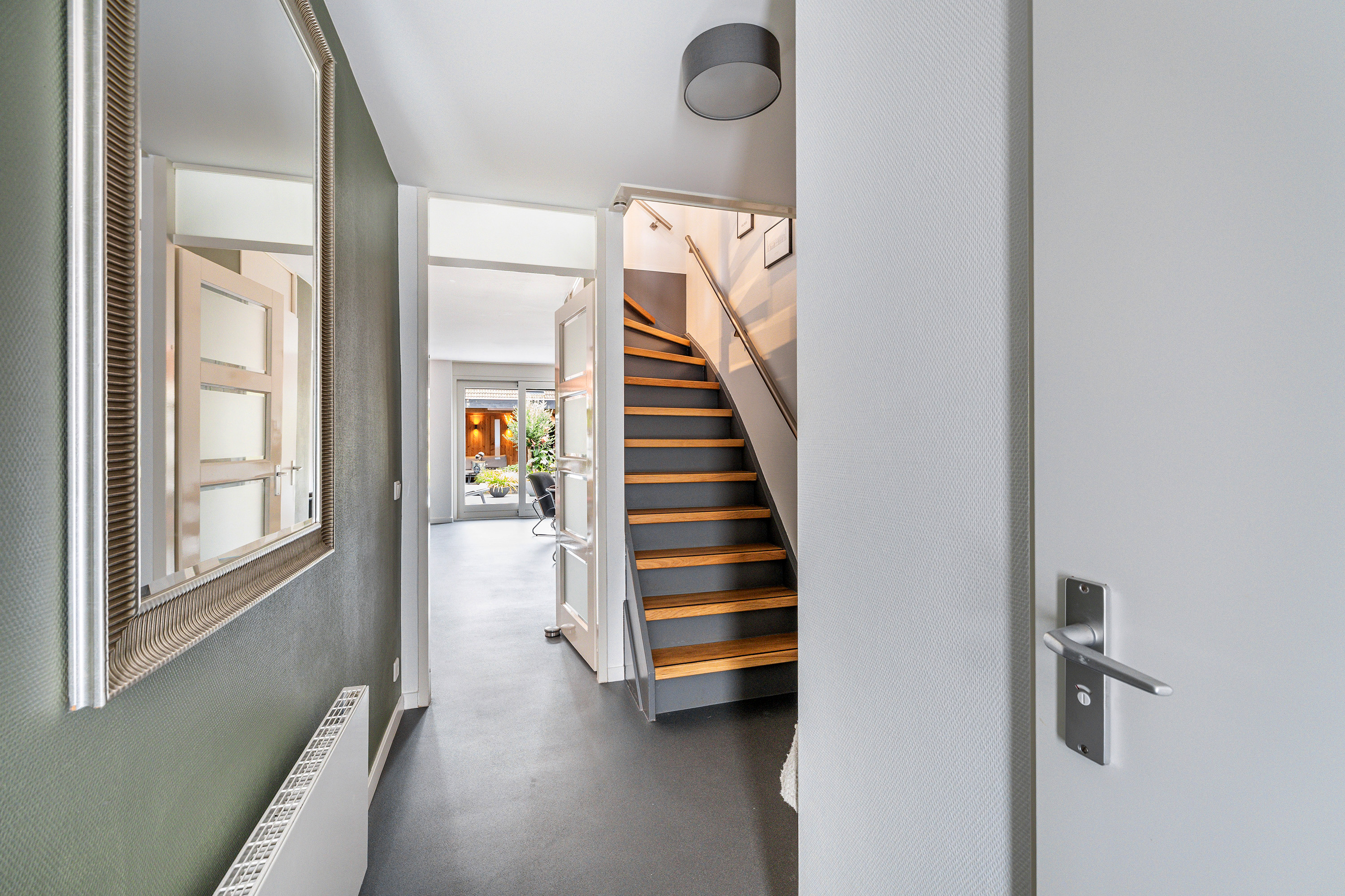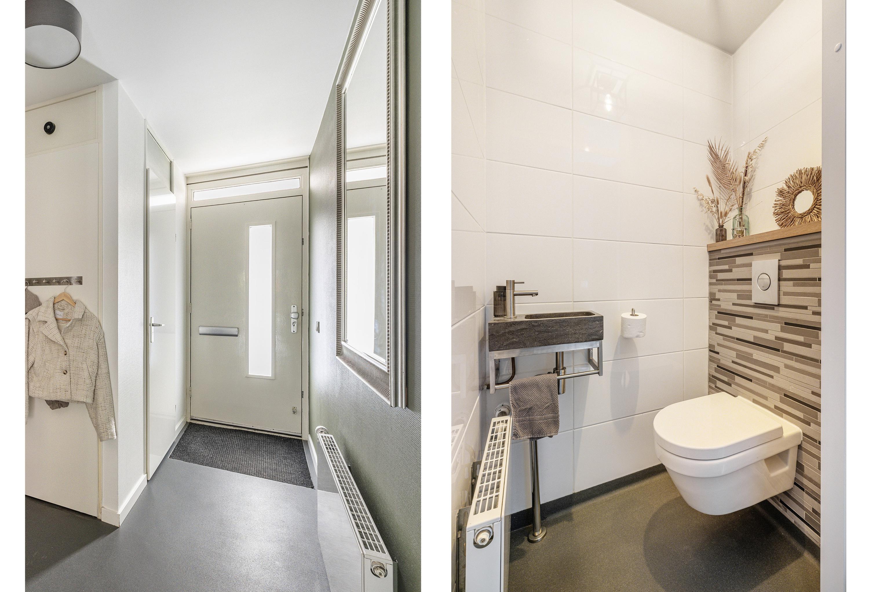 Je komt binnen in de hal waar je direct het volledig betegelde toilet met hangend closet en fontein vindt. In de hal zit verder nog de meterkast, de deur naar de garage en de trap naar de 1e verdieping. Loop je verder, dan kom je in de ruime woonkamer die dankzij de ramen en de schuifpui heerlijk licht is. De woonkamer is voorzien van een praktische trapkast, een cinewall met een gezellige gashaard en een schuifpui die toegang geeft tot de achtertuin.