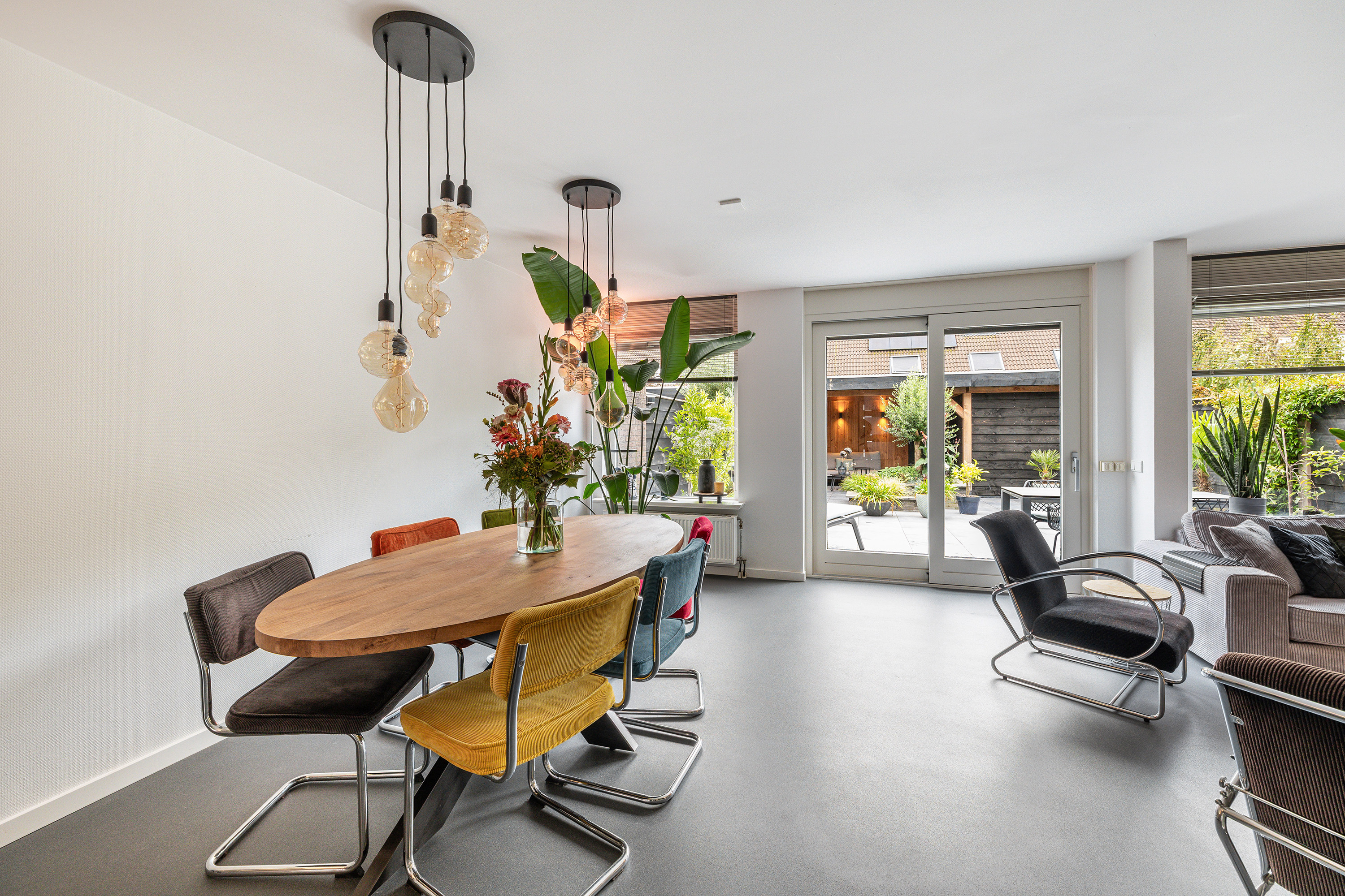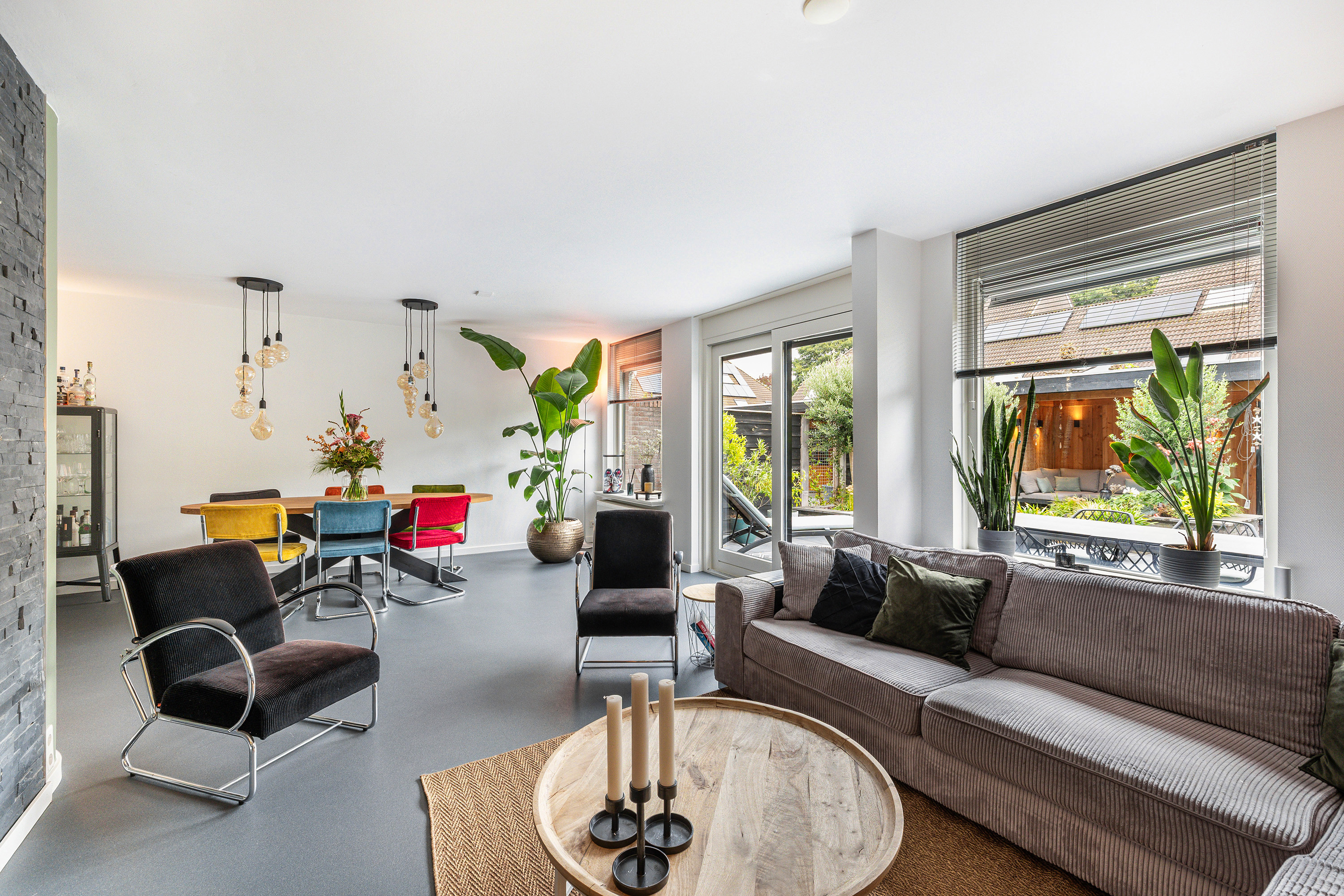 - De achtergevel op de begane is voorzien van een elektrische zonwering.