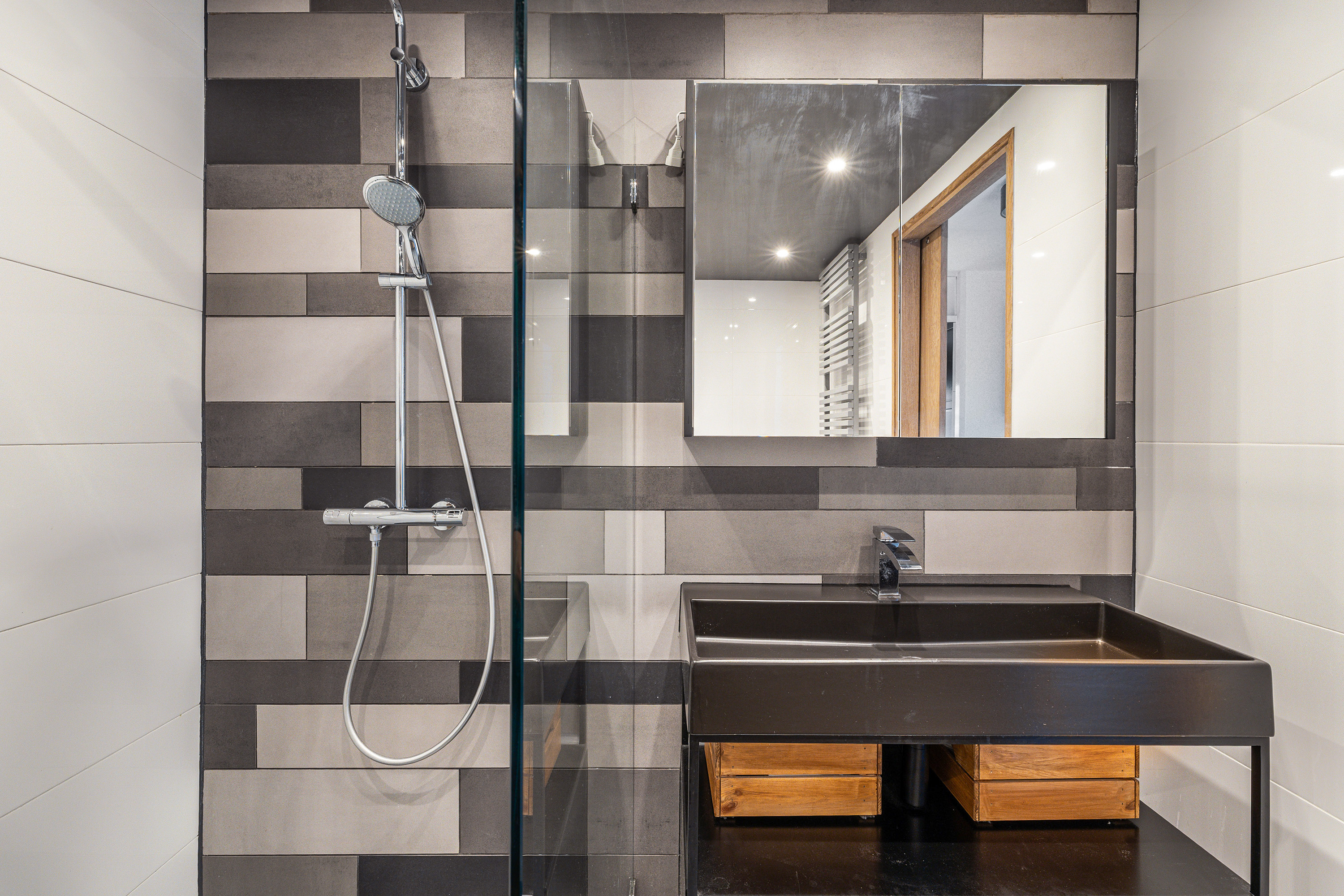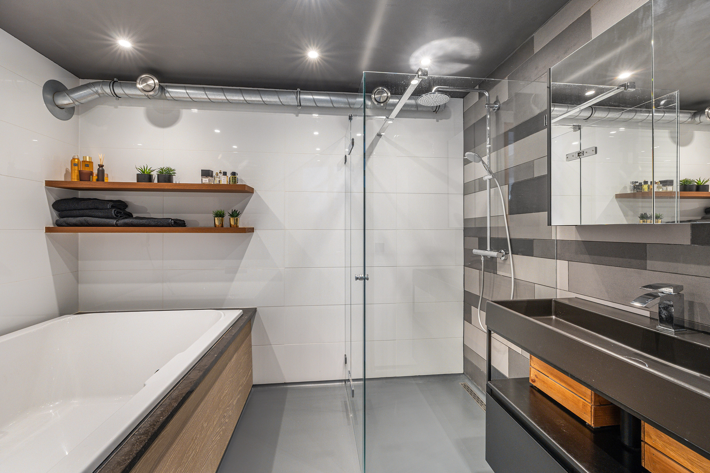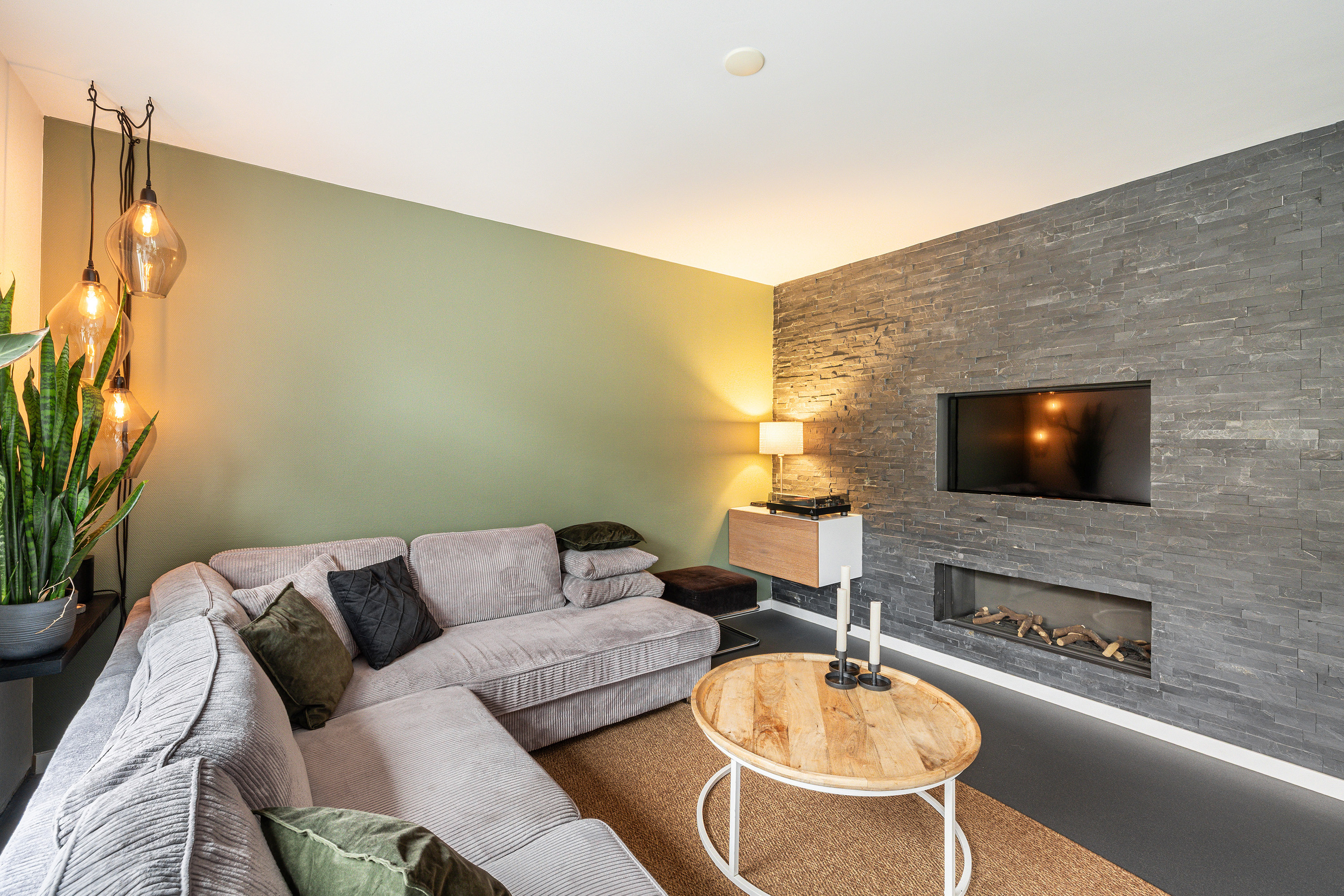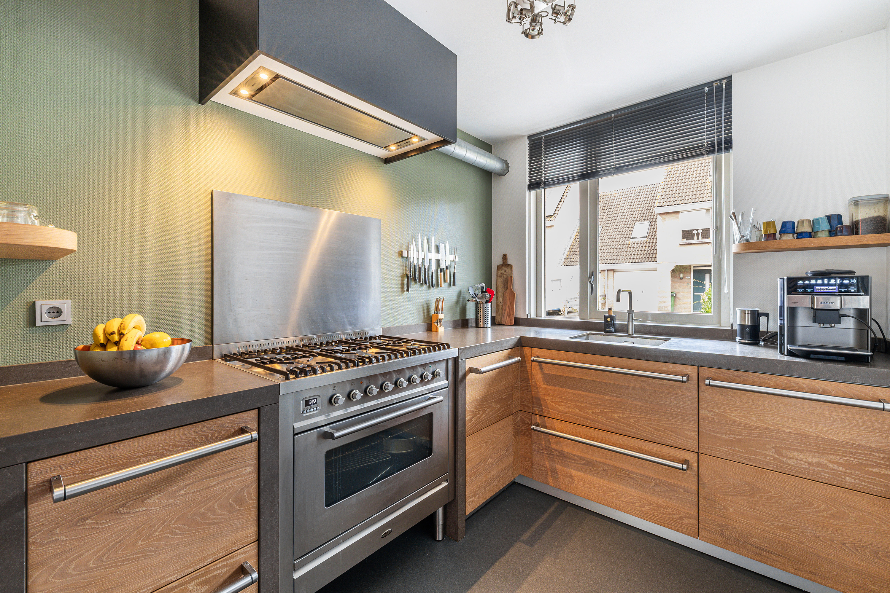 Aan de voorzijde bevindt zich de open keuken, geplaatst in een hoekopstelling. De keuken is compleet uitgerust met inbouwapparatuur, zoals een 6-pits Boretti fornuis met oven en afzuigkap, stoomoven, combi-magnetron, Quooker en een vaatwasser. De vloer is afgewerkt met een strakke troffelvloer voorzien van vloerverwarming in de woonkamer – comfortabel en modern.