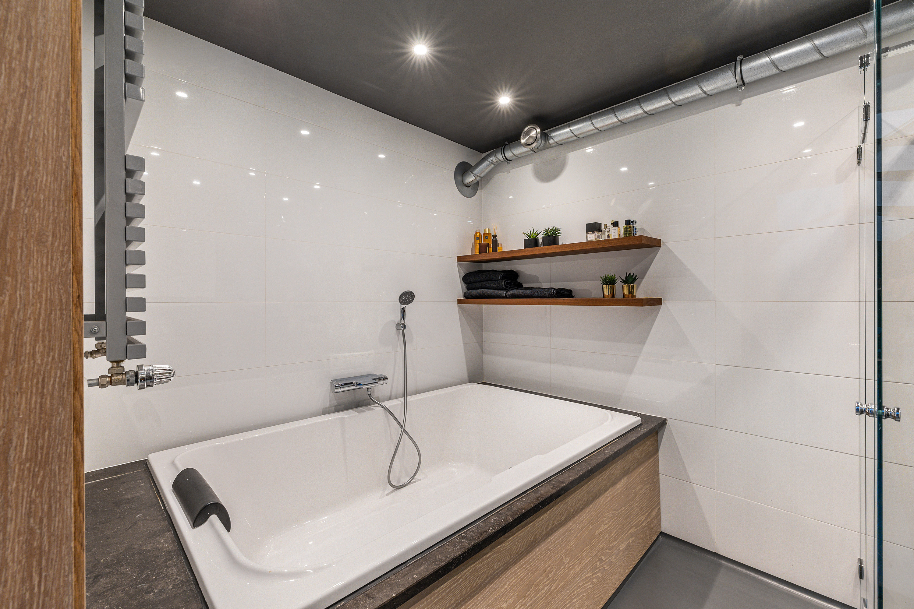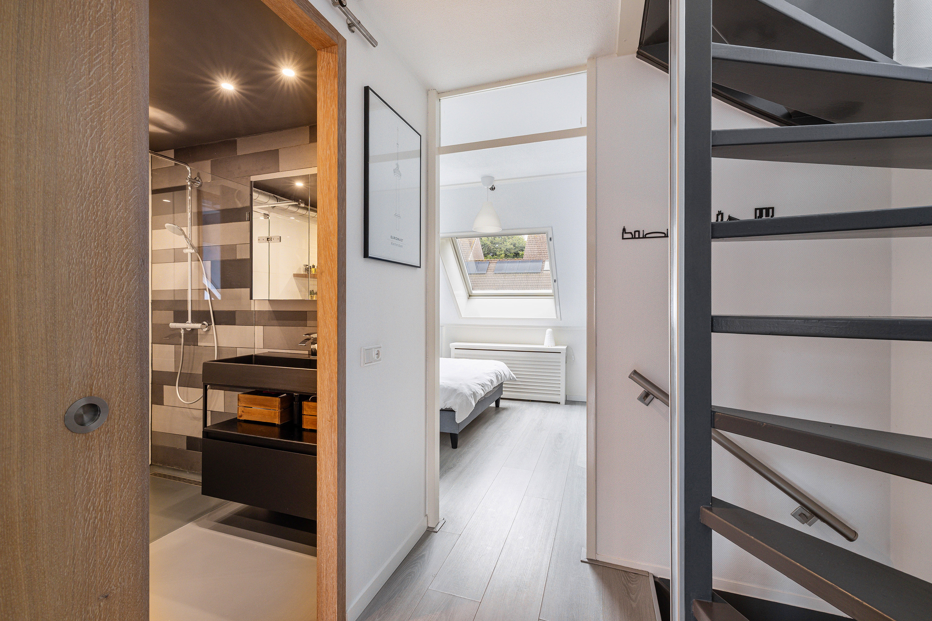 Aankomend op de overloop vind je hier naast de trap naar de 2e verdieping, ook de toegang tot de 3 slaapkamers, een aparte toiletruimte en de badkamer. Aan de voorzijde ligt de ruime hoofdslaapkamer met twee ramen, beide voorzien van rolluiken. Aan de achterzijde vind je nog twee slaapkamers, elk met een dakraam voorzien van rolluiken en handige knieschotbergruimte. De badkamer met praktische barndeur is volledig betegeld en uitgerust met een inloopdouche, 2 persoons ligbad, wastafelmeubel en designradiator. Het plafond is voorzien van sfeervolle inbouwspots. Op de ruime overloop zit verder nog knieschotbergruimte, een dakraam en een 2e trap die toegang geeft tot de 4e slaapkamer boven de garage. Deze kamer heeft ook weer een dakraam met een rolluik. De gehele verdieping is netjes afgewerkt met een laminaatvloer.
