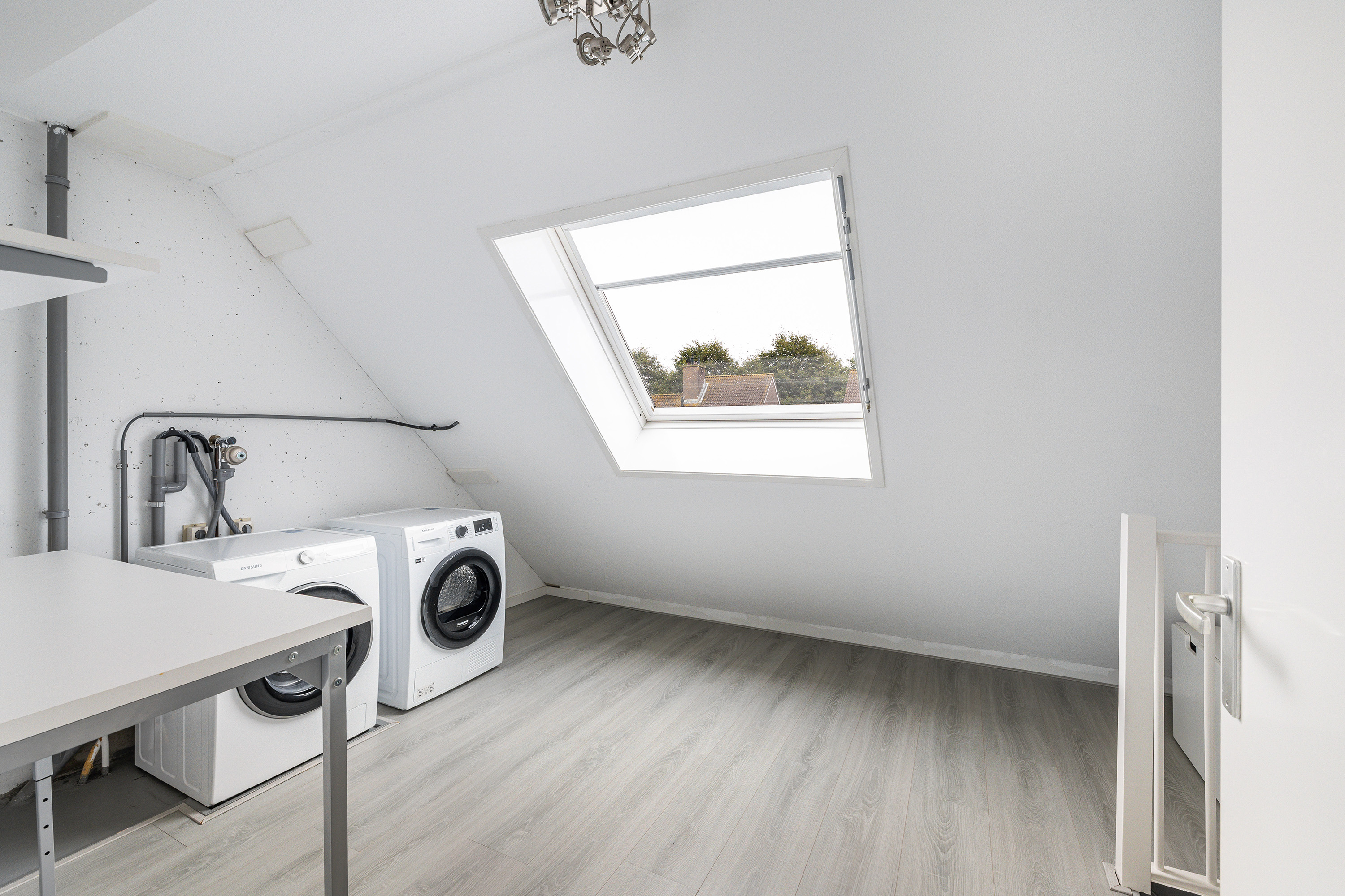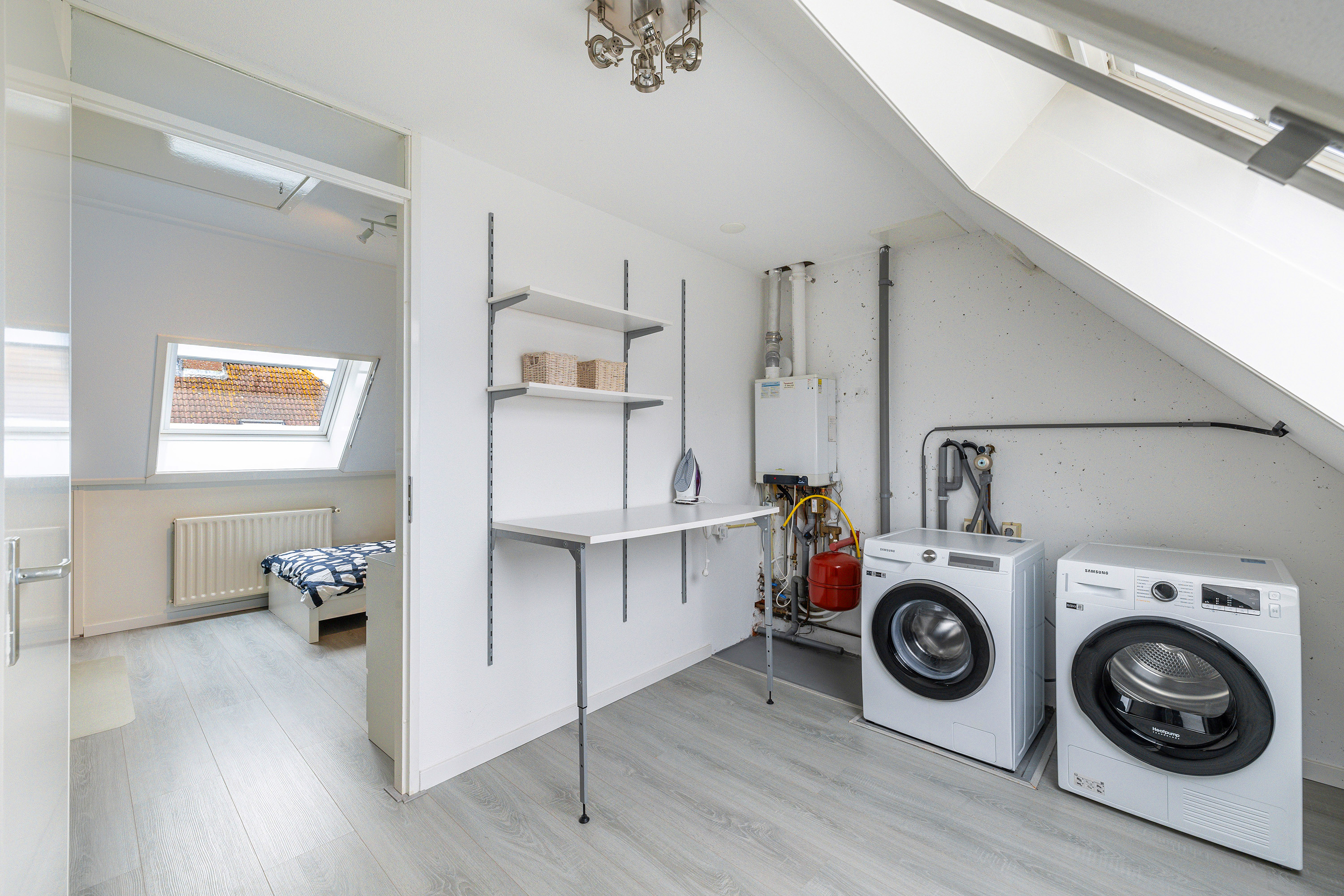 Op de voorzolder vind je de opstelling van de cv-combiketel (Intergas, 2011), de mechanische ventilatie unit en de aansluitingen voor de wasmachine en droger (op aparte groep). De 5e slaapkamer beschikt over 2 vaste kasten en hier vind je ook nog een luik met vlizotrap naar de bergvliering, ideaal voor extra bergruimte. Zowel de voorzolder als de slaapkamer hebben een dakraam, beide met een rolluik.
