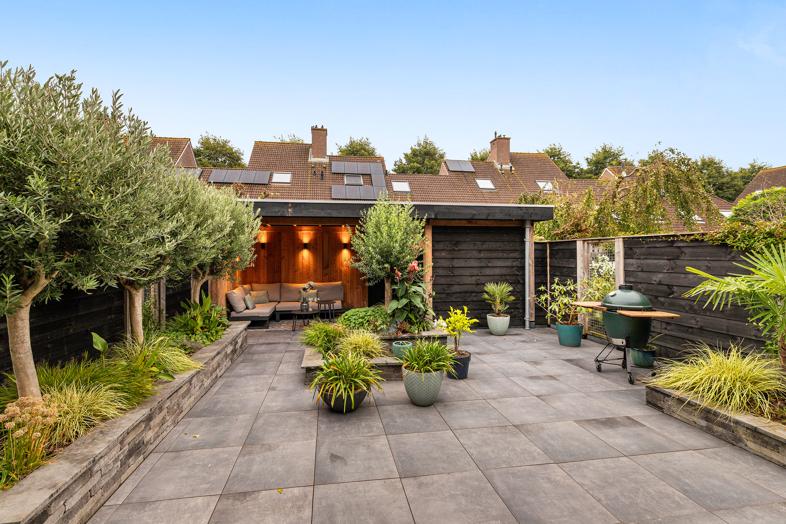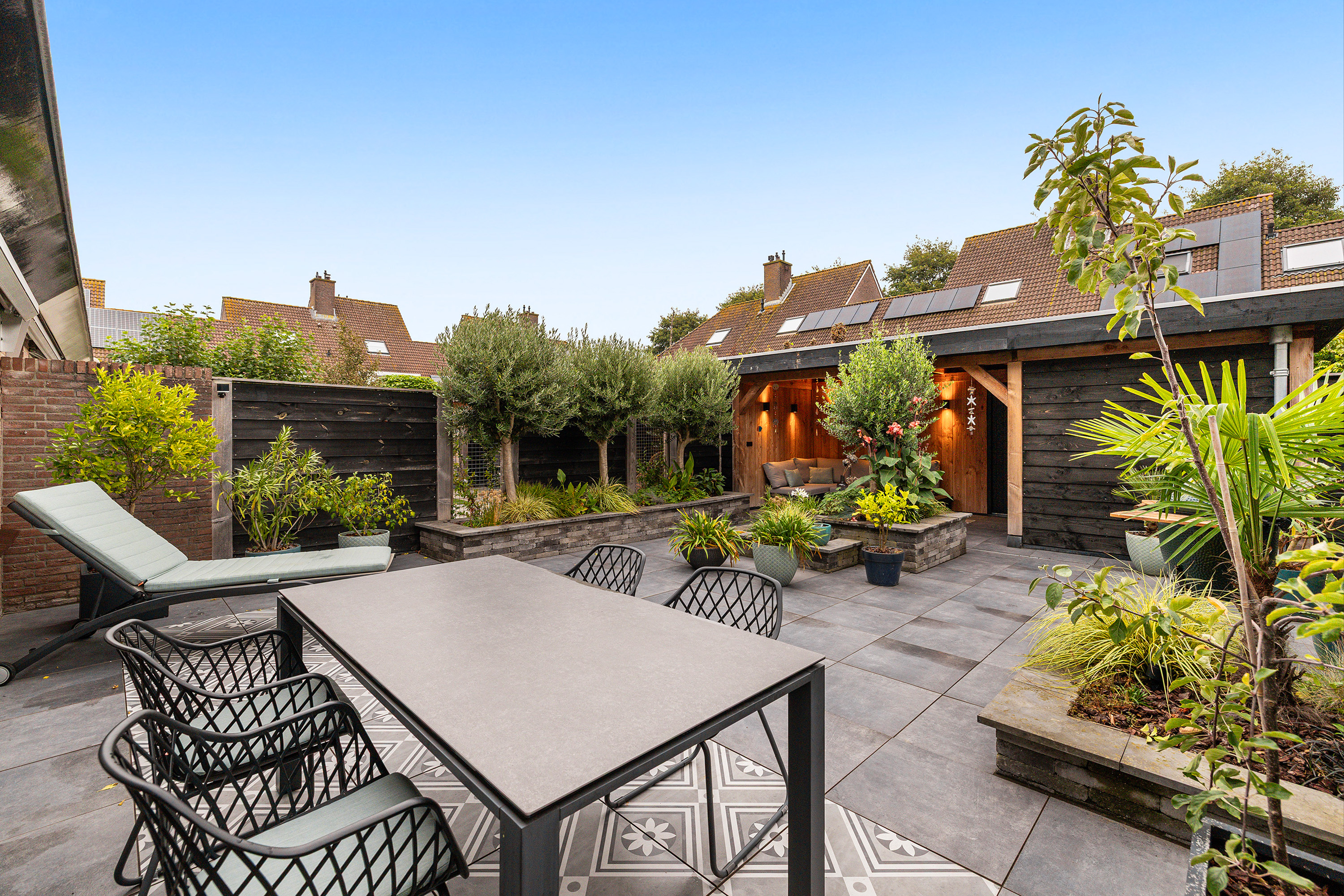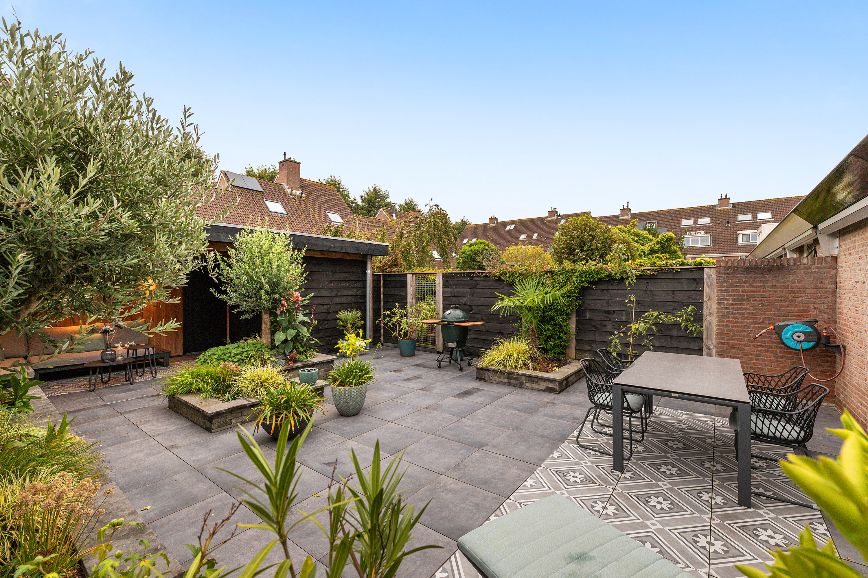 De geheel betegelde voortuin met buitenkraan maakt het parkeren van 2 auto’s mogelijk. De achtertuin ligt op het zuidoosten, waardoor je volop van de zon kunt genieten. De achtertuin heeft een tropische sfeer en is aangelegd met verschillende groene verhoogde plantenborders, houten schuttingen, sfeervolle betegeling, een buitenkraan en is voorzien van 2 elektrische zonneschermen op de achtergevel. De eyecatcher is de houten overkapping met berging, verlichting en een achteruitgang. De berging is voorzien van een betonvloer en van elektra.