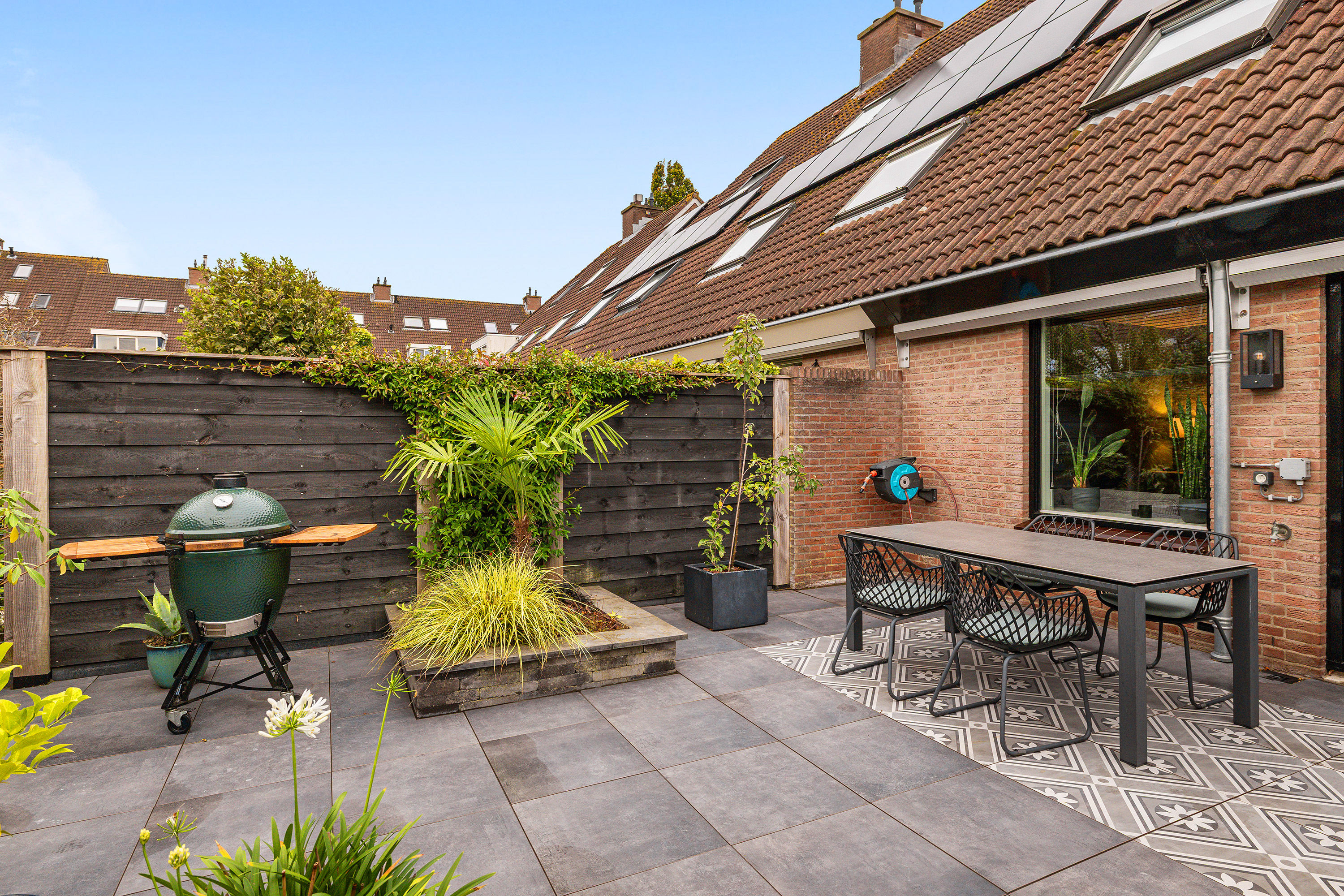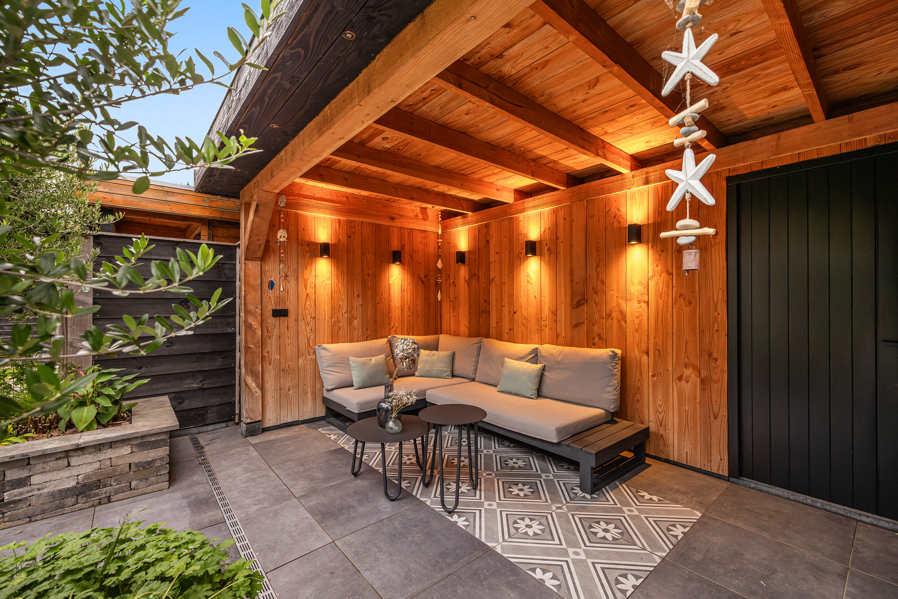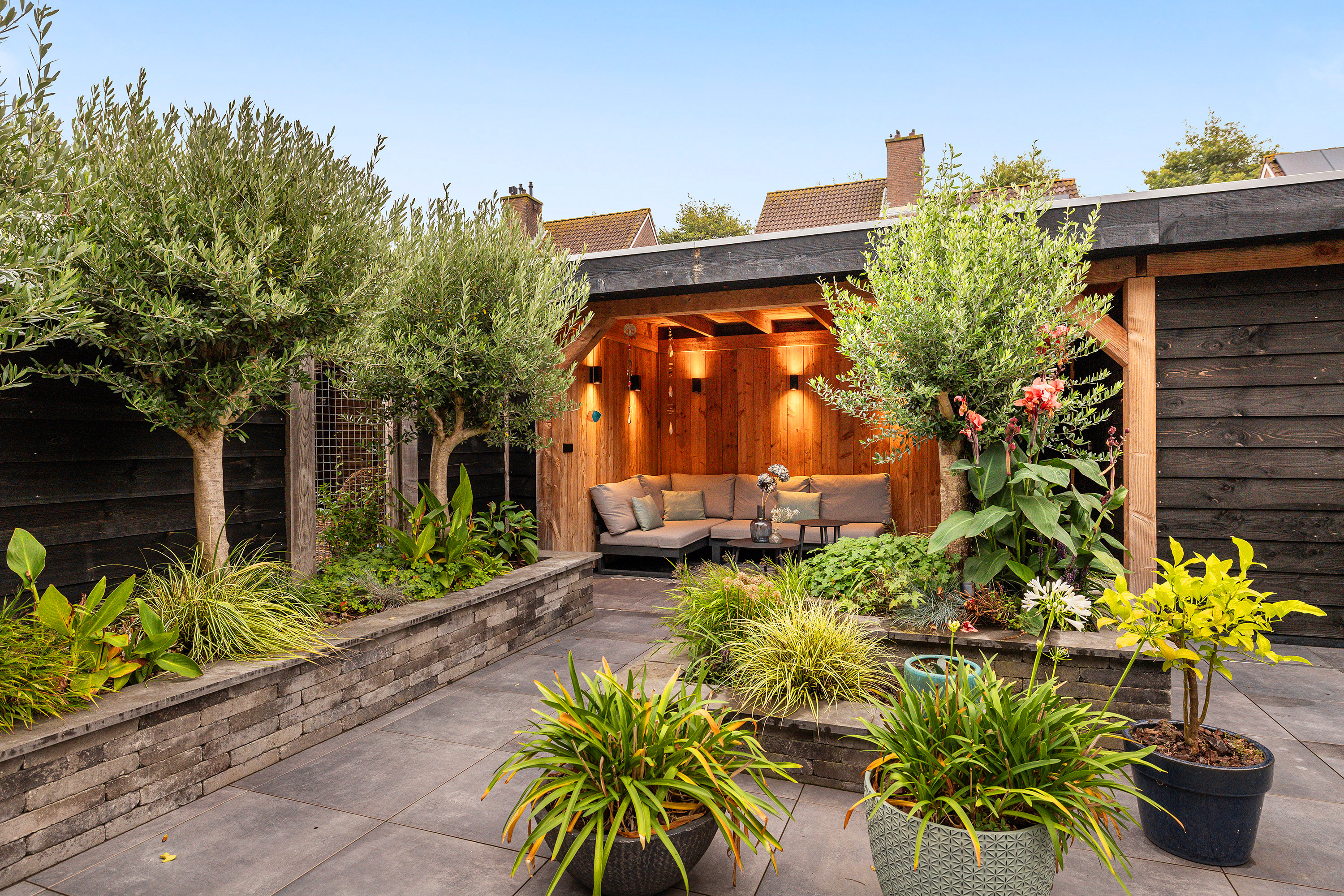 De geheel betegelde voortuin met buitenkraan maakt het parkeren van 2 auto’s mogelijk. De achtertuin ligt op het zuidoosten, waardoor je volop van de zon kunt genieten. De achtertuin heeft een tropische sfeer en is aangelegd met verschillende groene verhoogde plantenborders, houten schuttingen, sfeervolle betegeling, een buitenkraan en is voorzien van 2 elektrische zonneschermen op de achtergevel. De eyecatcher is de houten overkapping met berging, verlichting en een achteruitgang. De berging is voorzien van een betonvloer en van elektra.
