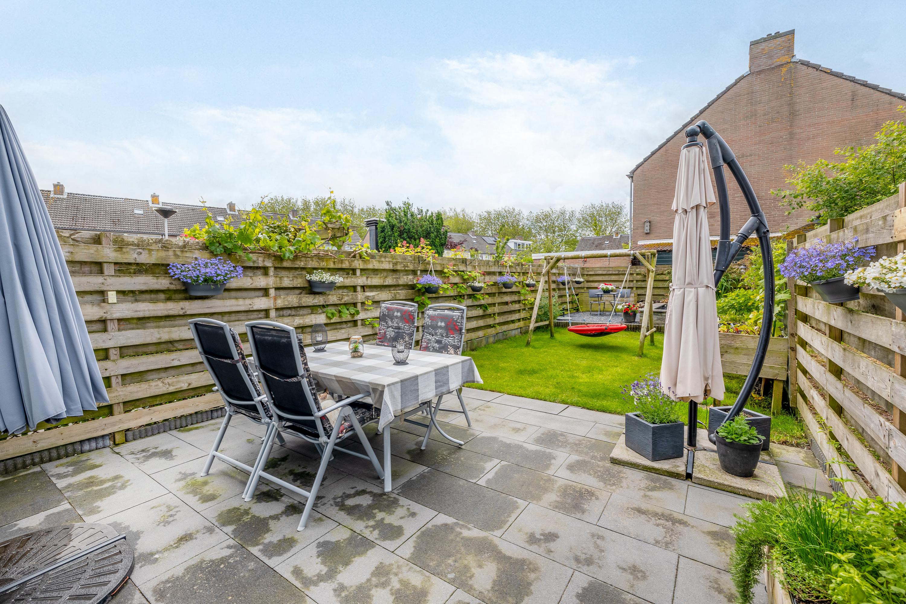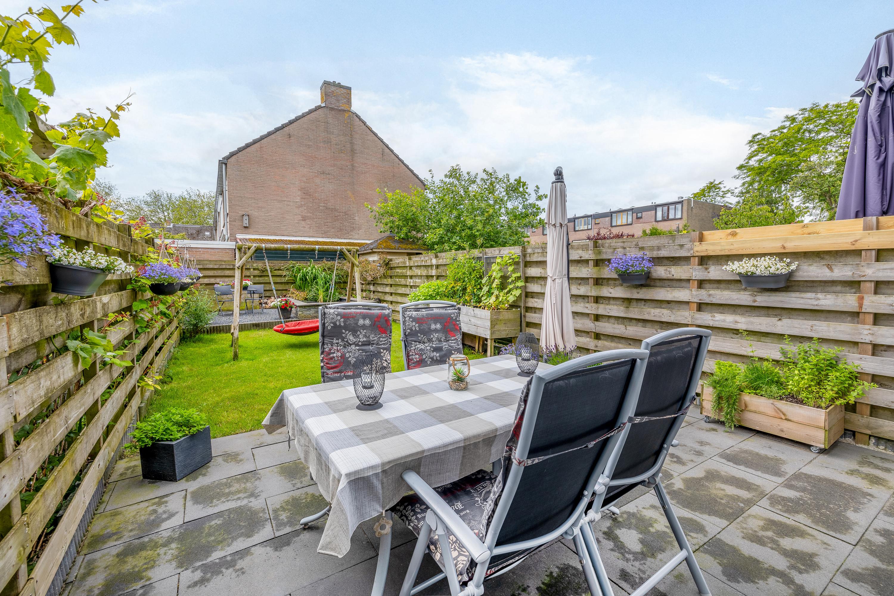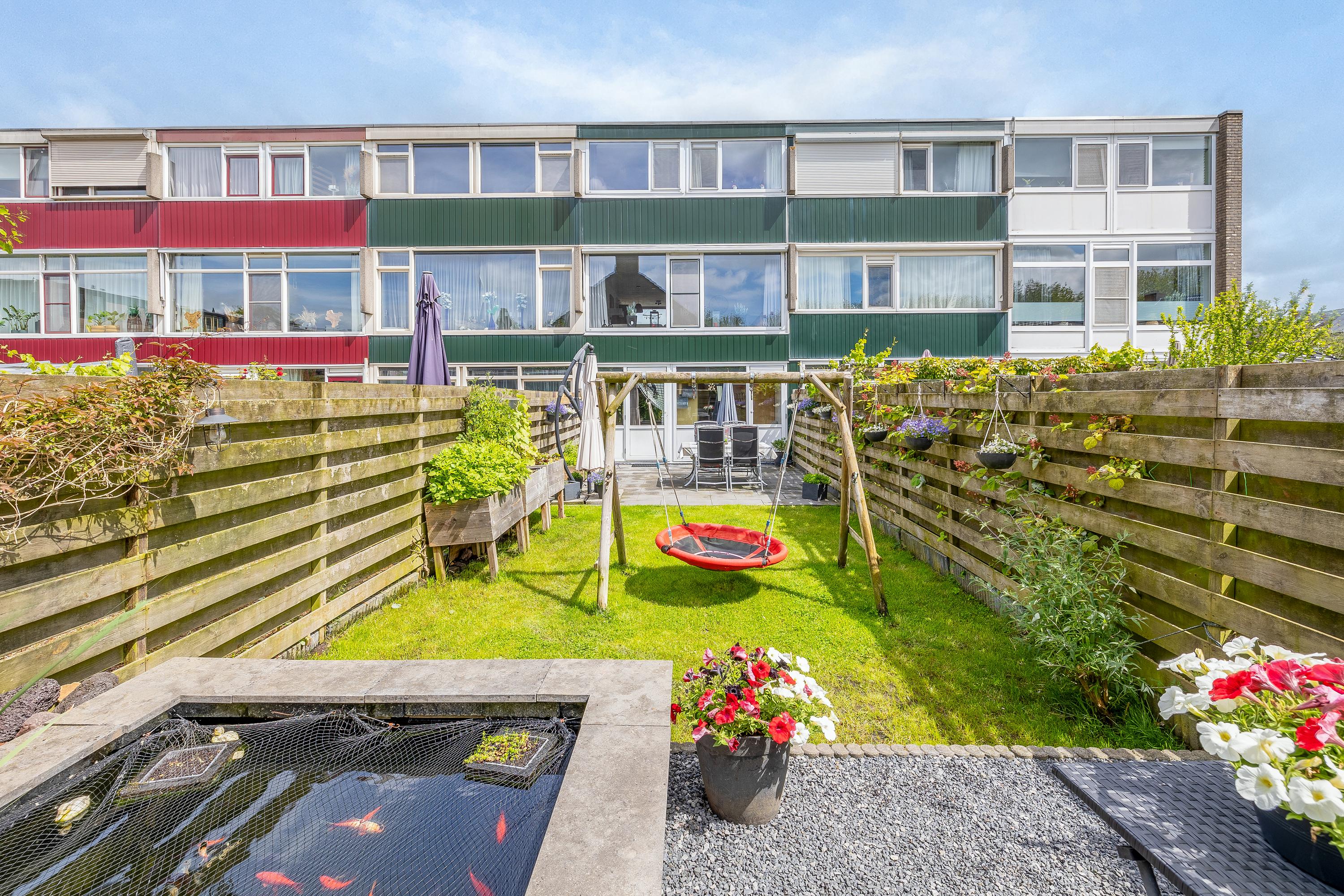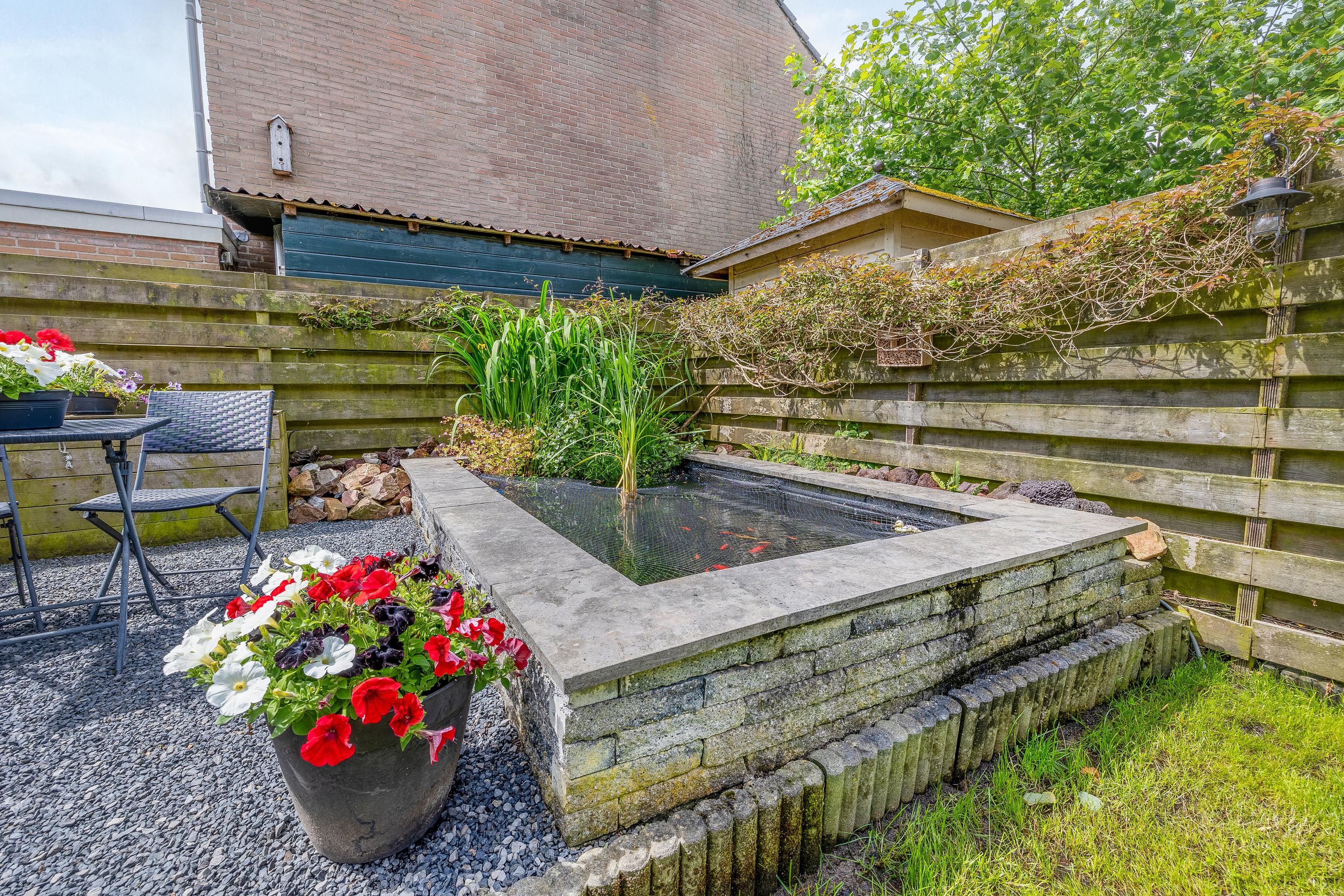 De betegelde oprit aan de voorzijde biedt parkeergelegenheid voor 1 auto. De achtertuin is sfeervol aangelegd met een terras, groen gazon, vijver, houten schuttingen en een zonnige ligging op het zuiden.