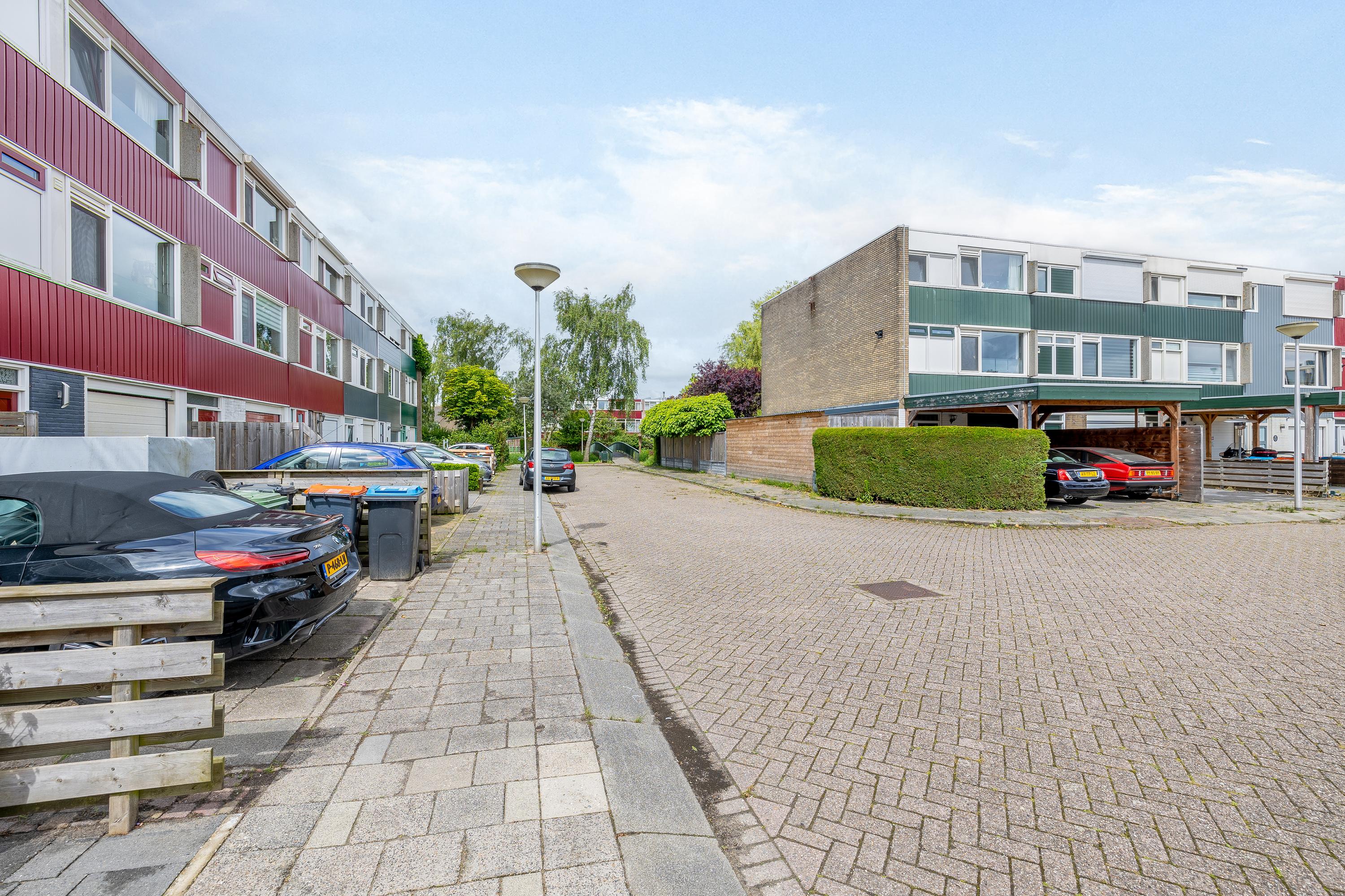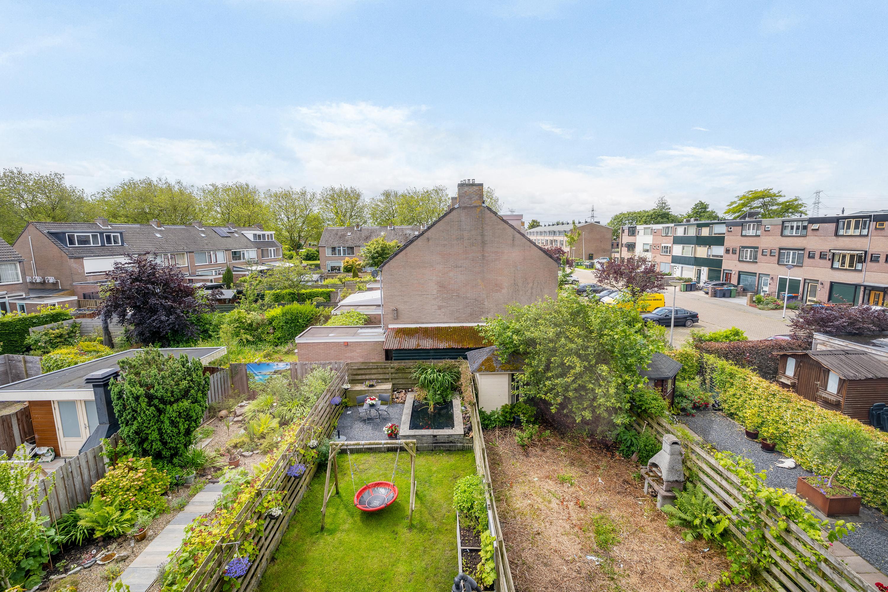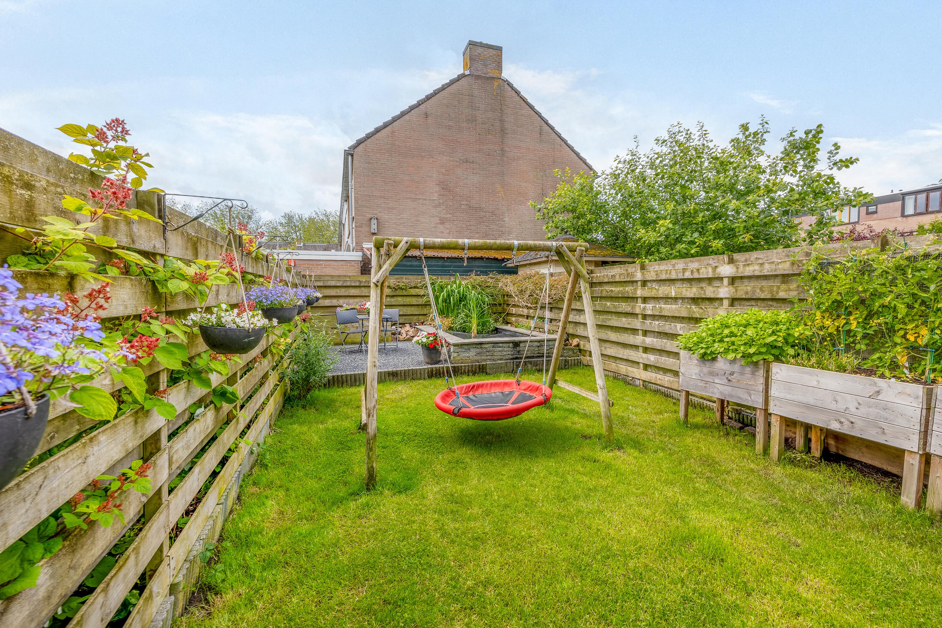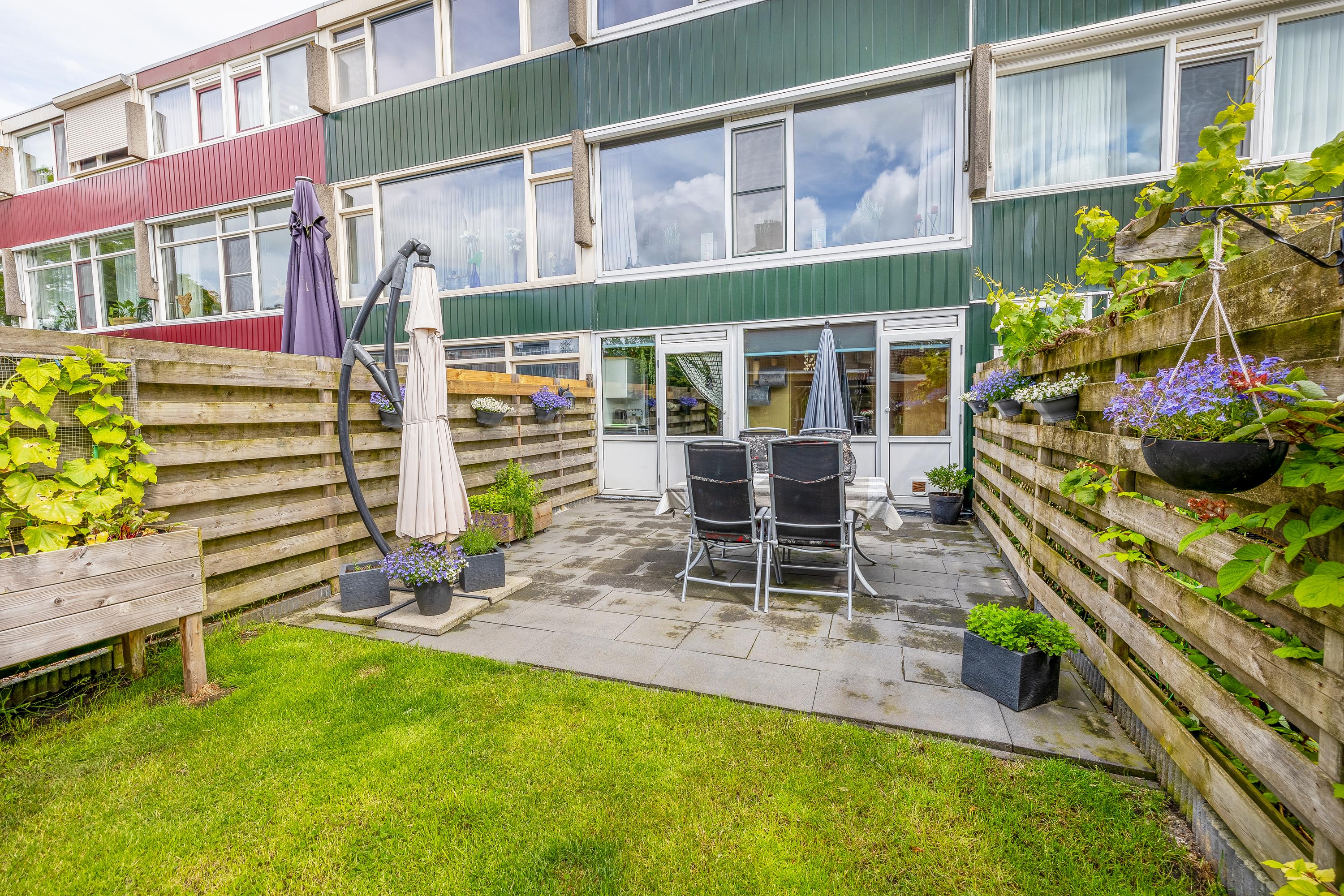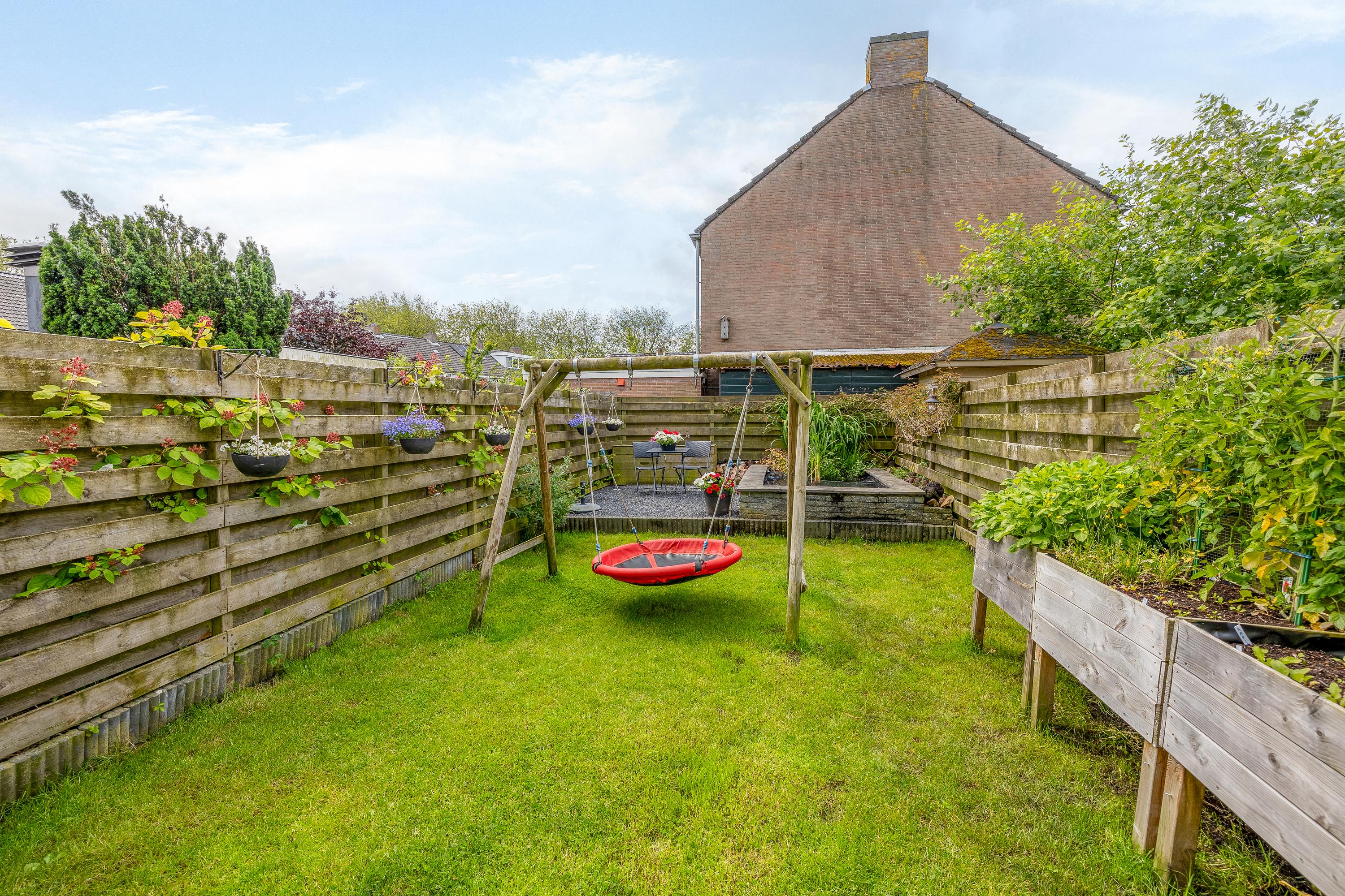 De betegelde oprit aan de voorzijde biedt parkeergelegenheid voor 1 auto. De achtertuin is sfeervol aangelegd met een terras, groen gazon, vijver, houten schuttingen en een zonnige ligging op het zuiden.