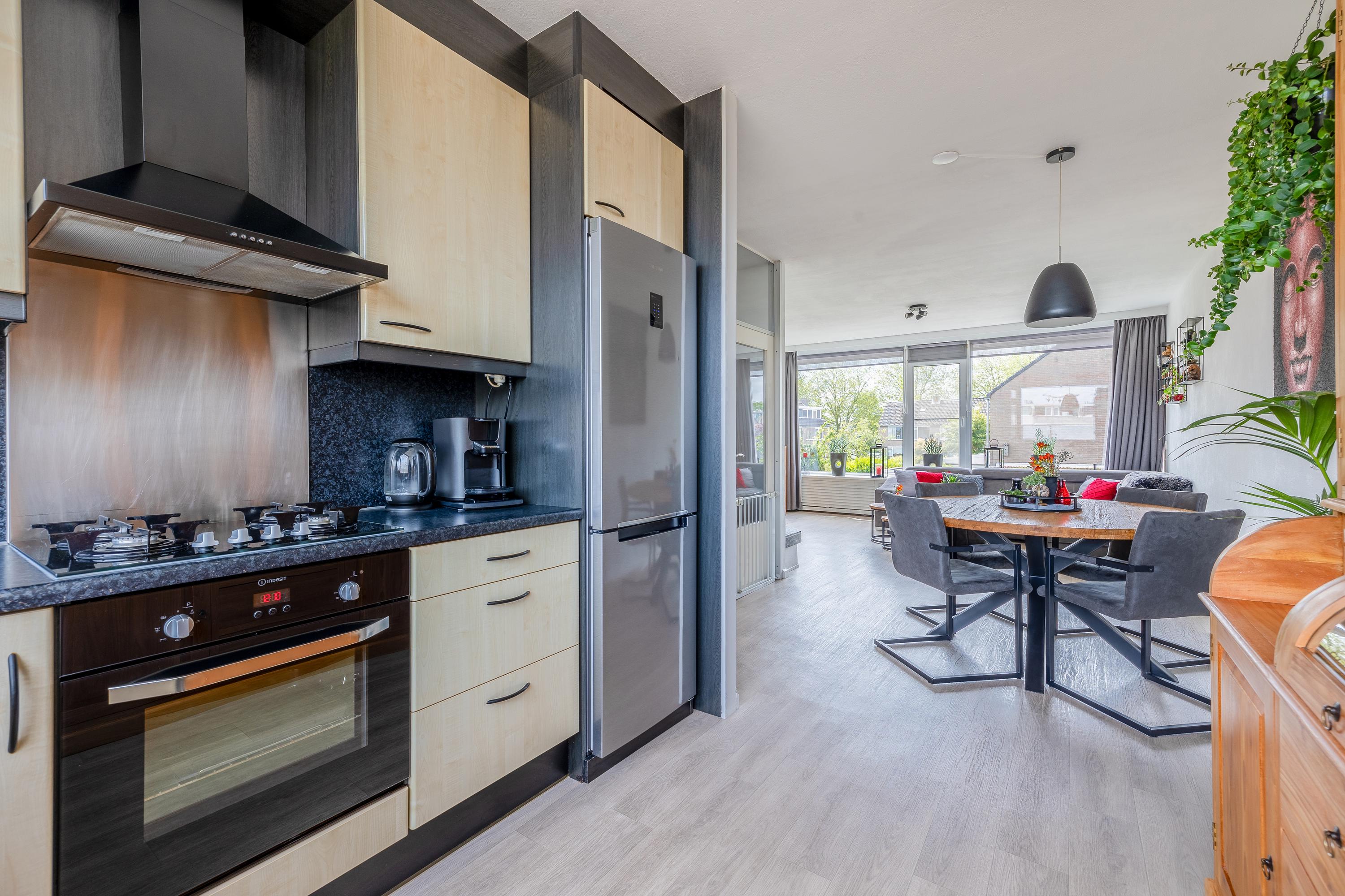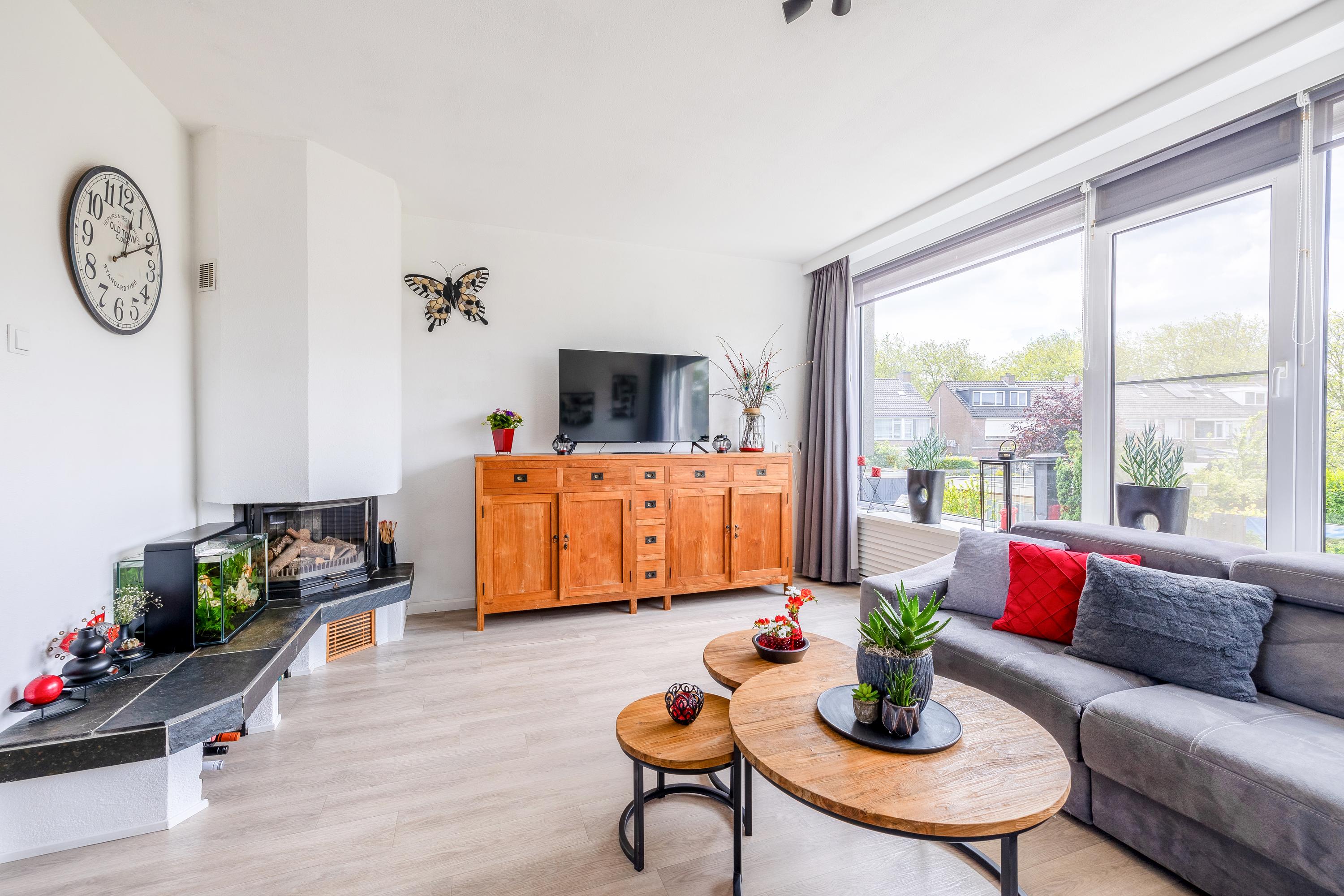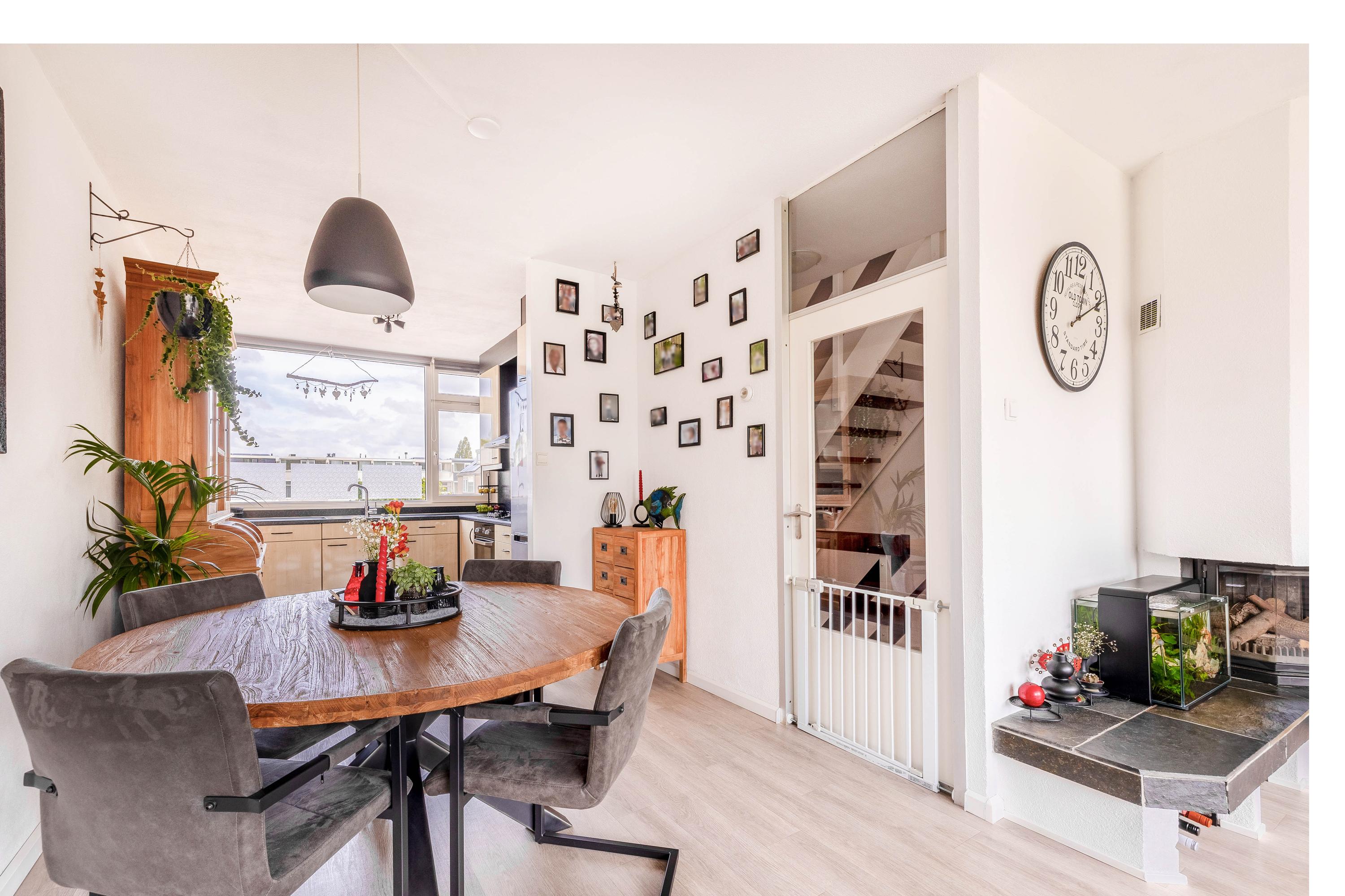 Overloop met de trap naar de 2e verdieping, toiletruimte voorzien van een toilet met een fonteintje. Daarnaast is er nog een ruime bergkast. Ruime woonkamer met grote raampartij en een sfeervolle open haard. Verder is het woonkamerraam voorzien van een woningbreed elektrisch zonnescherm. Vanuit de living heb je uitzicht op de zonnige tuin op de begane grond. De open keuken in een hoekopstelling heeft diverse inbouwapparatuur zoals: een gaskookplaat met afzuigschouw, een oven, vaatwasser, anderhalve spoelbak en een koel- en vriescombinatie. Deze verdiepingsvloer is voorzien van een houtlook vinyl vloer.