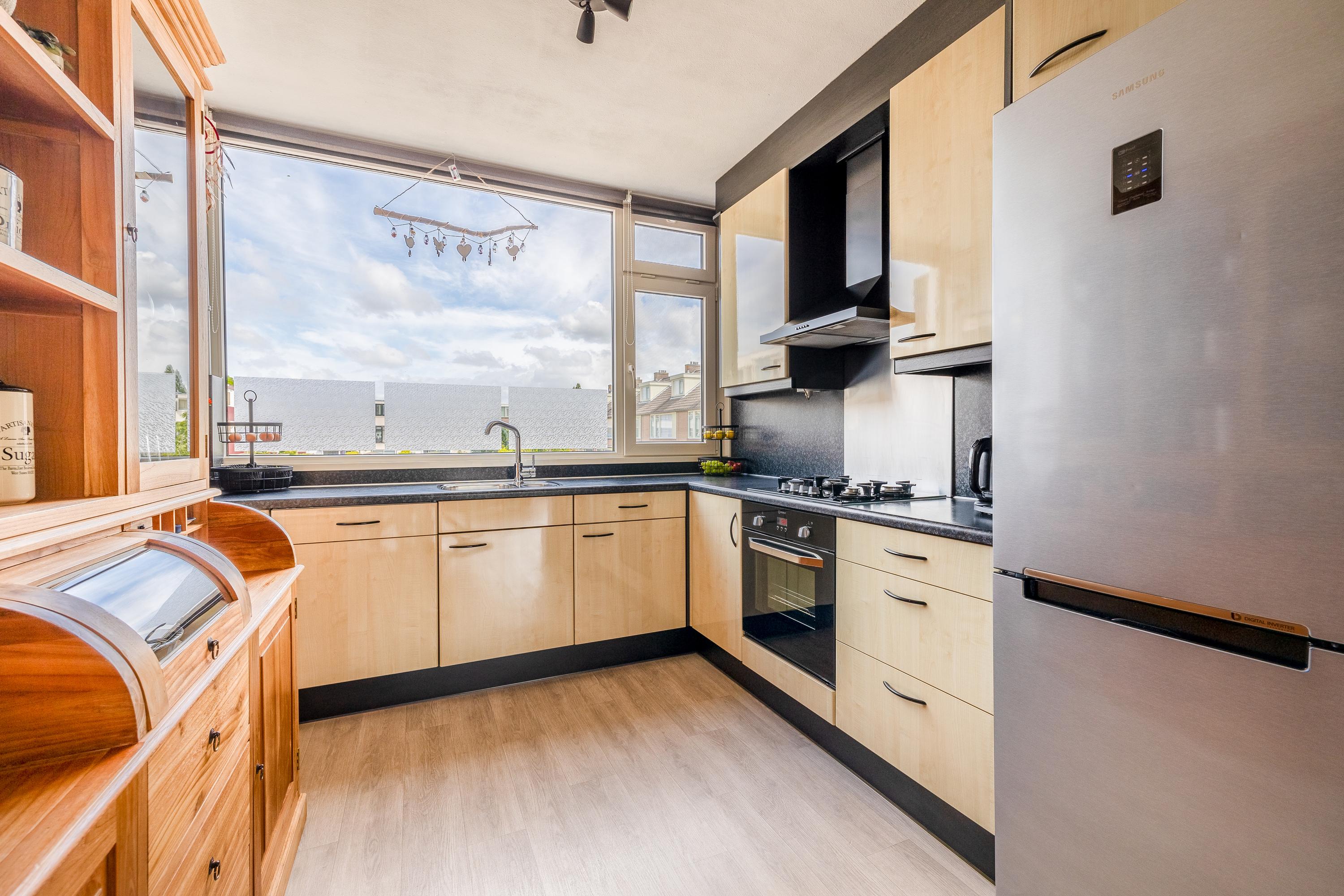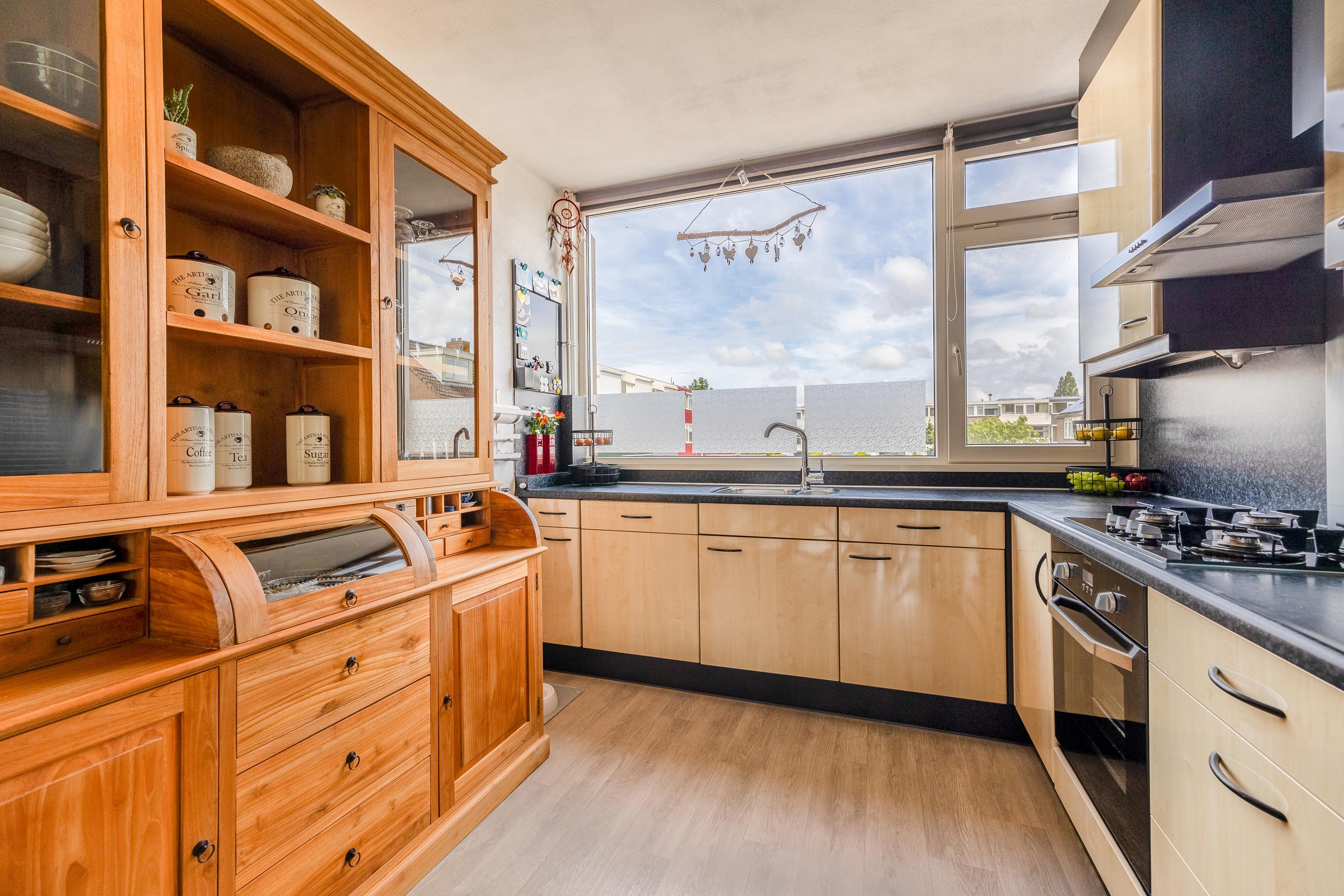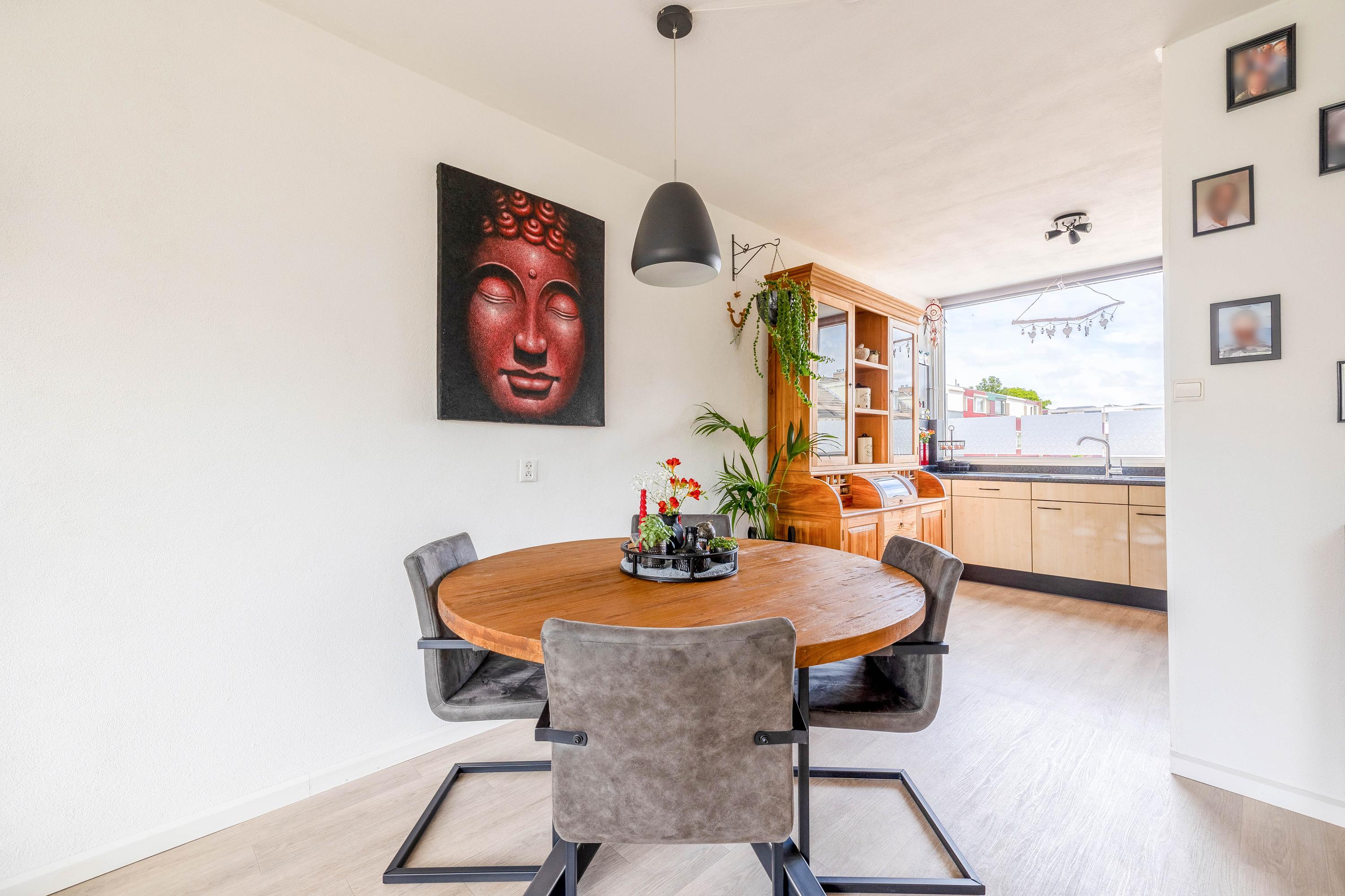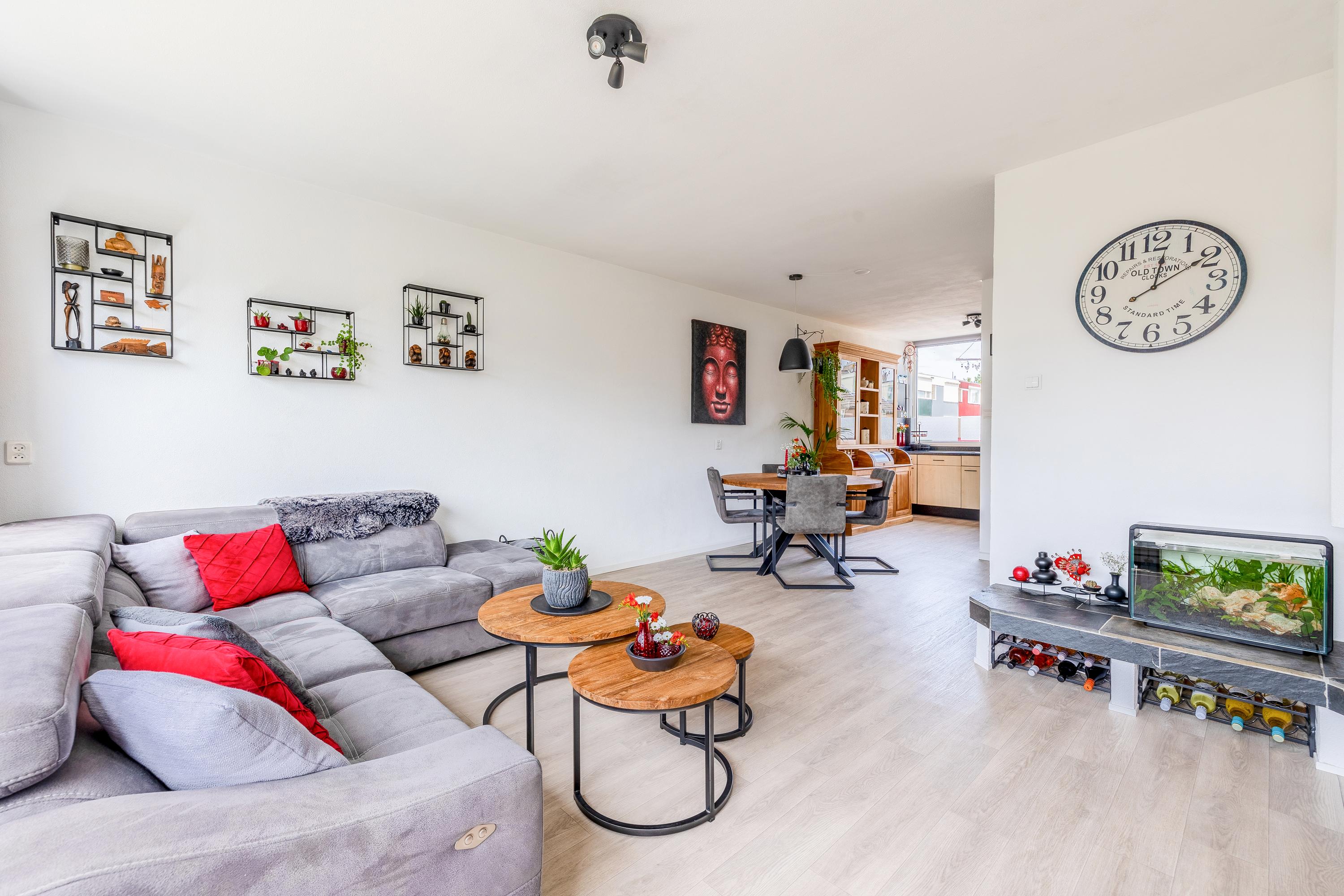 Overloop met de trap naar de 2e verdieping, toiletruimte voorzien van een toilet met een fonteintje. Daarnaast is er nog een ruime bergkast. Ruime woonkamer met grote raampartij en een sfeervolle open haard. Verder is het woonkamerraam voorzien van een woningbreed elektrisch zonnescherm. Vanuit de living heb je uitzicht op de zonnige tuin op de begane grond. De open keuken in een hoekopstelling heeft diverse inbouwapparatuur zoals: een gaskookplaat met afzuigschouw, een oven, vaatwasser, anderhalve spoelbak en een koel- en vriescombinatie. Deze verdiepingsvloer is voorzien van een houtlook vinyl vloer.