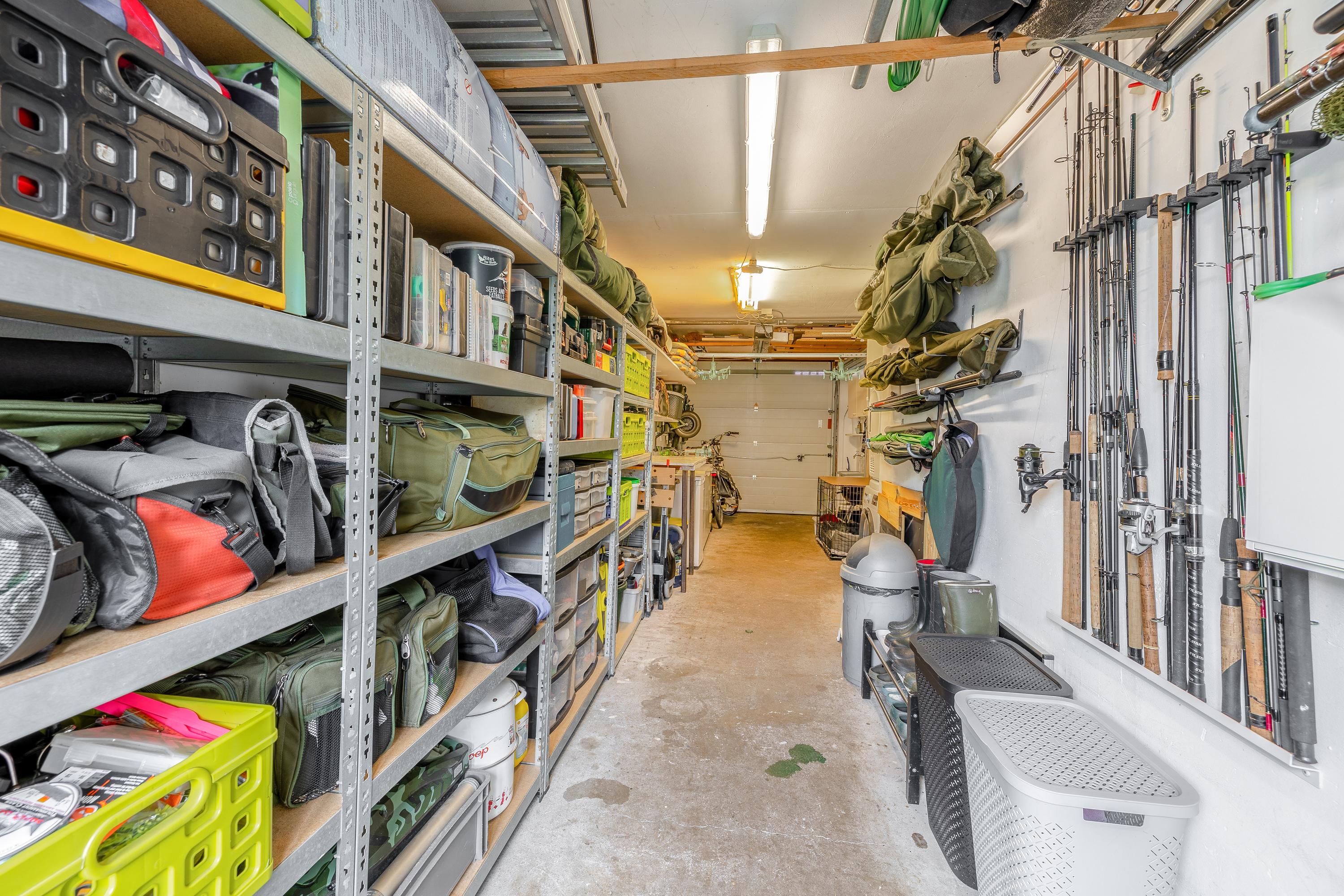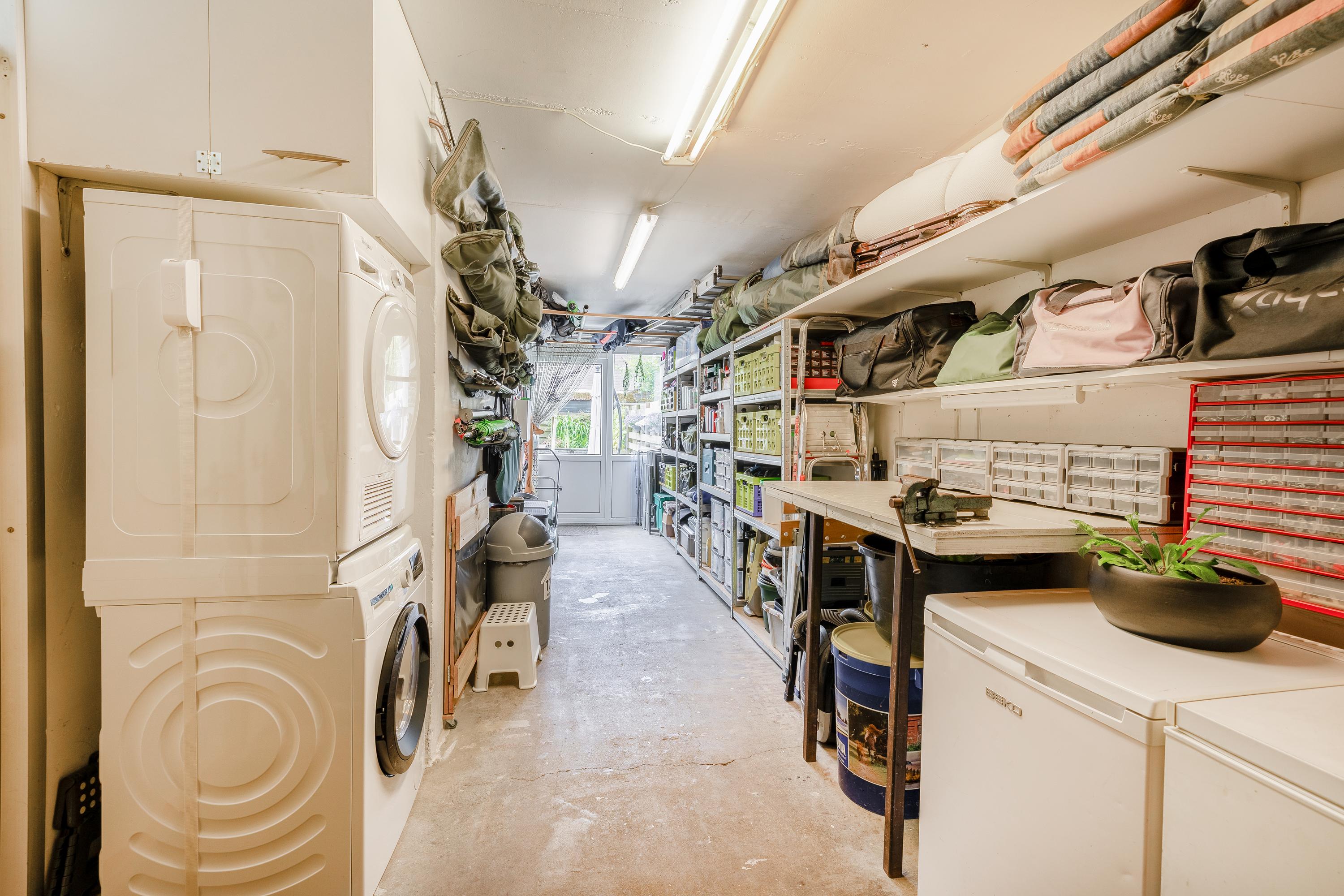 Royale garage/berging met elektrisch bedienbare lamellendeur en loopdeur naar de tuin. Hier vindt je ook de aansluitingen voor de wasmachine/droger. Ruime tuinkamer met directe toegang tot de zonnige achtertuin, ideaal om te gebruiken als slaap-, werk- of speelkamer. De vloer van de hal en tuinkamer is voorzien van een laminaatvloer.