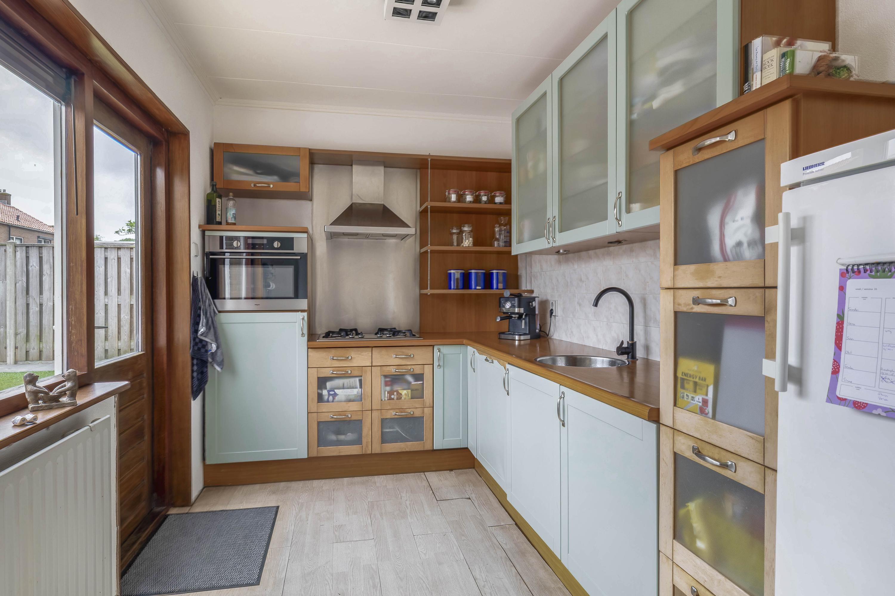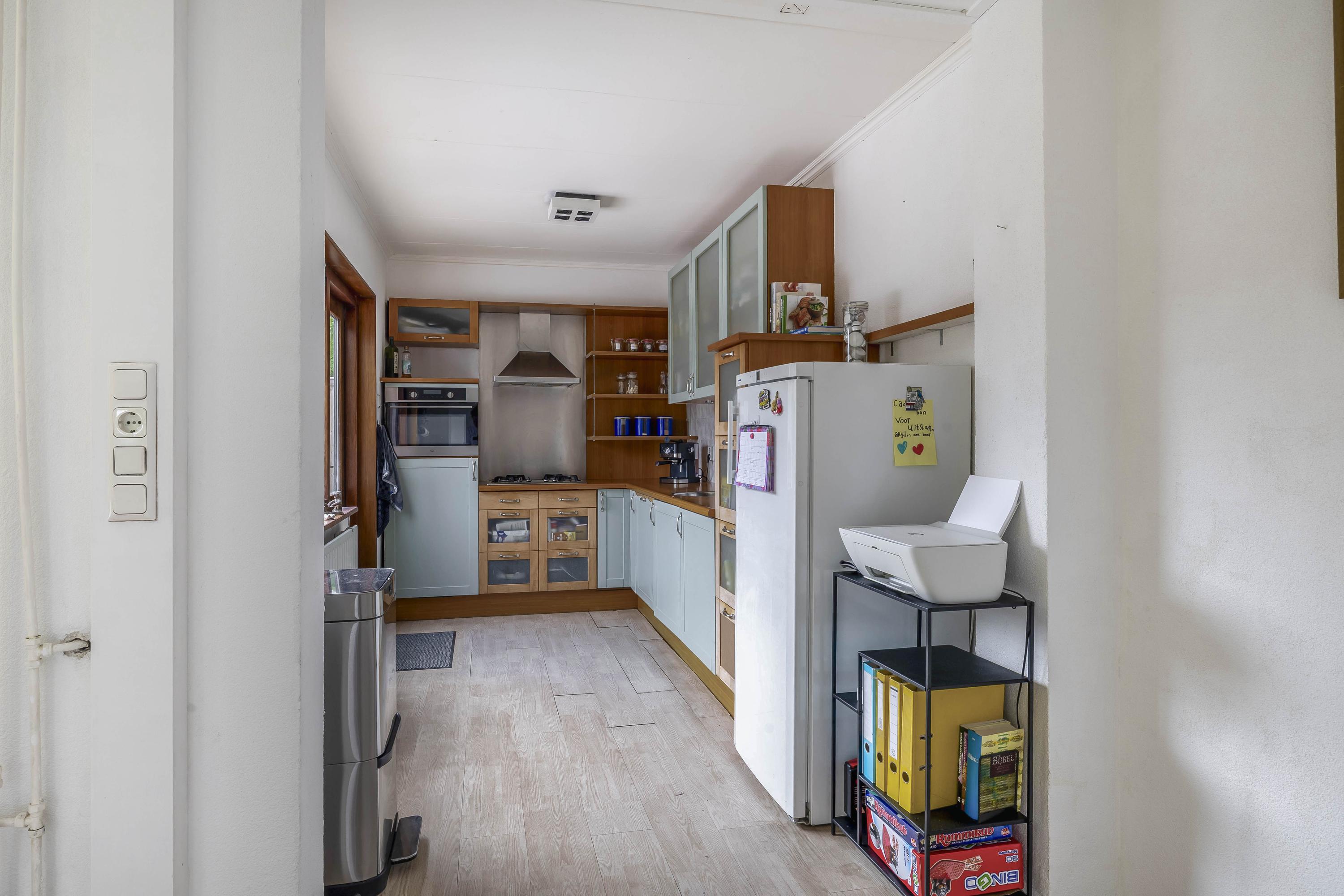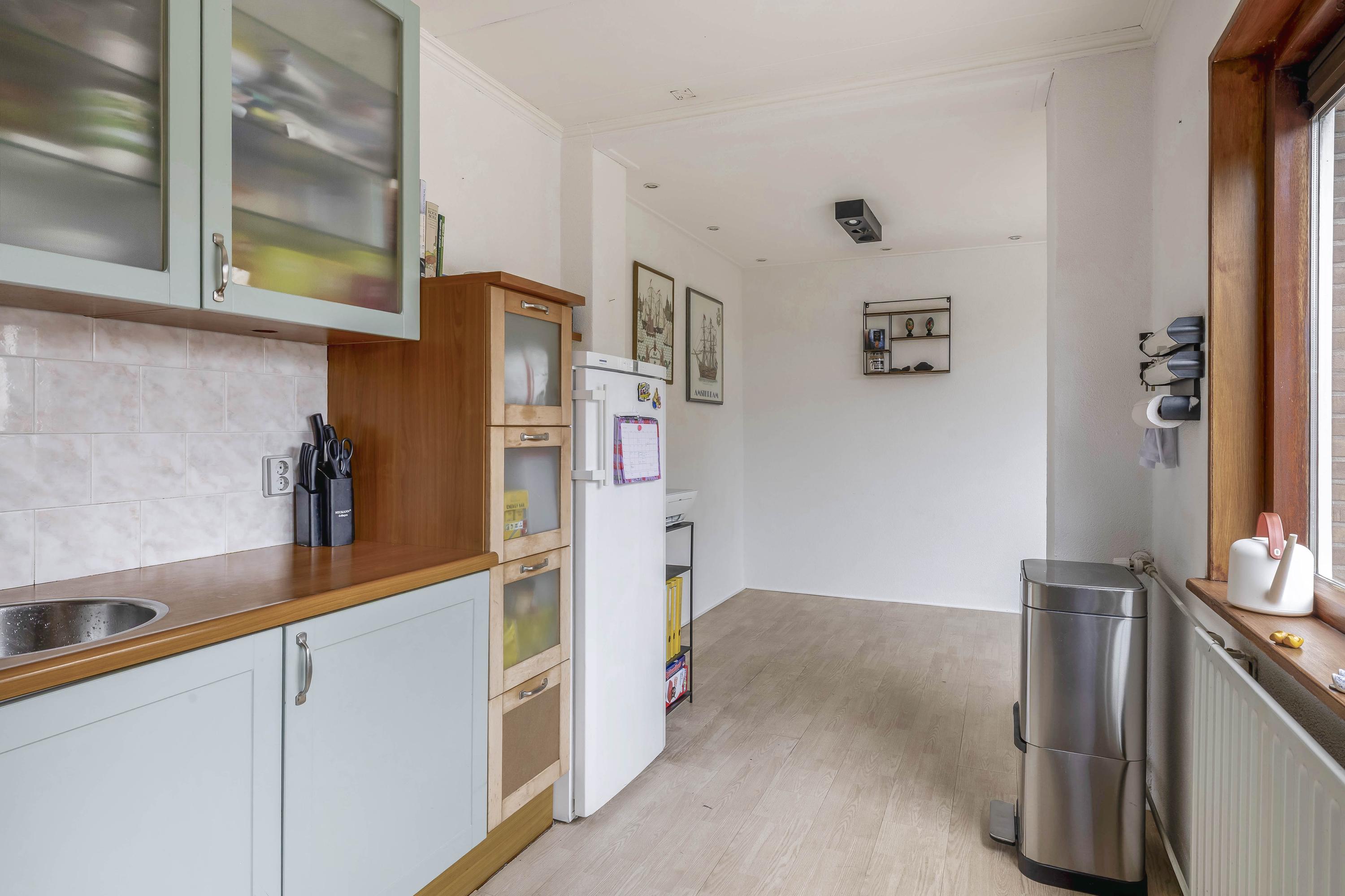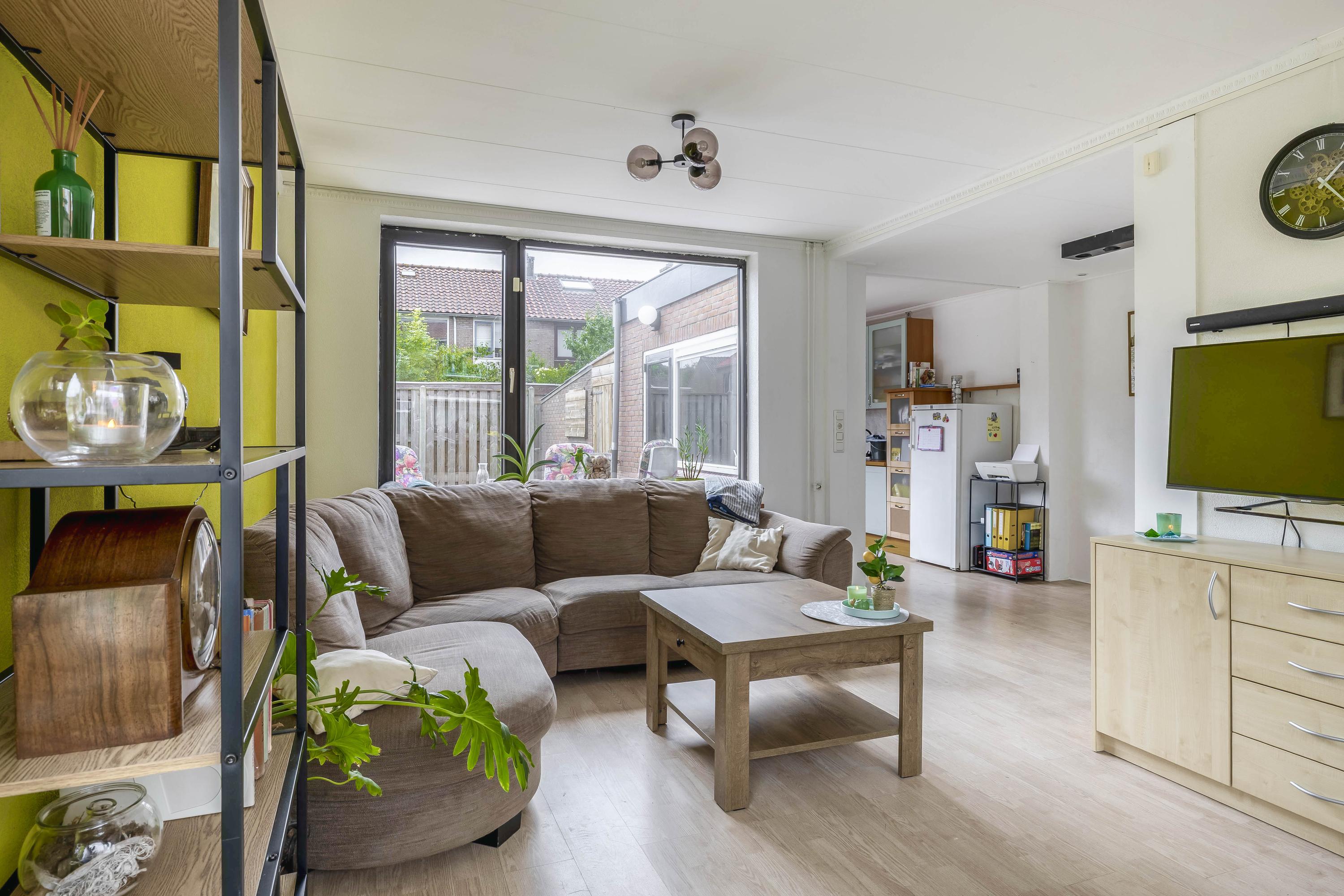 Hal/entree met de meterkast, garderobe nis, de trapopgang naar de verdieping, handige trapkast en een ruim toilet met hangend closet. De lichte doorzon woonkamer heeft een laminaatvloer en de keuken bevindt zich in de aanbouw aan de achterzijde. De keuken is fijn licht door de ramen en hier zit de deur naar de achtertuin. De keuken is verder voorzien van een gaskookplaat, afzuigkap, combi-magnetron, koelkast en een vaatwasser.