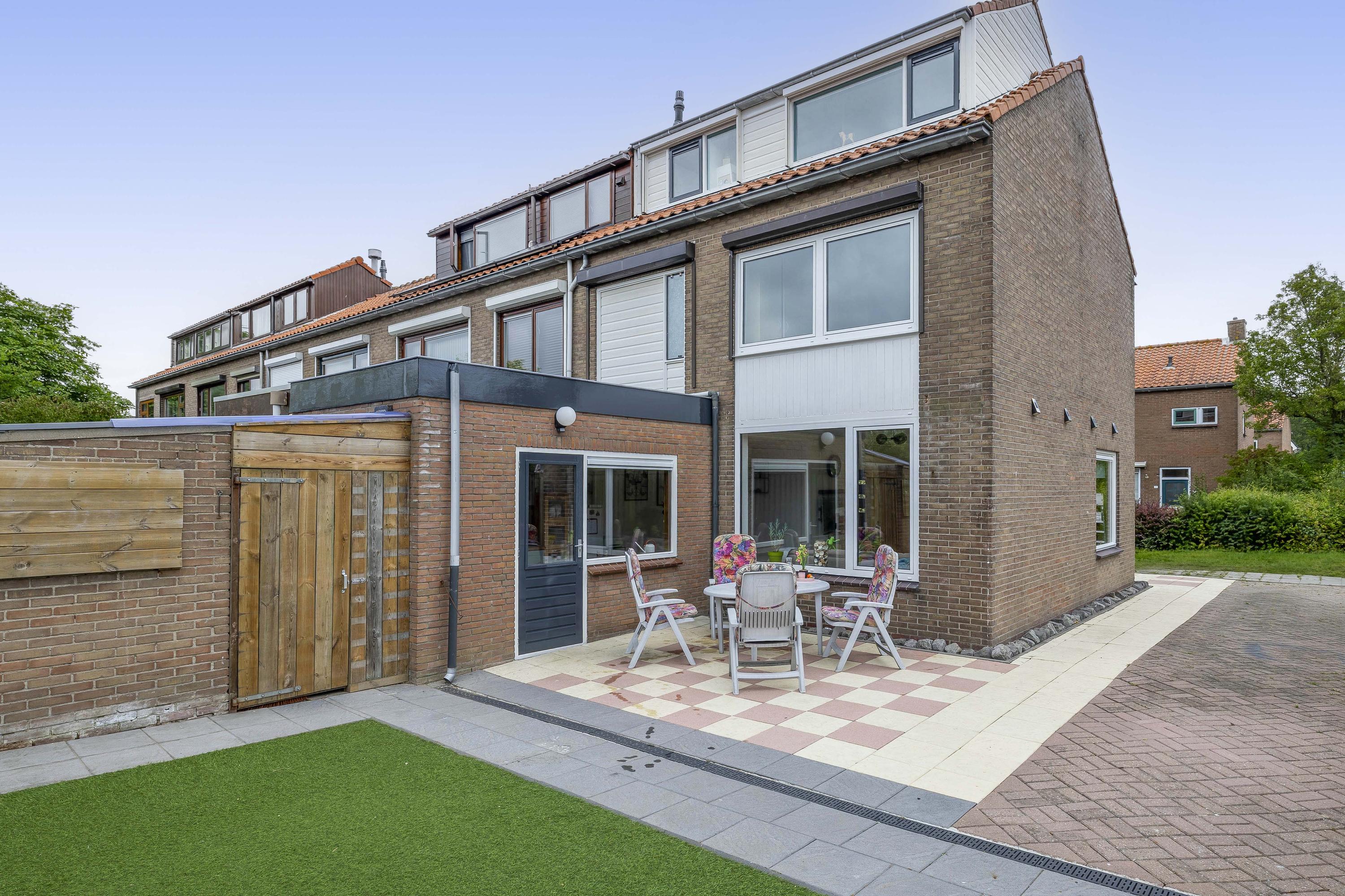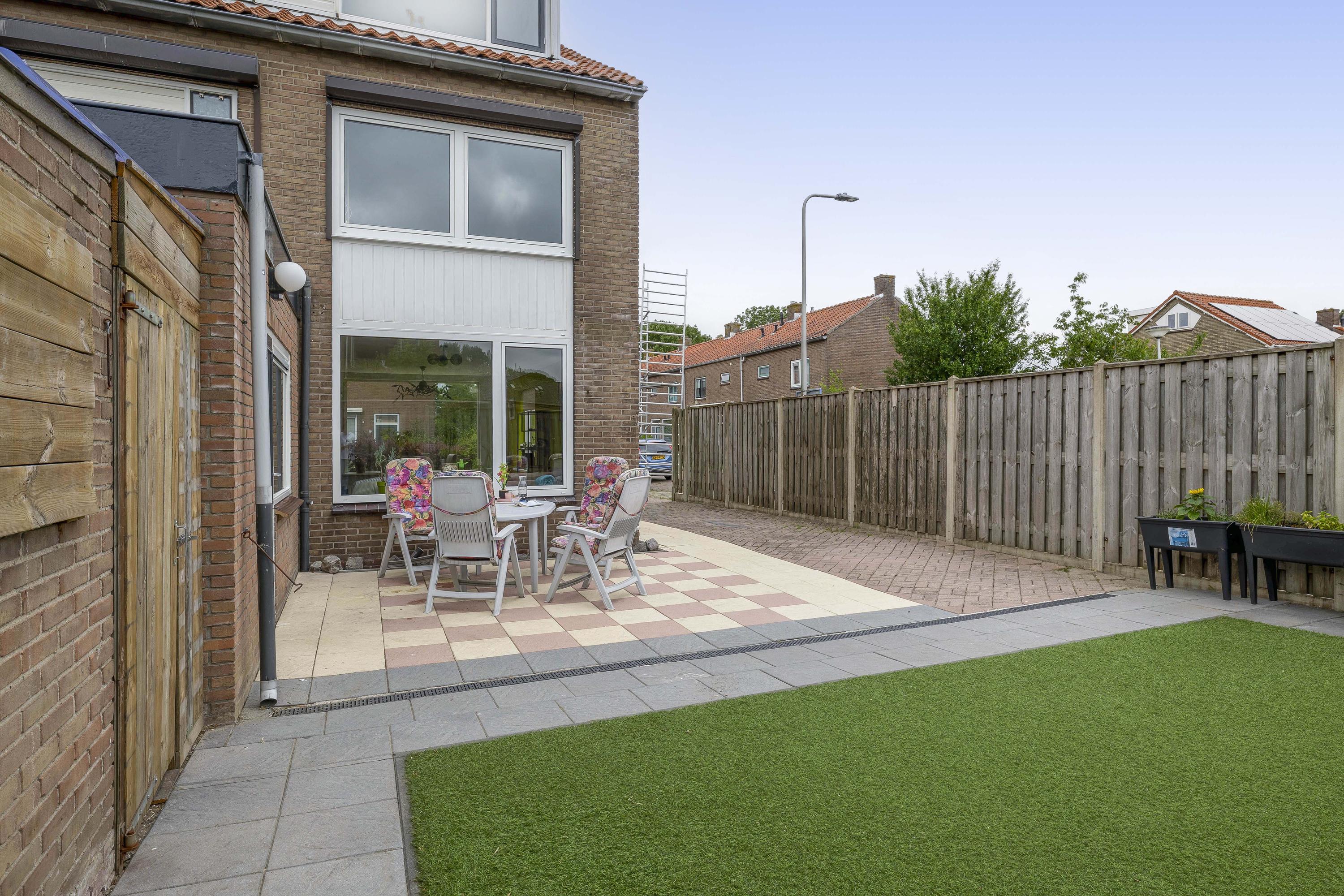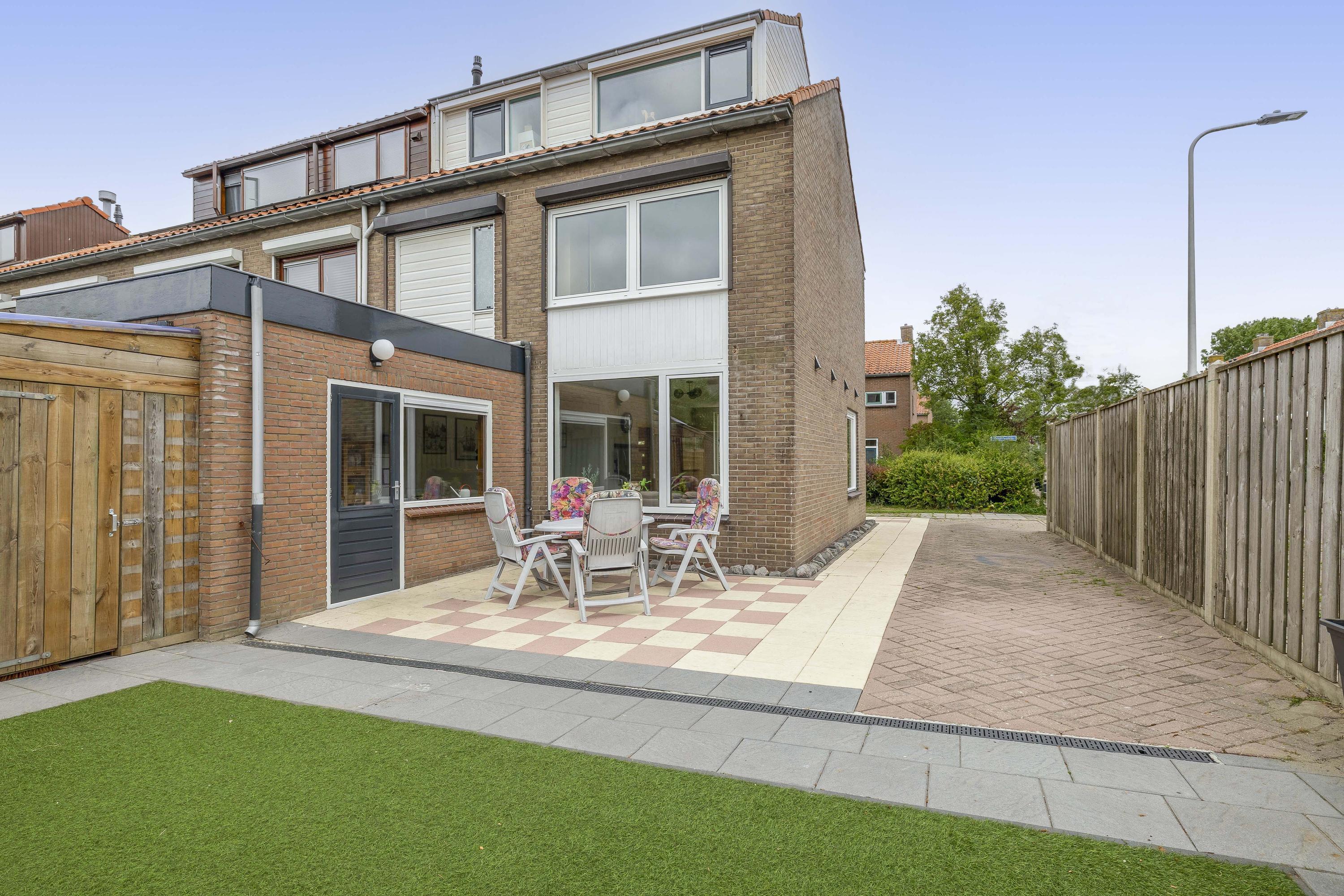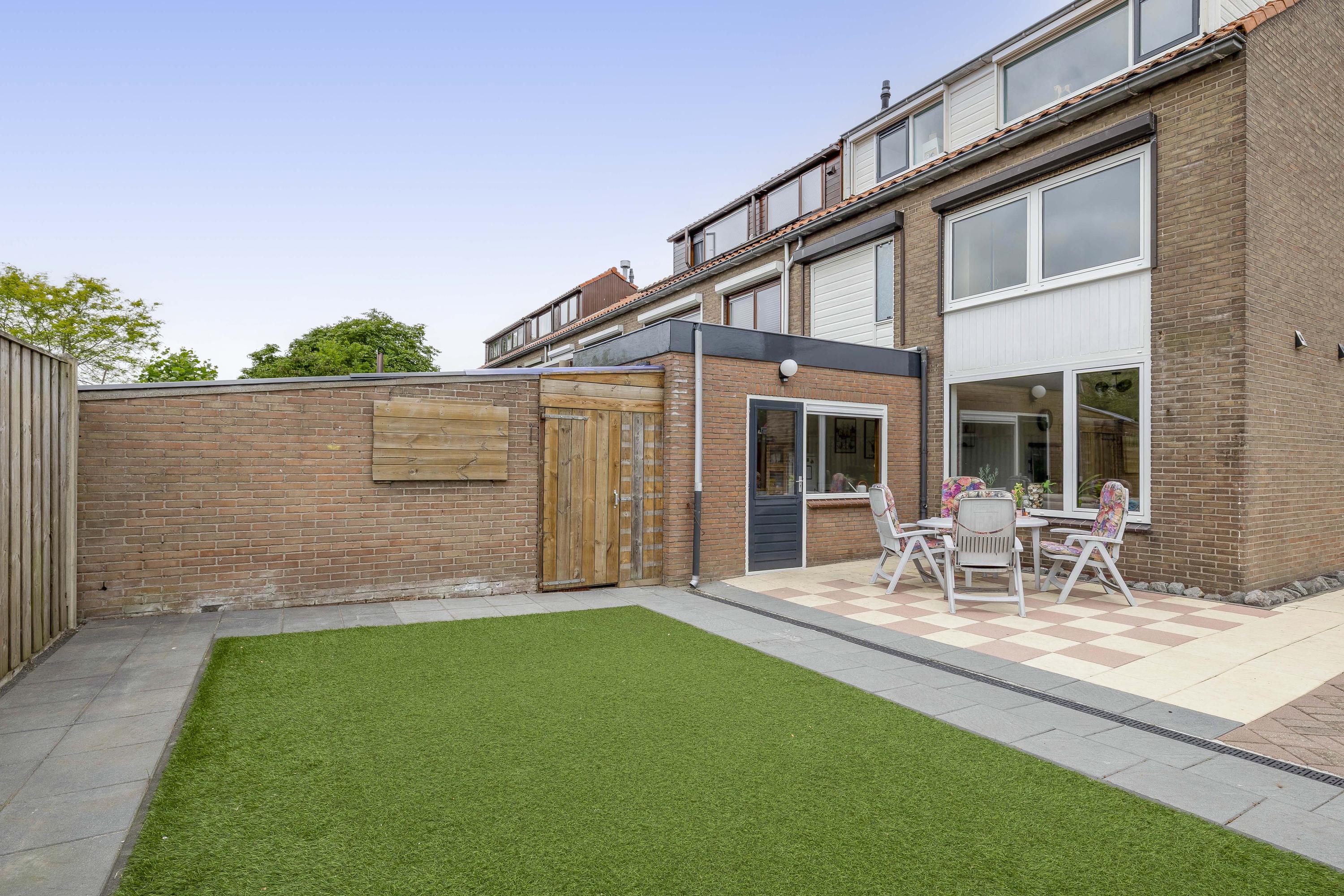 De woning heeft een voor-, zij- en achtertuin. De achtertuin is netjes bestraat, omgeven door houten schuttingen, met kunstgras en gelegen op het zuidwesten, waardoor je hier tot in de avond van de zon kunt genieten. Verderis een stenen berging voor het opbergen van de fiets ed. Daarnaast is er aan de zijkant van de woning ruimte om een auto op eigen terrein te parkeren.