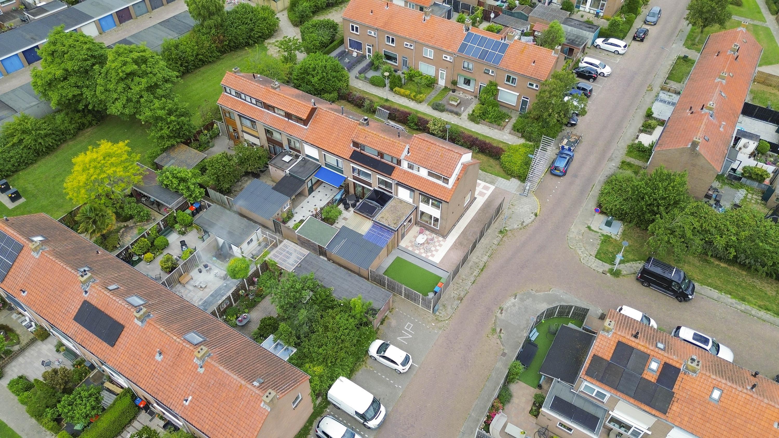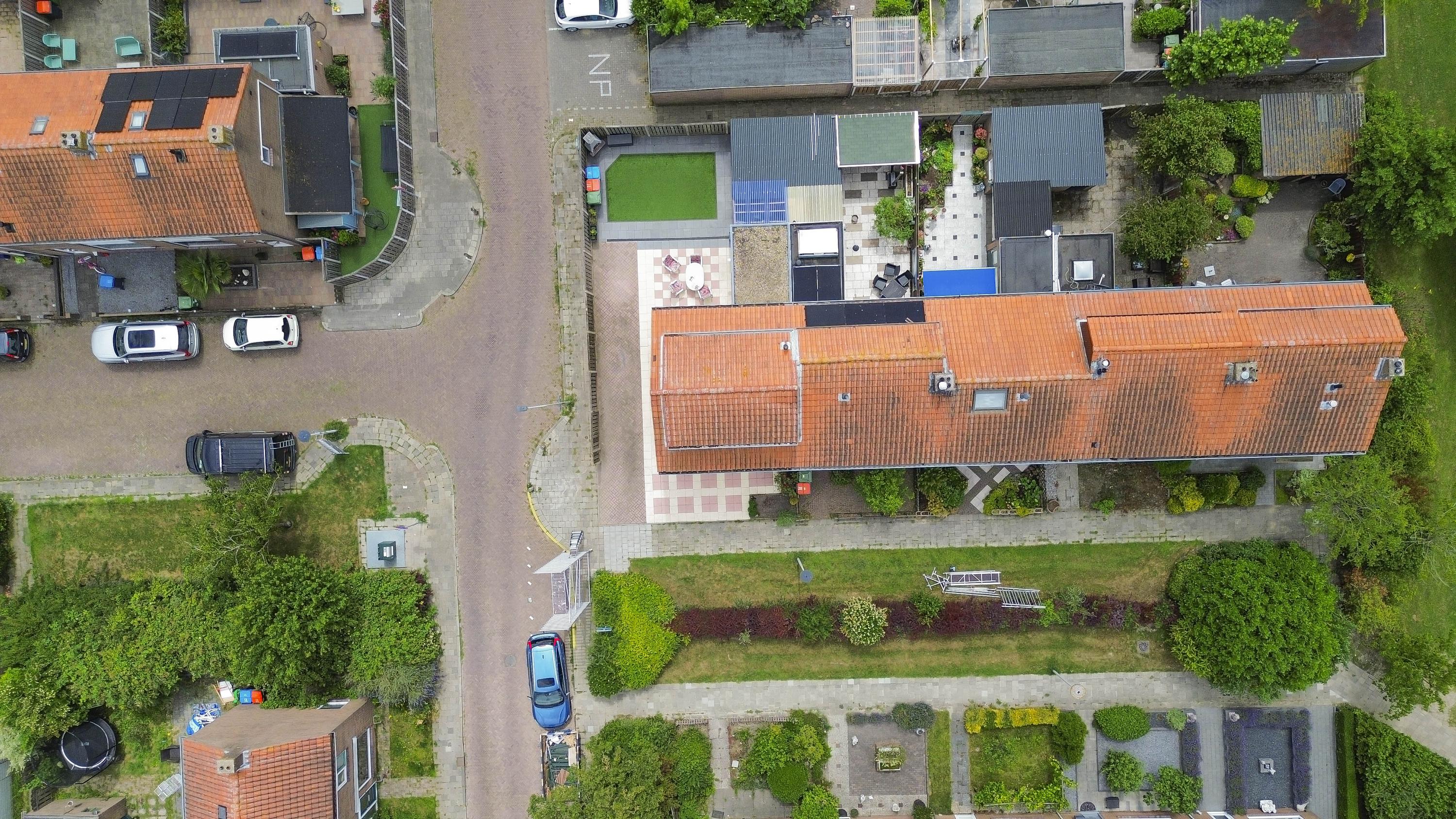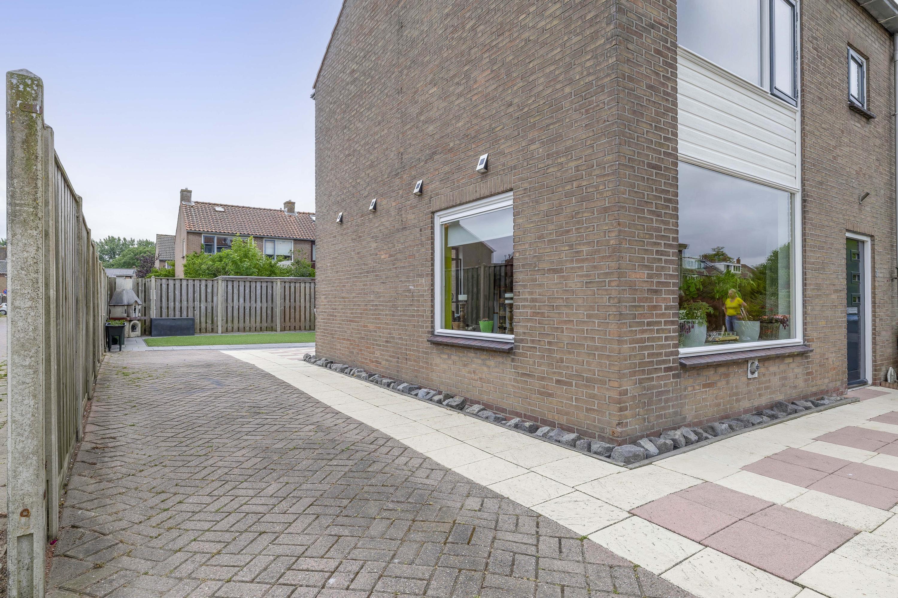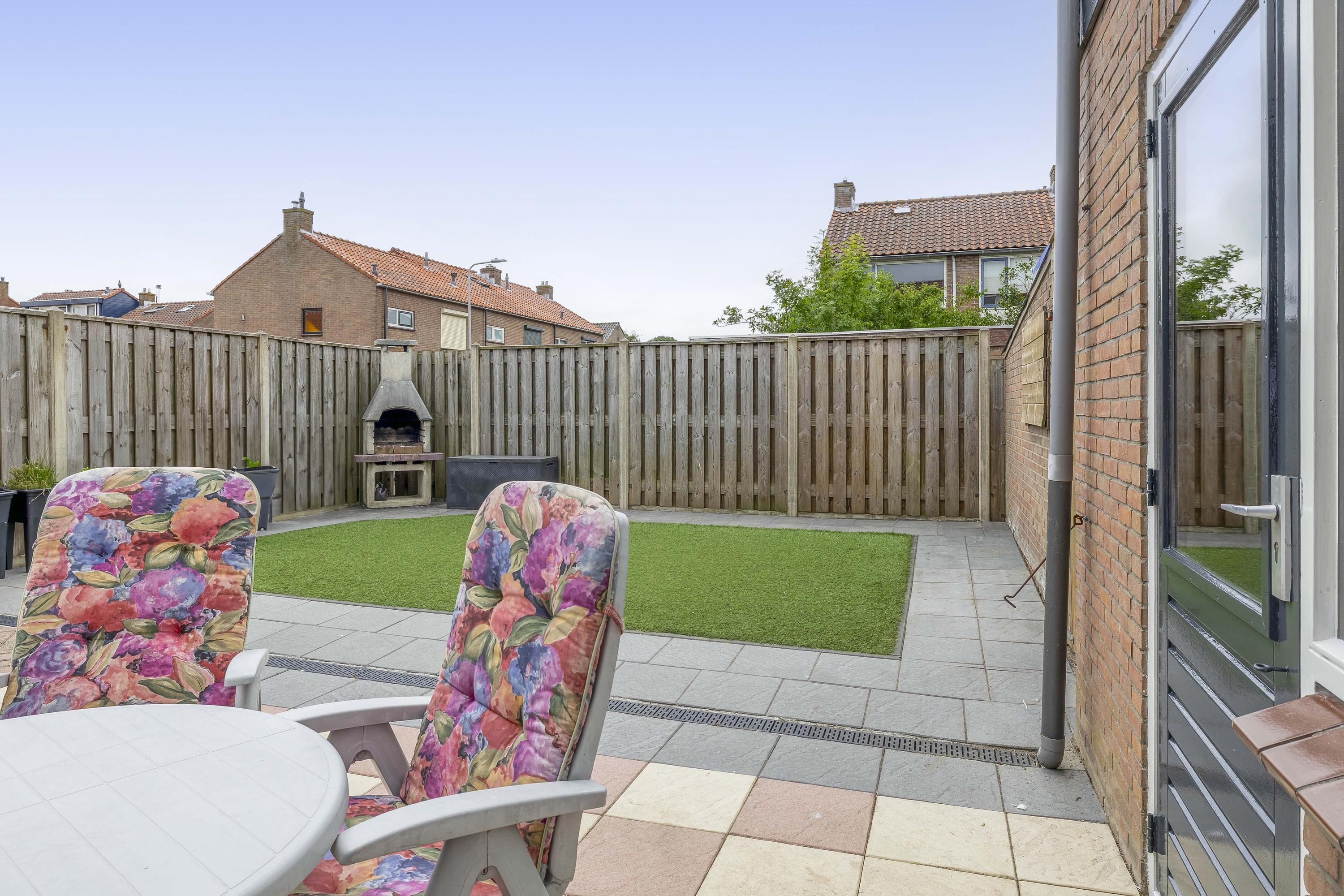 De woning heeft een voor-, zij- en achtertuin. De achtertuin is netjes bestraat, omgeven door houten schuttingen, met kunstgras en gelegen op het zuidwesten, waardoor je hier tot in de avond van de zon kunt genieten. Verderis een stenen berging voor het opbergen van de fiets ed. Daarnaast is er aan de zijkant van de woning ruimte om een auto op eigen terrein te parkeren.