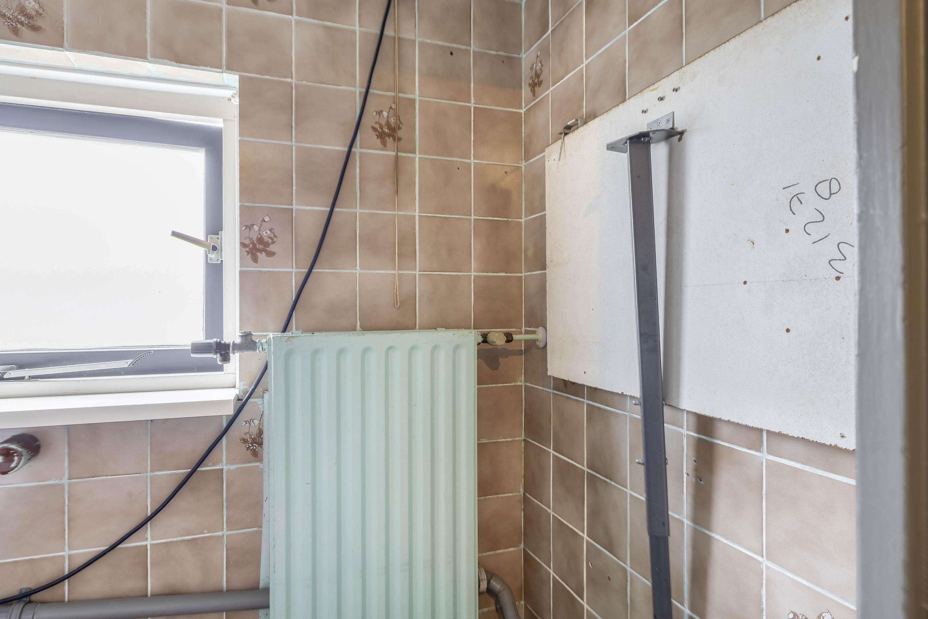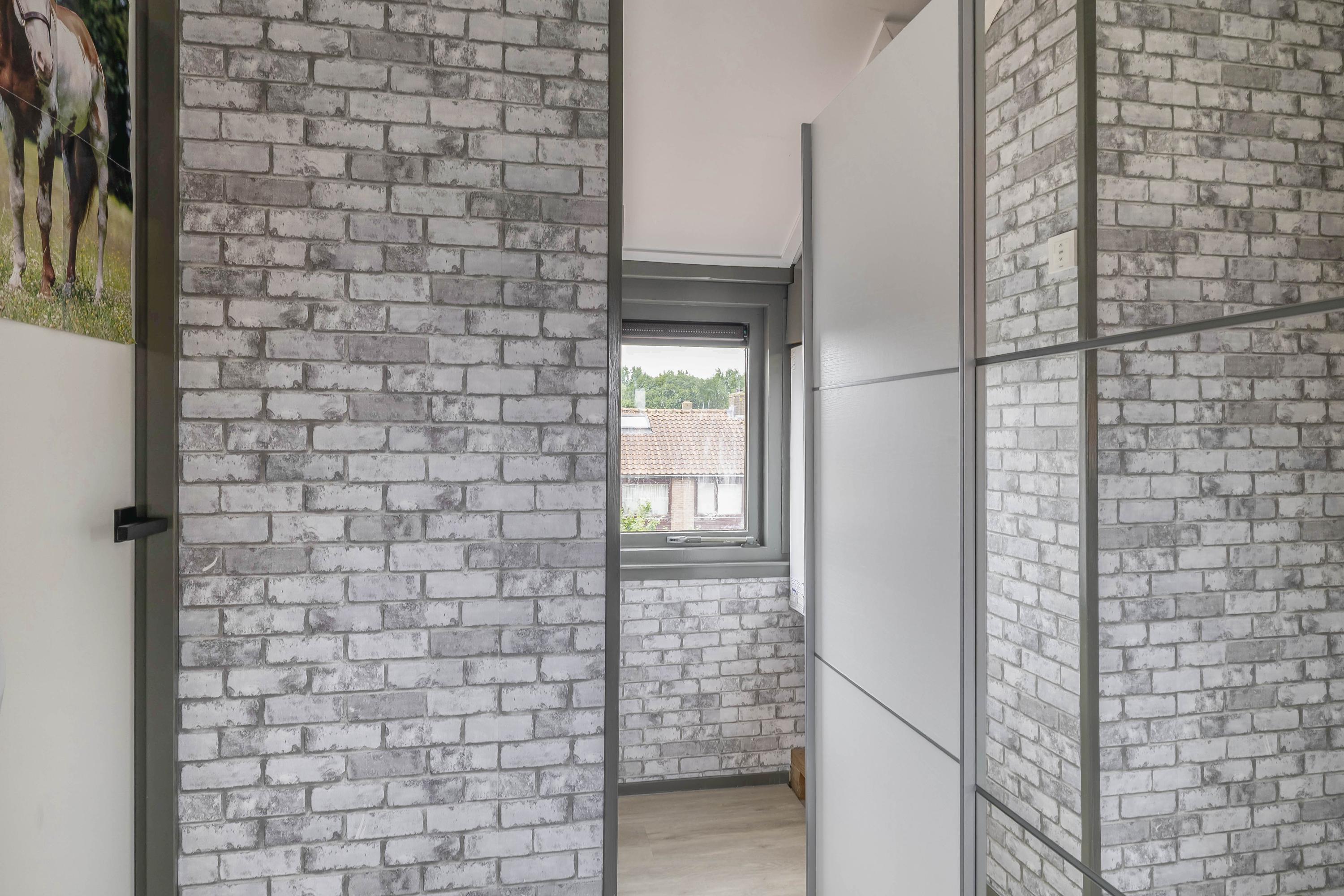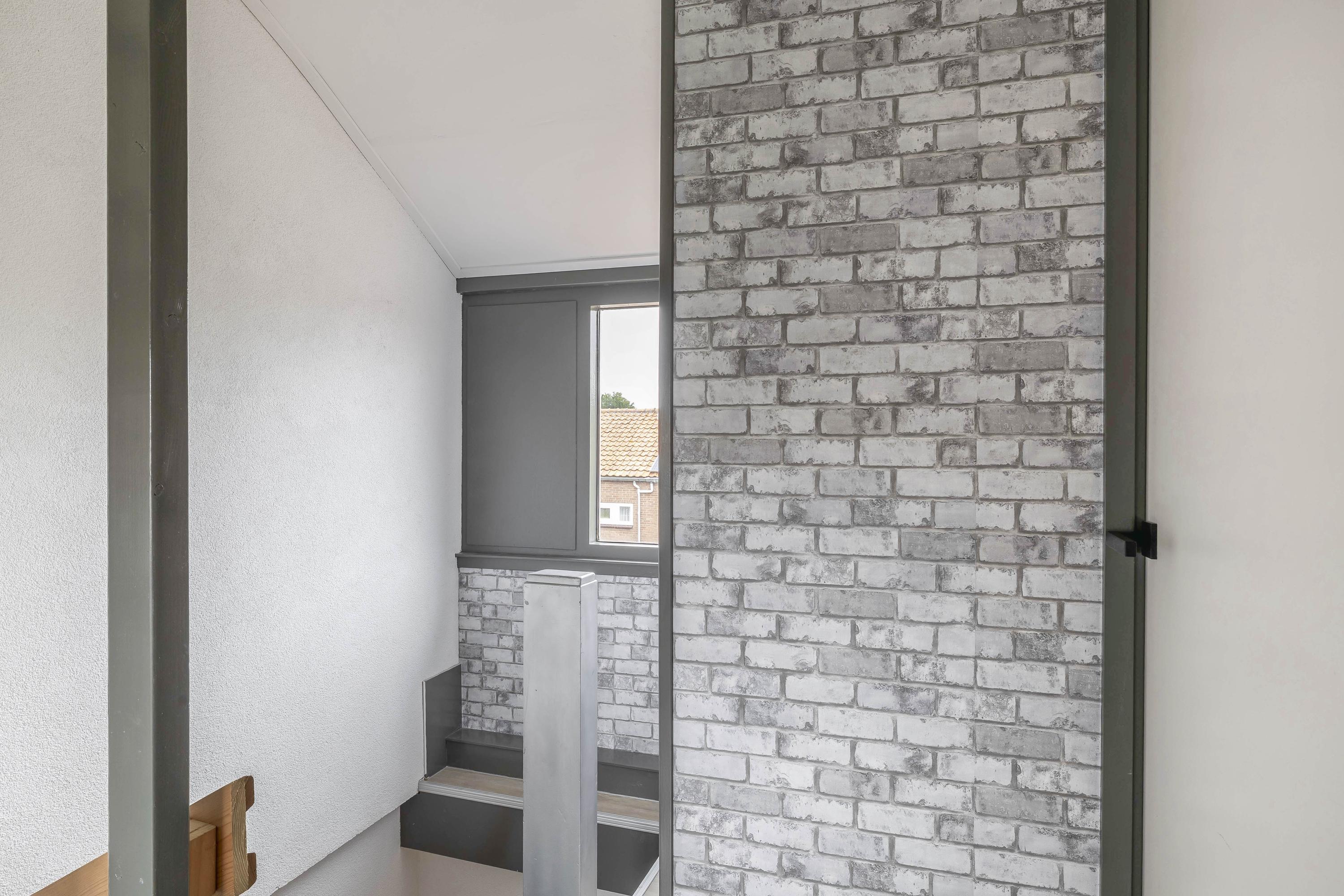 Overloop met de trap naar de 2e verdieping en toegang tot de 2 slaapkamers, de badkamer, een aparte 2e toiletruimte en de wasruimte. Er zijn twee slaapkamers, waarvan één aan de voorzijde en één aan de achterzijde, deze is voorzien van een rolluik. De badkamer ligt eveneens aan de achterzijde en beschikt over een douchecabine, wastafelmeubel en designradiator. Het raam zorgt voor natuurlijk licht en ventilatie.