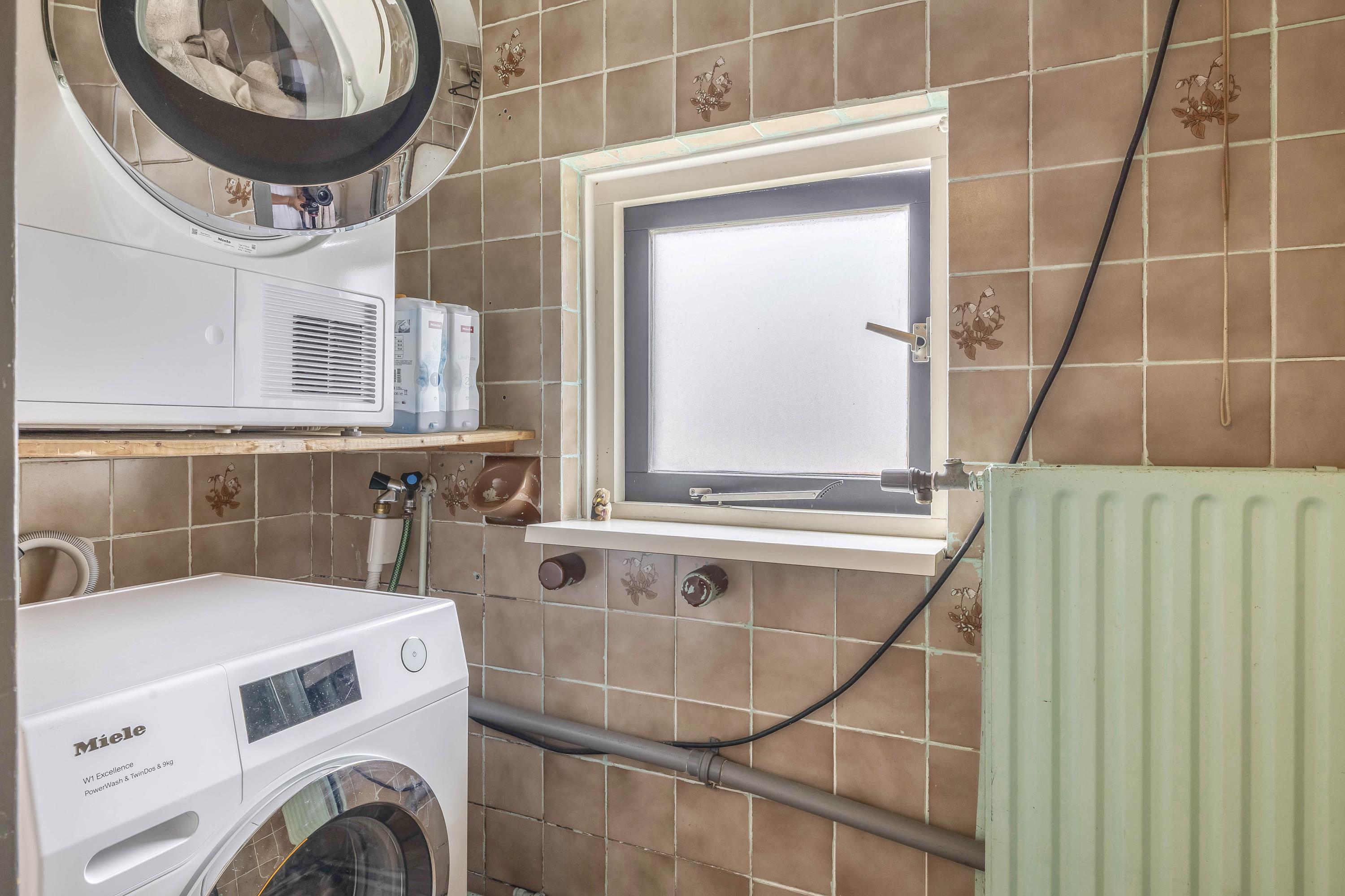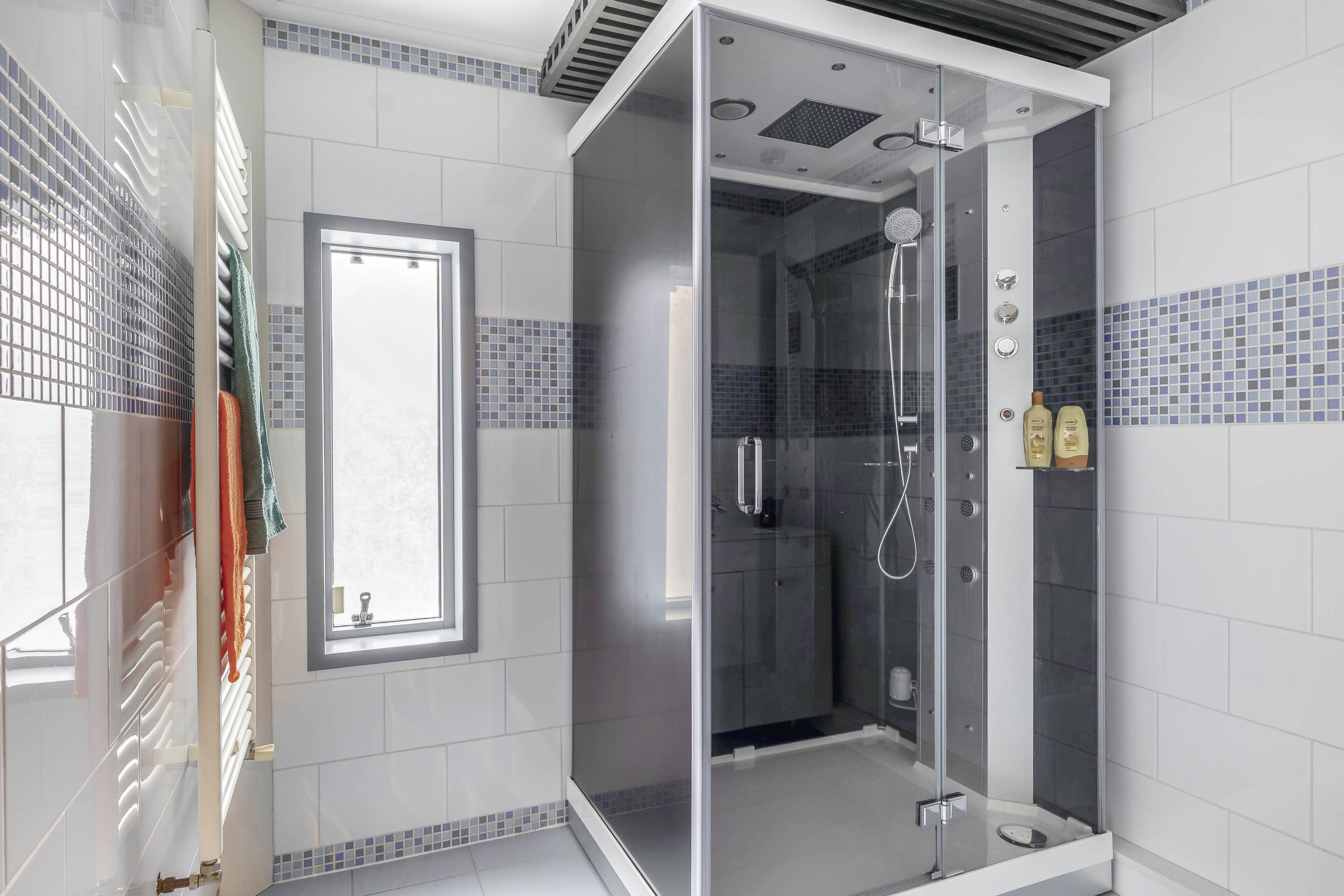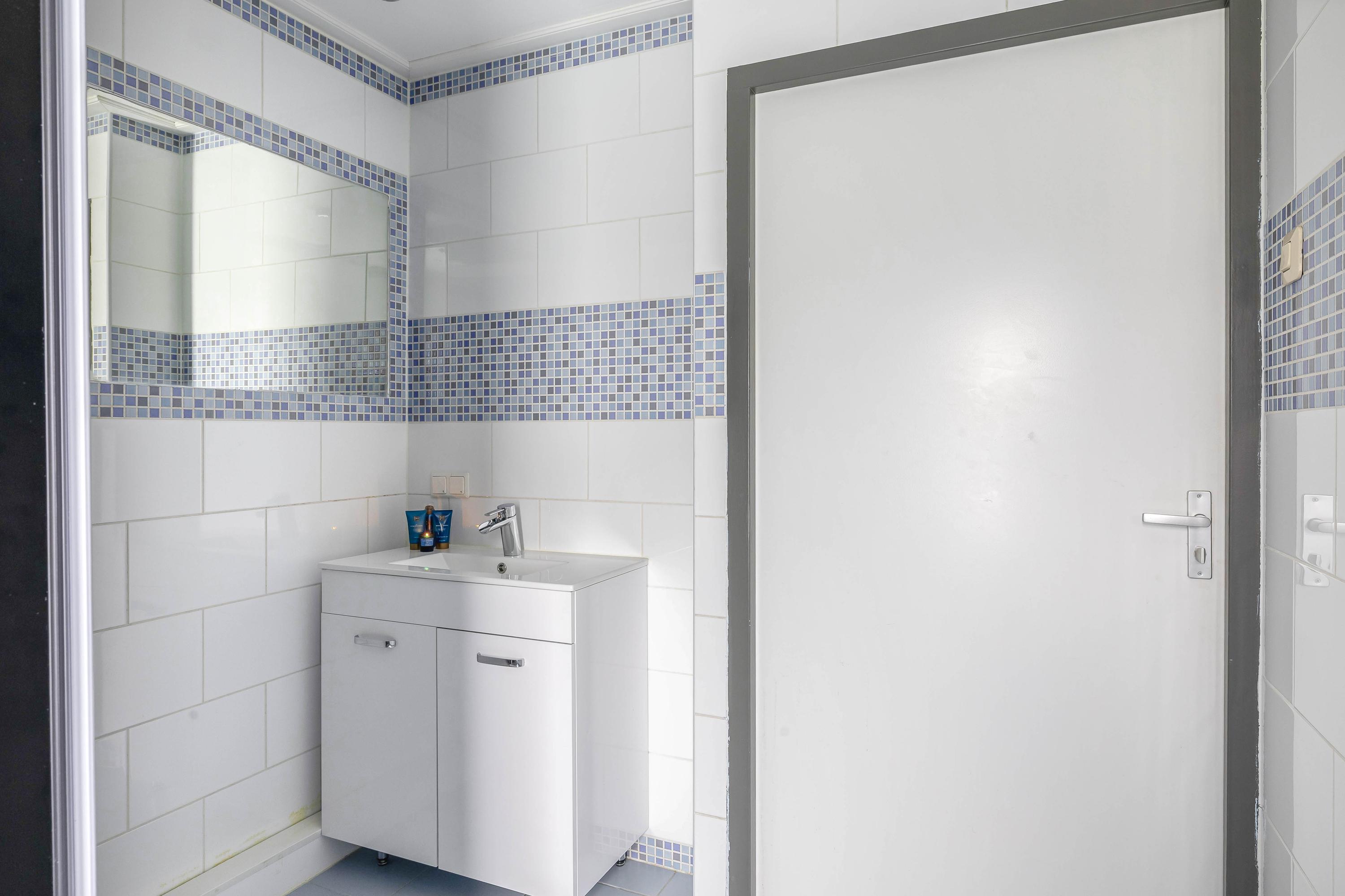 Overloop met de trap naar de 2e verdieping en toegang tot de 2 slaapkamers, de badkamer, een aparte 2e toiletruimte en de wasruimte. Er zijn twee slaapkamers, waarvan één aan de voorzijde en één aan de achterzijde, deze is voorzien van een rolluik. De badkamer ligt eveneens aan de achterzijde en beschikt over een douchecabine, wastafelmeubel en designradiator. Het raam zorgt voor natuurlijk licht en ventilatie.