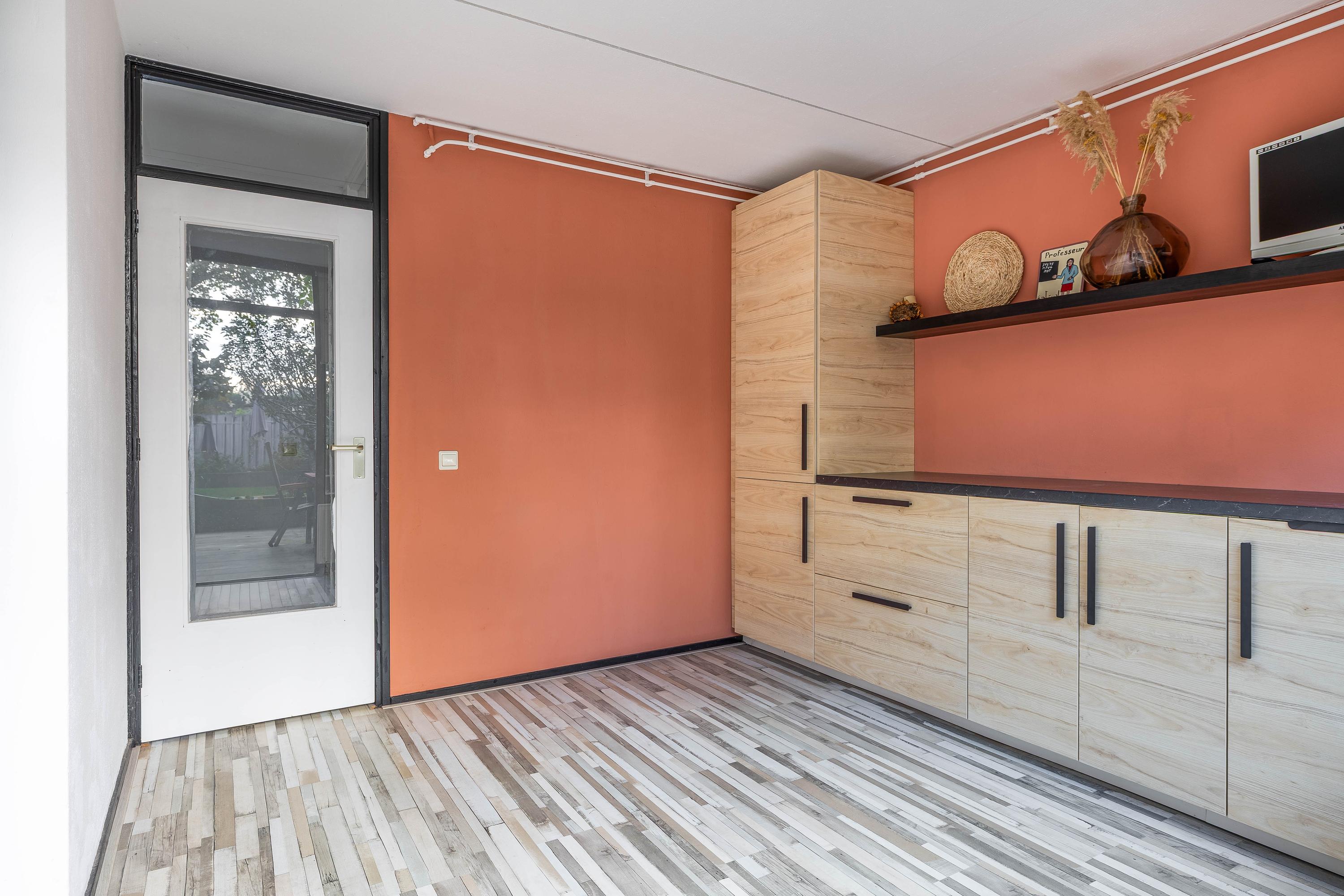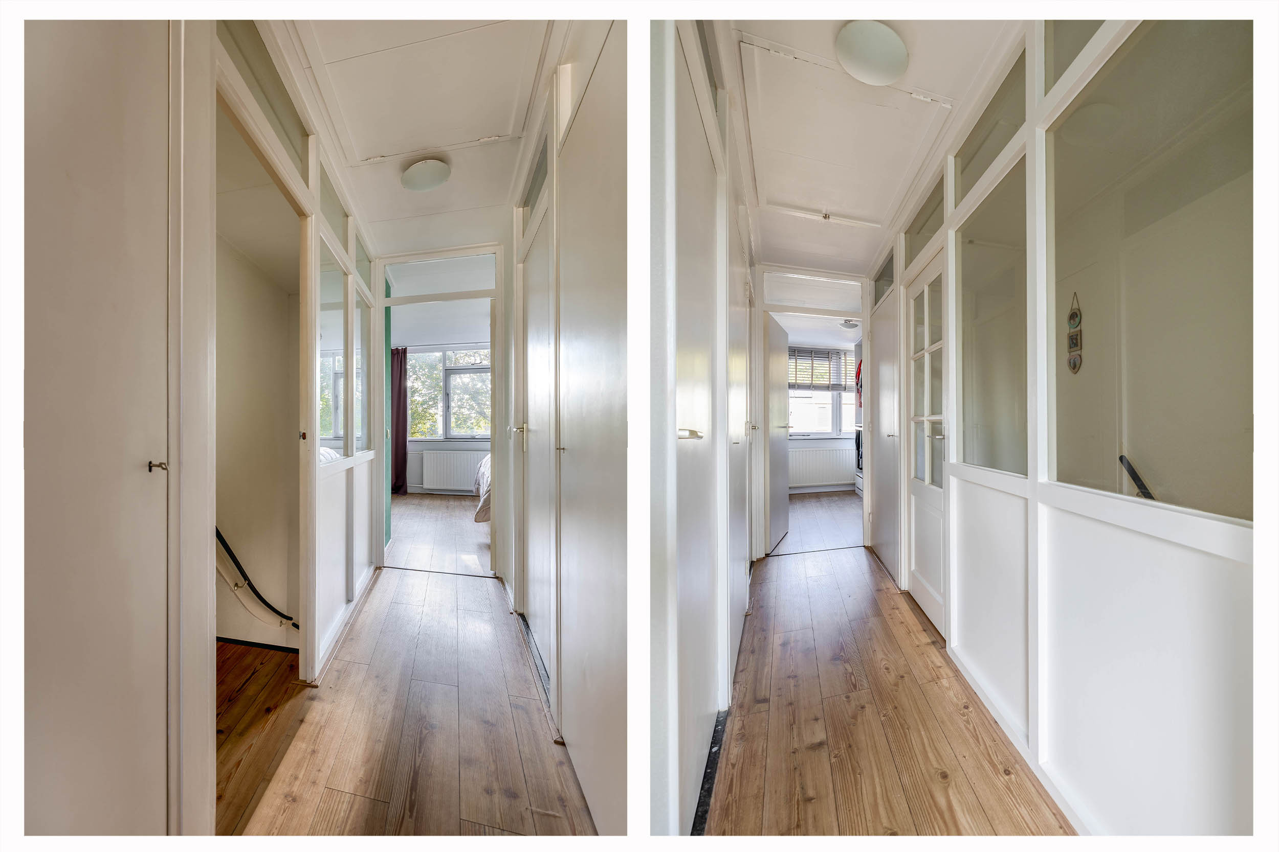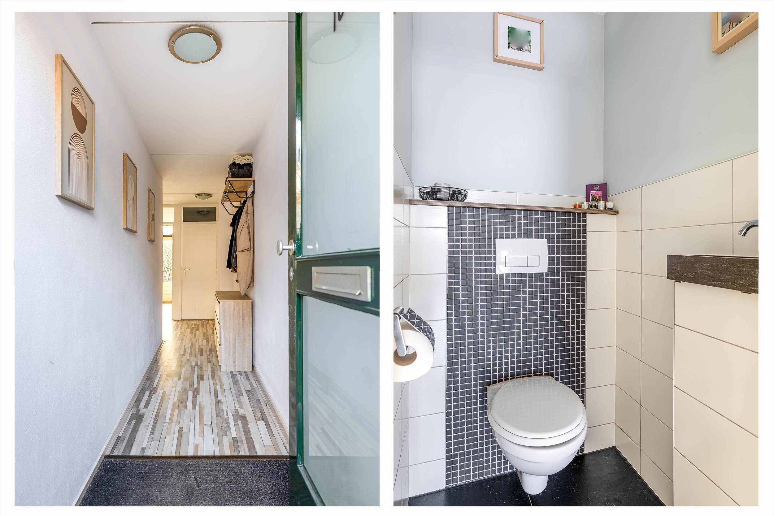 Via de voortuin met eigen oprit bereik je de entree van de woning en de meterkast links naast de voordeur. In de hal vind je een toilet met hangend closet en fonteintje én de deur naar de inpandige garage. De garage is voorzien van elektra, wateraansluiting, een sectionaaldeur en biedt voldoende ruimte voor opslag of het parkeren van een auto. Aan de achterzijde van de woning bevindt zich de tuinkamer die nu is ingericht als bijkeuken. Deze praktische ruimte beschikt over een vaste kast met wasmachine- en drogeraansluiting en biedt via een deur toegang tot de achtertuin. Vanuit de hal is er tevens een tussenhal met de trapopgang naar de eerste verdieping. De begane grond is voorzien van een laminaatvloer.