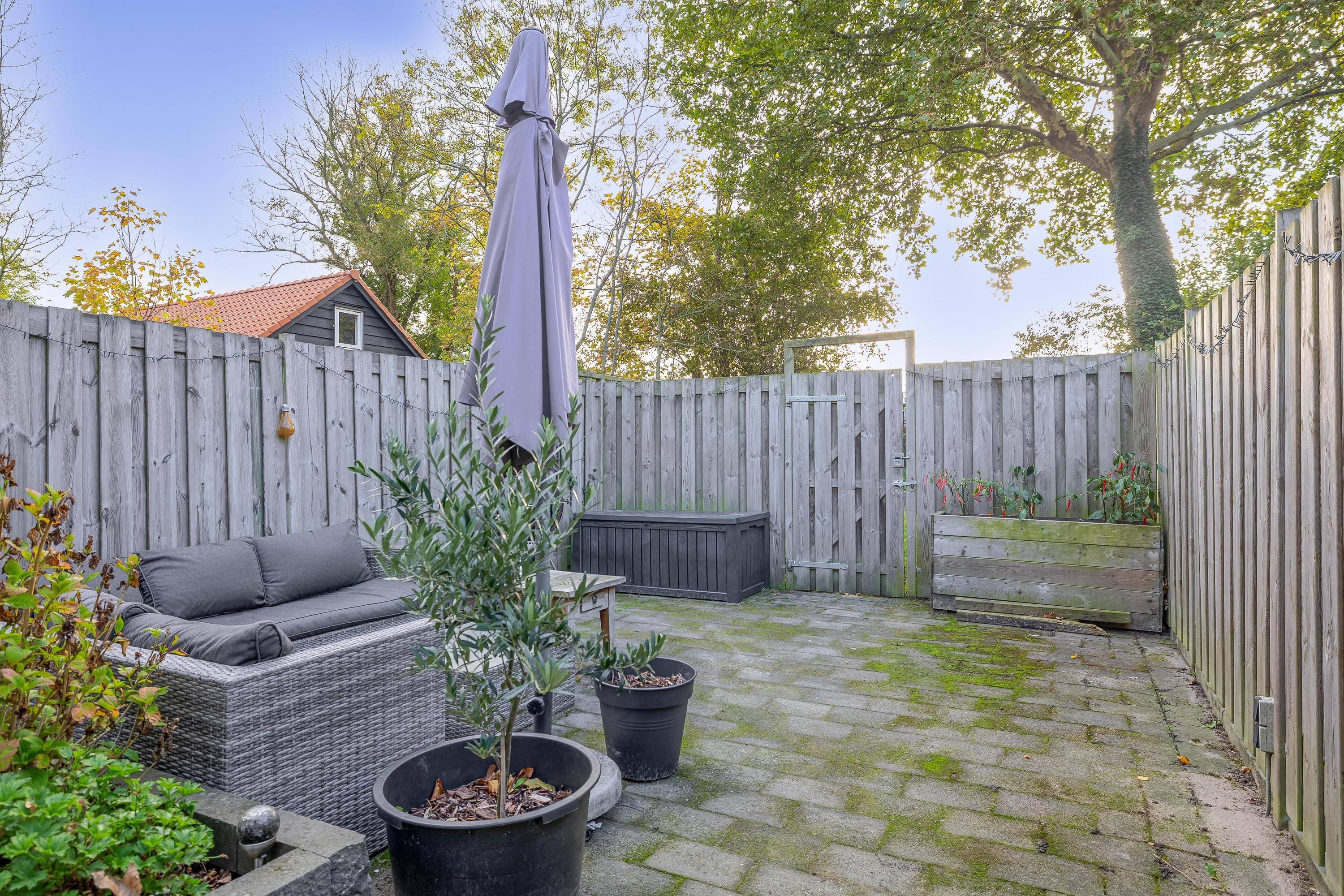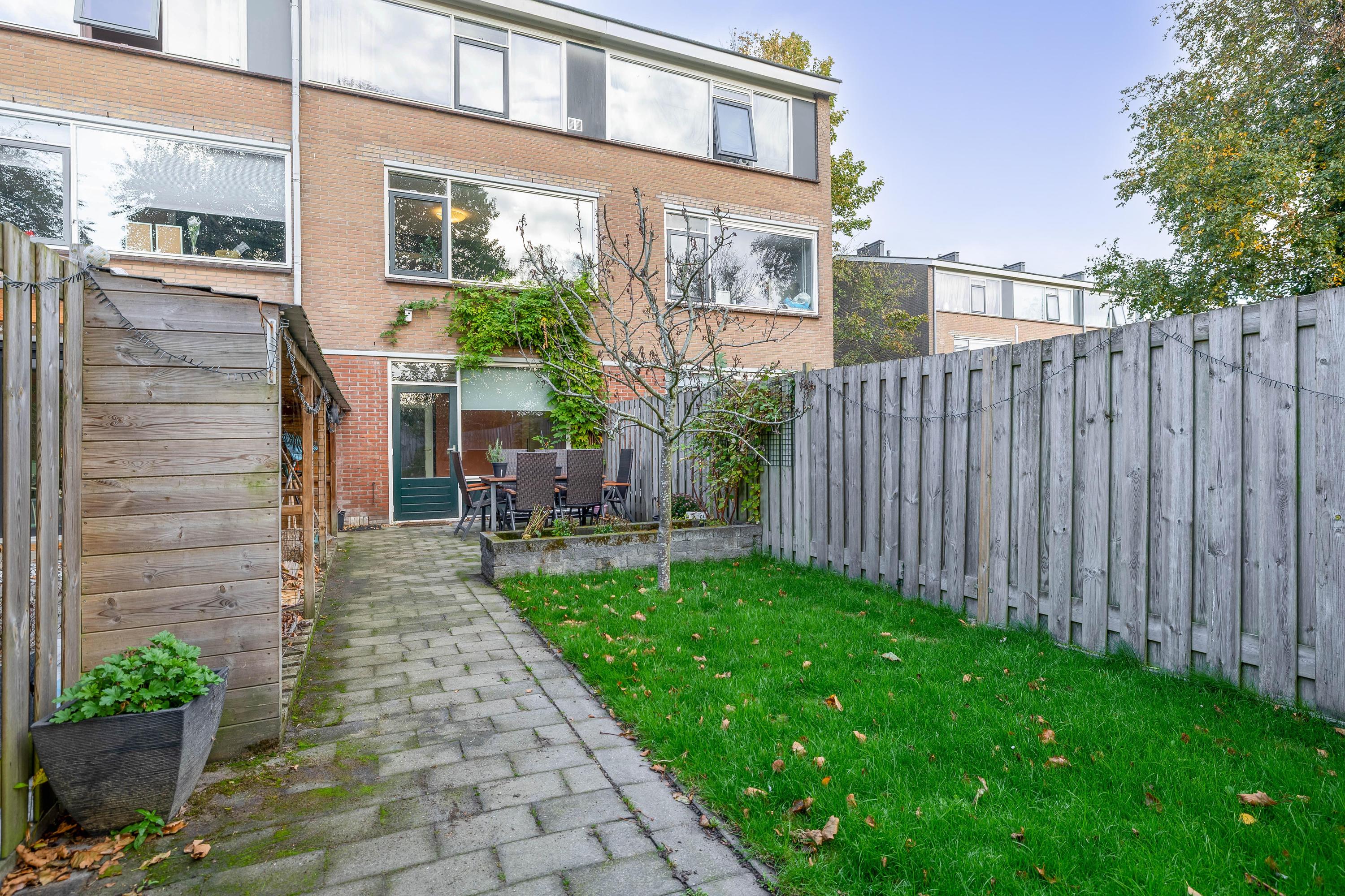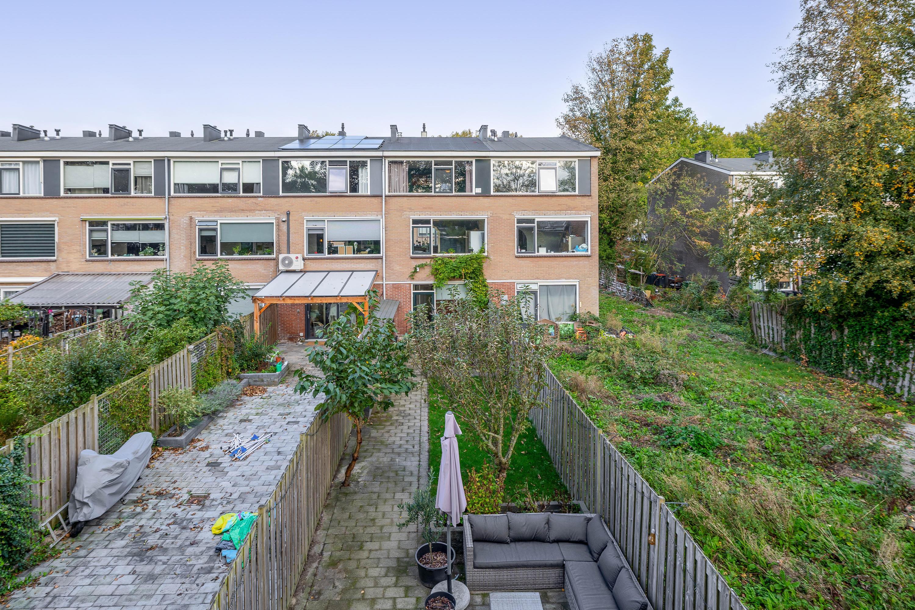 De diepe (circa 18 meter!) achtertuin ligt op het zuidoosten en is deels betegeld, heeft plantenborders en is omheind met houten schuttingen. Achterin de tuin is een achterom aanwezig, uitkomend op een grasstrook (gemeentegrond). Verder nog een buitenkraan op de achtergevel, ideaal voor het water geven van de planten.