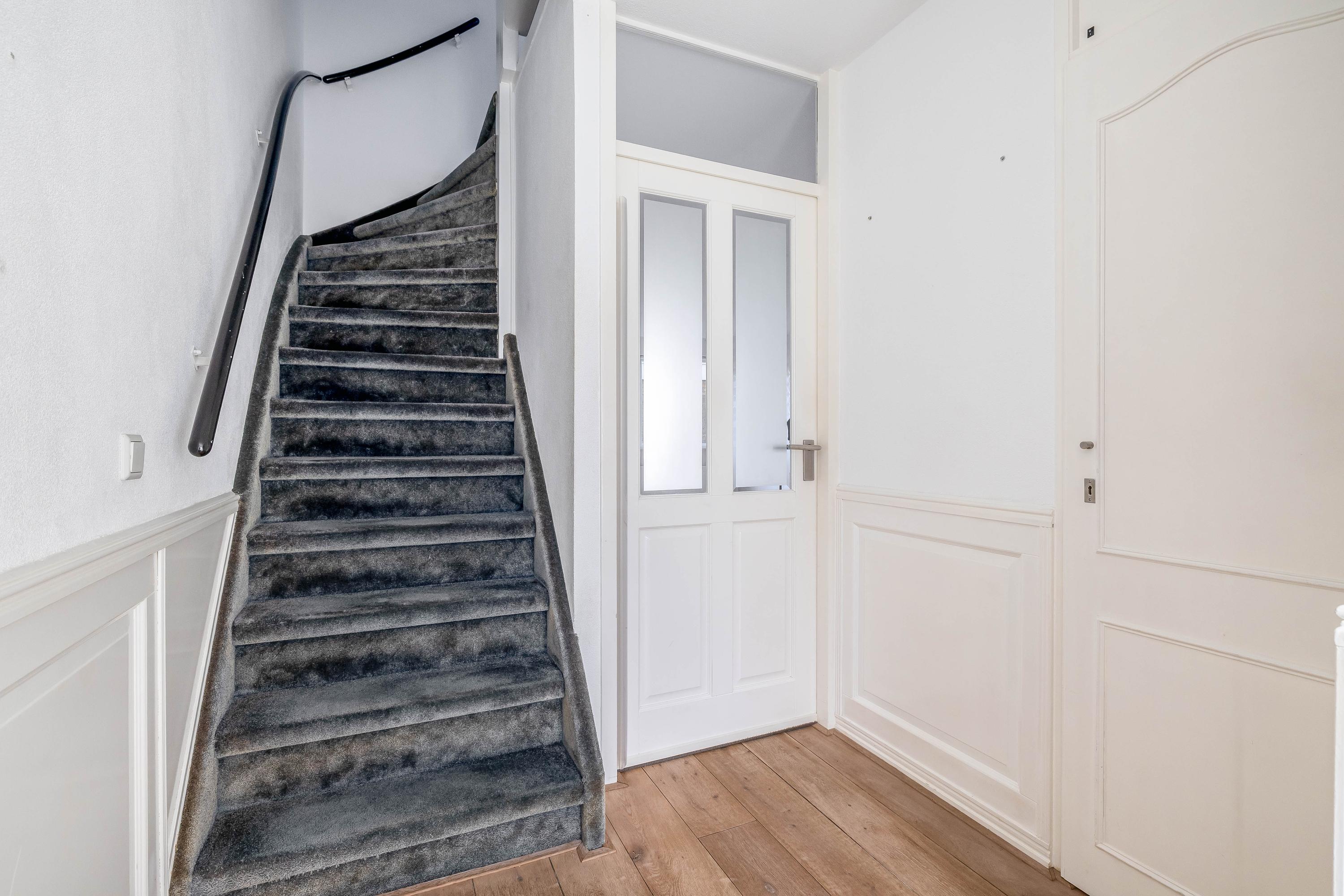 Je komt de woning binnen via de entree met meterkast, trapopgang naar de 1e verdieping en een toiletruimte met hangend closet en fonteintje. Vanuit de hal heb je toegang tot de woonkamer, die is voorzien van een sfeervolle gashaard en veel lichtinval. Middels een schuifpui staat de woonkamer in directe verbinding met de achtertuin. Aansluitend bevindt zich de keuken, die is uitgerust met een gaskookplaat, afzuigkap en vaatwasser. De gehele begane grond is afgewerkt met een houten vloer.