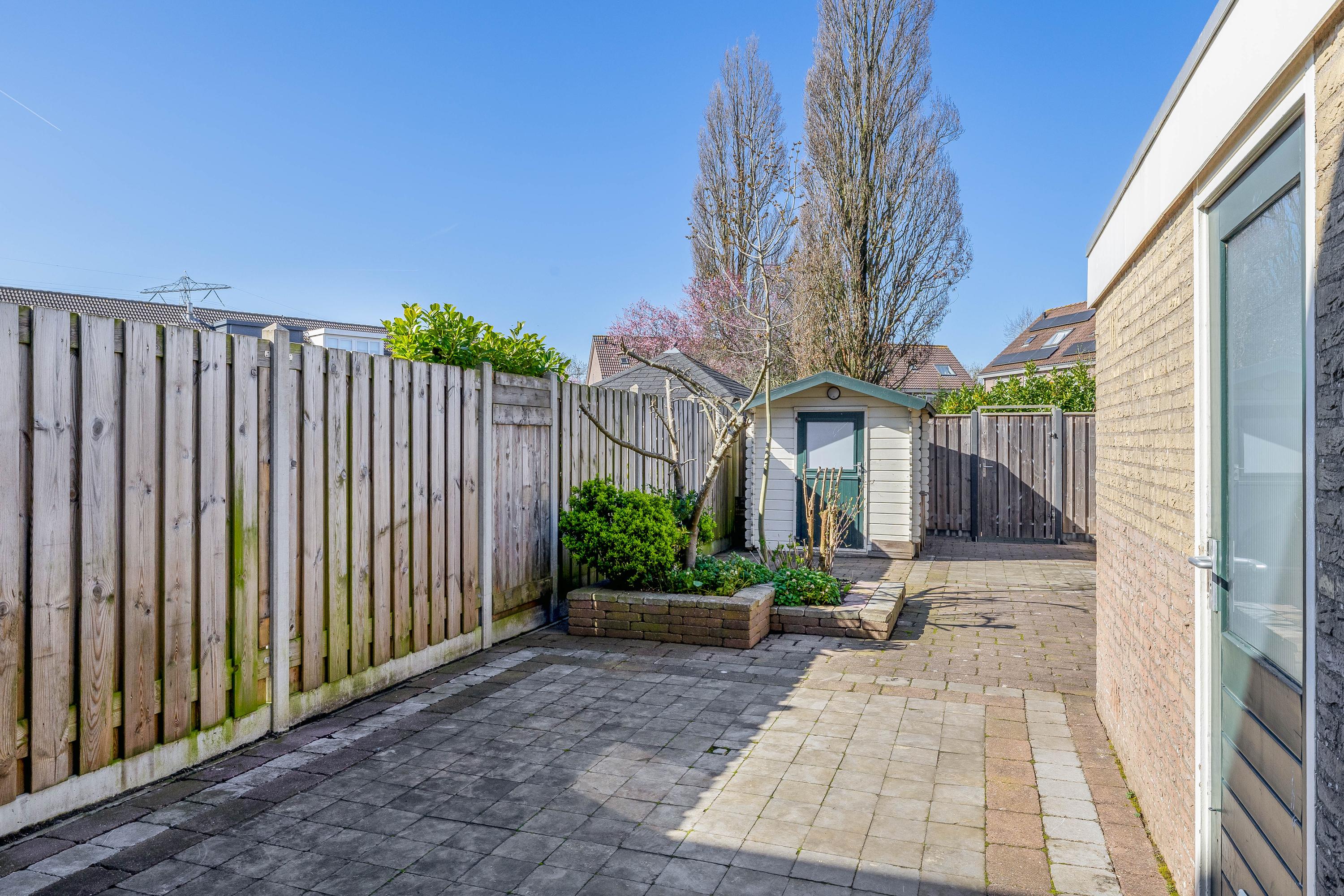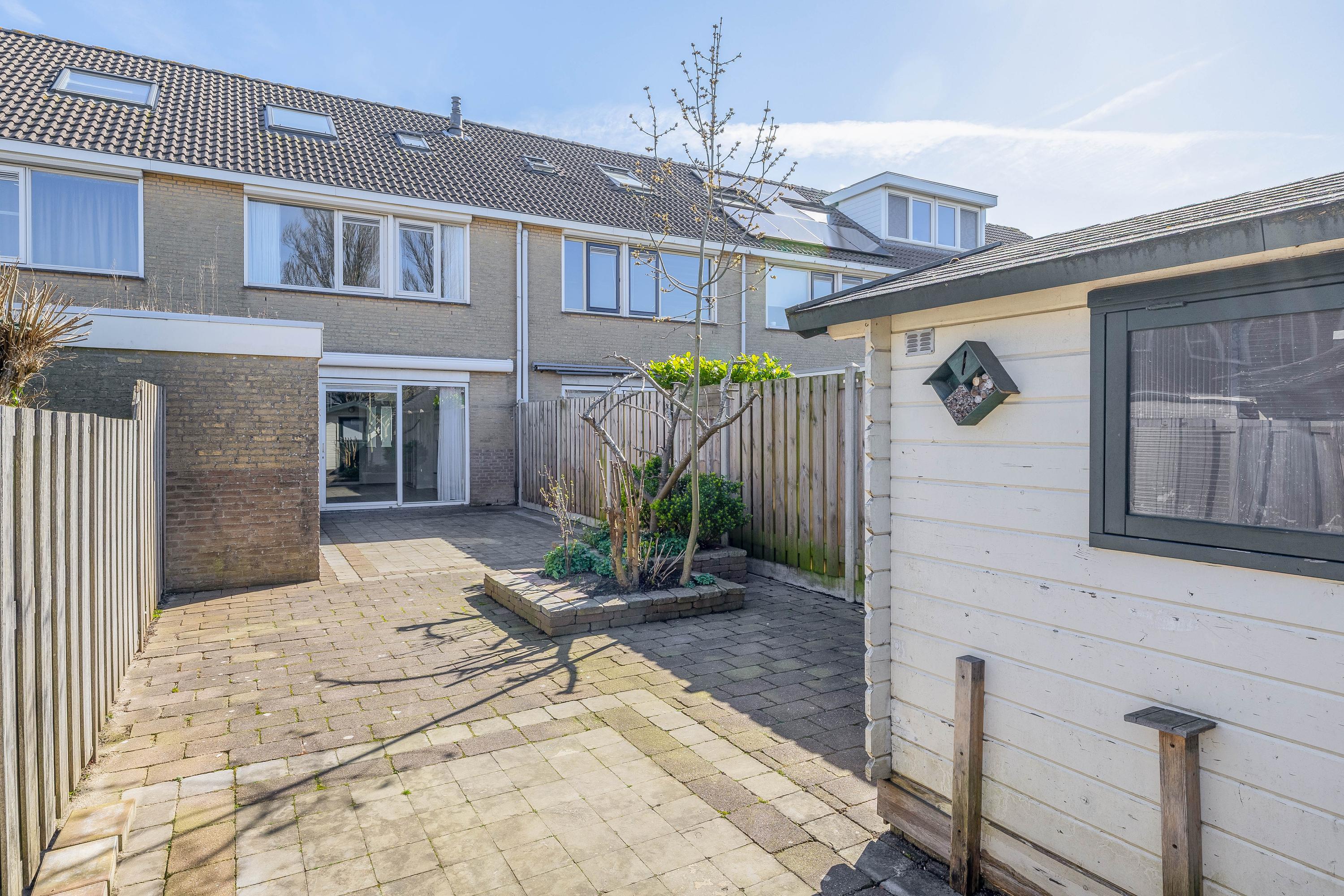De woning beschikt over een diepe achtertuin gelegen op het noordwesten, waardoor je de middag- en avondzon optimaal kunt benutten. De tuin is onderhoudsvriendelijk aangelegd en volledig omheind met houten schuttingen, wat zorgt voor privacy en veiligheid. Aan de achtergevel van de woning is zonwering aanwezig, verder beschikt de tuin over buitenverlichting, een buitenkraan en een praktische achterom. In de tuin bevinden zich twee bergingen: één stenen berging en één houten berging, beide voorzien van elektra, ideaal voor het stallen van fietsen en het opbergen van tuingereedschap of andere spullen.