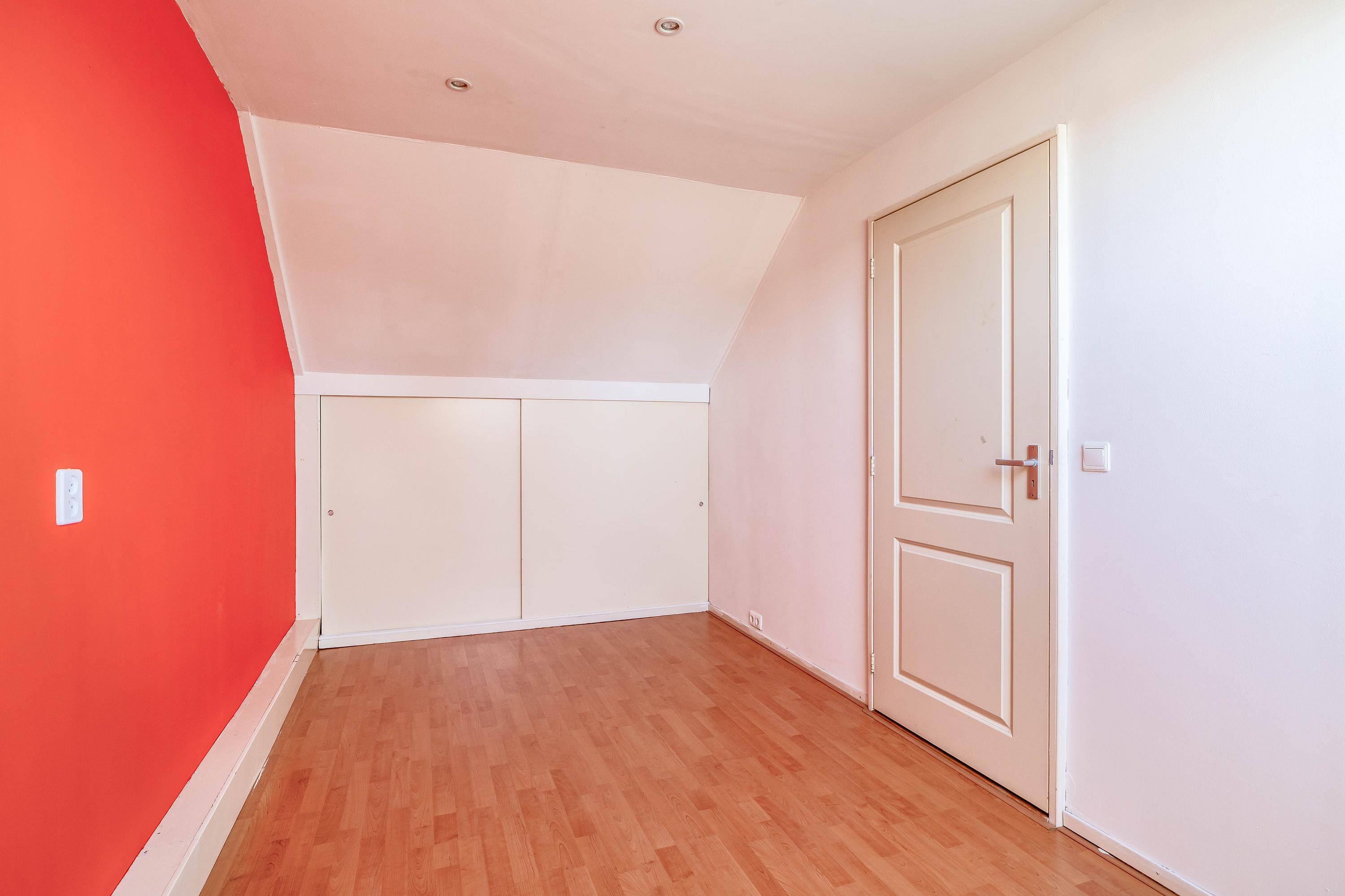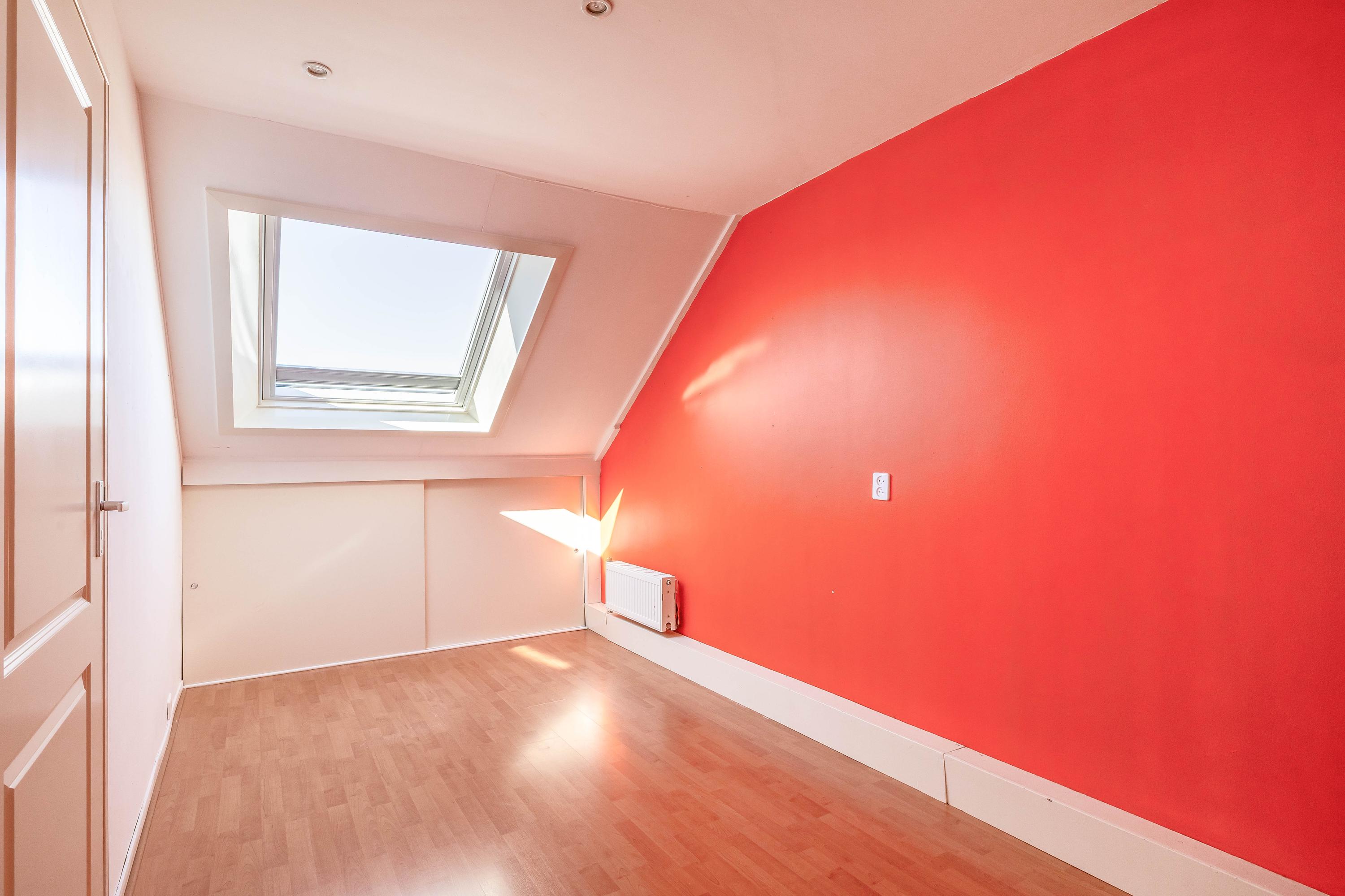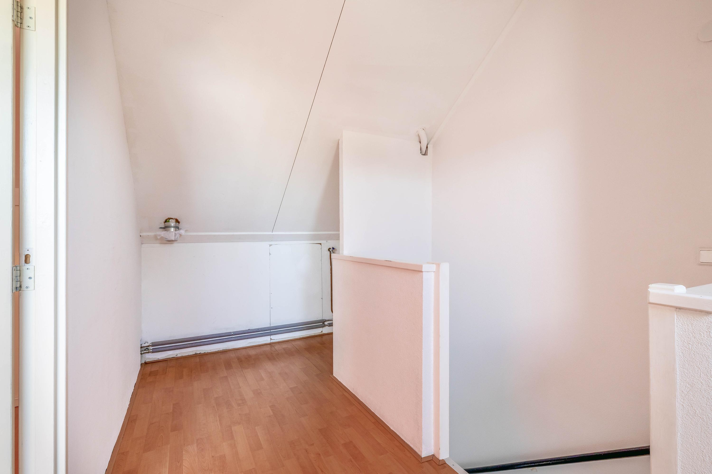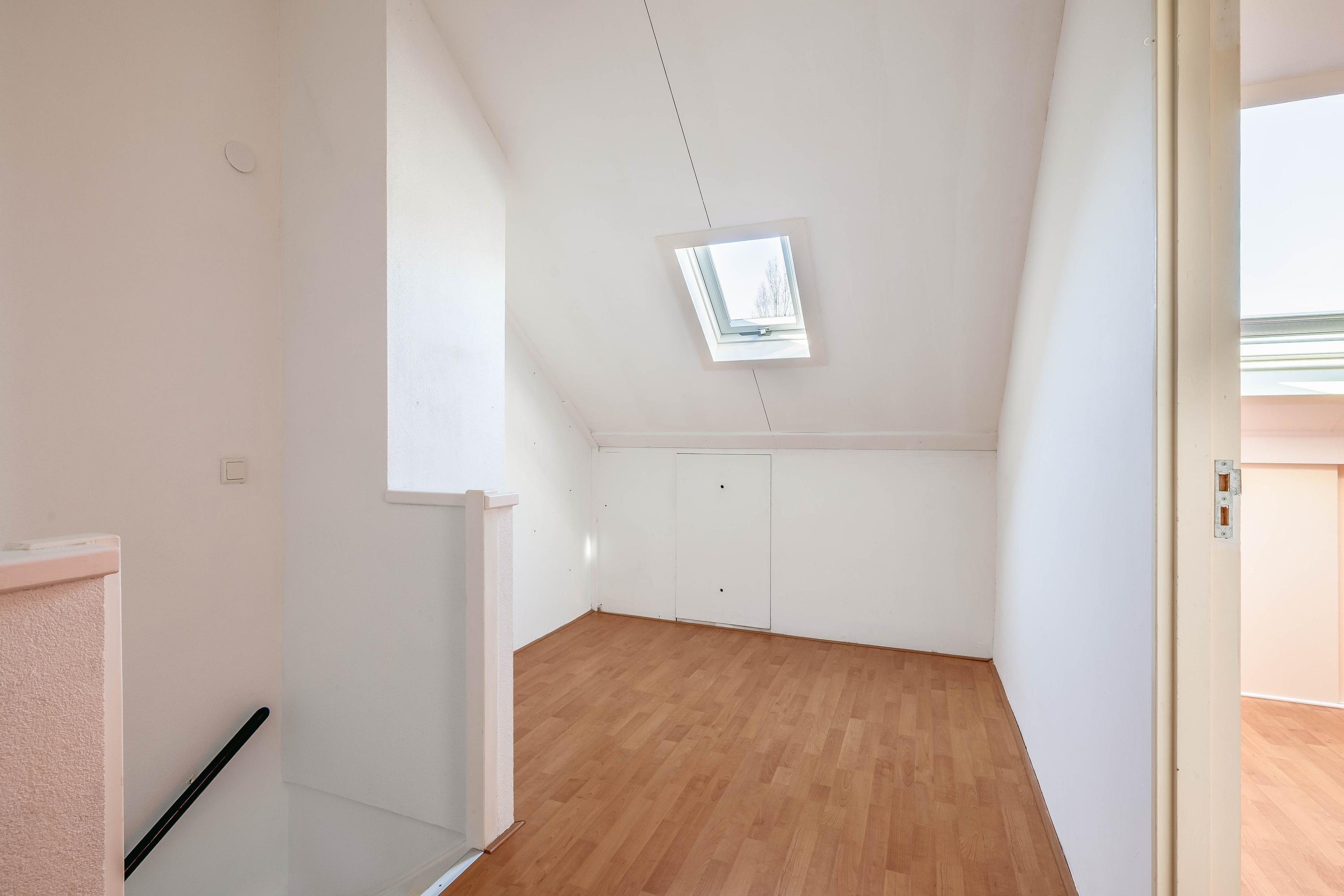 Via een vaste trap bereik je de zolderverdieping. Hier bevindt zich een ruime overloop met de opstelling van de cv-combiketel (Intergas, 2023) en de aansluitingen voor de wasmachine en droger. Daarnaast is er een extra slaapkamer aanwezig, die door het dakraam beschikt over voldoende lichtinval. Ook is er extra bergruimte achter kniebeschotbergingen, hier achter in een geluidswerende kast is de mechanische ventilatie unit te vinden. Verder is de 2e verdieping afgewerkt met een laminaatvloer.