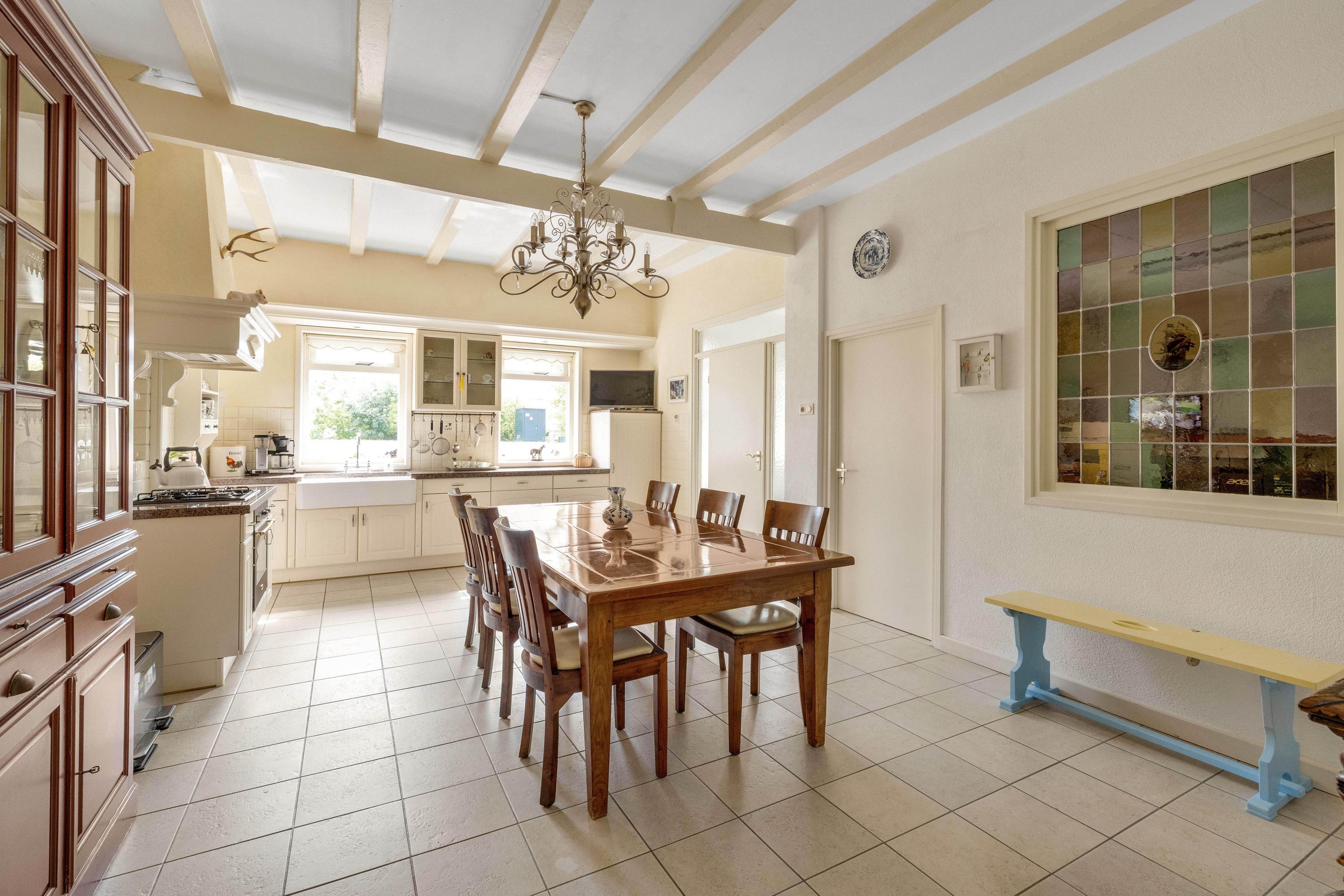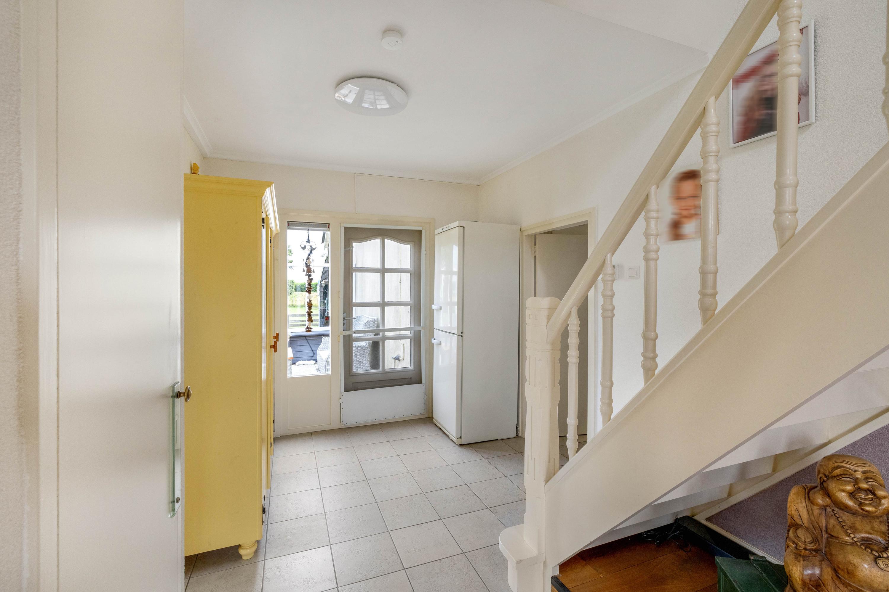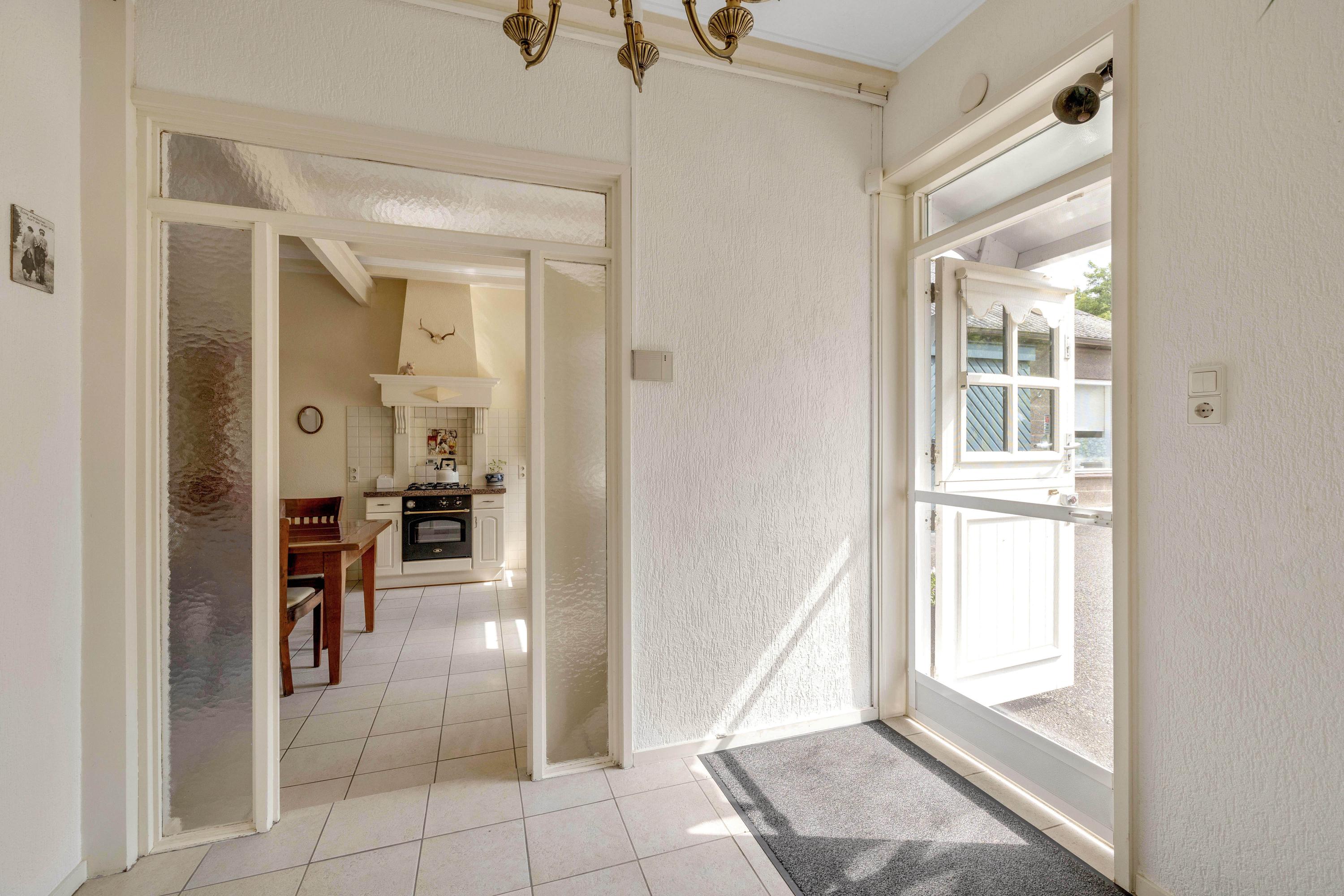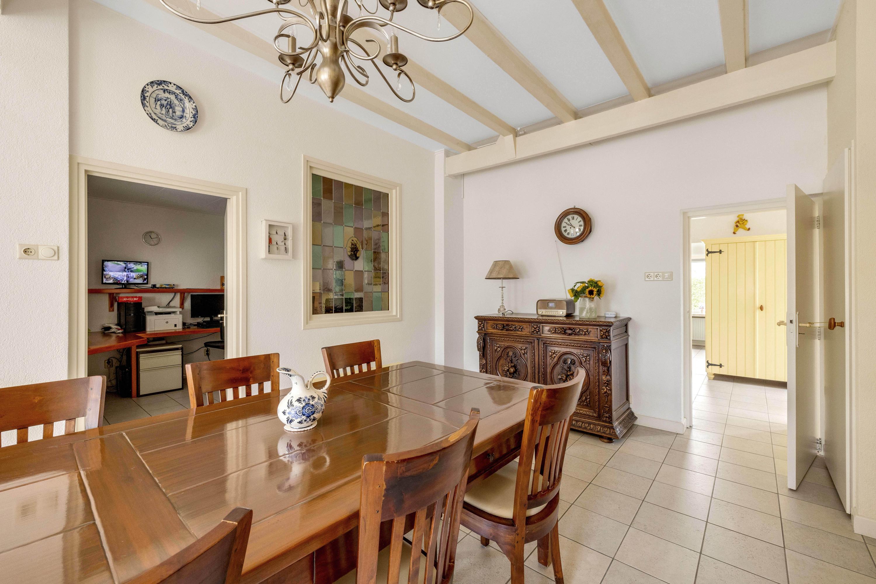 De entree geeft toegang tot de keuken/eetkamer. De leefkeuken is ruim en voorzien van diverse inbouwapparatuur, waaronder een gaskookplaat, afzuigkap, koelkast, vaatwasser en een oven. Vanuit de keuken is de werkkamer bereikbaar, handig voor een kantoor aan huis. Verder een deur uitkomend in de hal met de trapopgang, meterkast en toegang tot zowel de woonkamer als de gang waar het toilet en de badkamer zijn gelegen.