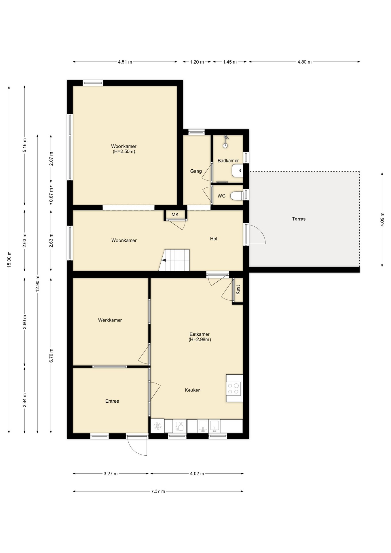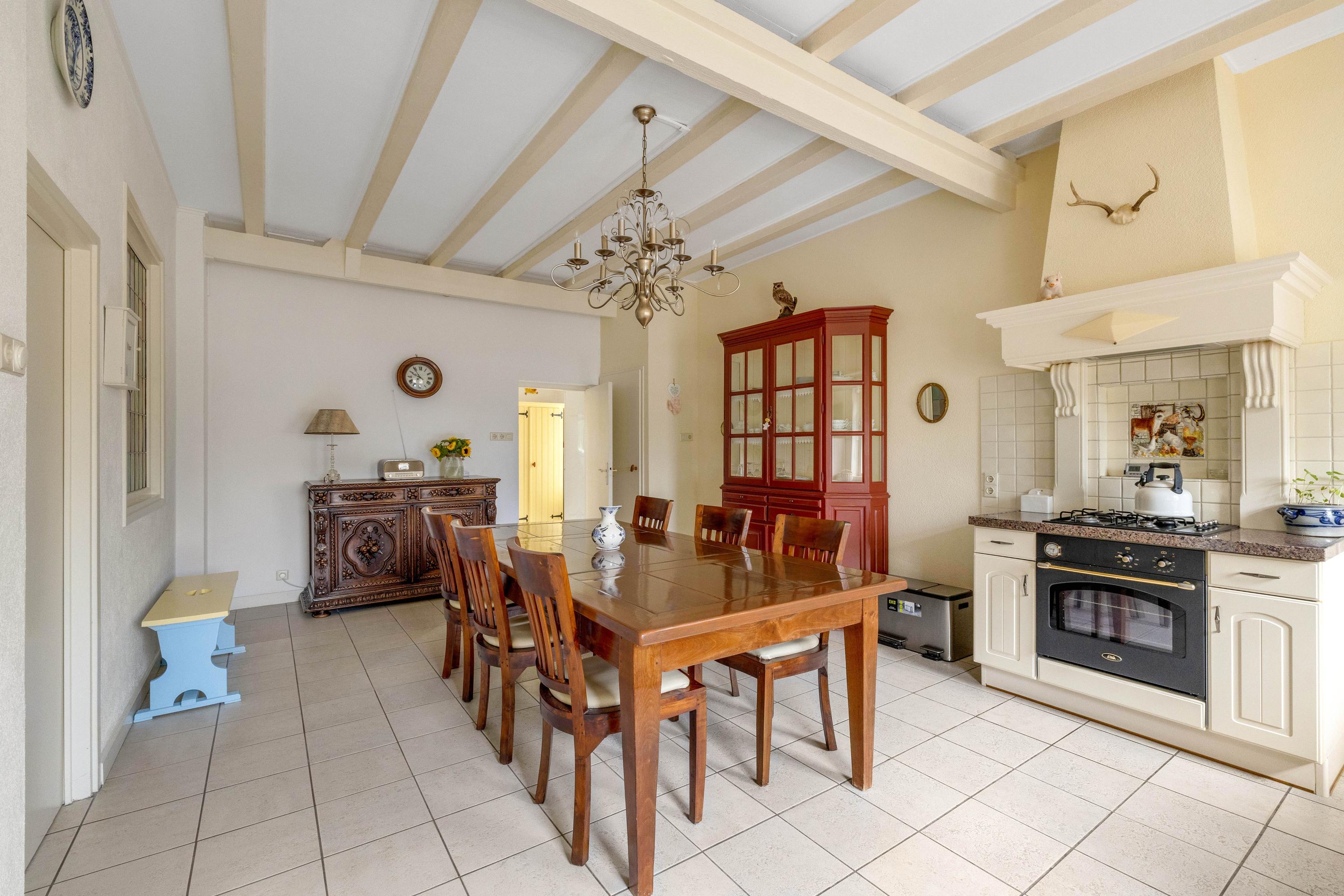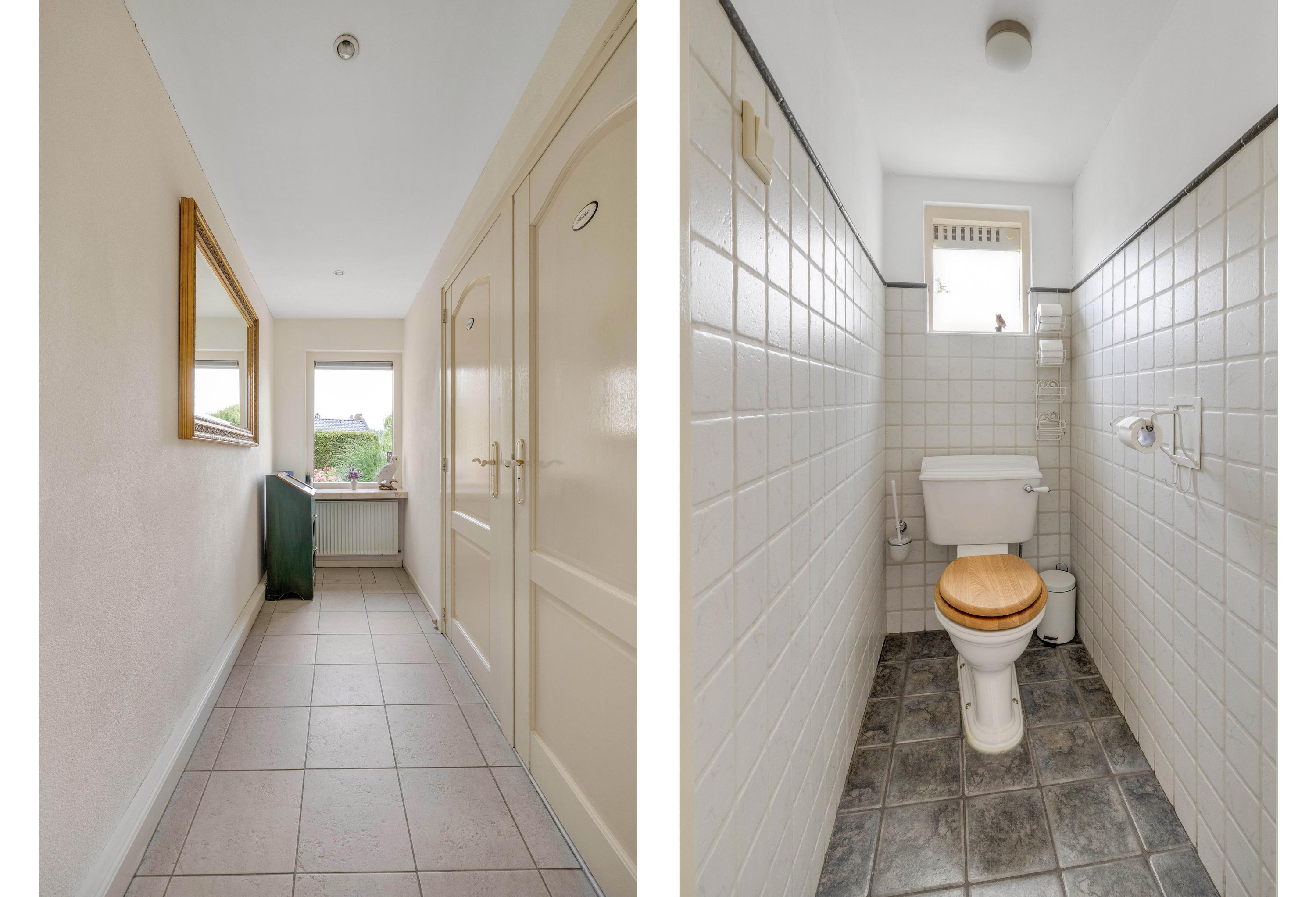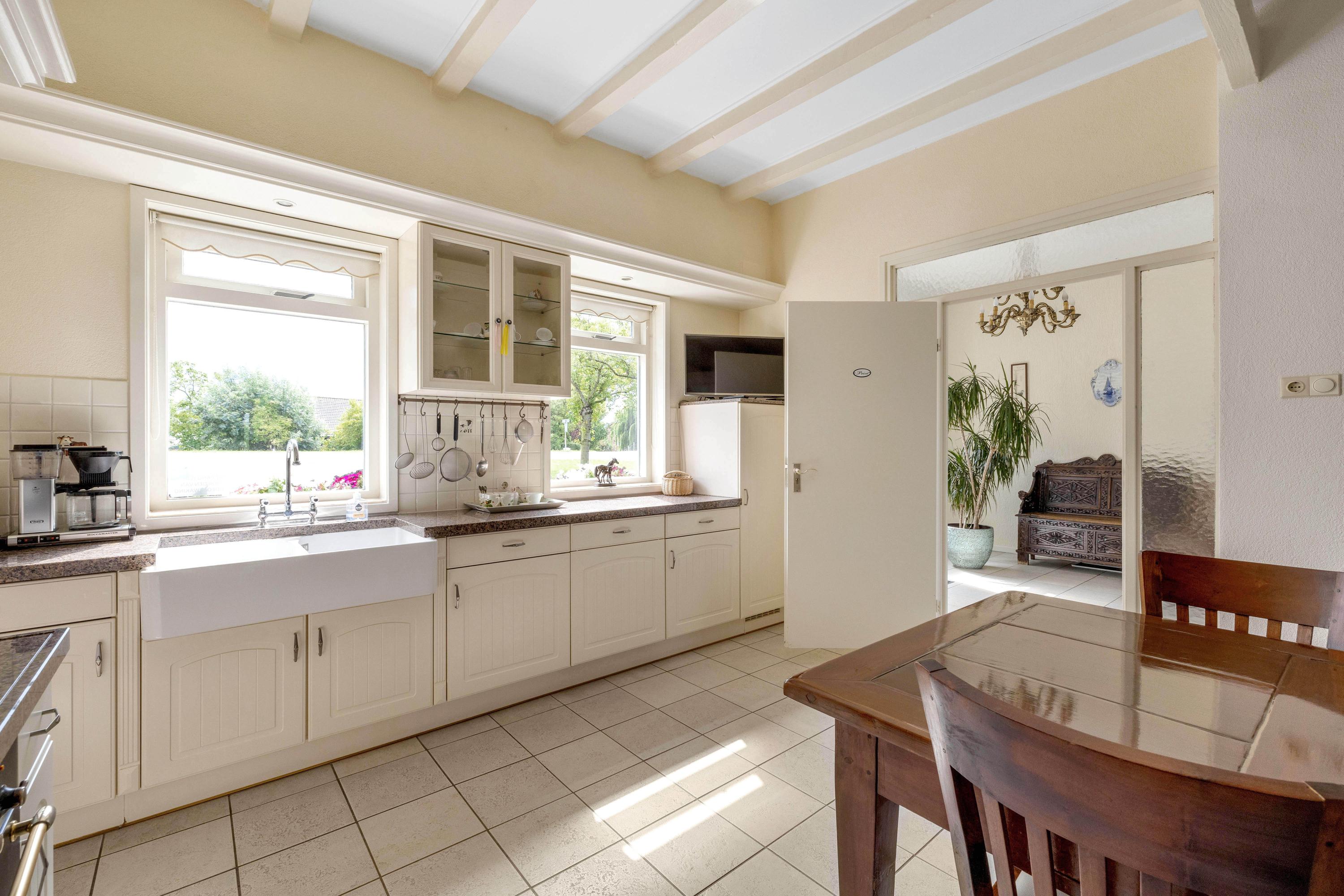De entree geeft toegang tot de keuken/eetkamer. De leefkeuken is ruim en voorzien van diverse inbouwapparatuur, waaronder een gaskookplaat, afzuigkap, koelkast, vaatwasser en een oven. Vanuit de keuken is de werkkamer bereikbaar, handig voor een kantoor aan huis. Verder een deur uitkomend in de hal met de trapopgang, meterkast en toegang tot zowel de woonkamer als de gang waar het toilet en de badkamer zijn gelegen.