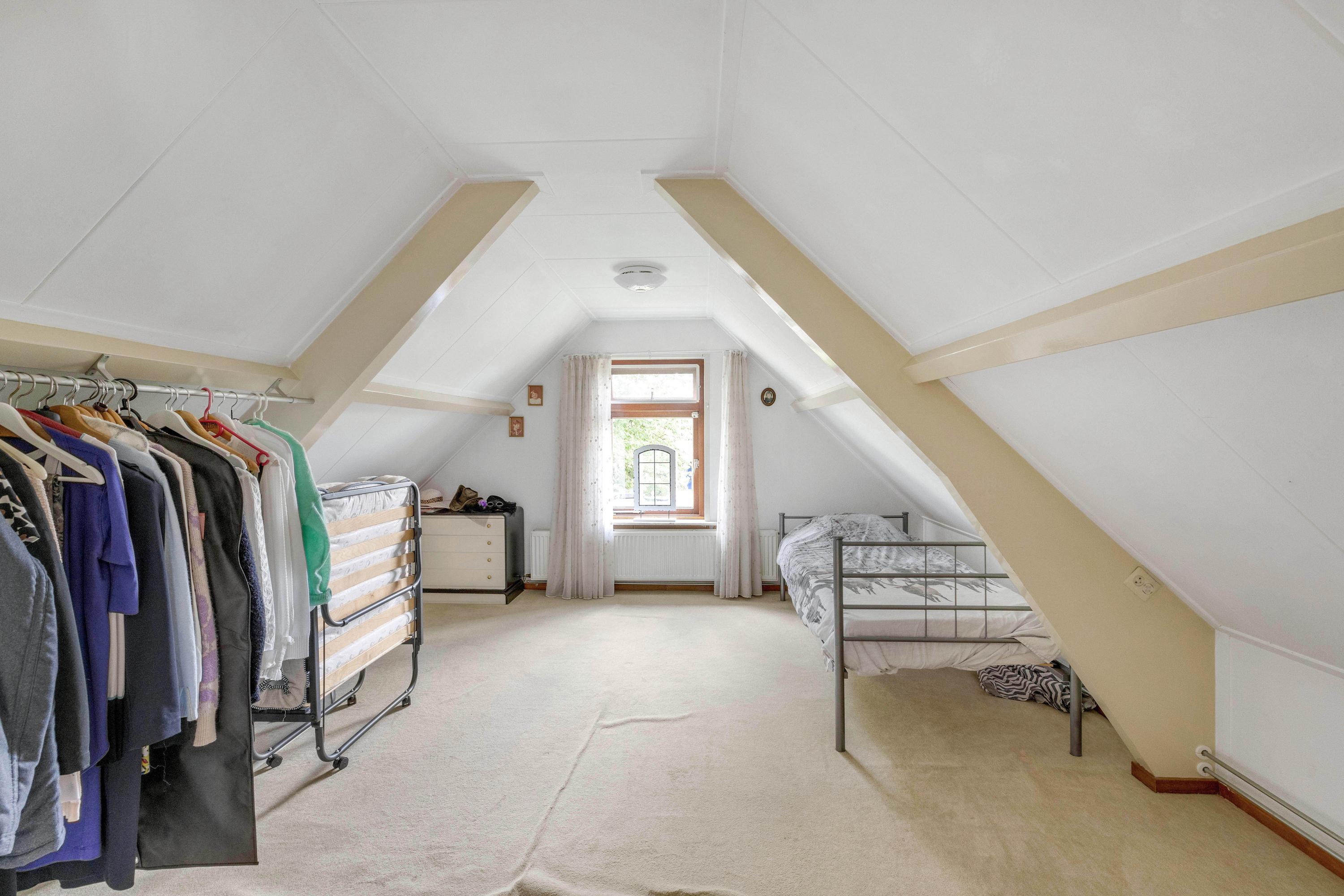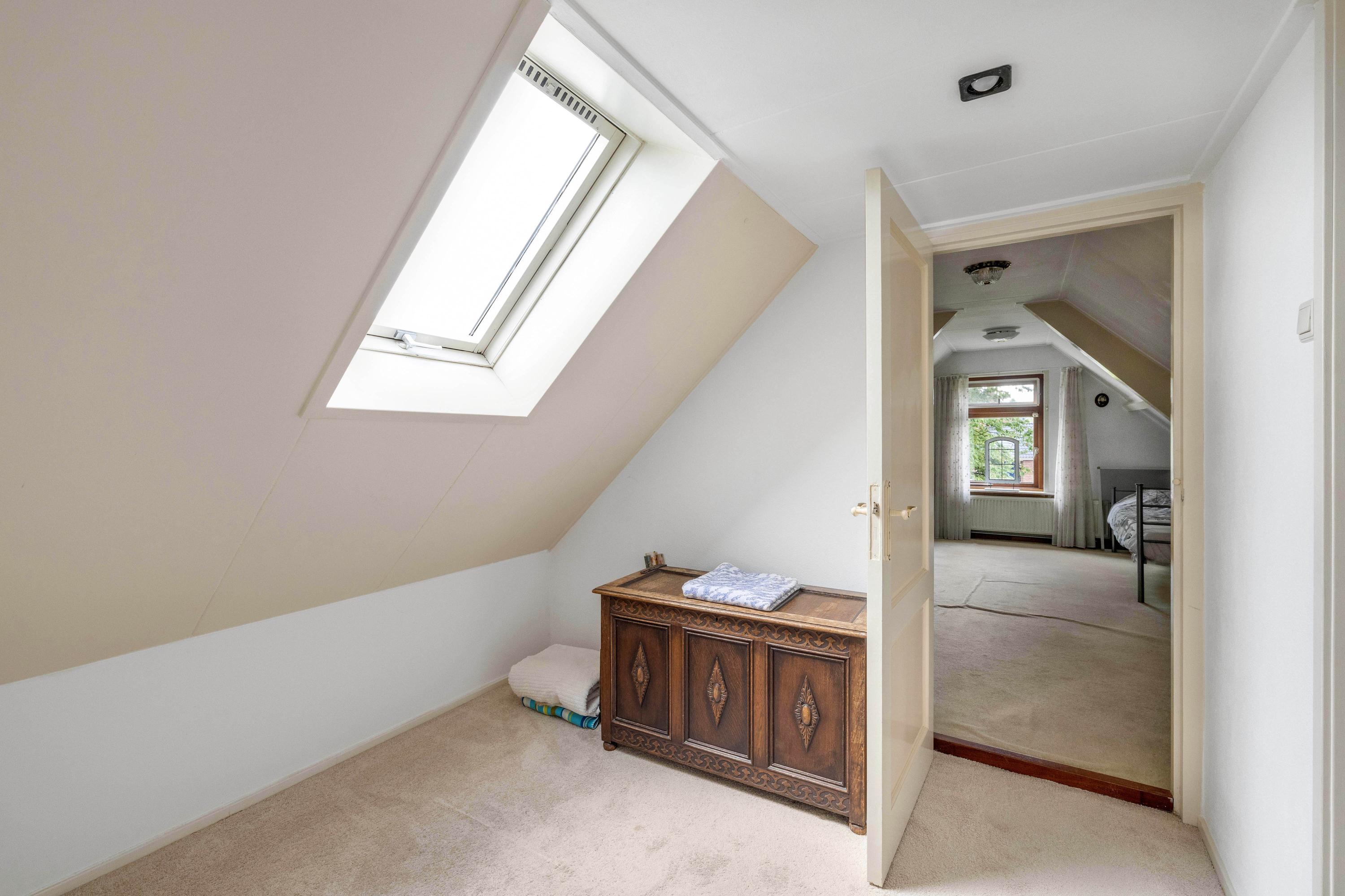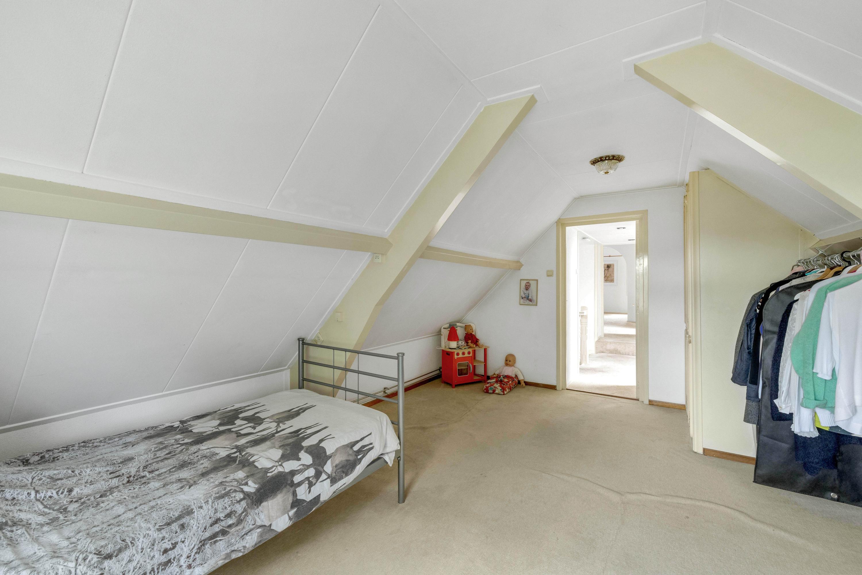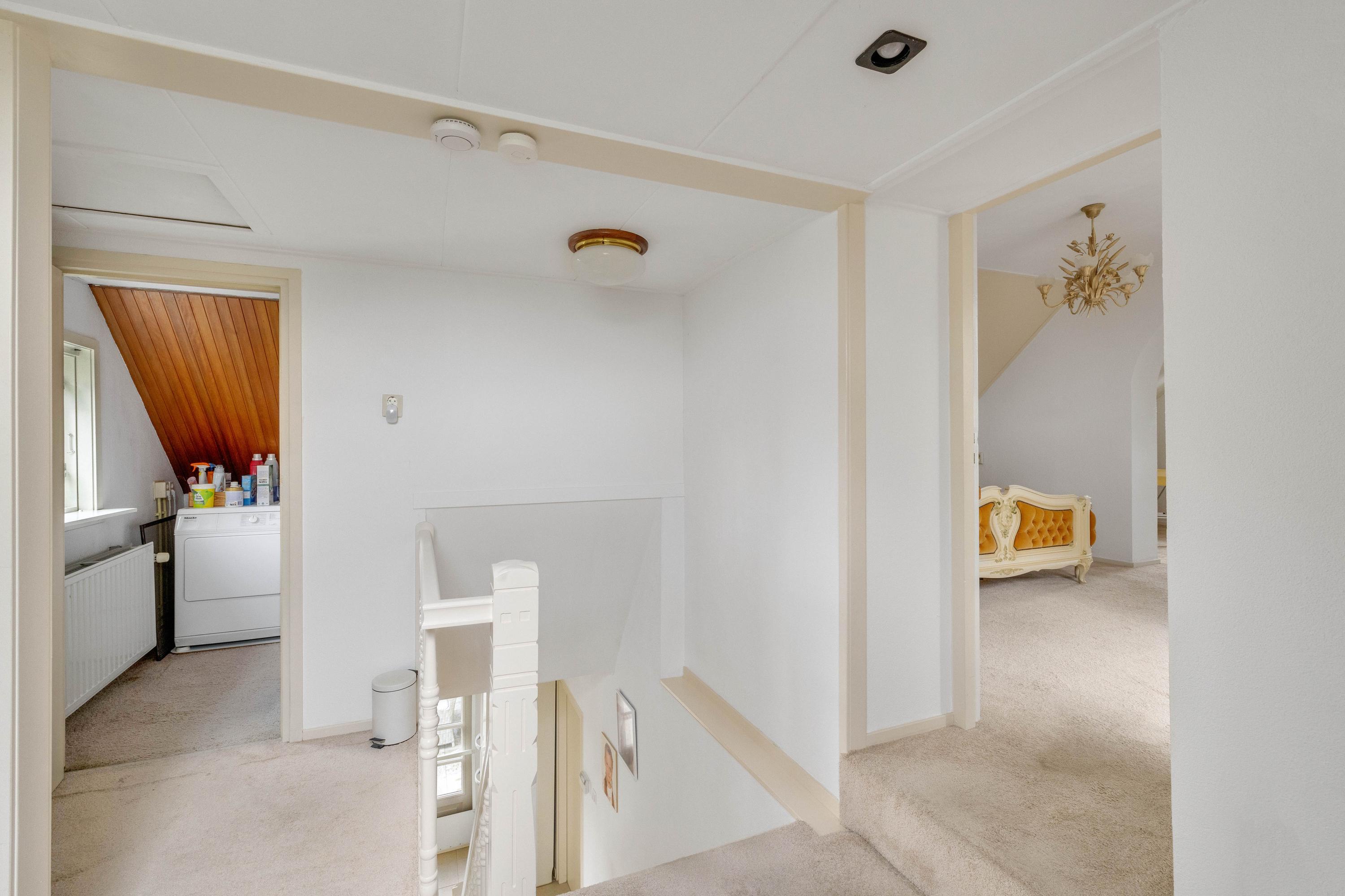 De ruime overloop met dakraam geeft toegang tot twee slaapkamers en een ruimte met de opstelling van de cv ketel (Vaillant 2003) en de aansluitingen voor wasmachine en droger. De slaapkamer aan de voorzijde heeft een dakraam, twee kopgevelramen, knieschotbergruimte, een wastafel met meubel en loopt door naar een extra ruimte die bijvoorbeeld als inloopkast kan dienen. De tweede slaapkamer, aan de achterzijde, beschikt ook over een kopgevelraam. Via een luik op de overloop is de bergzolder bereikbaar.