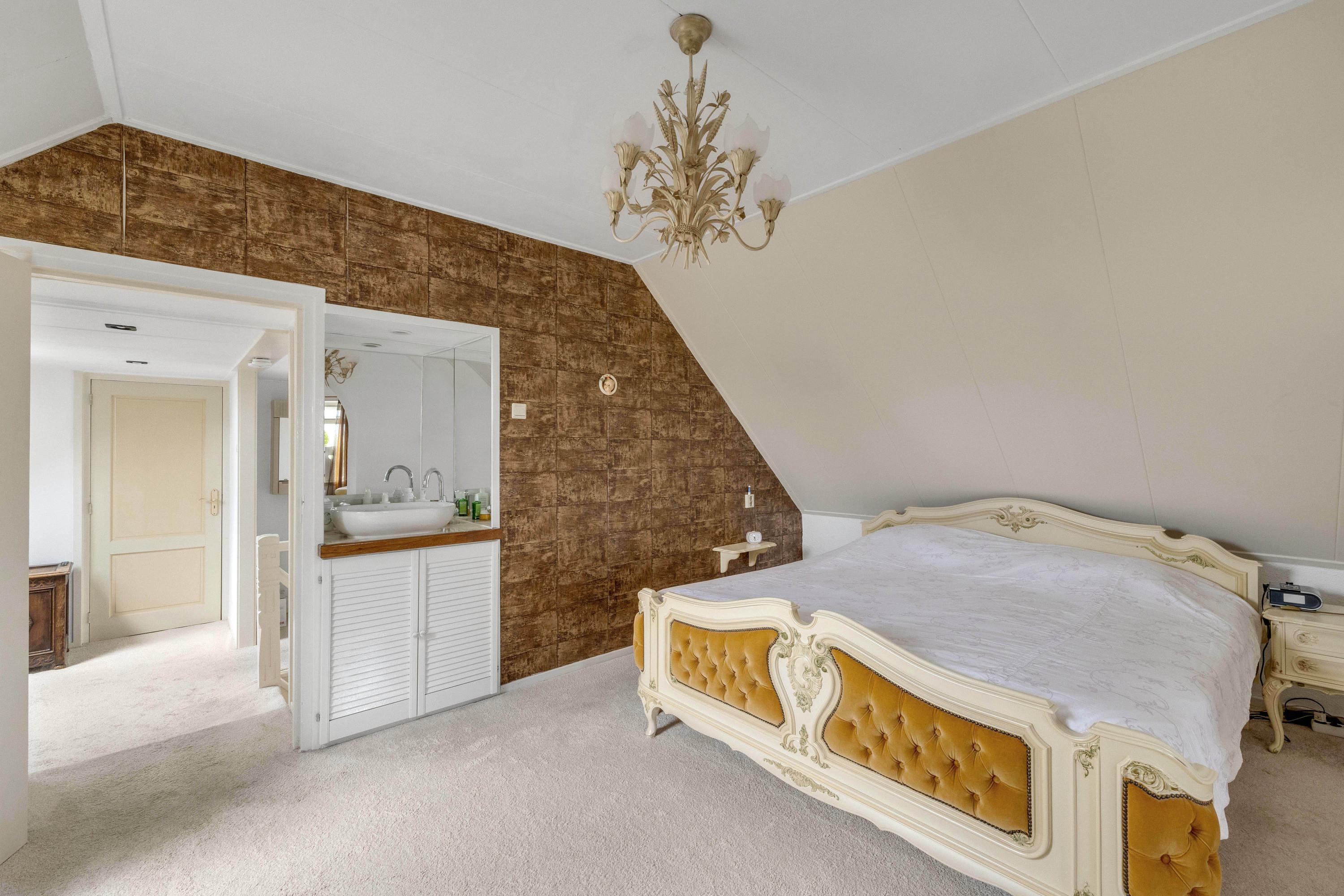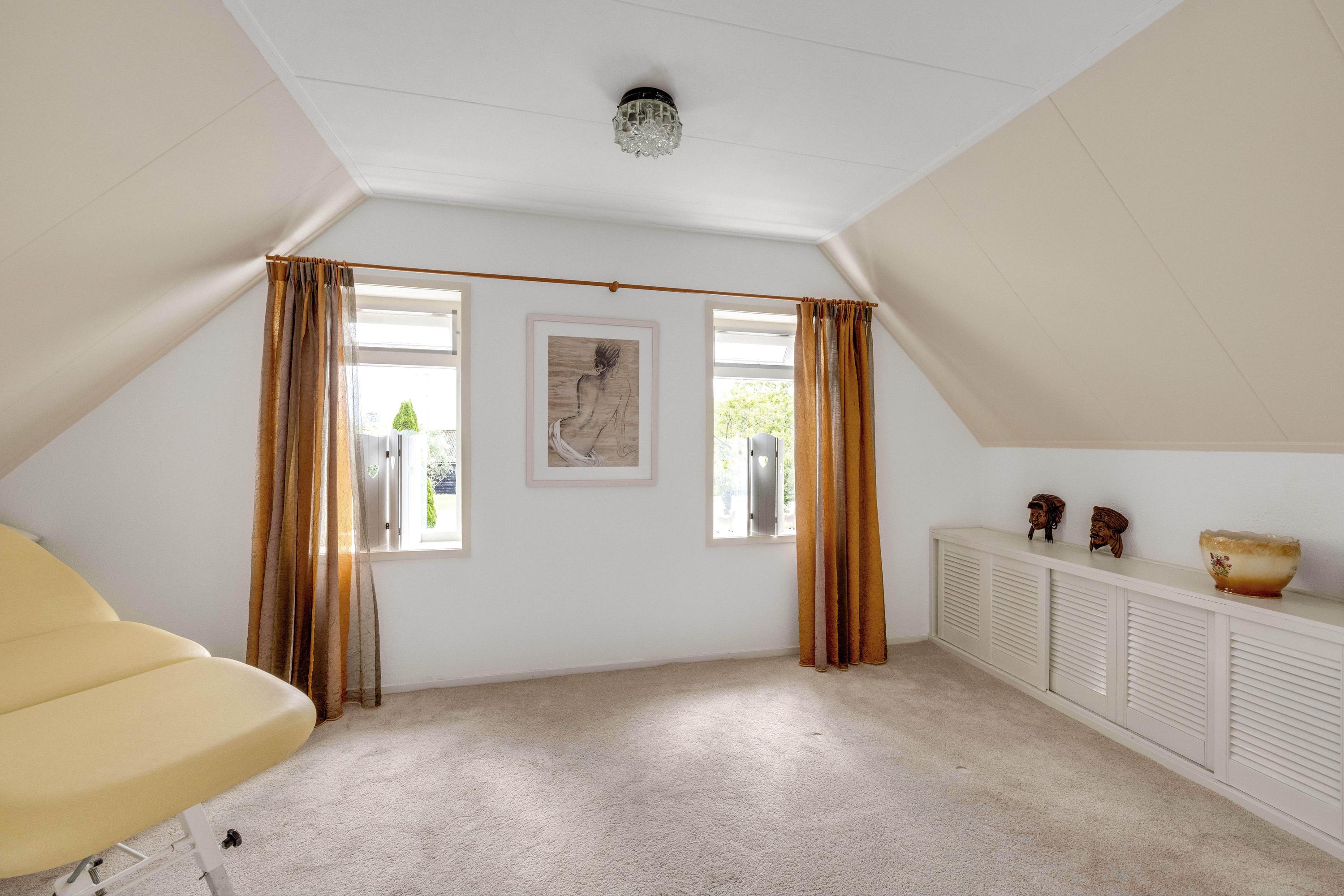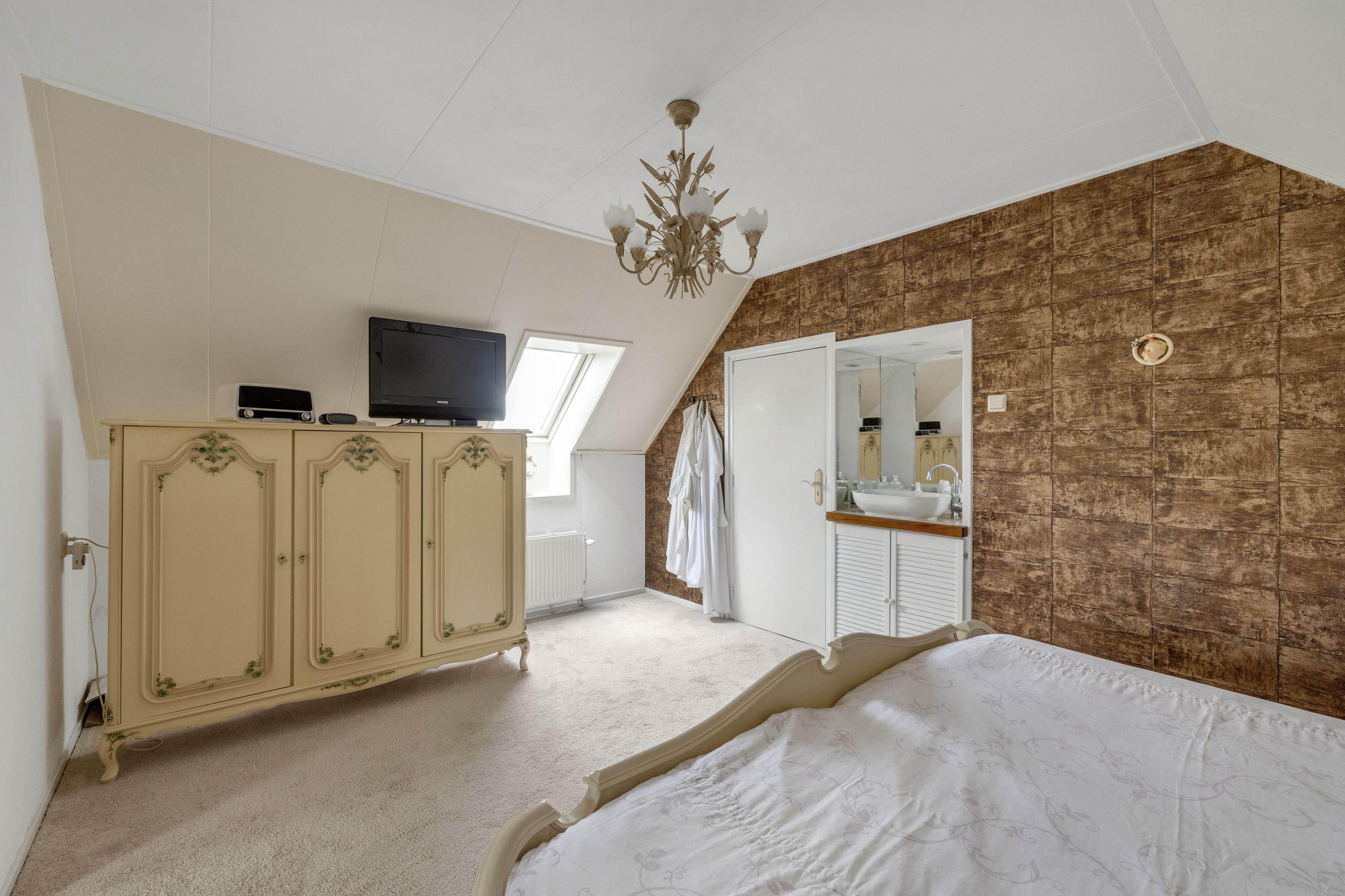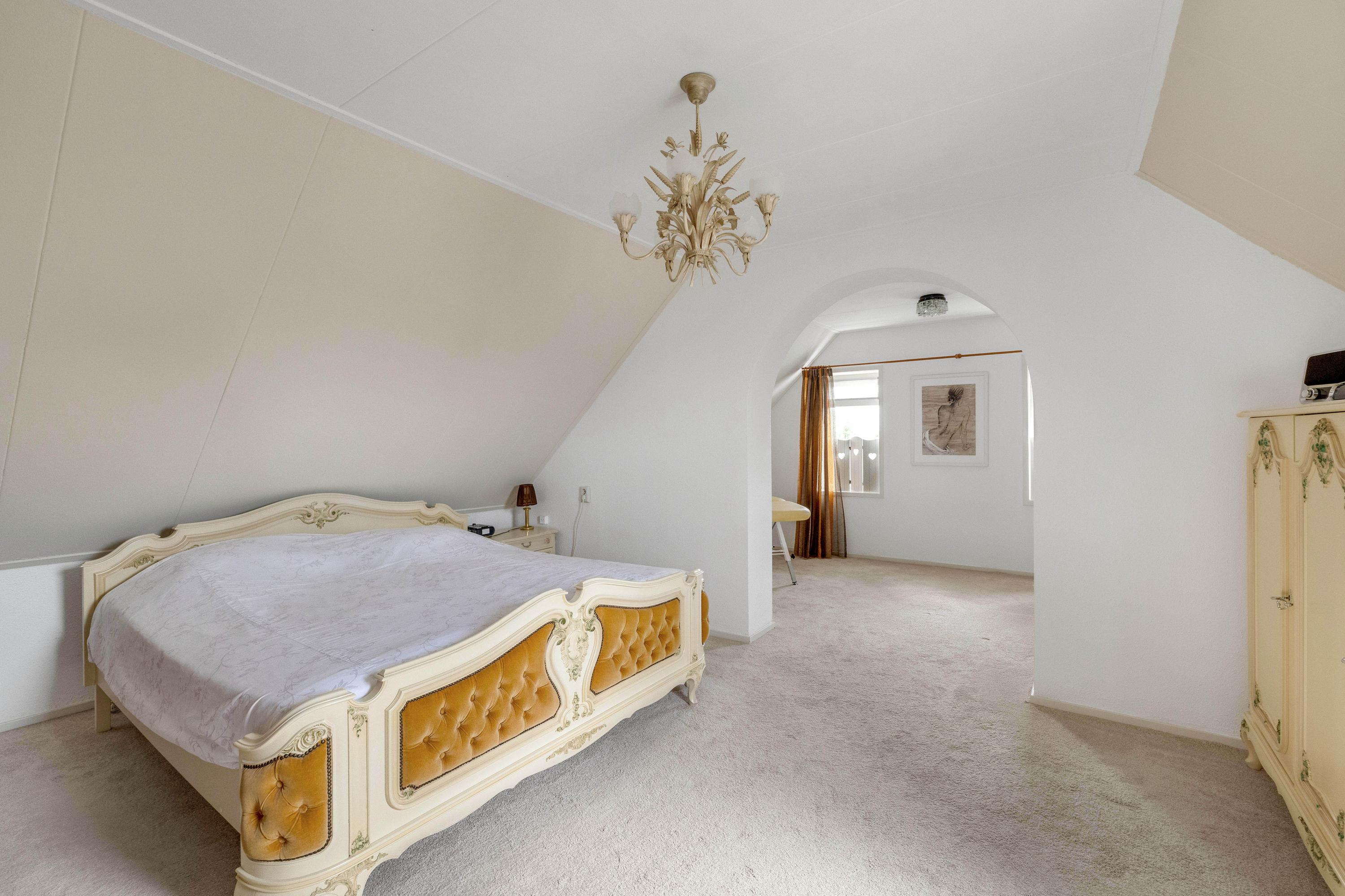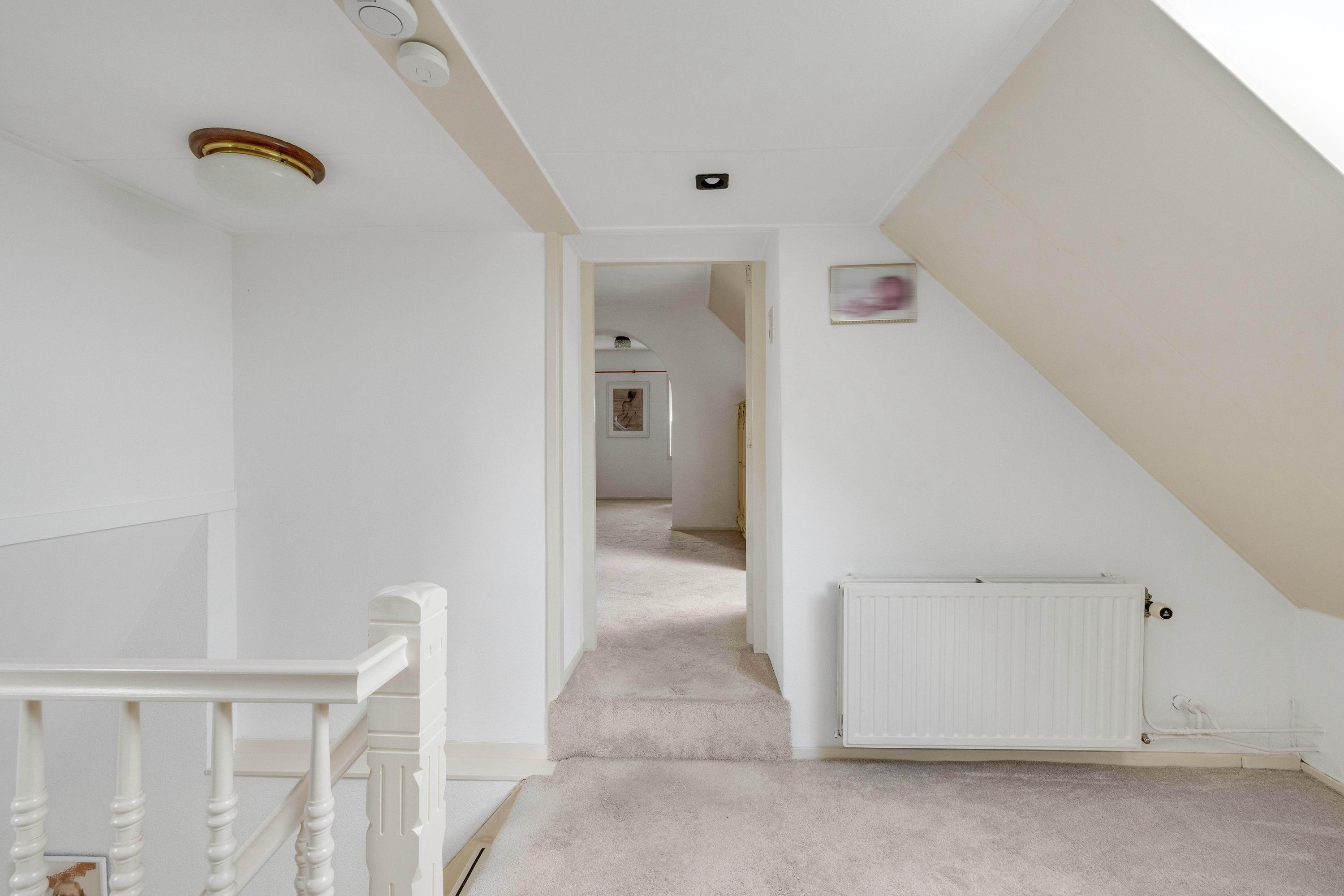 De ruime overloop met dakraam geeft toegang tot twee slaapkamers en een ruimte met de opstelling van de cv ketel (Vaillant 2003) en de aansluitingen voor wasmachine en droger. De slaapkamer aan de voorzijde heeft een dakraam, twee kopgevelramen, knieschotbergruimte, een wastafel met meubel en loopt door naar een extra ruimte die bijvoorbeeld als inloopkast kan dienen. De tweede slaapkamer, aan de achterzijde, beschikt ook over een kopgevelraam. Via een luik op de overloop is de bergzolder bereikbaar.