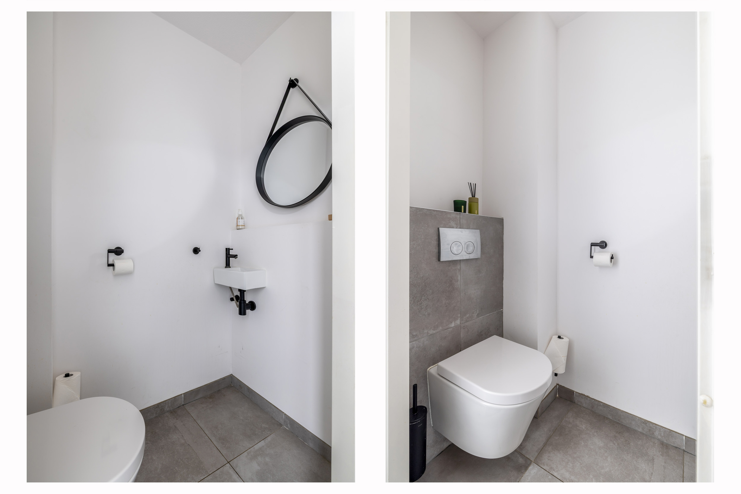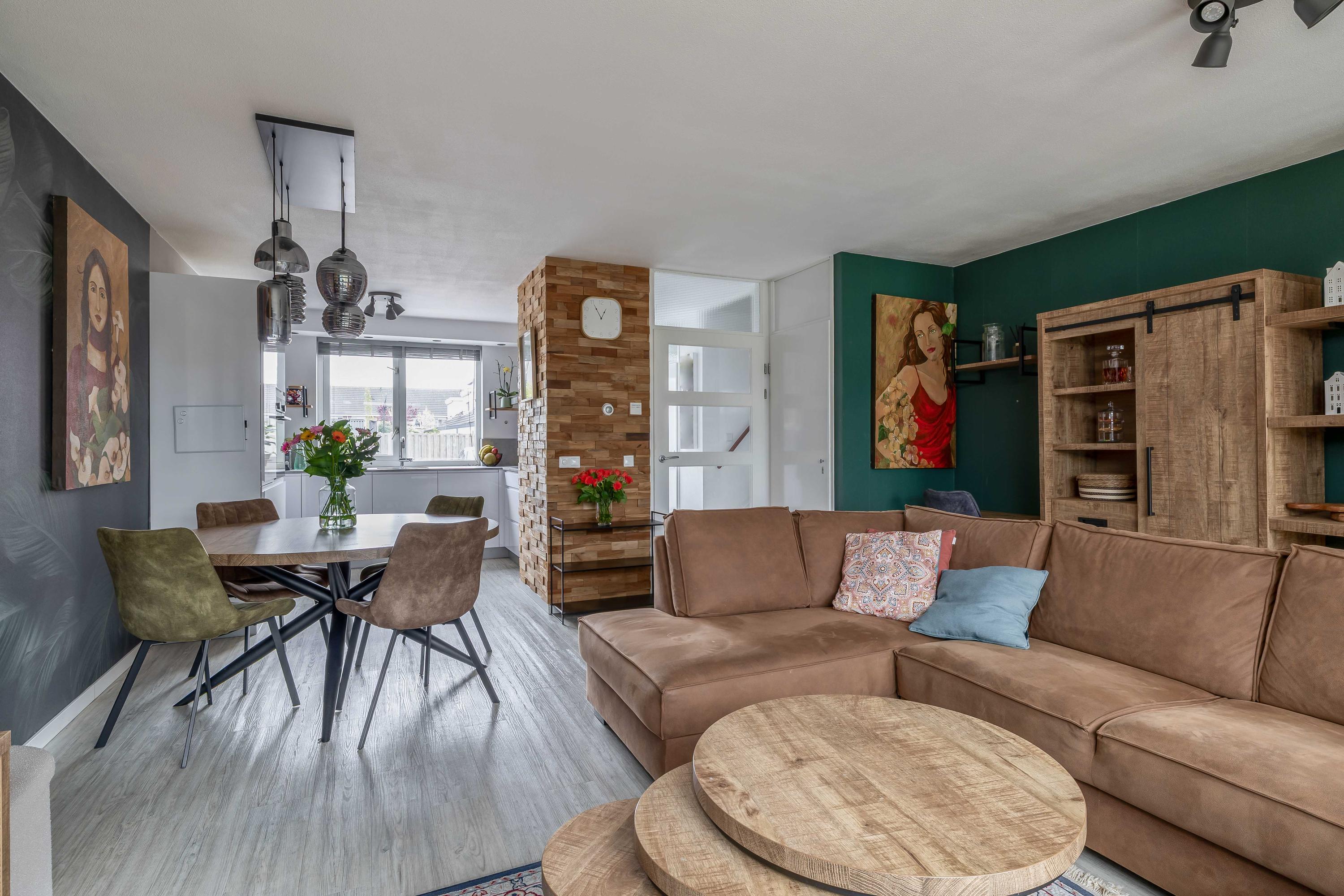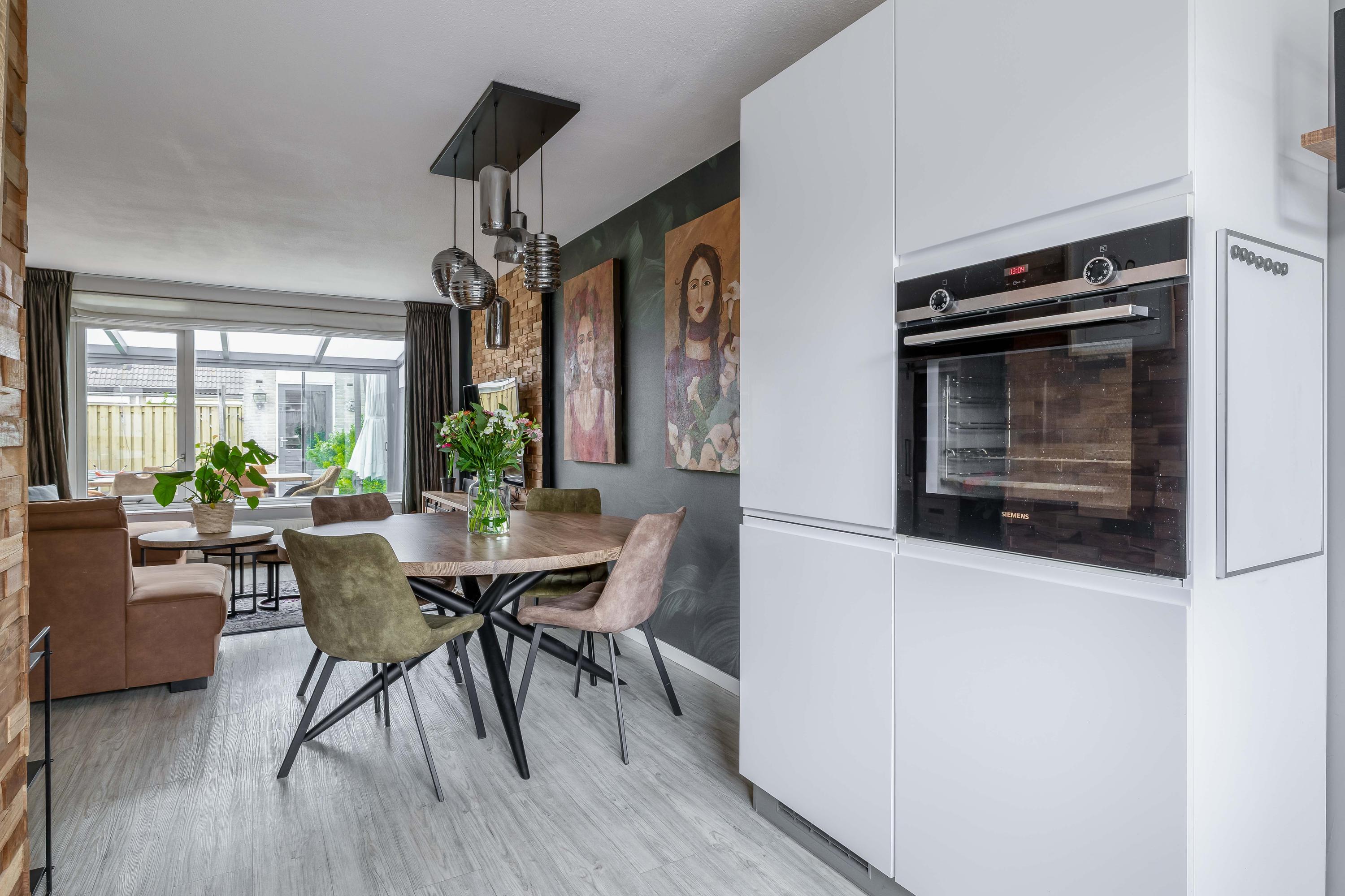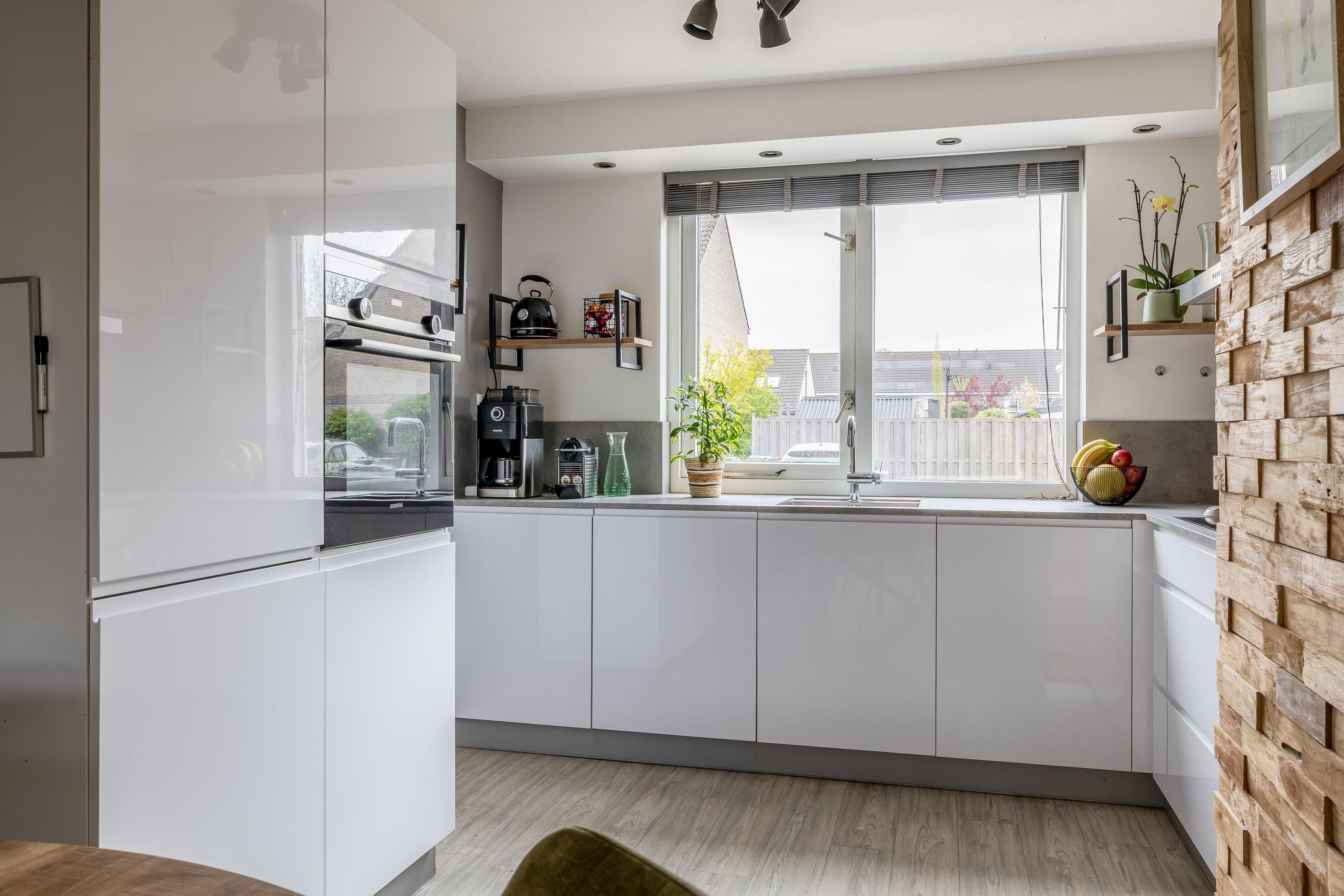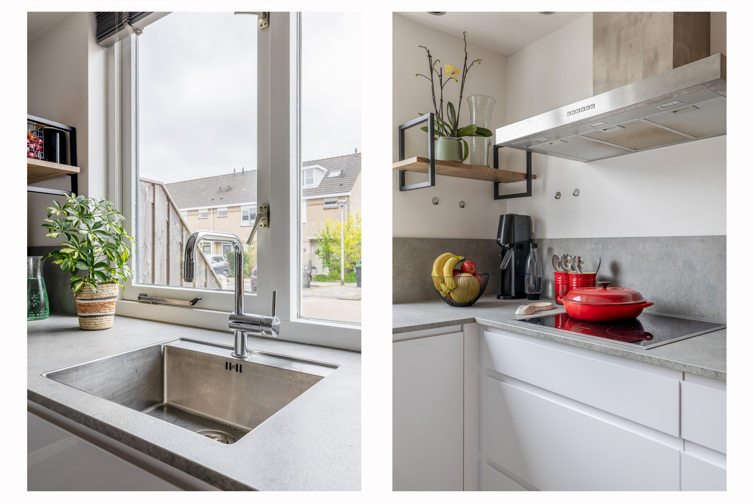 Via de entree stap je de hal in met de trap naar de 1e verdieping. Verder is daar de meterkast, de toiletruimte met hangend toilet en fontein én de toegang tot de woonkamer. De gezellige woonkamer met gedeeltelijk houten wandbekleding op de muren is voorzien van een trapkast en een deur naar de terrasoverkapping en de achtertuin. Aan de voorzijde bevindt zich de open keuken, geplaatst in een hoekopstelling. De keuken is compleet uitgerust met inbouwapparatuur, zoals een inductie kookplaat met afzuigkap, een oven, een koel- en vriescombinatie en een vaatwasser. De begane grond is voorzien van een laminaatvloer.