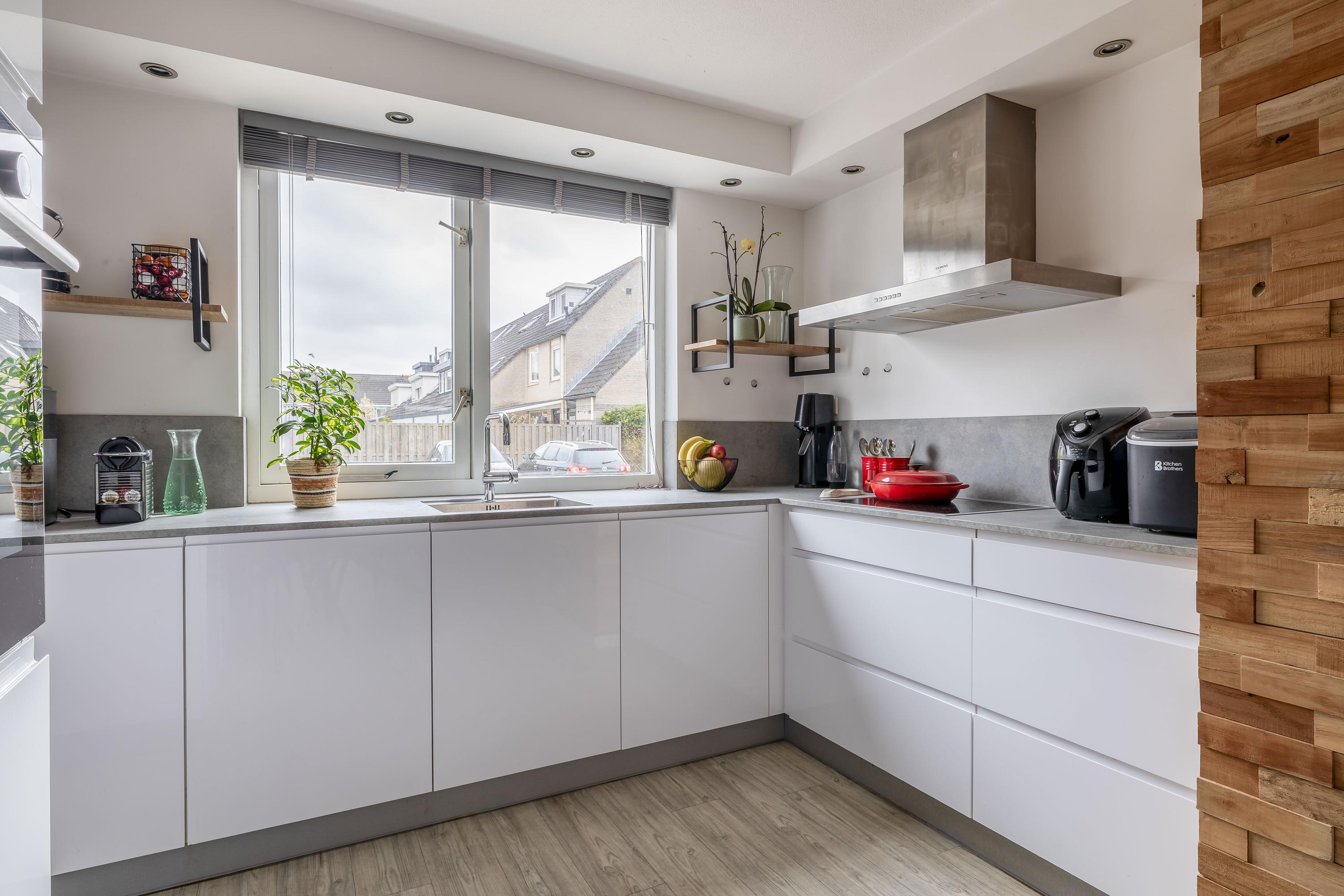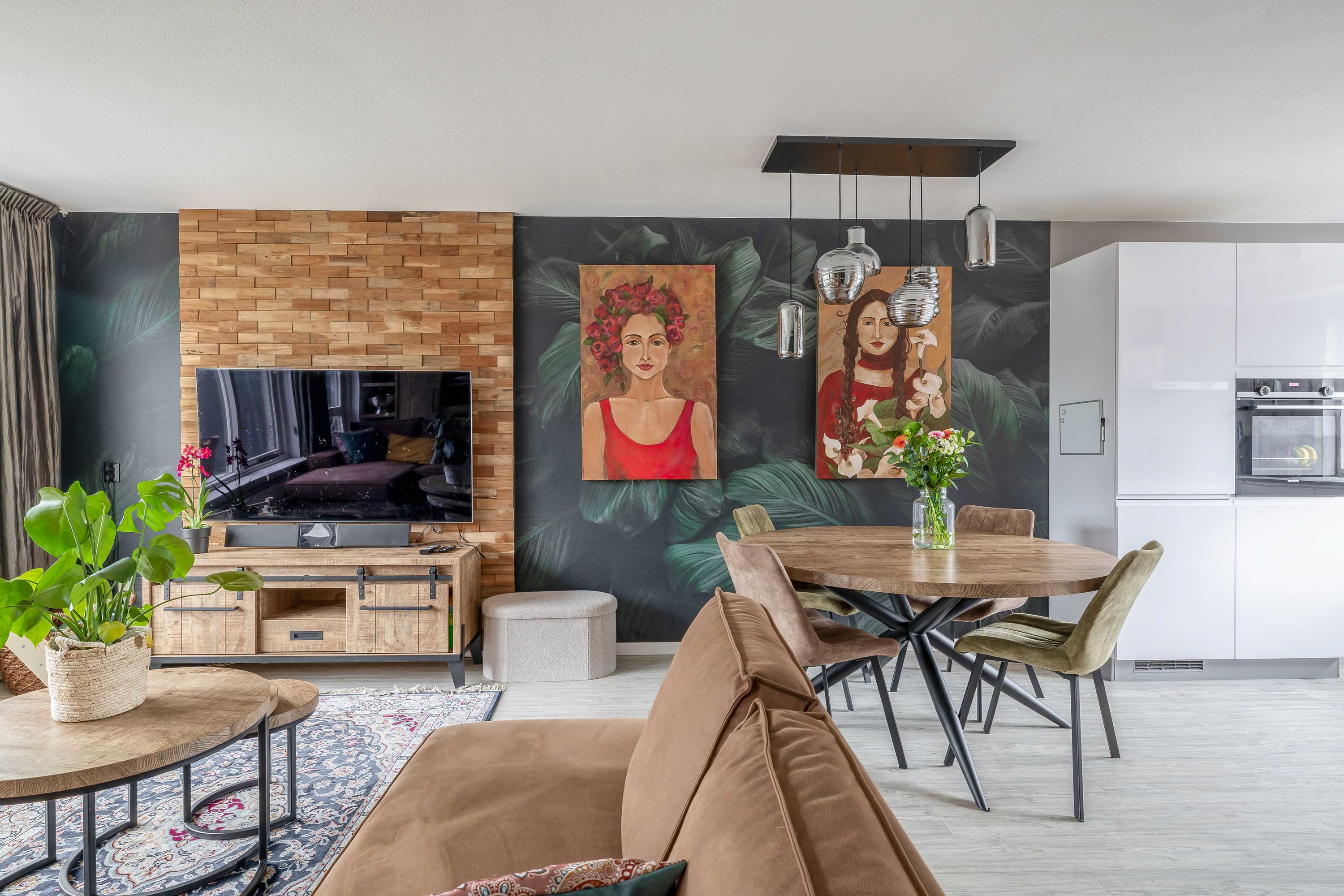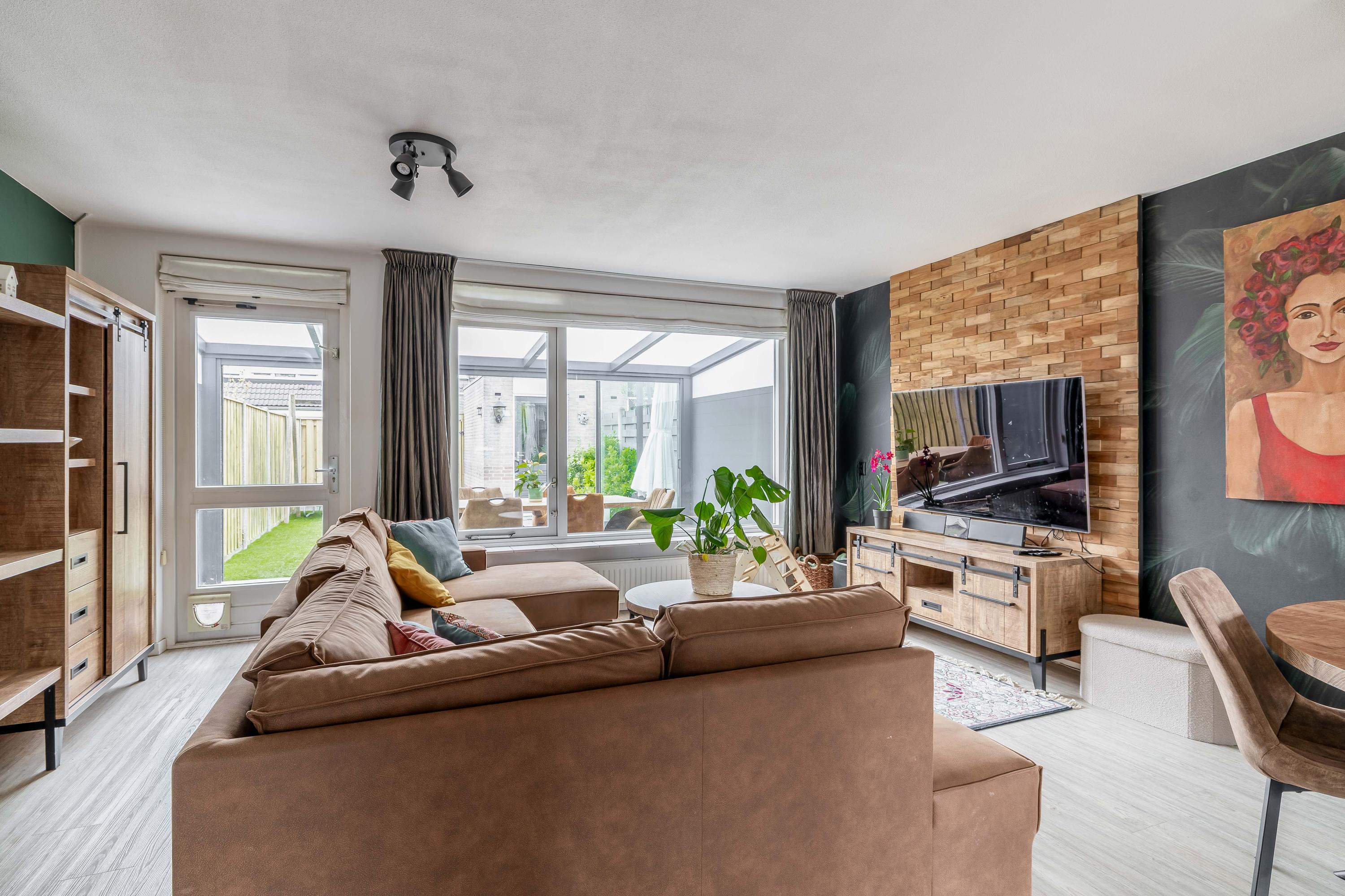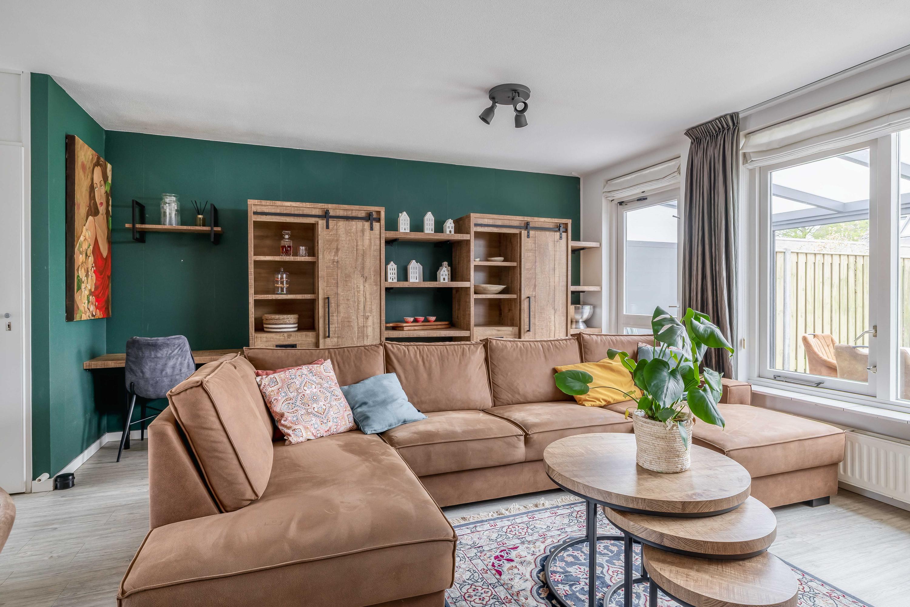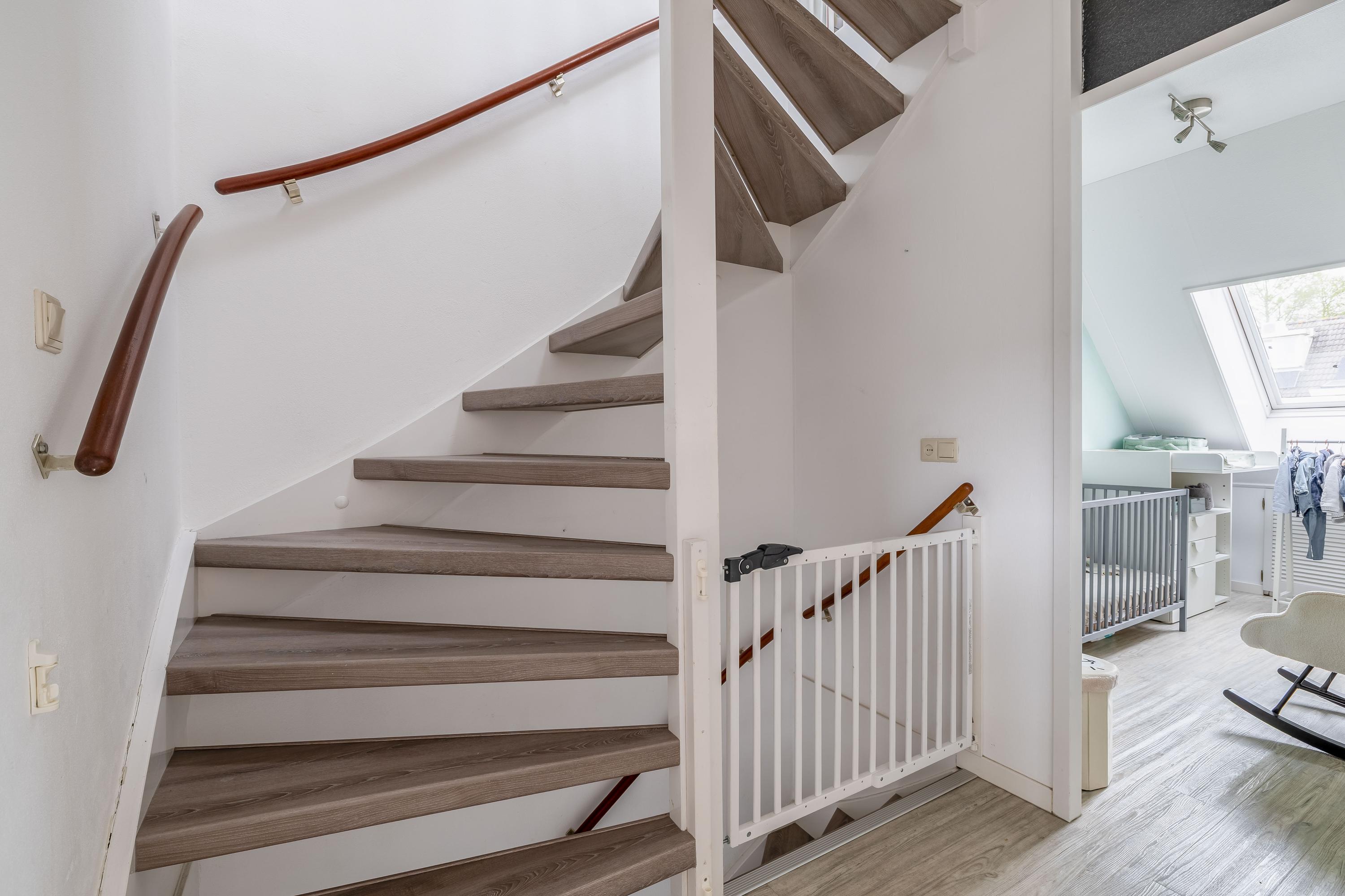Via de entree stap je de hal in met de trap naar de 1e verdieping. Verder is daar de meterkast, de toiletruimte met hangend toilet en fontein én de toegang tot de woonkamer. De gezellige woonkamer met gedeeltelijk houten wandbekleding op de muren is voorzien van een trapkast en een deur naar de terrasoverkapping en de achtertuin. Aan de voorzijde bevindt zich de open keuken, geplaatst in een hoekopstelling. De keuken is compleet uitgerust met inbouwapparatuur, zoals een inductie kookplaat met afzuigkap, een oven, een koel- en vriescombinatie en een vaatwasser. De begane grond is voorzien van een laminaatvloer.