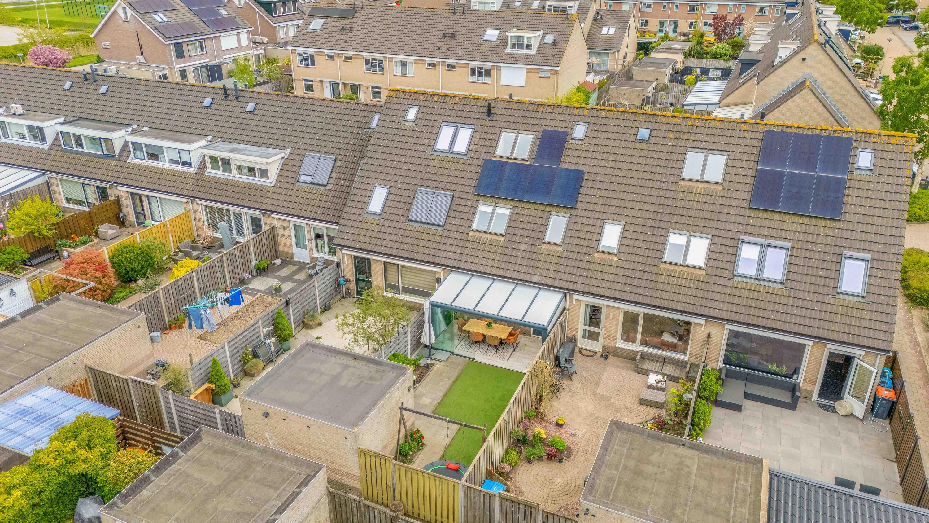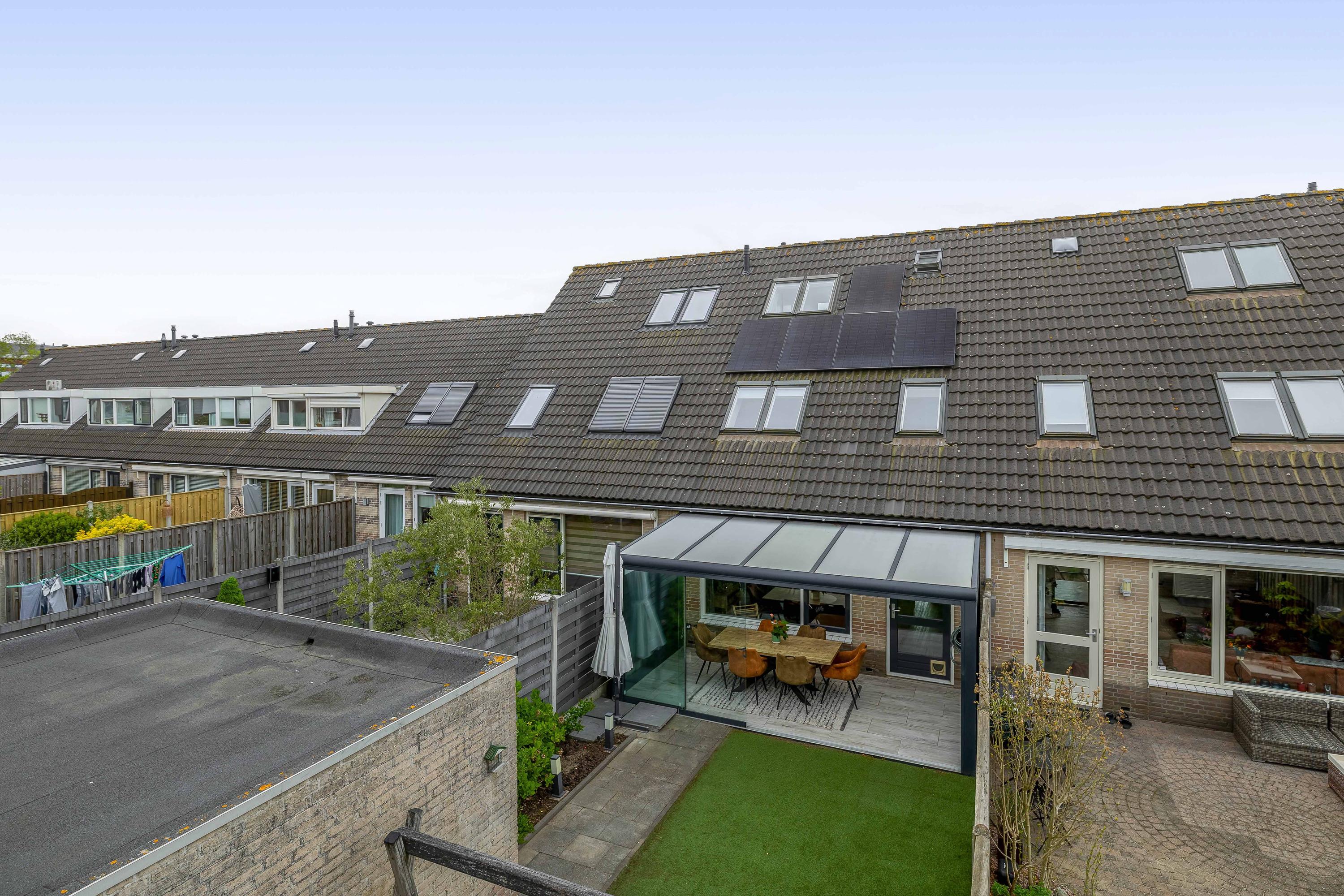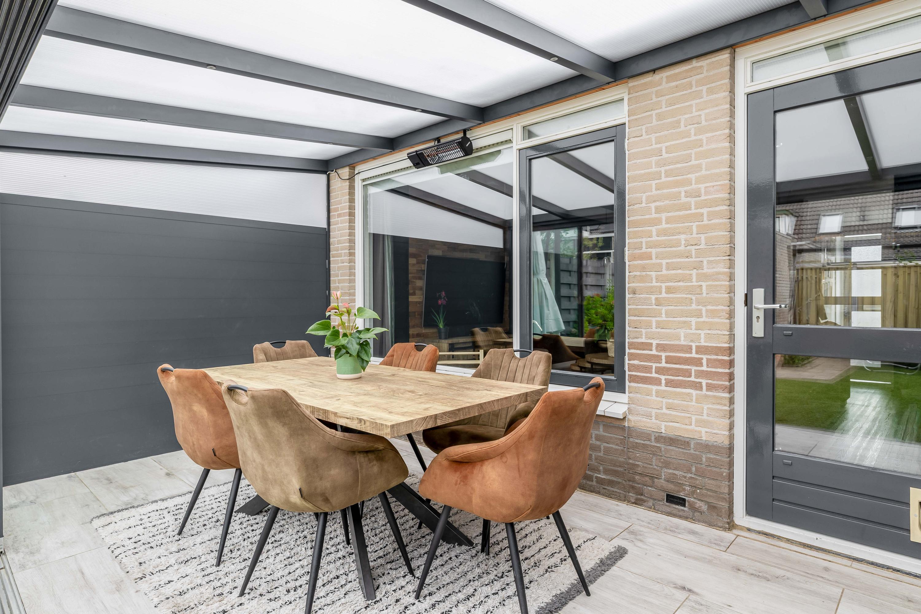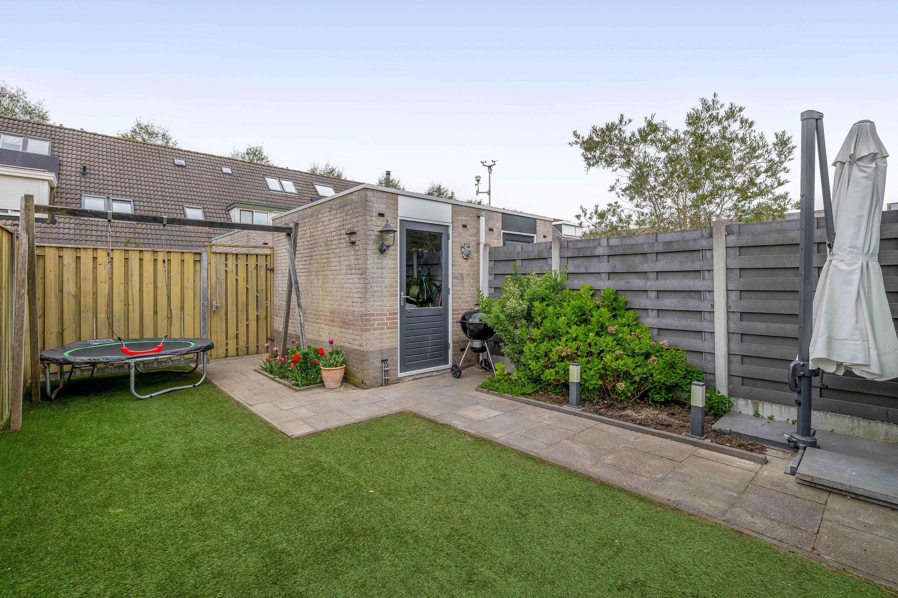 Aan de achterzijde bevindt zich een terrasoverkapping over de volledige breedte van de woning. Deze afsluitbare ruimte is voorzien van inbouwspots. De achtertuin is verzorgd en deels bestraat. Verder ligt er kunstgras en is de tuin omheind met houten schuttingen met betonpalen. Ook is er tuinverlichting en een buitenkraan aanwezig. Achter in de tuin de stenen berging voorzien van elektra en een achteruitgang.