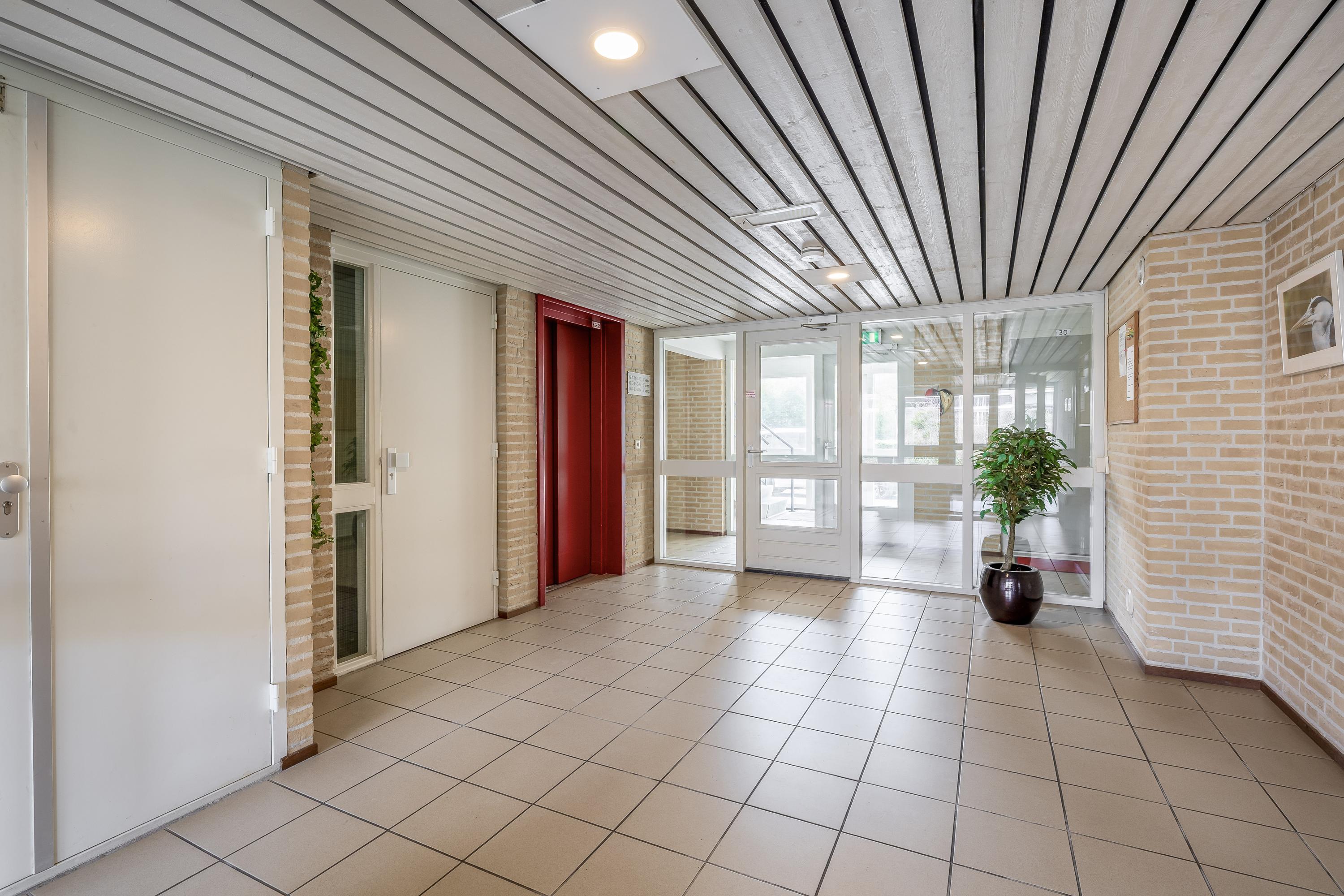 Centrale hal met bellentableau en brievenbussen, gevolgd door de afgesloten entree met trapopgang en lift. Vanuit hier heb je tevens toegang tot de bergingen en het achtergelegen, afgesloten parkeerterrein.