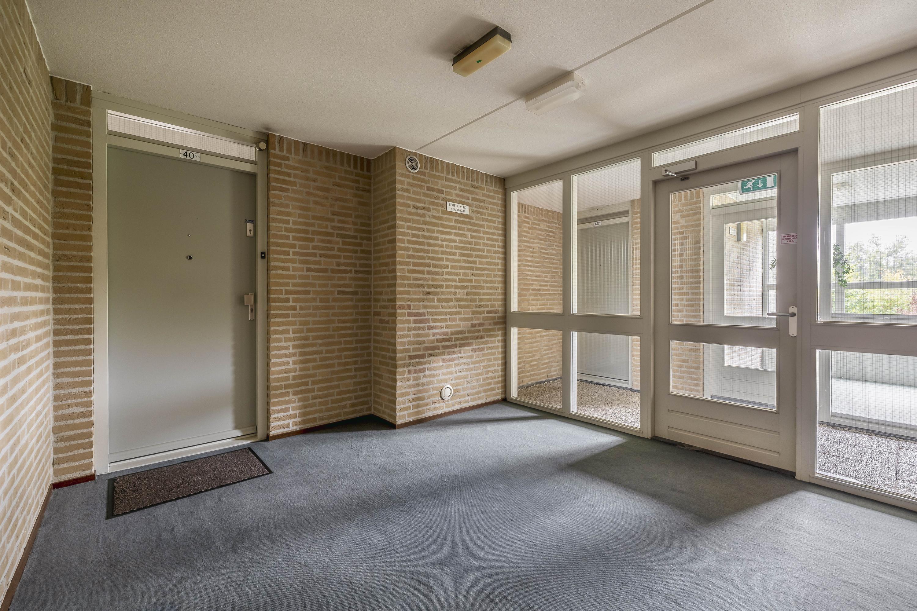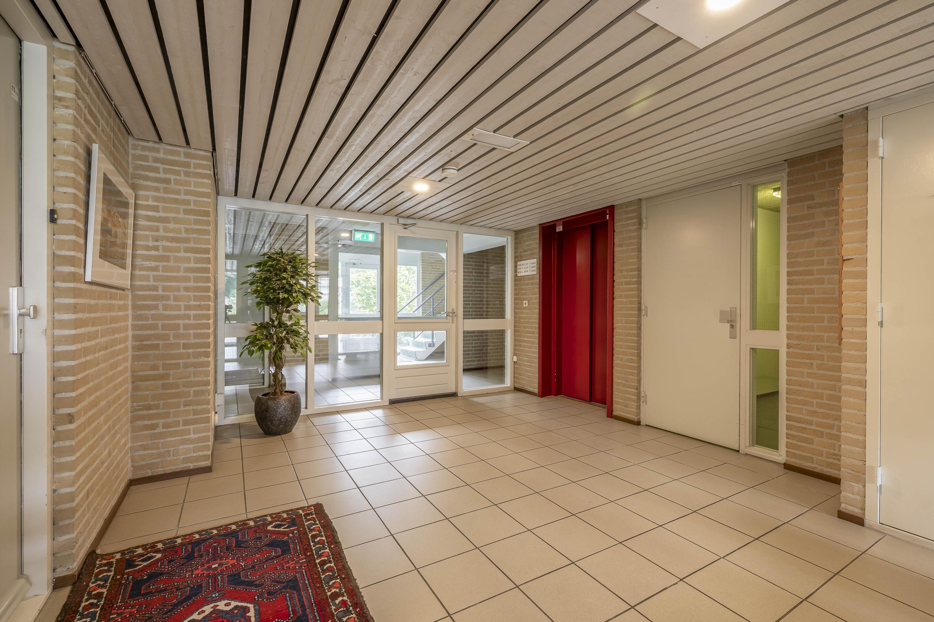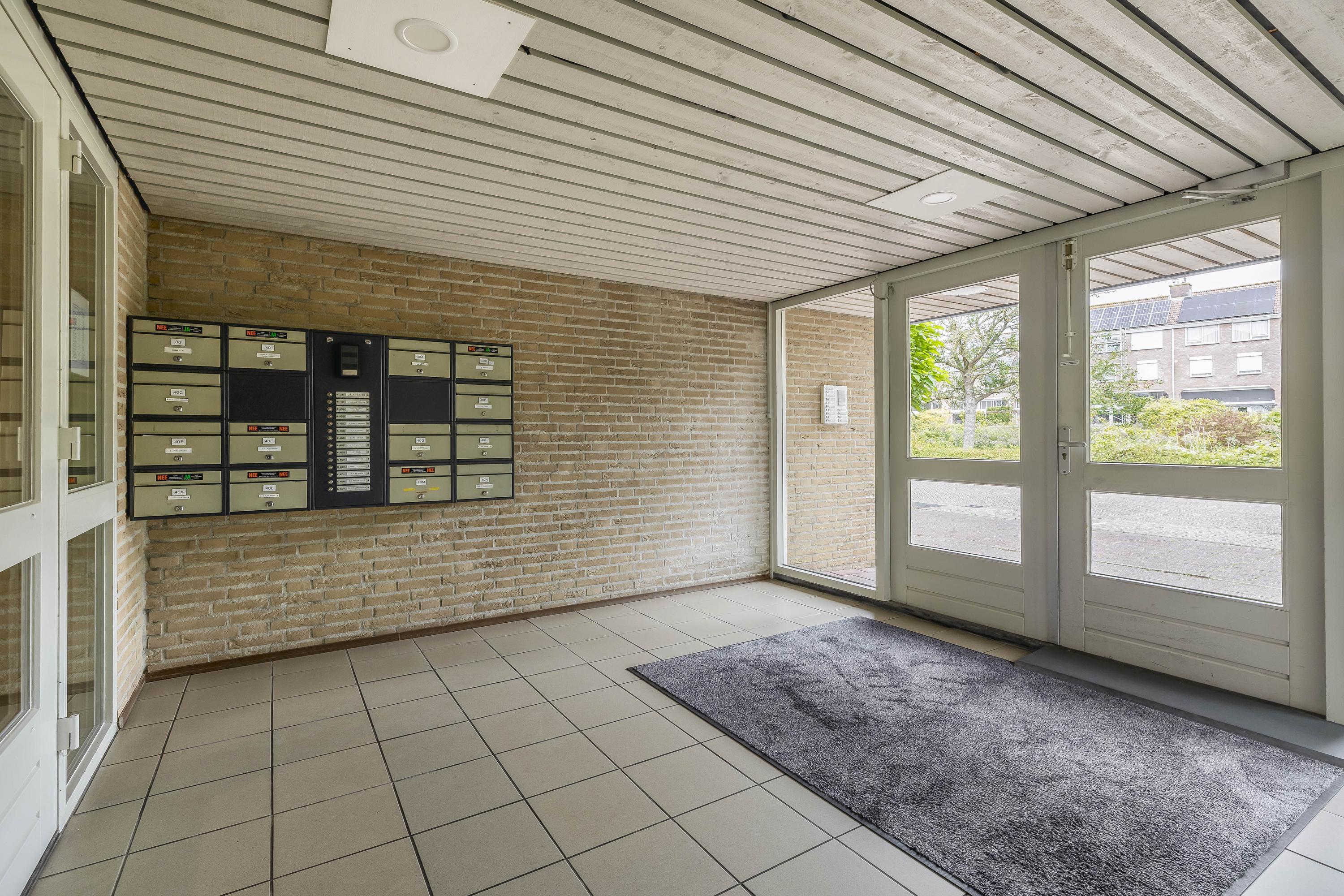 Centrale hal met bellentableau en brievenbussen, daarachter de afgesloten entree met de trapopgang en de lift. Verder toegangsdeur naar de bergingen en toegang tot het achtergelegen parkeerterrein.