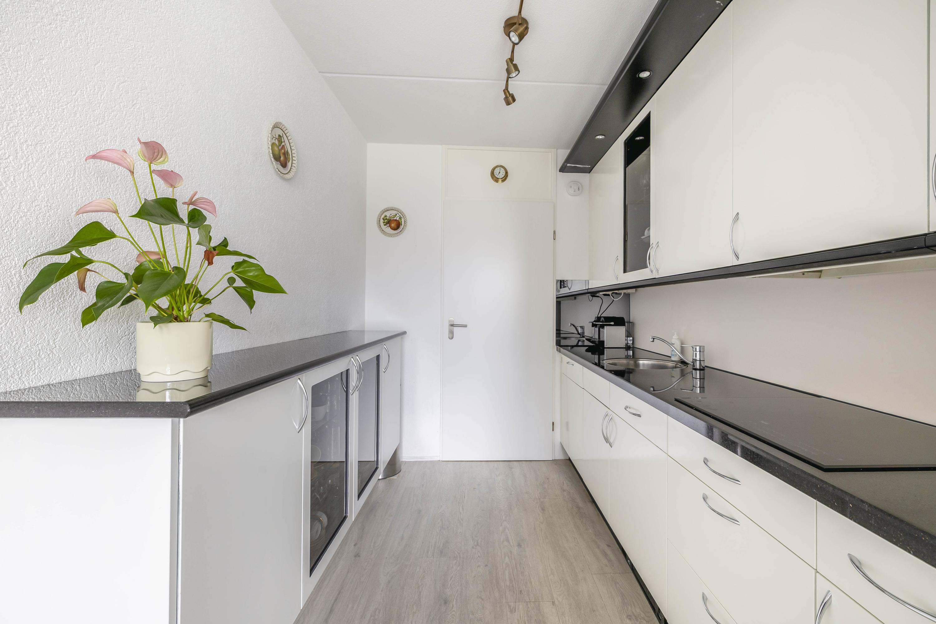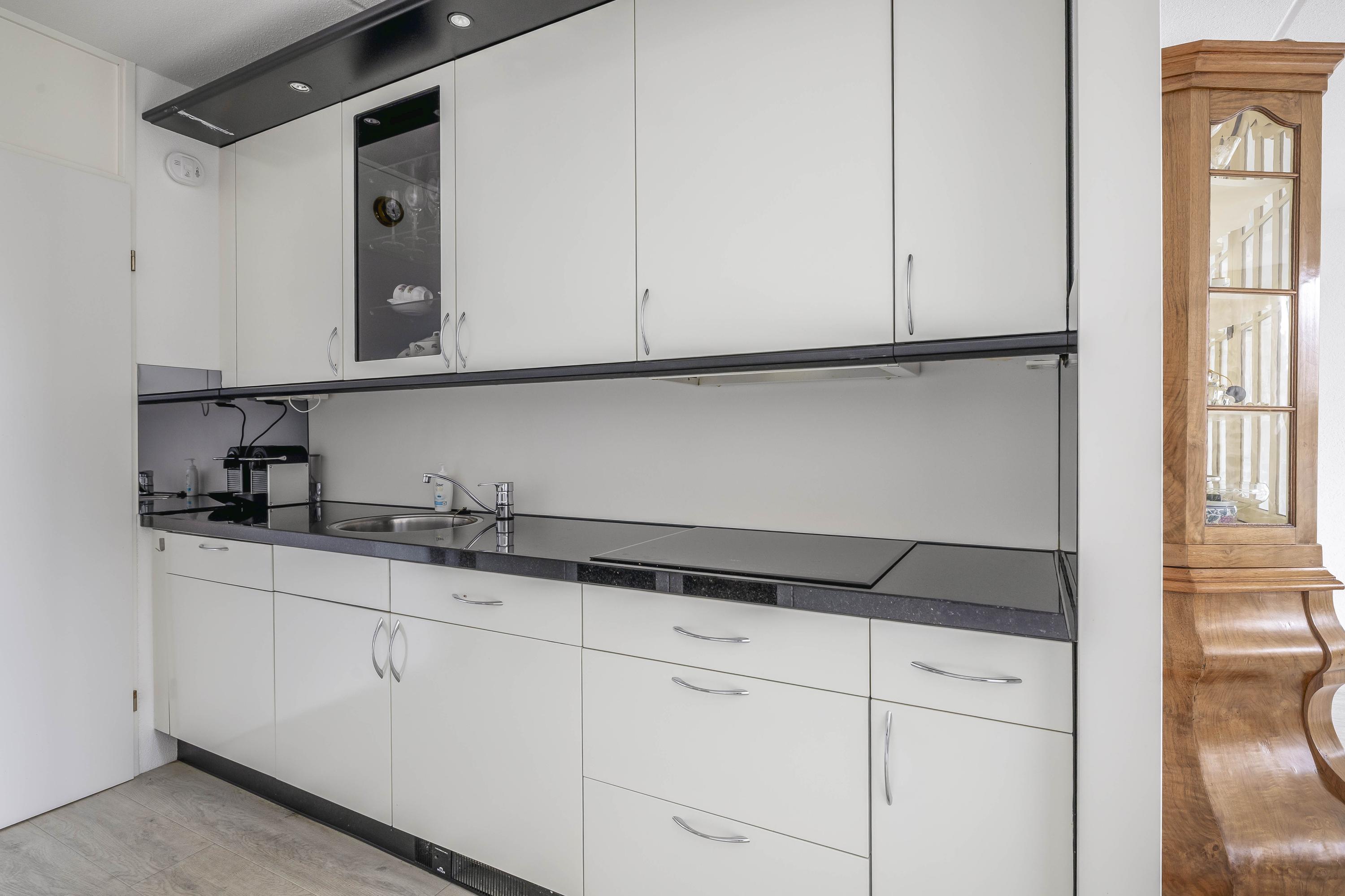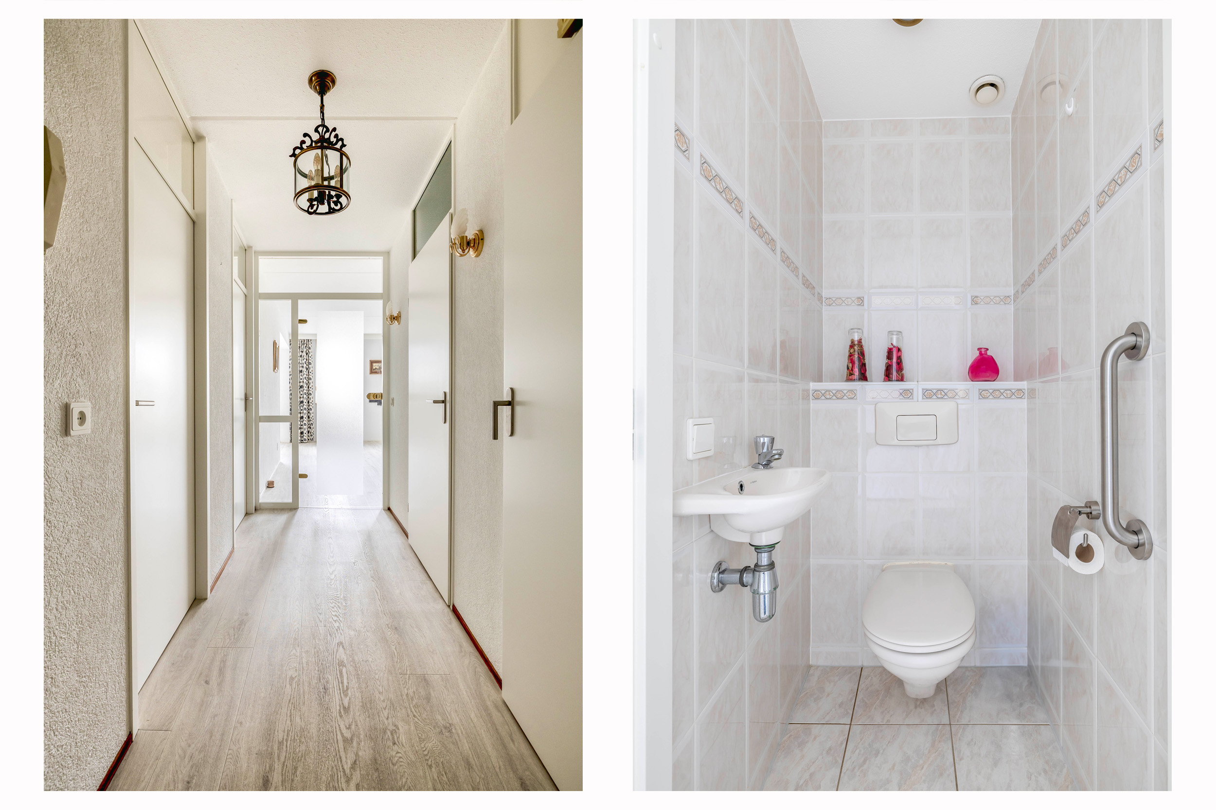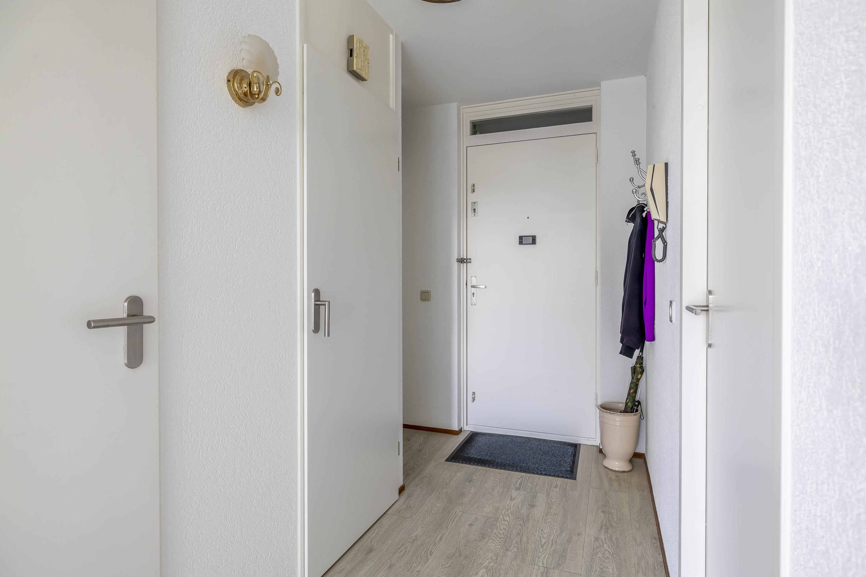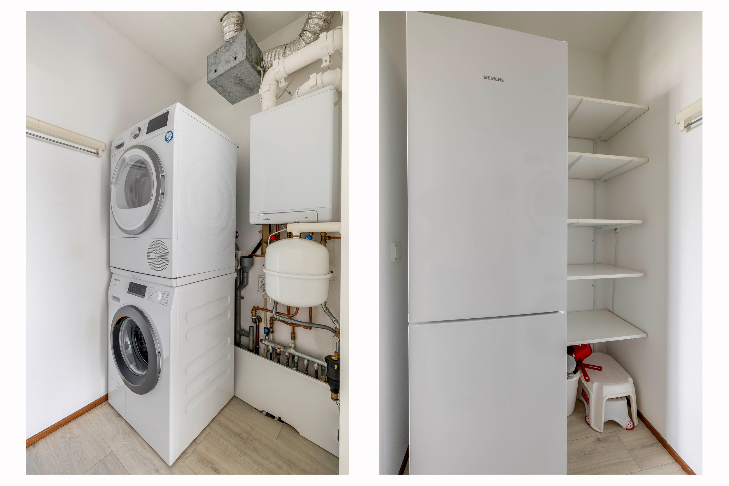 Entree/hal met de meterkast en het toilet met fonteintje. Vanuit de hal kom je in de ruime woonkamer voorzien van airconditioning en deze heeft een schuifpui naar het balkon. Verder de open keuken met een deur naar een bergkast. De open keuken is voorzien van een inductiekookplaat, afzuigkap en een vaatwasser. De bergkast is voorzien van de cv-installatie (Intergas 2024), mechanische ventilatieunit en de aansluitingen voor wasmachine en droger.