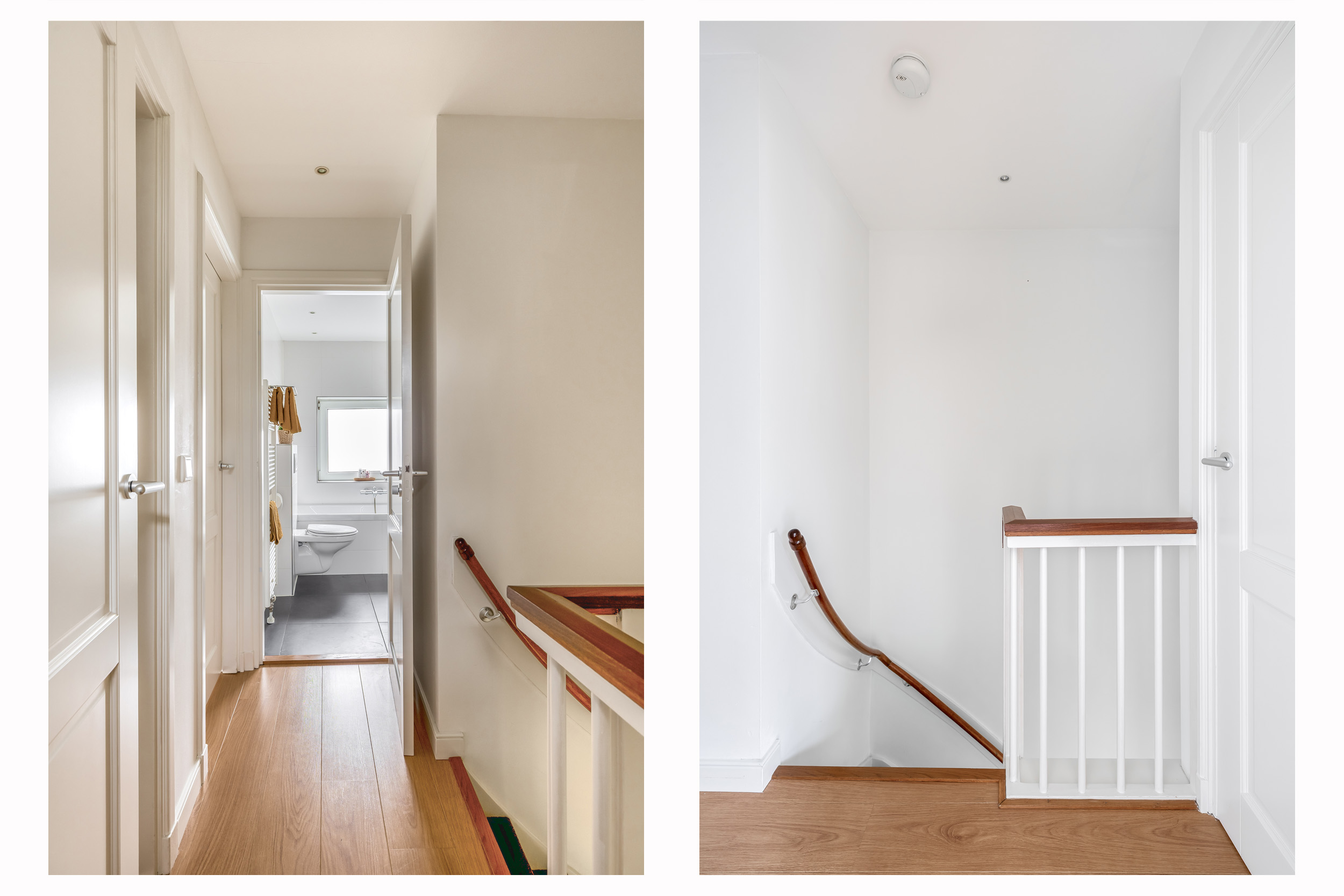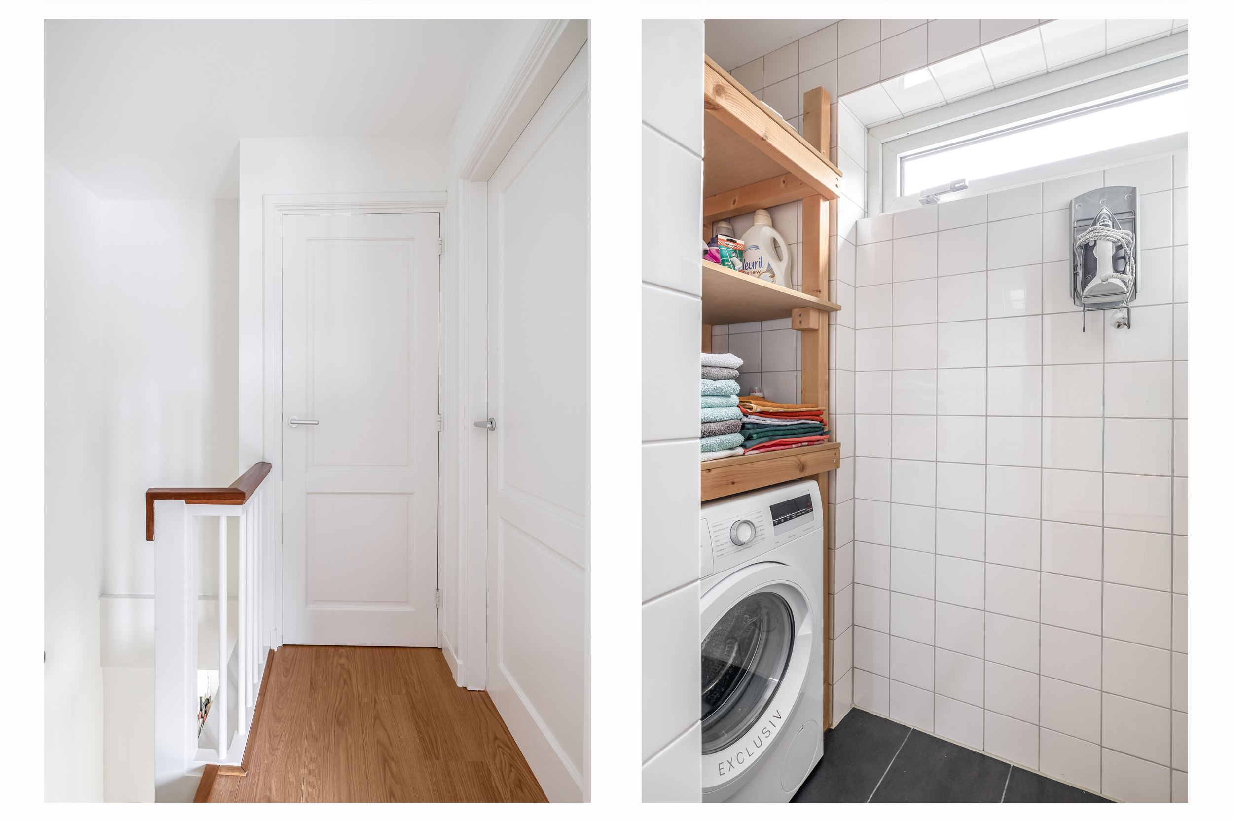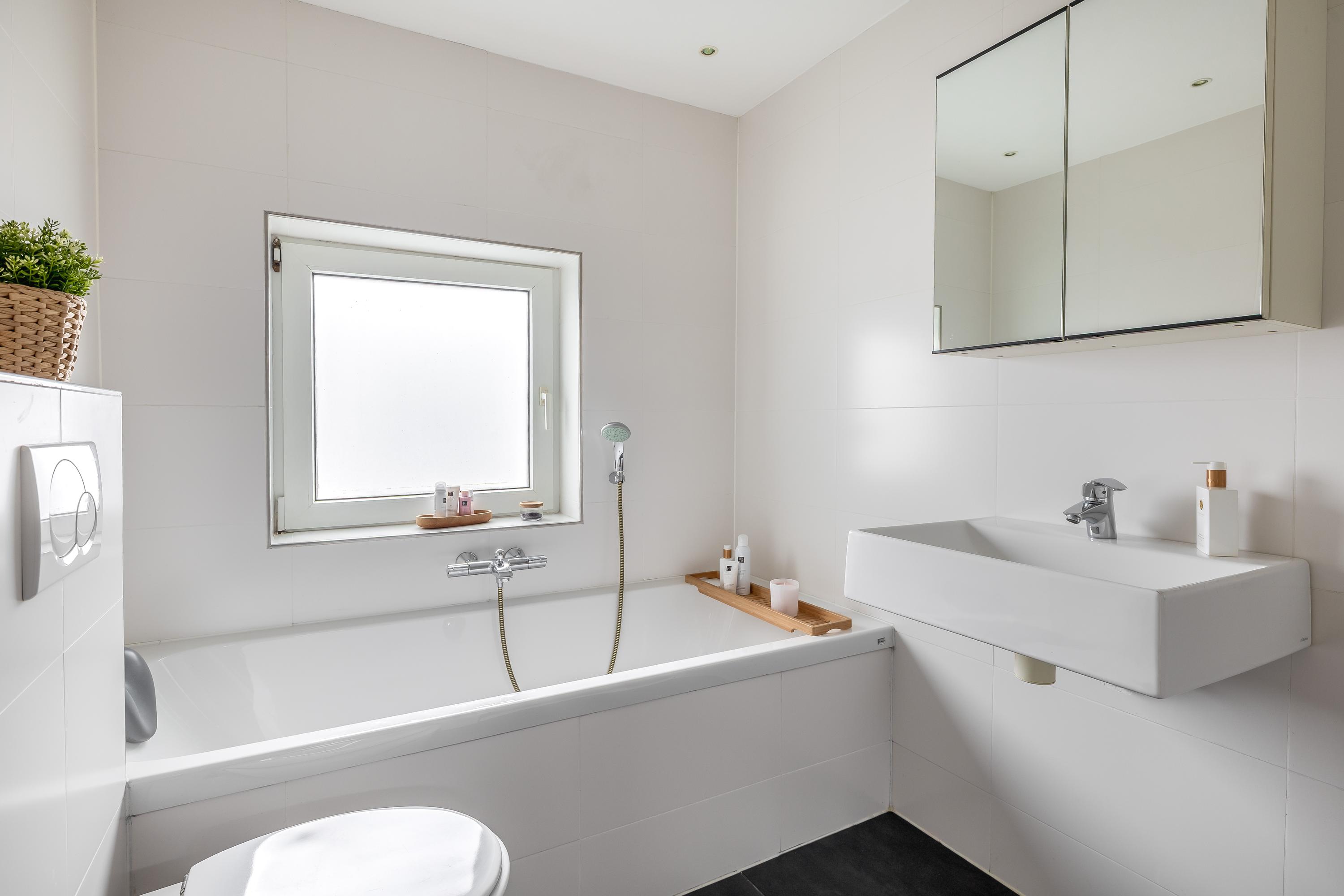 De overloop geeft toegang tot de 2 ruime slaapkamers, de badkamer en een handige bergkamer. Aan de achterzijde van de woning bevindt zich de hoofdslaapkamer, afgewerkt met een laminaatvloer en voorzien van een elektrisch rolluik. Aan de voorzijde ligt de 2e slaapkamer, die beschikt over vaste kasten en eveneens is afgewerkt met een laminaatvloer. Aan de voorzijde bevindt zich daarnaast een praktische bergkamer met de opstelling van de cv-combiketel (Nefit, 2008) en de aansluiting voor de wasmachine. De nette badkamer is voorzien van een ligbad, douche, wastafel en een hangend toilet.