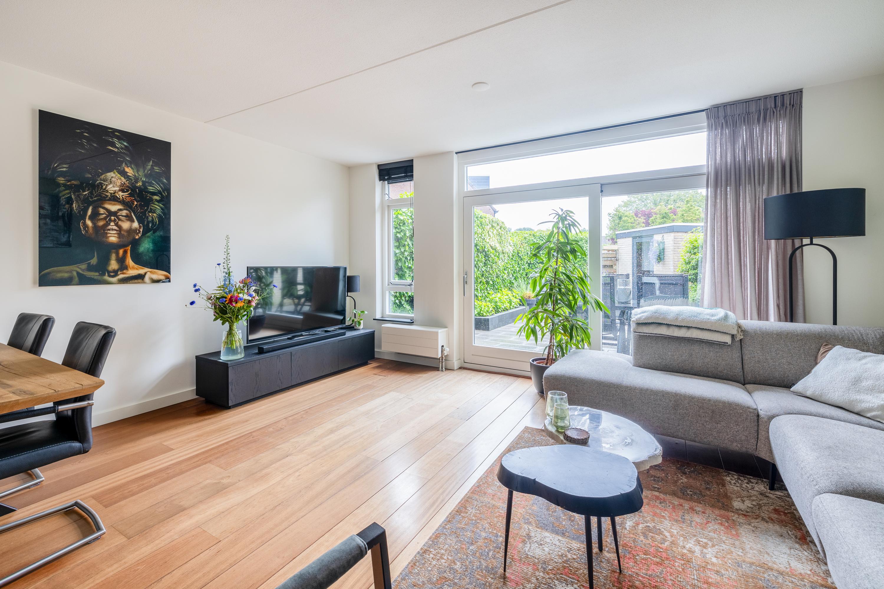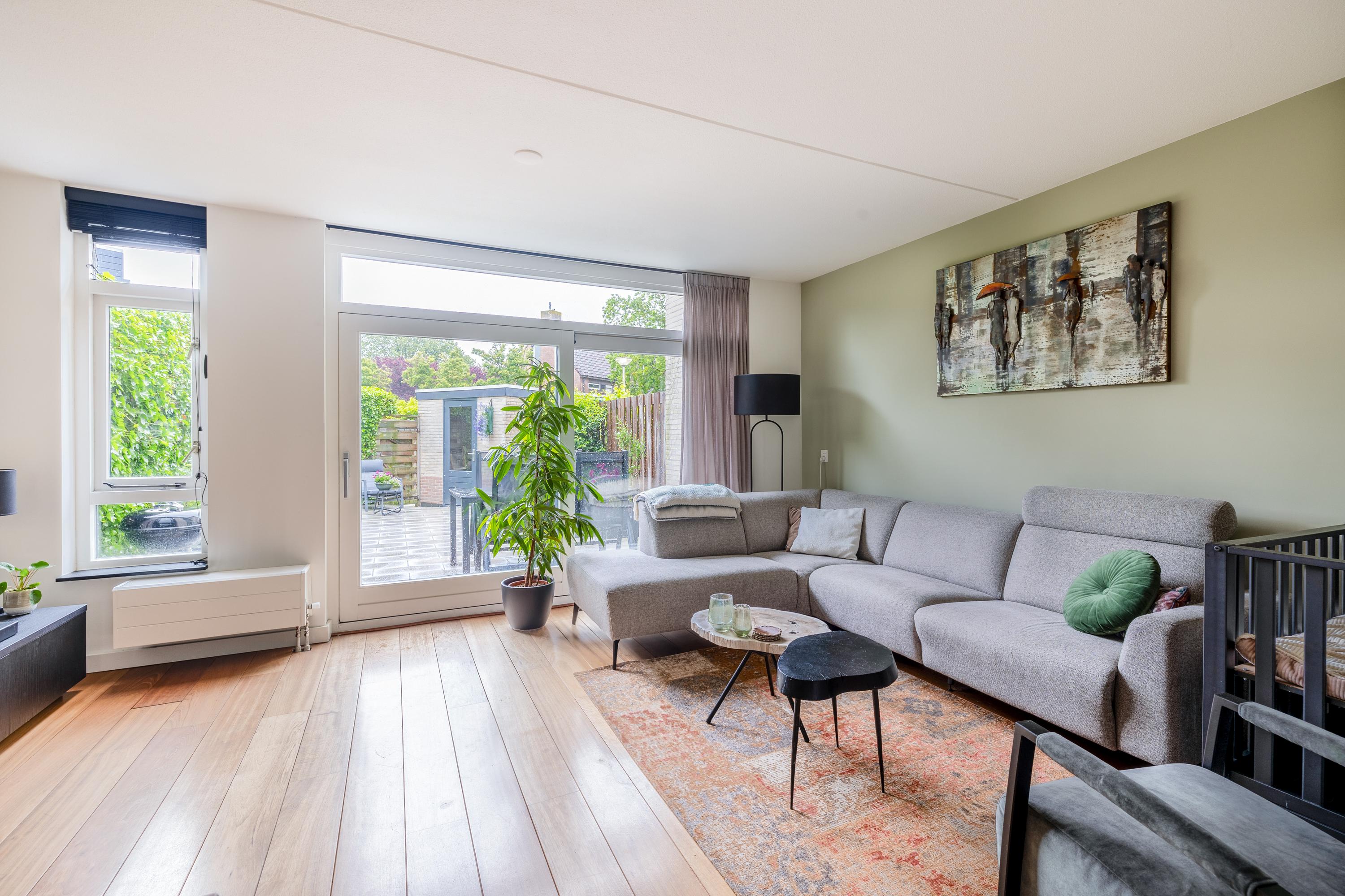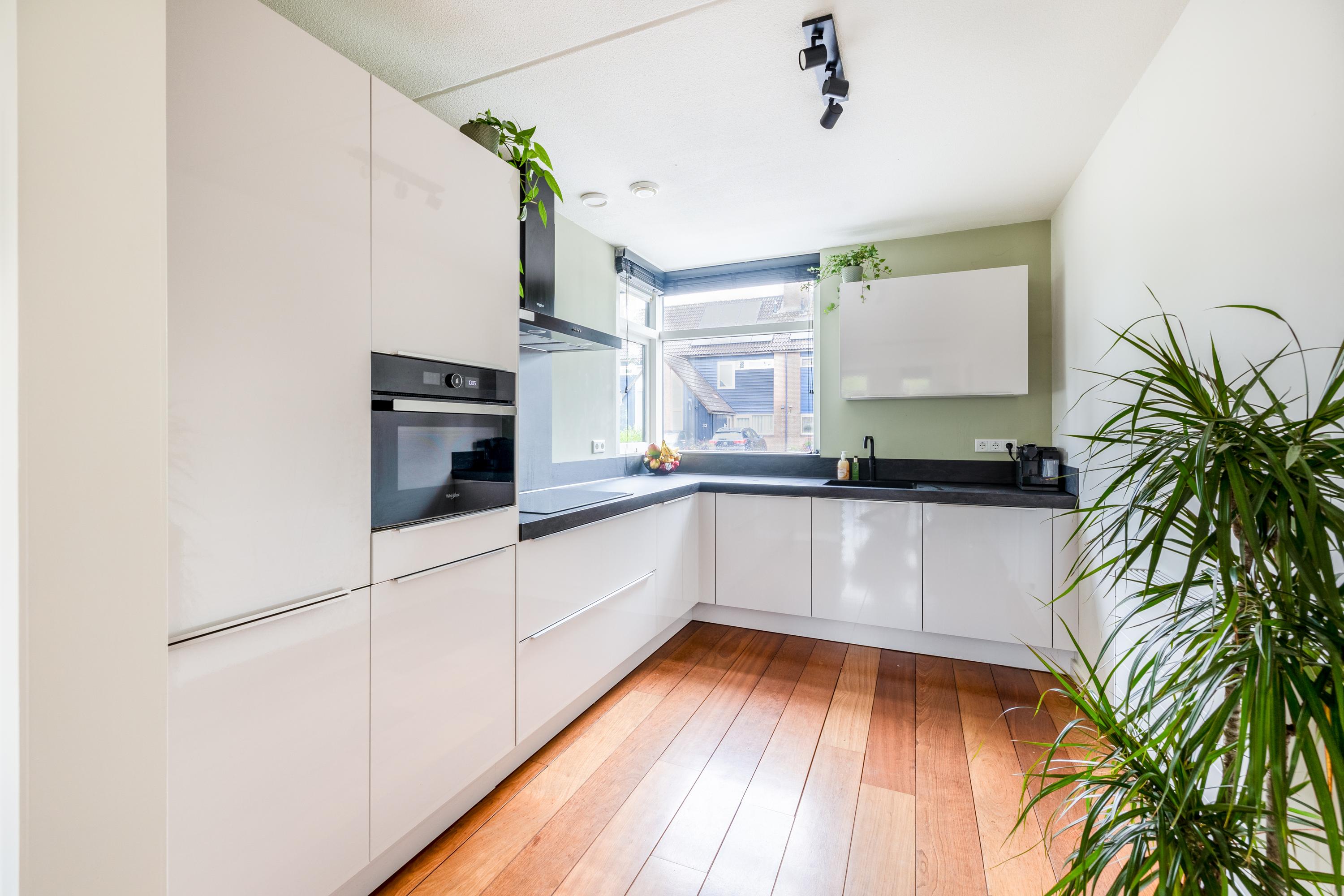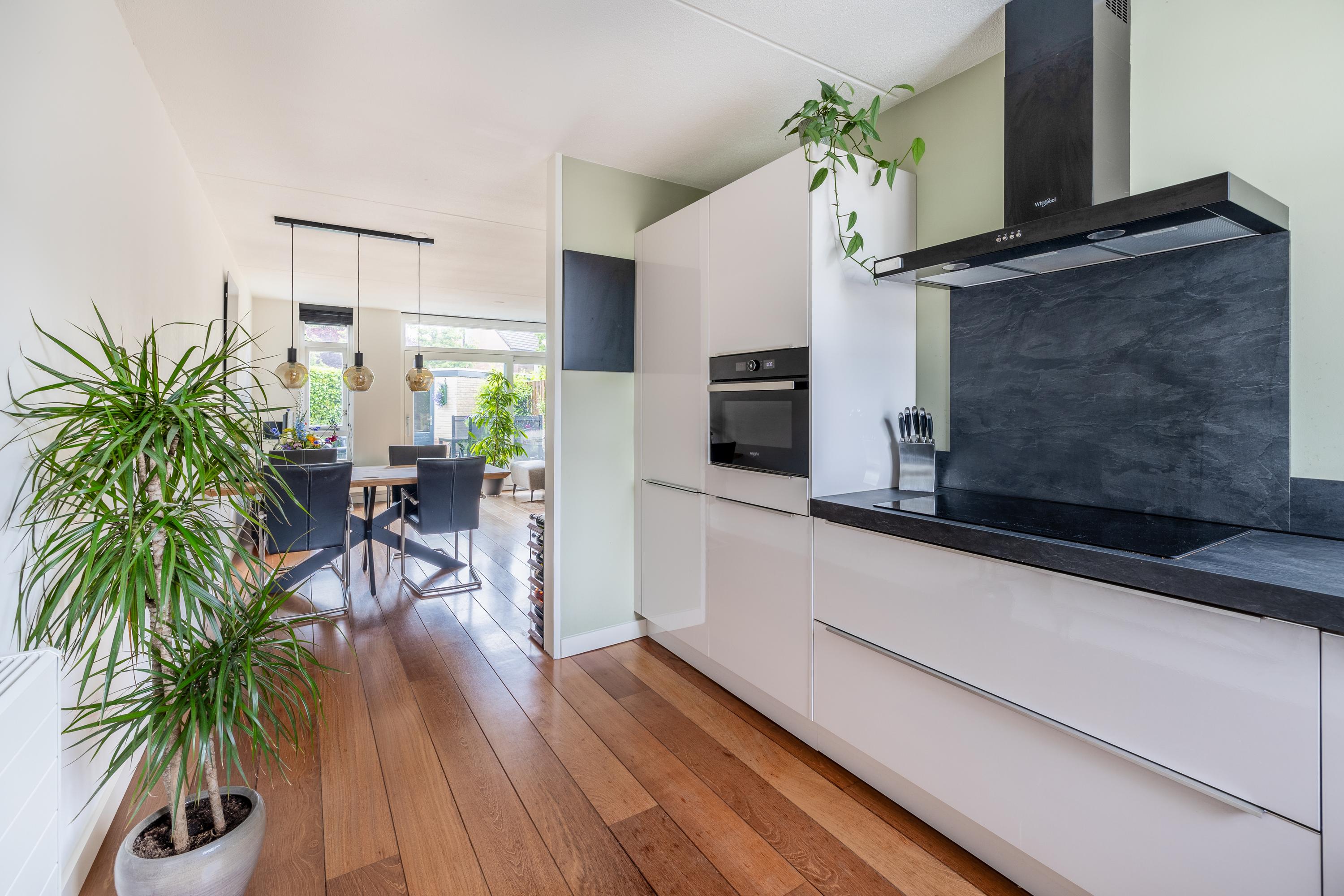 Via de entree kom je in de hal met toegang tot de meterkast, het moderne toilet met fontein, de trap naar de 1e verdieping en de woonkamer. De lichte woonkamer met open keuken is afgewerkt met een mooie parketvloer, strak gestuukte wanden en plafonds én beschikt over een praktische trapkast. Dankzij de grote schuifpui heb je een directe verbinding met de zonnige achtertuin. De moderne keuken (2022) bevindt zich aan de voorzijde, staat in een praktische L-opstelling en is volledig uitgerust met een inductiekookplaat, afzuigkap, combi-magnetron, Quooker, vaatwasser en een koel-vriescombinatie — een fijne plek voor iedere kookliefhebber.