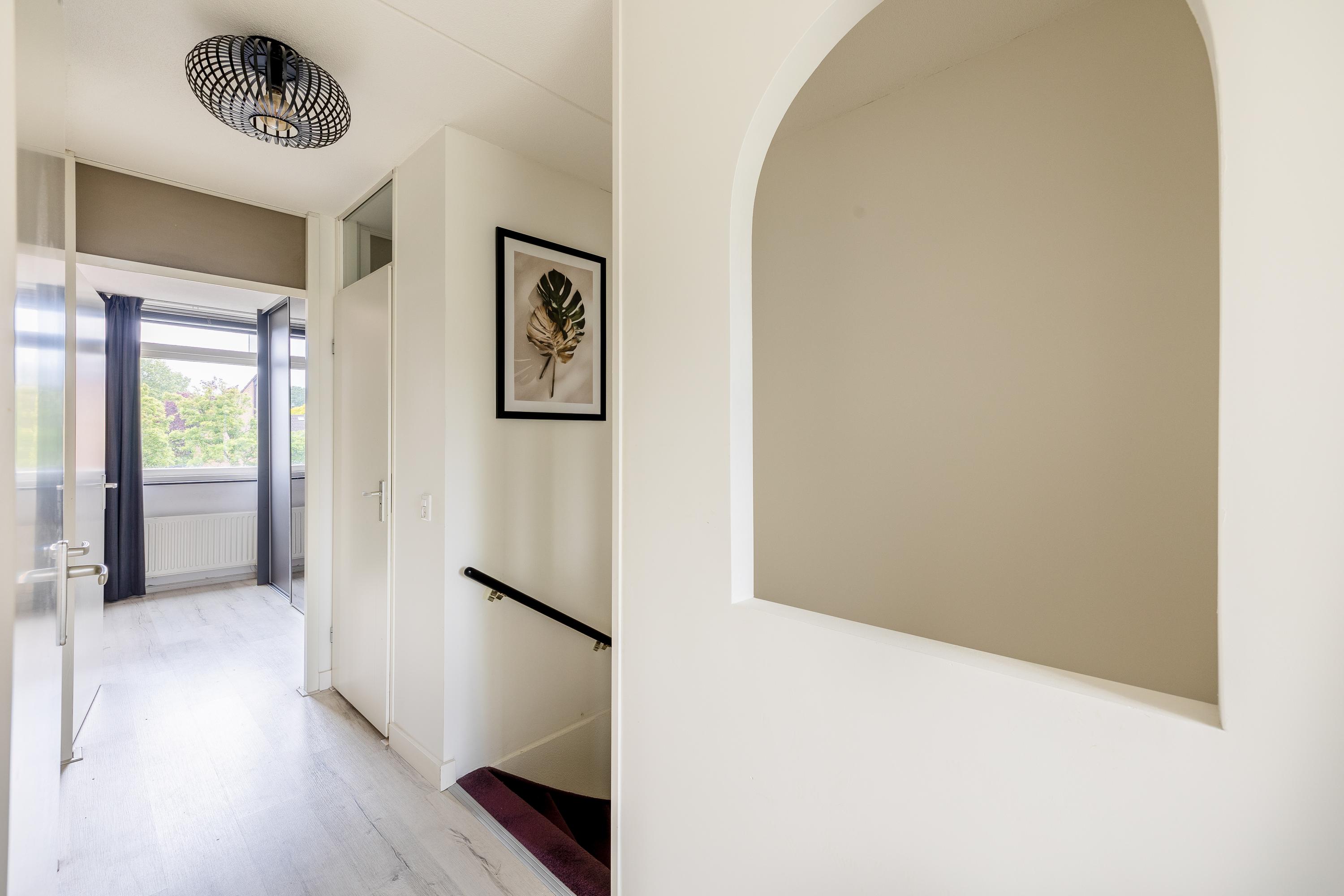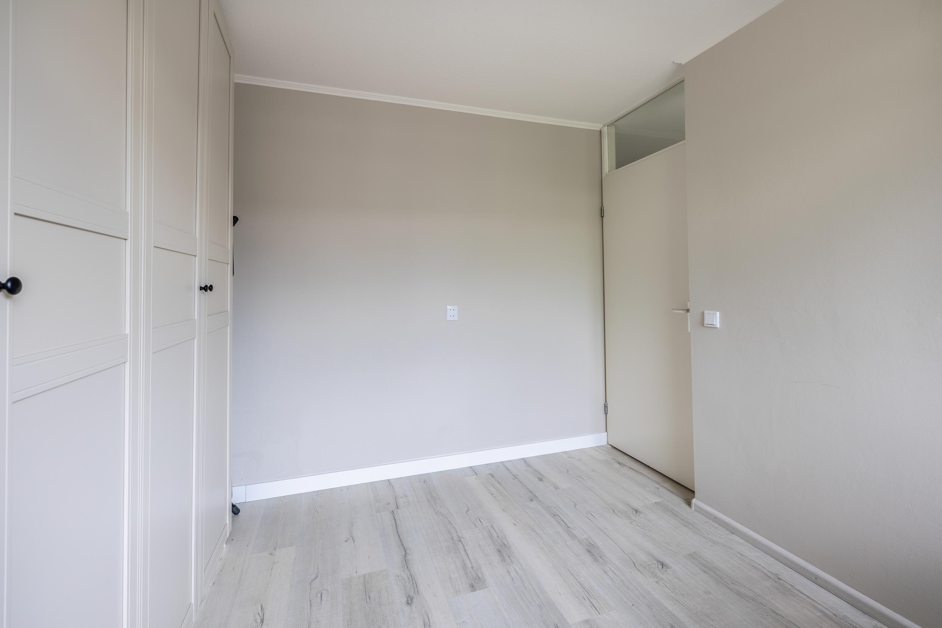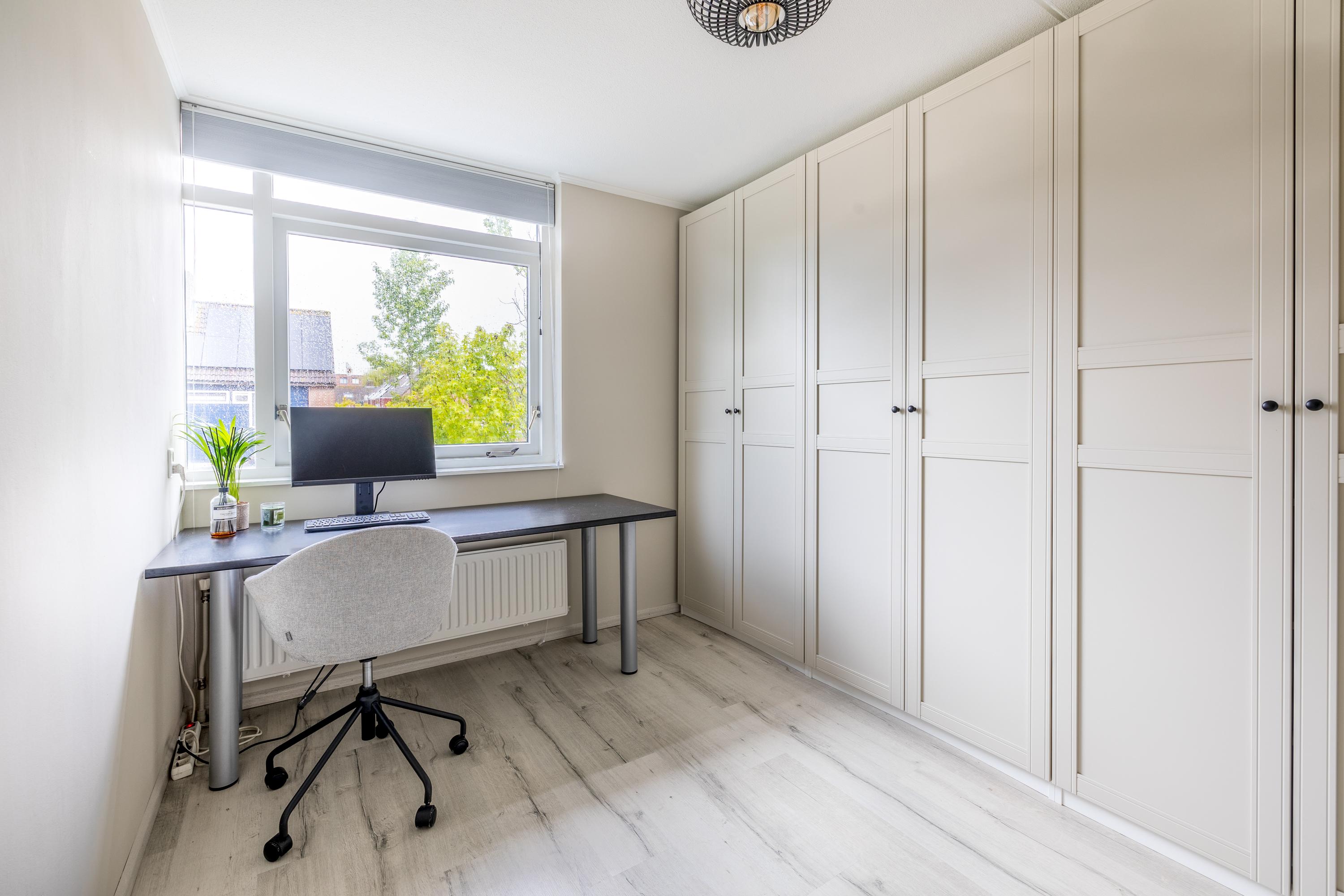Via de trap kom je op de overloop van de verdieping, die toegang geeft tot drie slaapkamers, een aparte toiletruimte met hangend closet, de badkamer en een bergkast met de cv-installatie (Nefit 2016). 2 slaapkamers liggen aan de voorzijde, terwijl de ruime hoofdslaapkamer zich aan de achterzijde bevindt. Deze kamer beschikt over twee ramen met elektrische rolluiken in dezelfde moderne antracietkleur als het buitenschilderwerk en heeft daarnaast een praktische schuifdeurenkast. De badkamer is royaal en compleet ingericht met een ligbad, douche, wastafel en aansluitingen voor de wasmachine en droger. Ook deze verdieping is netjes afgewerkt met een laminaatvloer en strak gestuukte wanden en plafonds.
