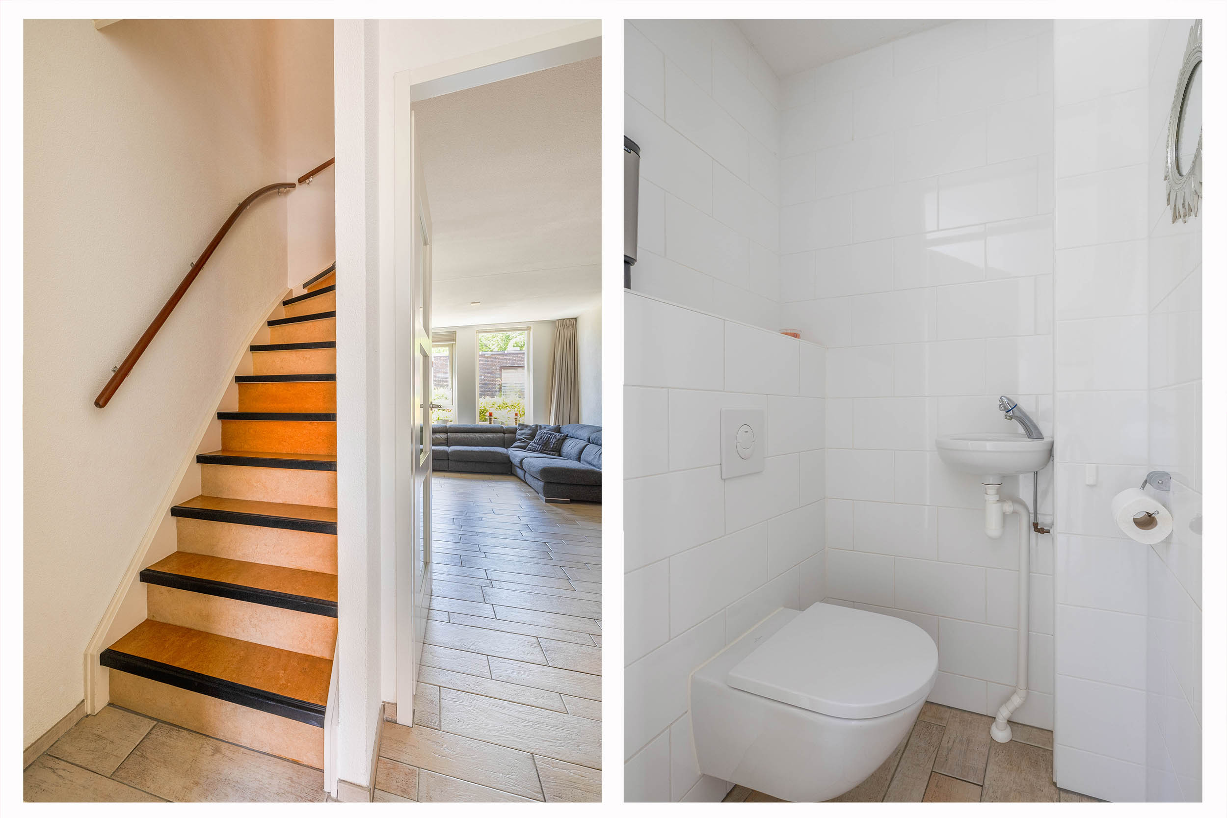 Via de 2e hal loop je naar het modern afgewerkte toilet, voorzien van een hangend closet, fonteintje en tot het plafond betegelde wanden. Ook hier vind je de trap naar de eerste verdieping en de deur naar de achtertuin. De gehele begane grond is voorzien van plavuizen met vloerverwarming.