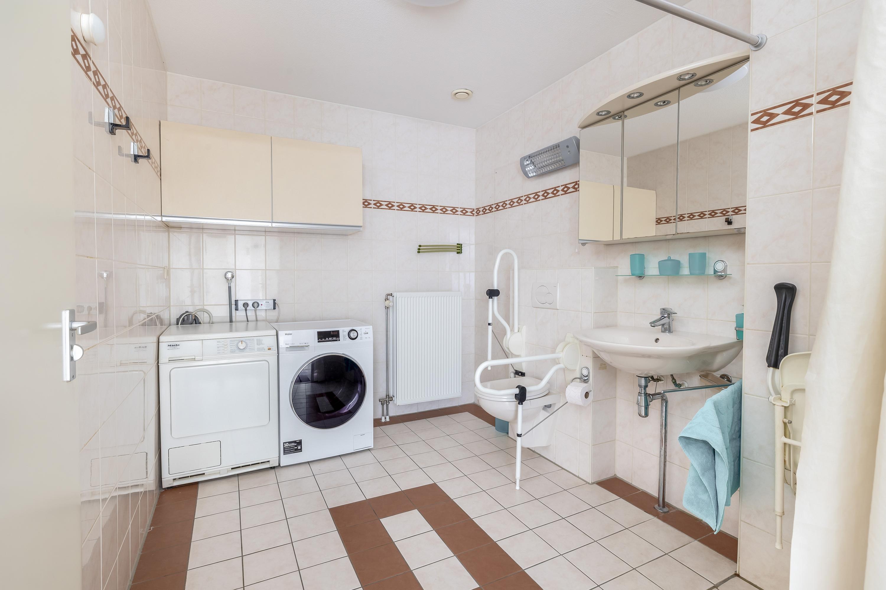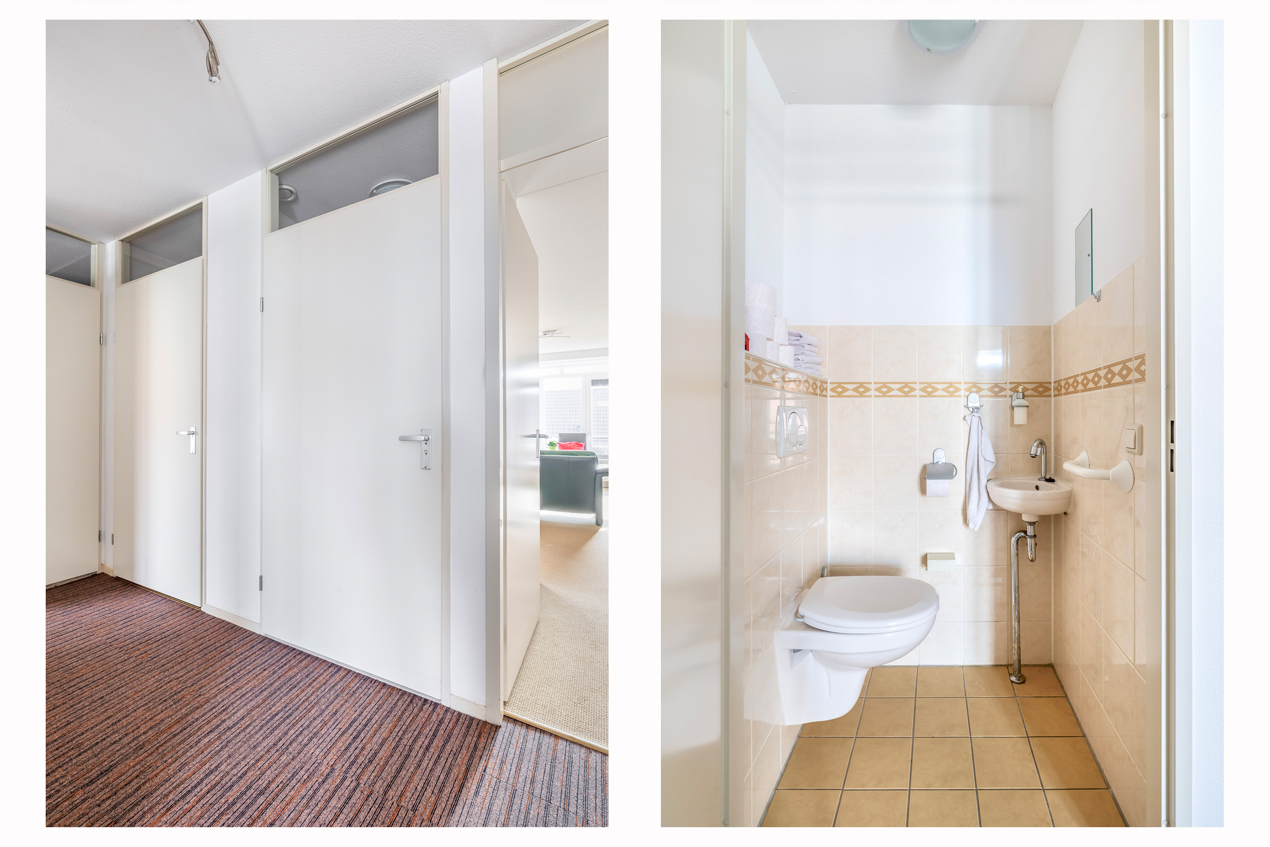 Je komt het appartement binnen via de ruime hal met videofoon, die toegang biedt tot de meterkast, het toilet met hangend closet en fonteintje en 2 praktische bergkasten. In 1 van deze kasten bevinden zich de cv-combiketel (Remeha, 2017), de verveler van de vloerverwarming en de mechanische ventilatie-unit.