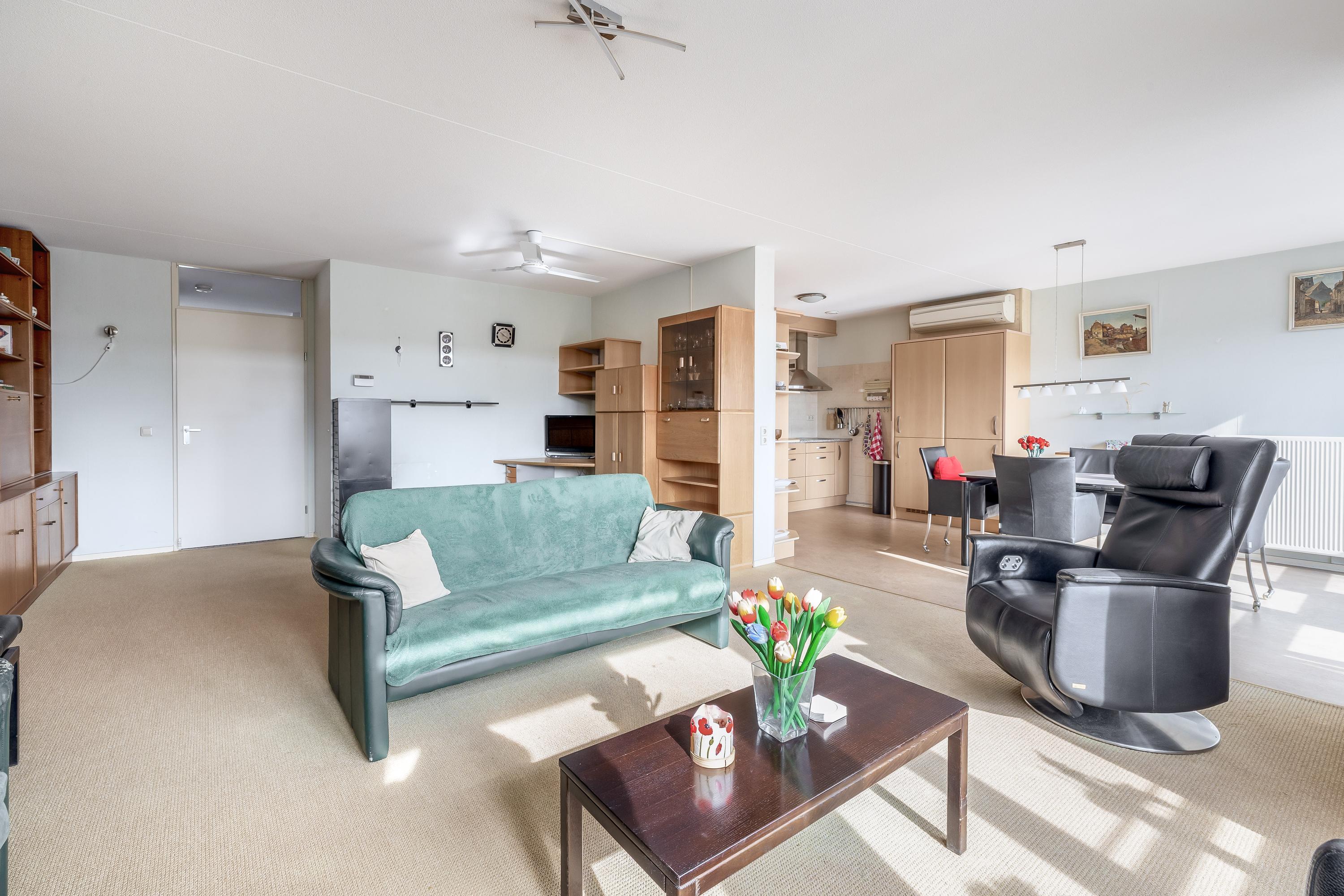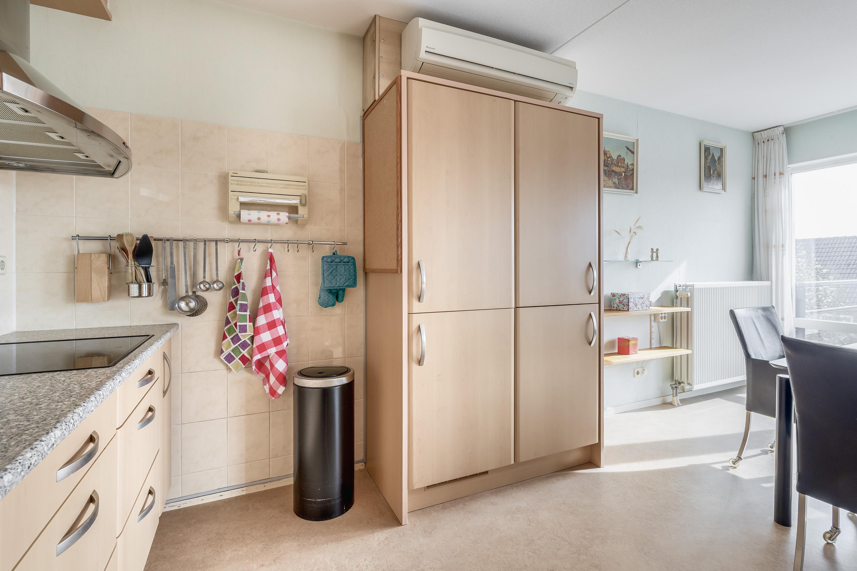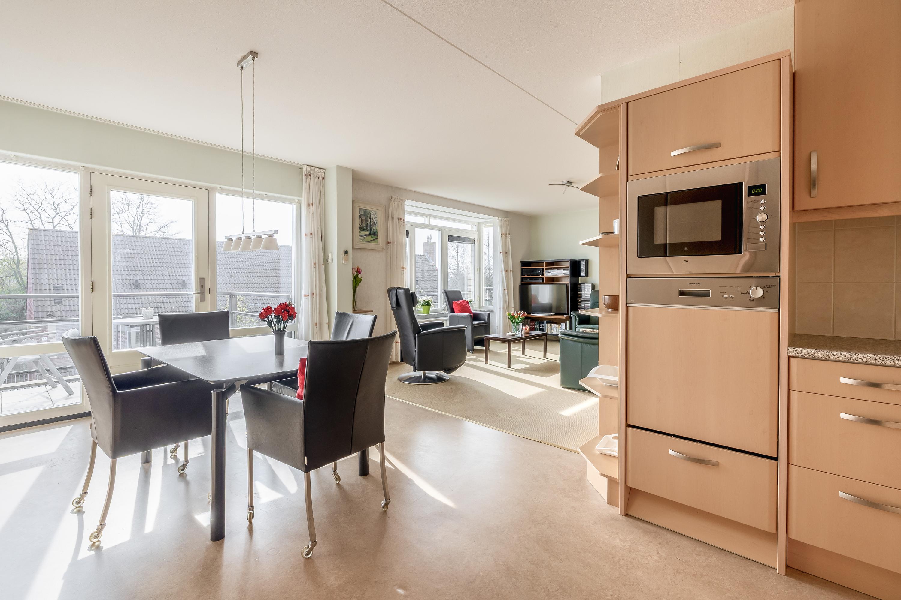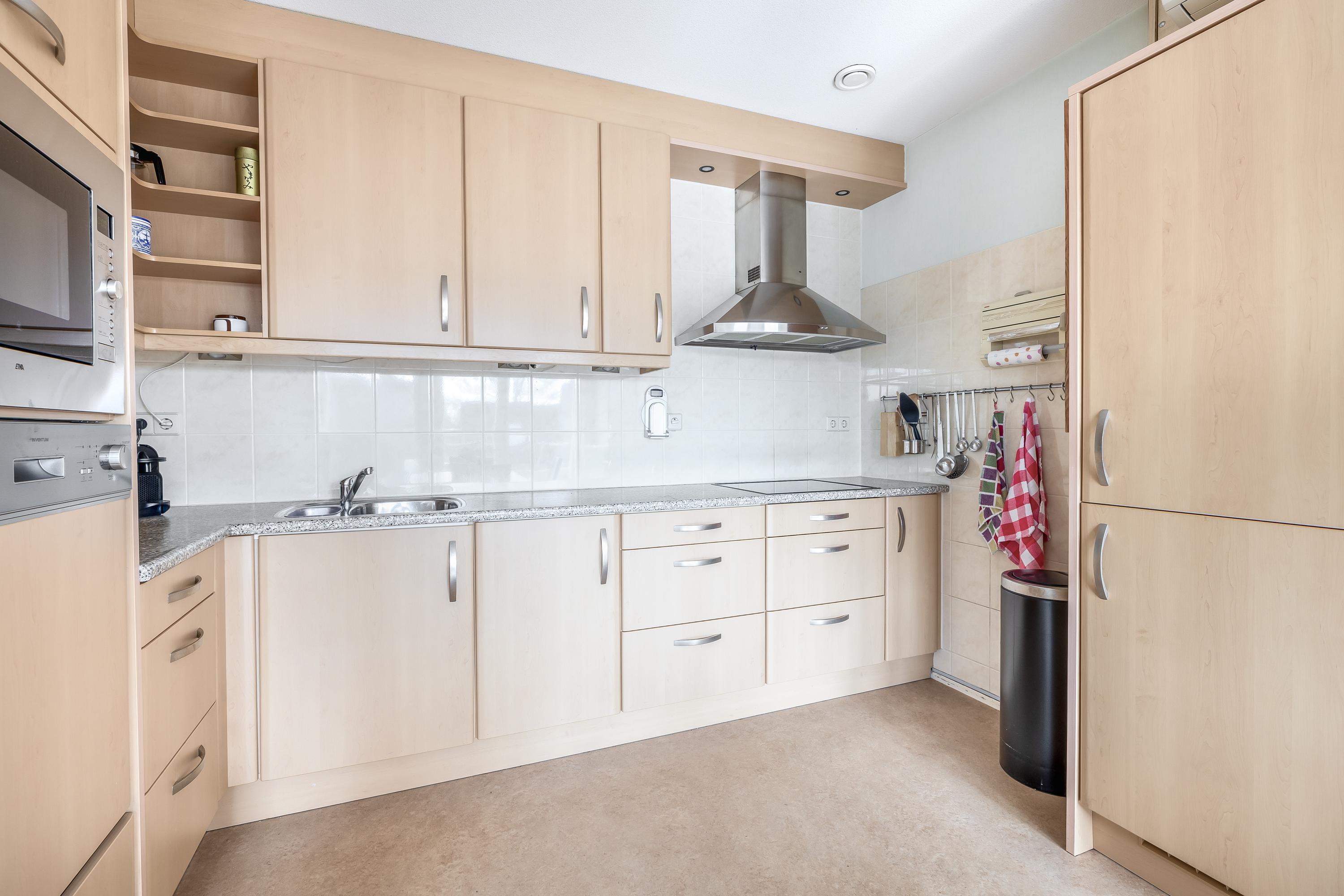 Vanuit de hal stap je de lichte en ruim opgezette woonkamer binnen, die is voorzien van airconditioning en in open verbinding staat met de keuken. Vanuit de woonkamer is er via een deur toegang tot het zonnige balkon, een fijne plek om buiten te zitten. Het raam in het woongedeelte is voorzien van screens, wat zorgt voor extra comfort door het weren van zonlicht en warmte. De keuken is uitgevoerd in een hoekopstelling met extra kastenwand en beschikt over diverse inbouwapparatuur, waaronder een keramische kookplaat, afzuigkap, koel-vriescombinatie, vaatwasser en combimagnetron.