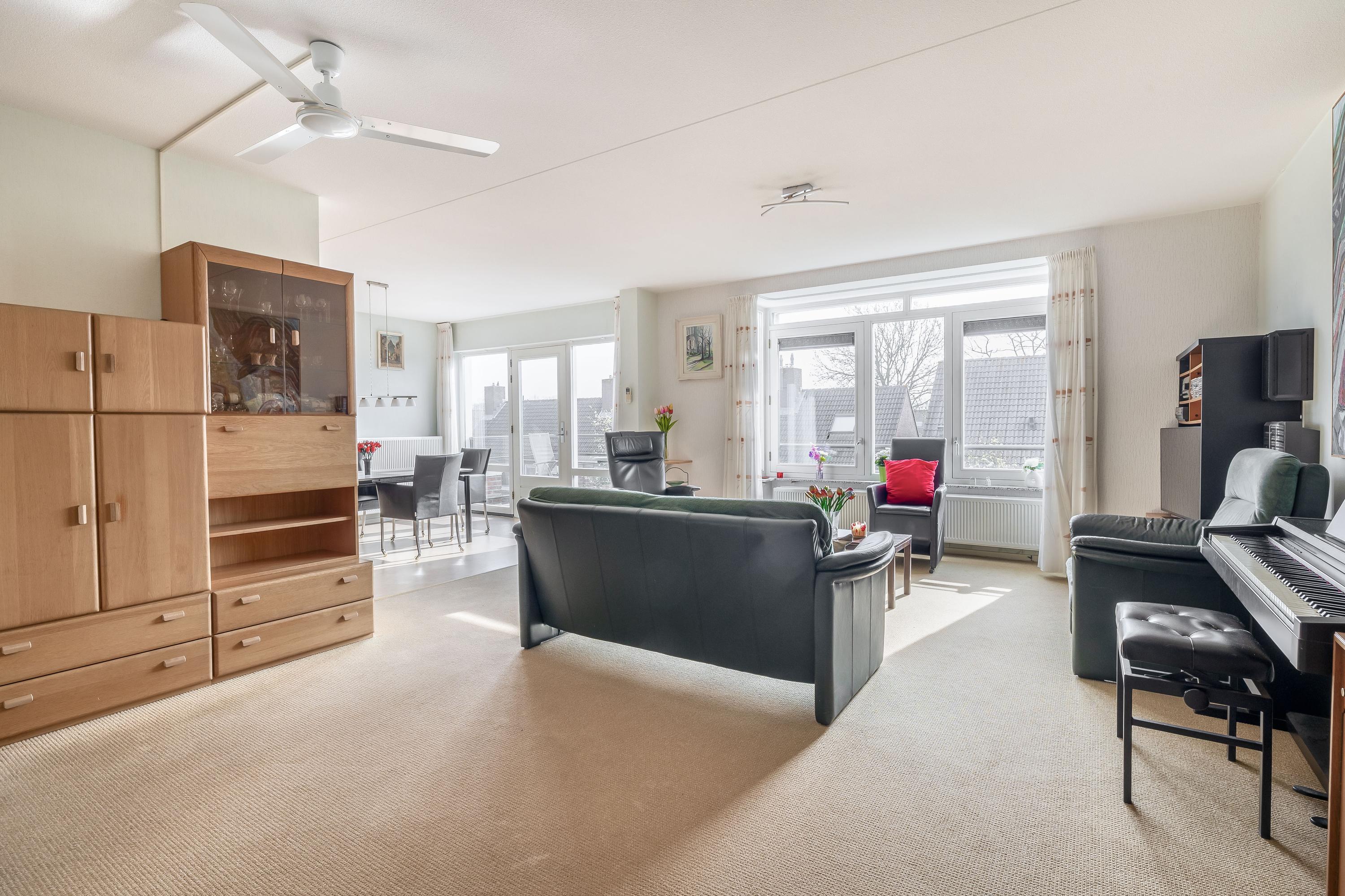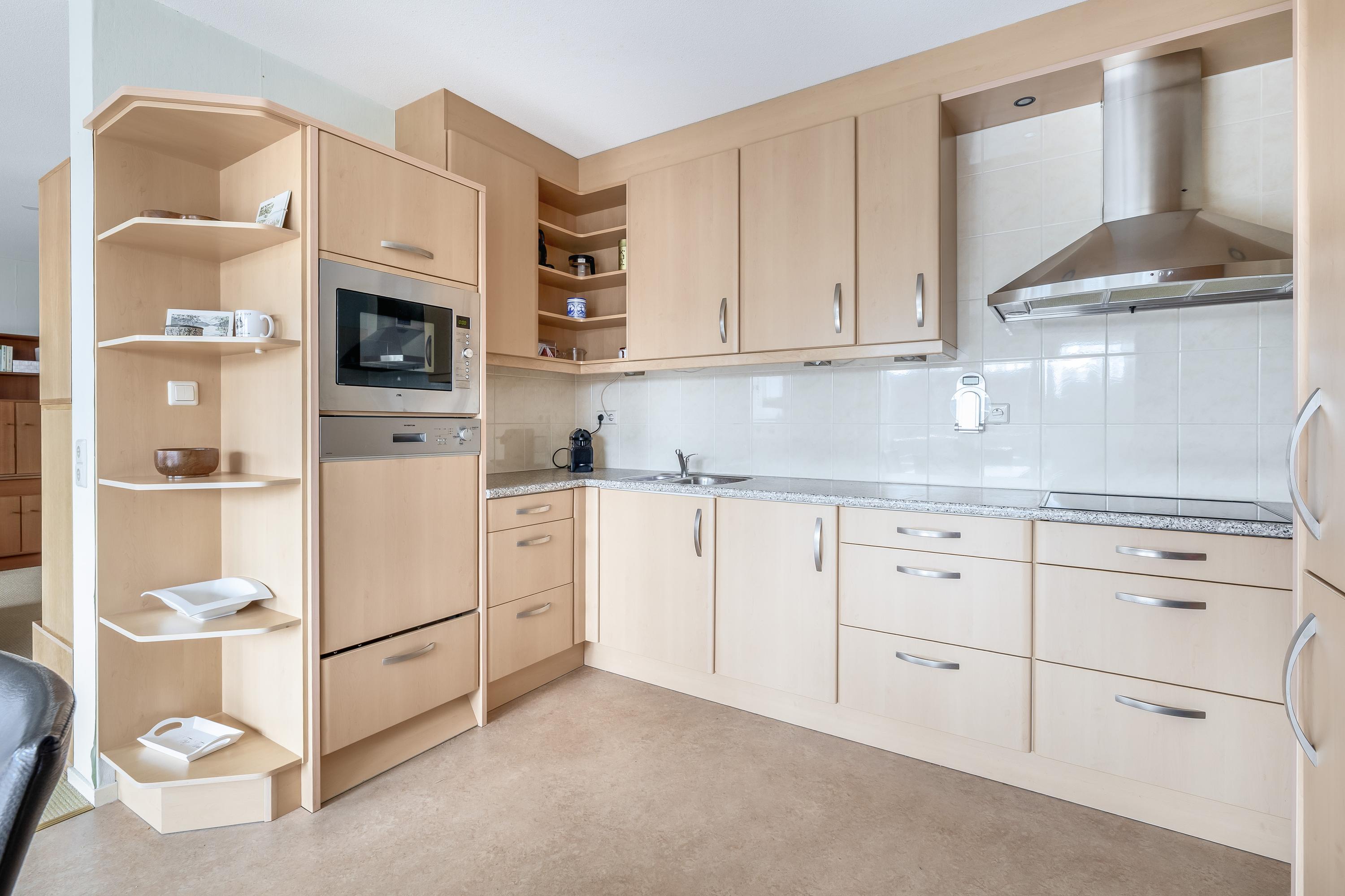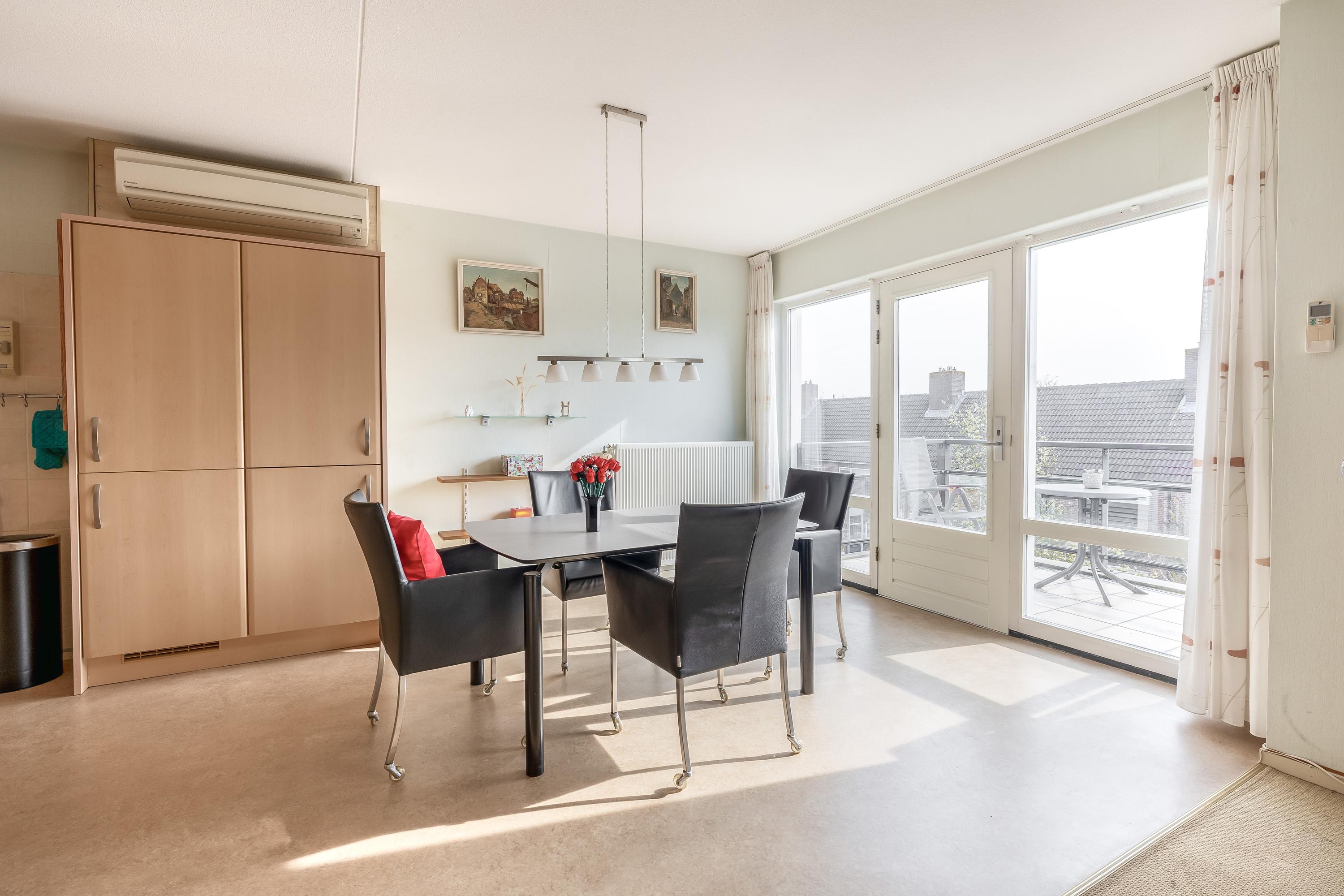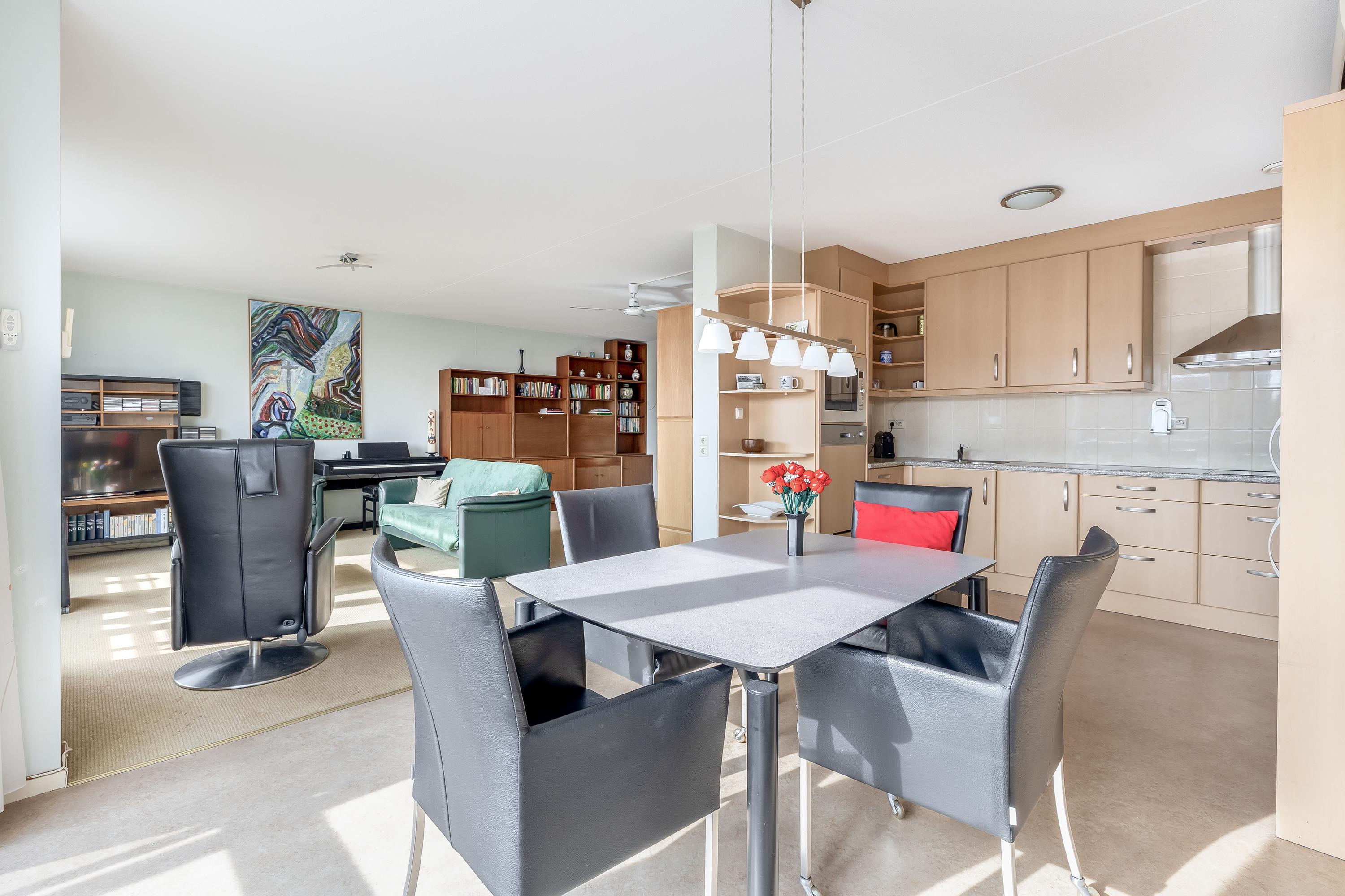 Vanuit de hal stap je de lichte en ruim opgezette woonkamer binnen, die is voorzien van airconditioning en in open verbinding staat met de keuken. Vanuit de woonkamer is er via een deur toegang tot het zonnige balkon, een fijne plek om buiten te zitten. Het raam in het woongedeelte is voorzien van screens, wat zorgt voor extra comfort door het weren van zonlicht en warmte. De keuken is uitgevoerd in een hoekopstelling met extra kastenwand en beschikt over diverse inbouwapparatuur, waaronder een keramische kookplaat, afzuigkap, koel-vriescombinatie, vaatwasser en combimagnetron.