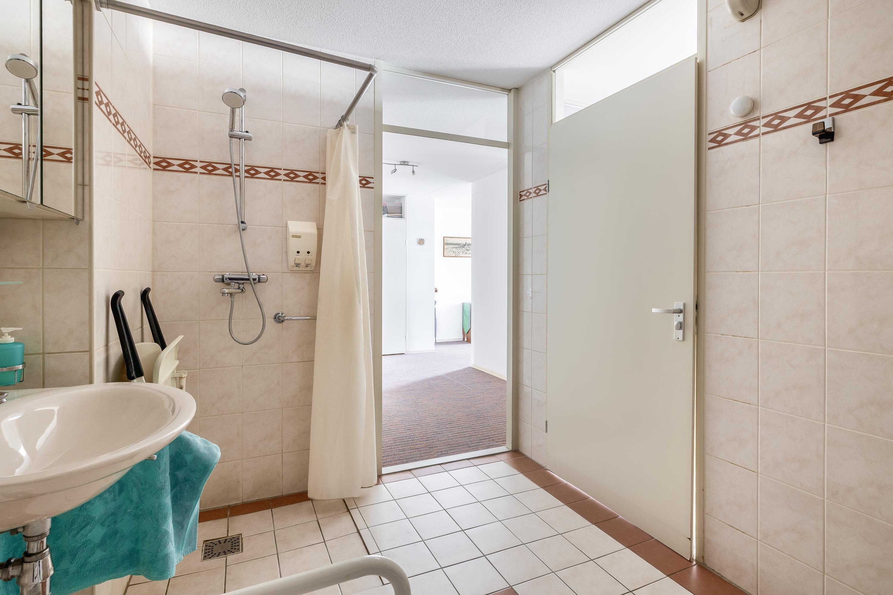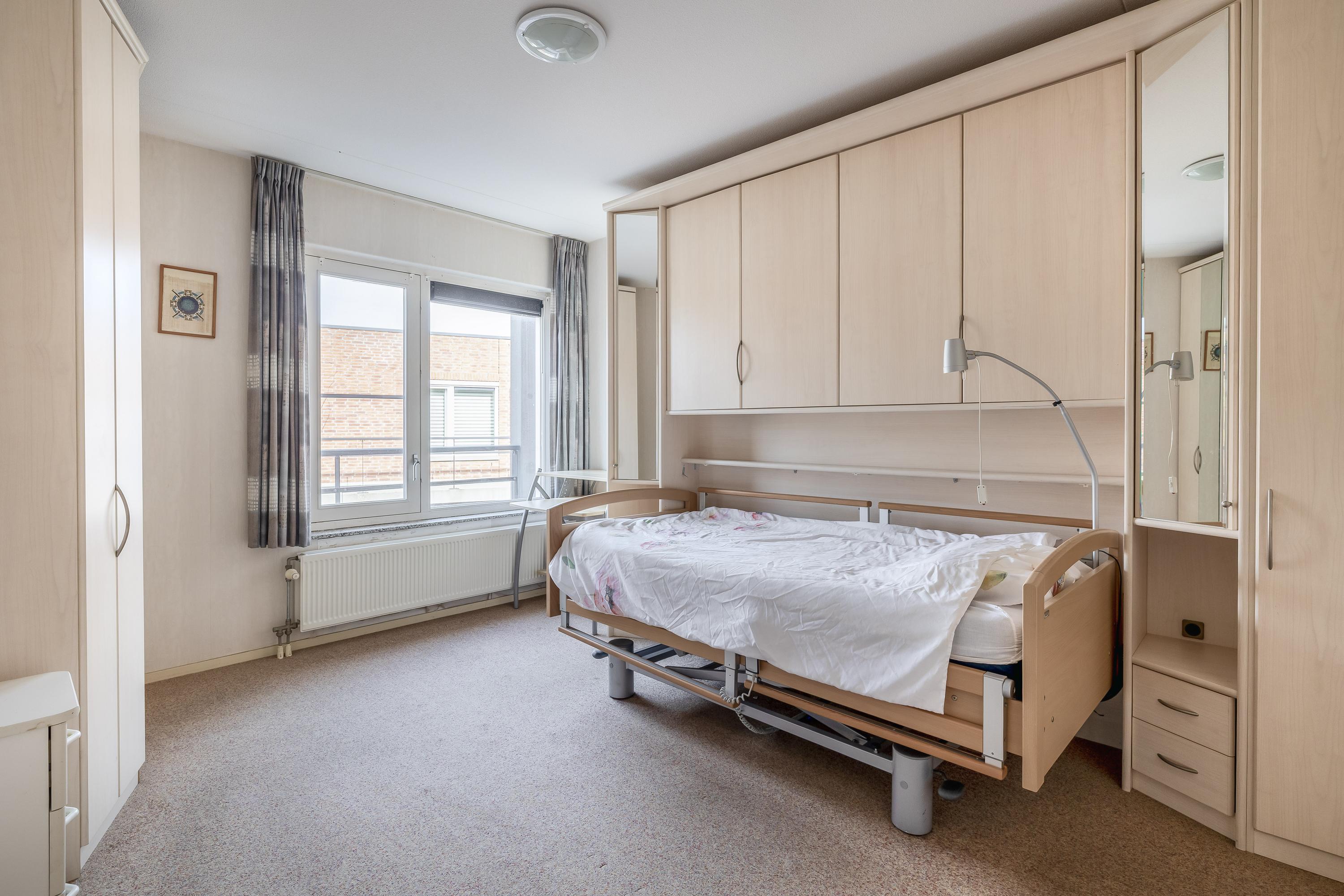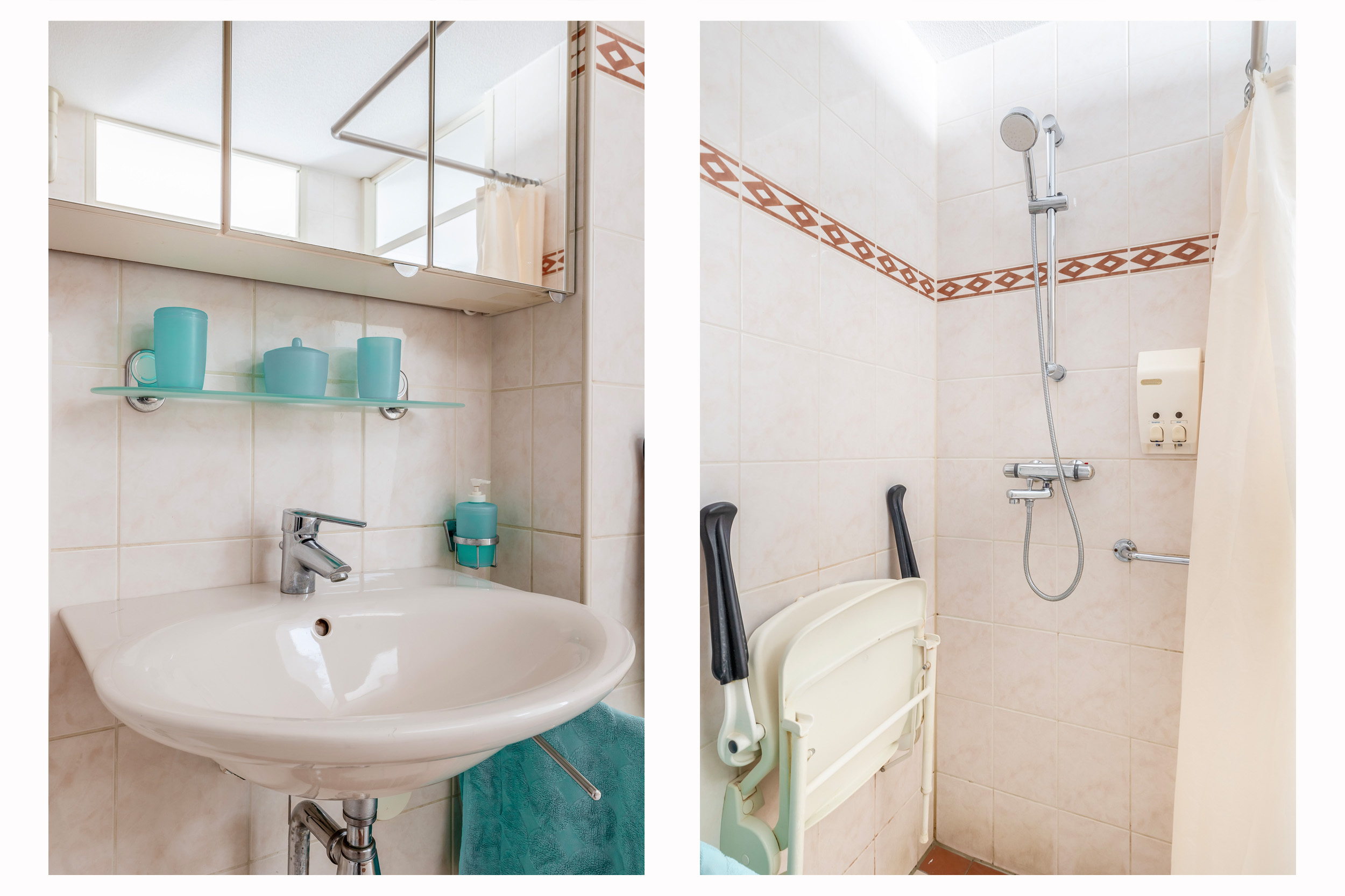 Via de hal bereik je de 2 slaapkamers, beide voorzien van airconditioning en met uitzicht op de binnentuin. De badkamer is zowel vanuit de hal als de hoofdslaapkamer toegankelijk en is uitgerust met een douche met opklapbare zitting, wastafel en een hangend toilet met opklapbare steunen. Ook bevinden zich hier de aansluitingen voor de wasmachine en droger. Het appartement is grotendeels afgewerkt met vloerbedekking, m.u.v. linoleum in het keuken/eetgedeelte.