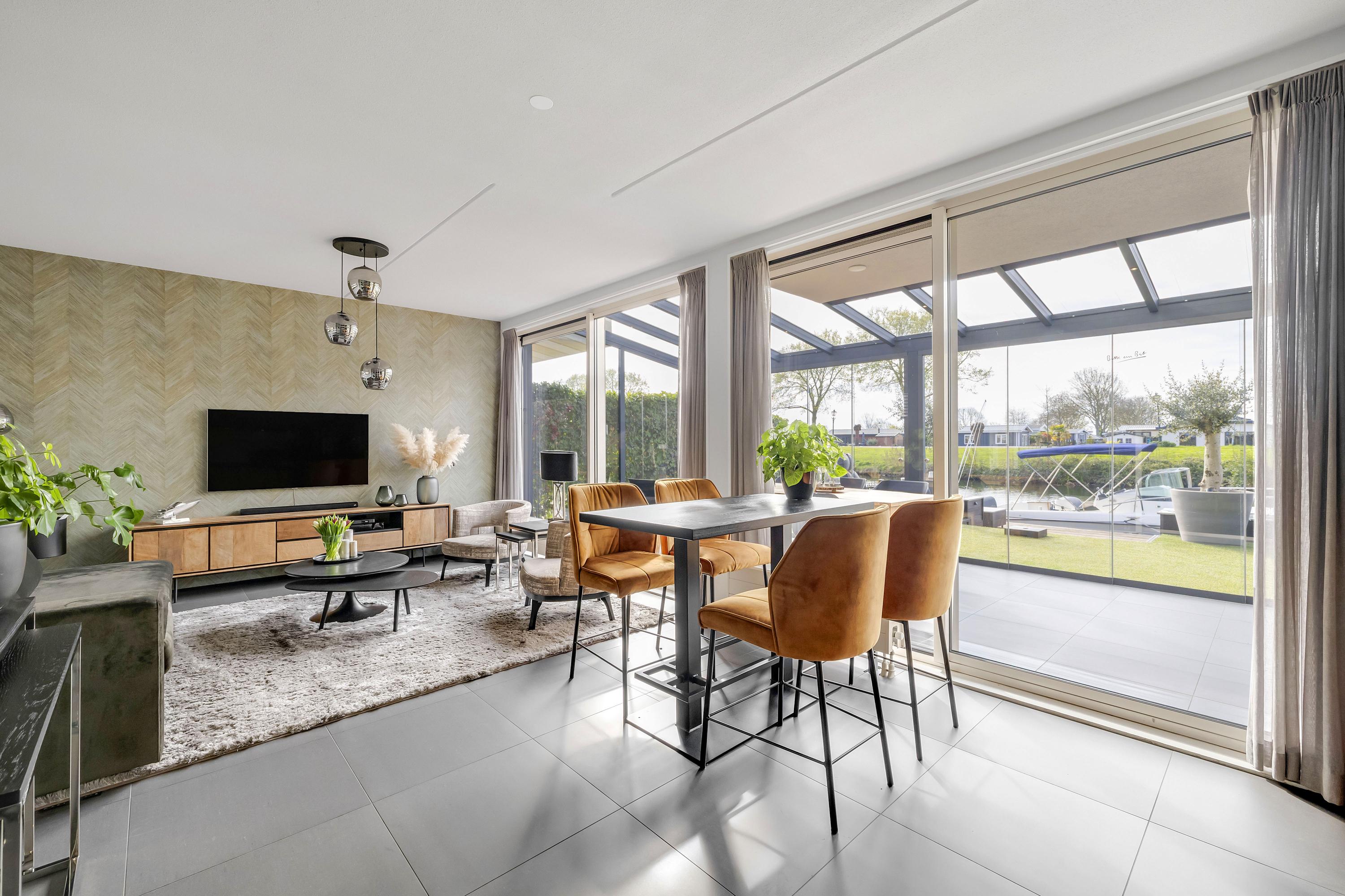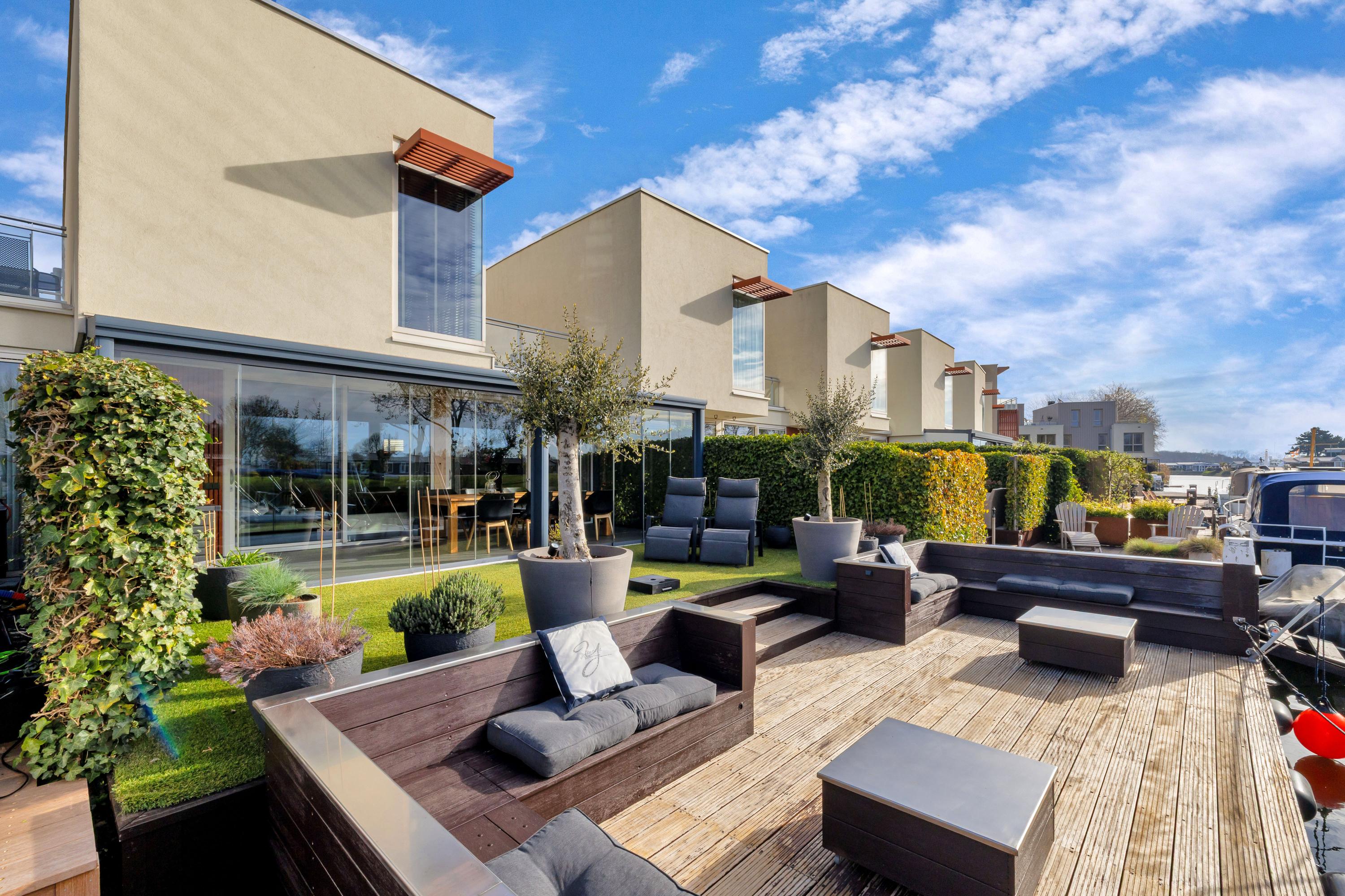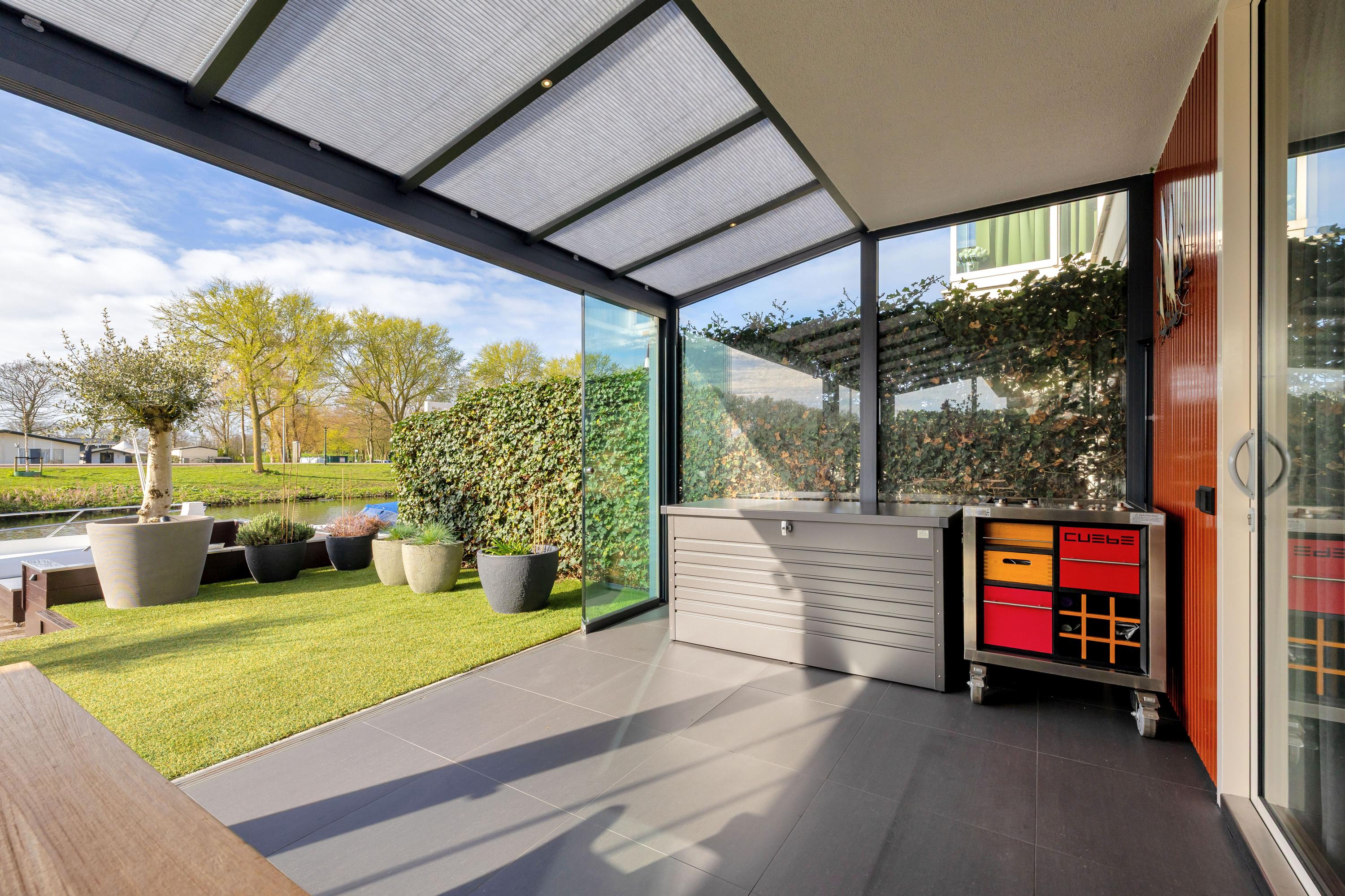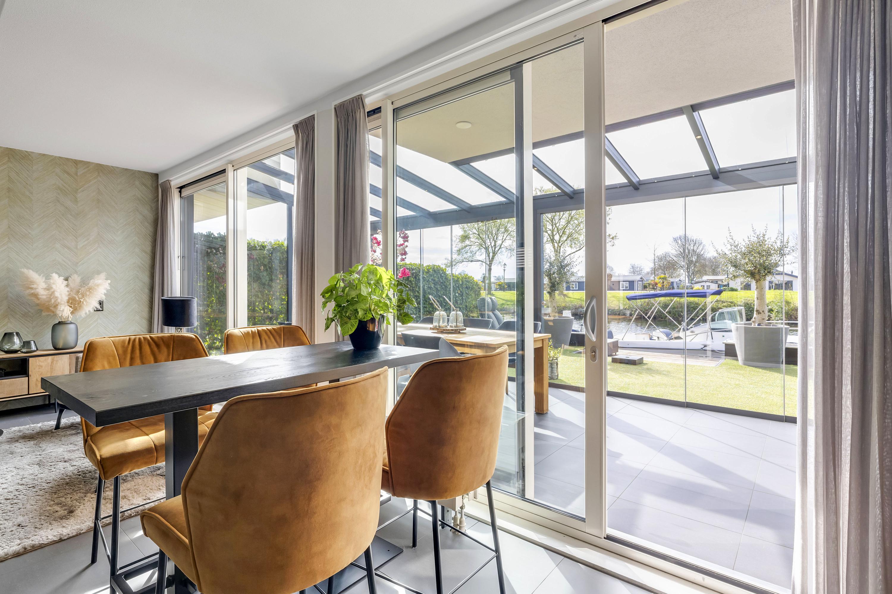 Aan de achterzijde bevindt zich een serre over de volledige breedte van de woning. Deze afsluitbare ruimte is voorzien van inbouwspots en kan worden verduisterd, waardoor je hier het hele jaar door comfortabel kunt zitten. Het aangrenzende zonneterras ligt op het zuiden, direct aan het water en beschikt over een eigen aanlegsteiger. Hier geniet je volop van de zon, het uitzicht en het buitenleven, met de mogelijkheid om zo het water op te varen. Het terras en de serre zijn uitgevoerd met een solide betonvloer onder de tegels.