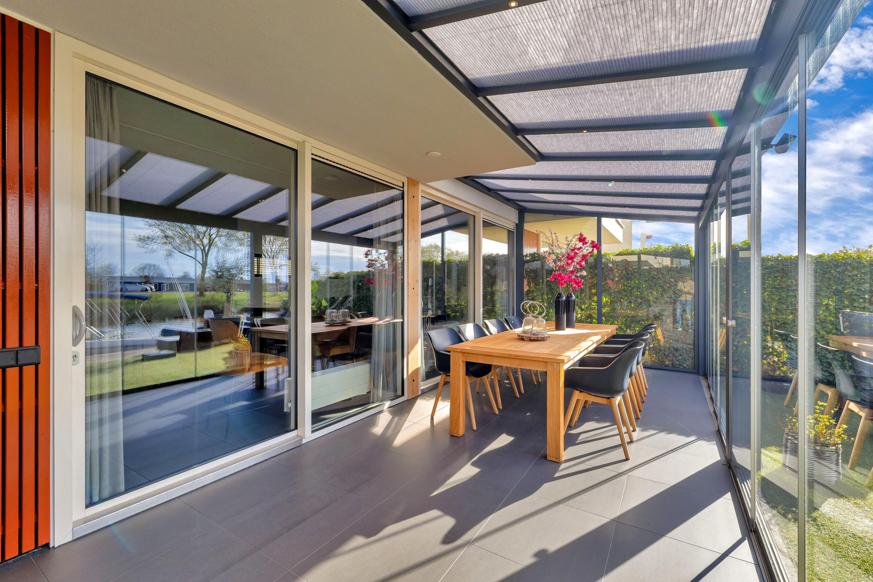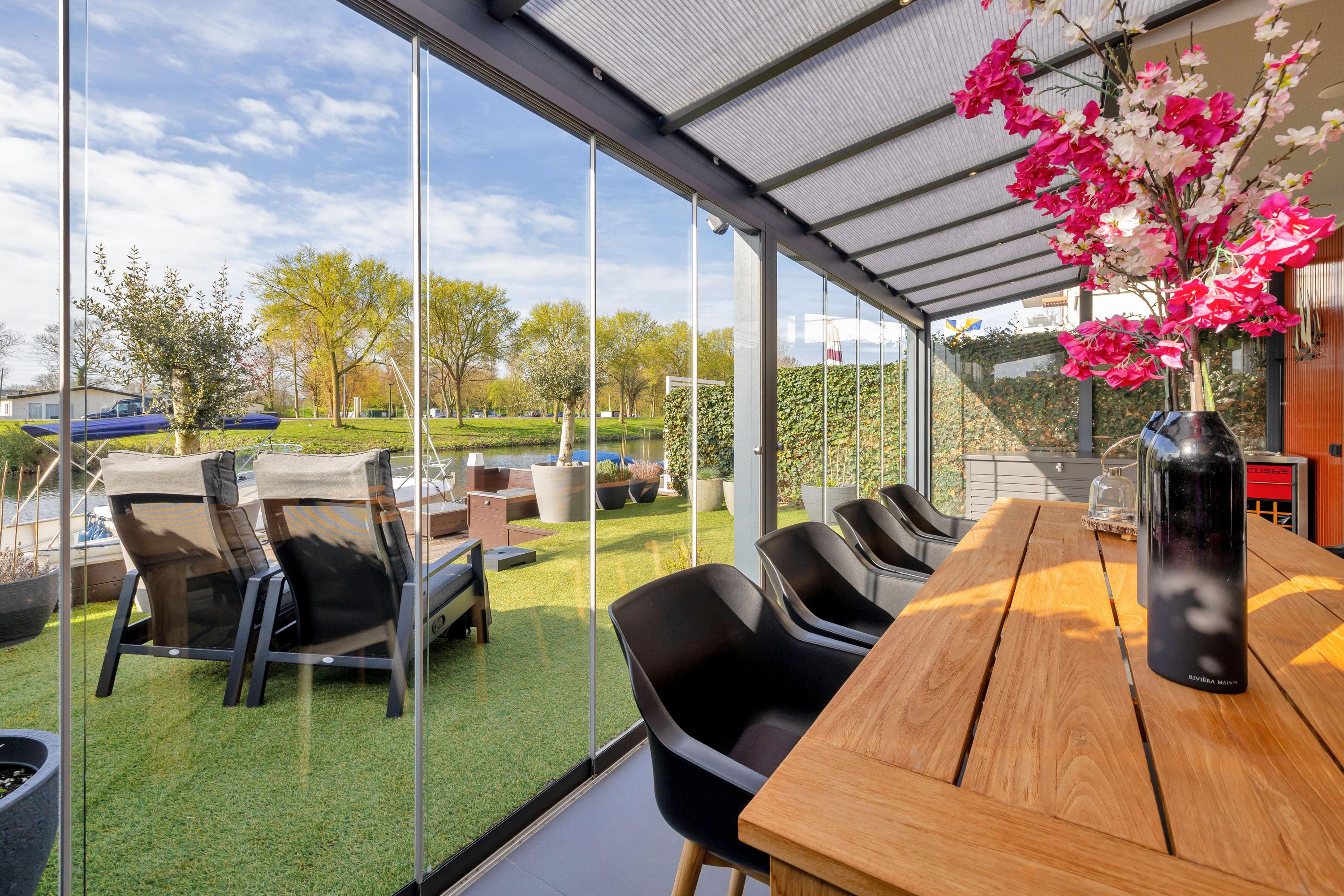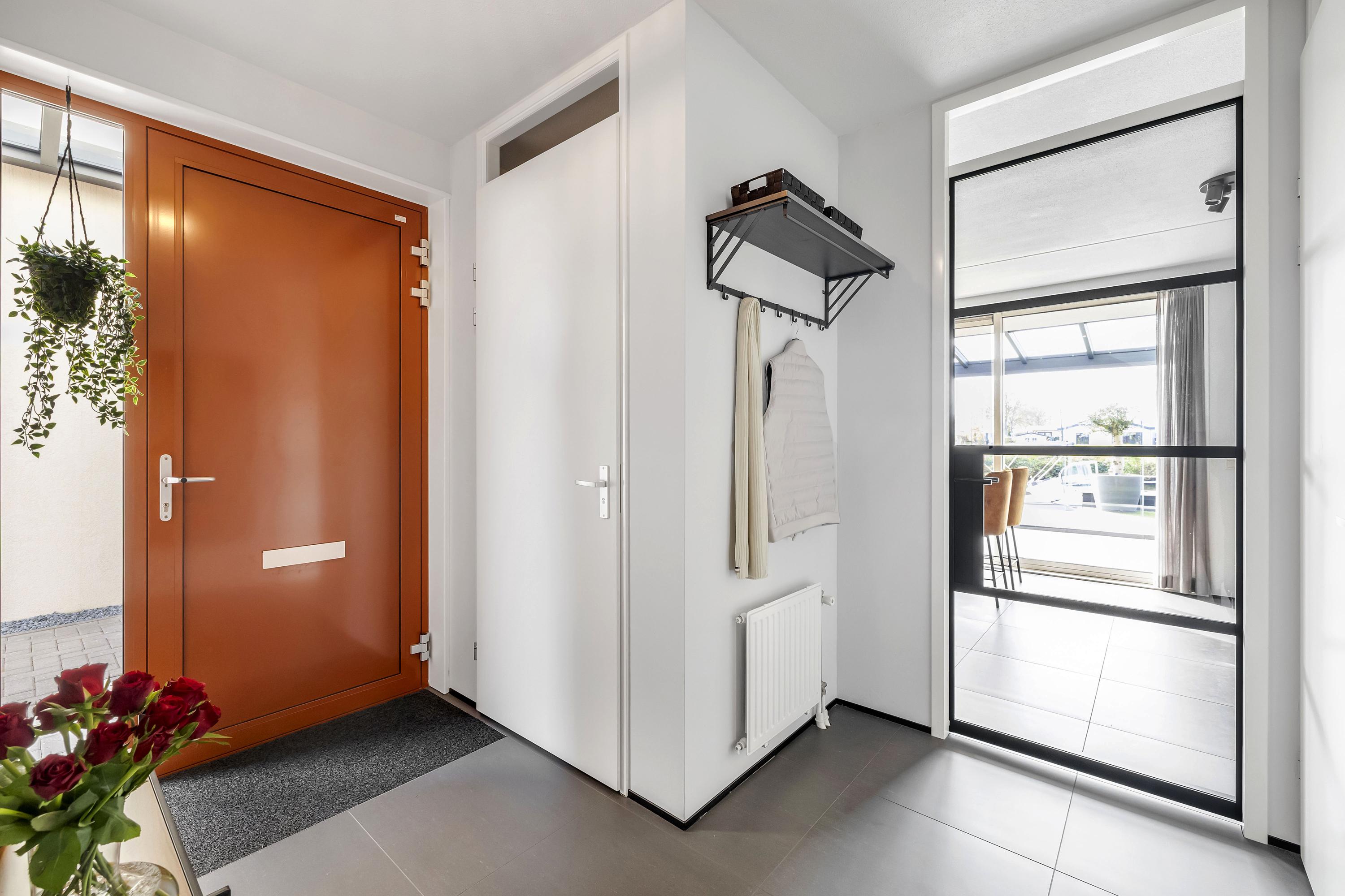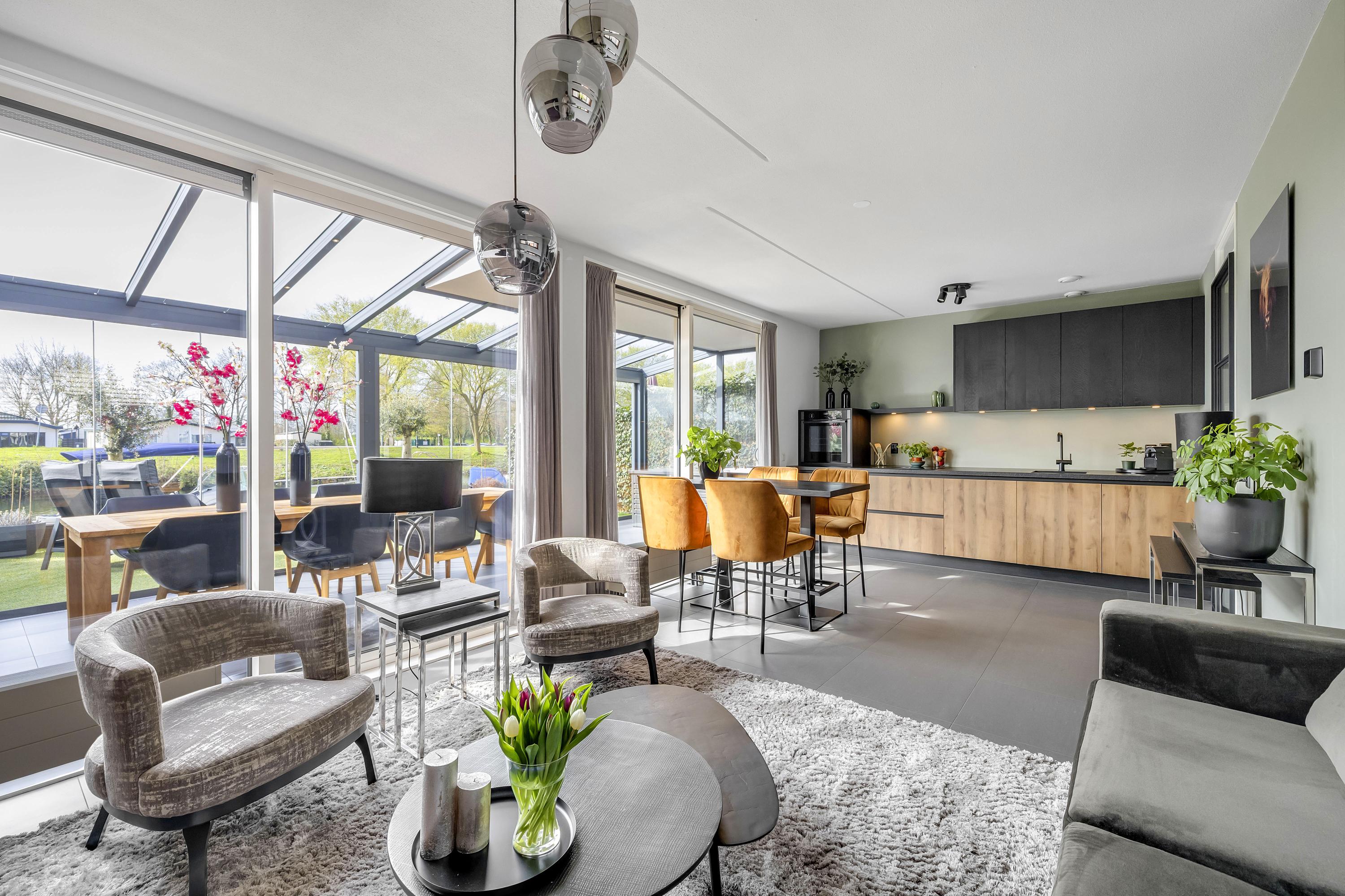 Aan de achterzijde bevindt zich een serre over de volledige breedte van de woning. Deze afsluitbare ruimte is voorzien van inbouwspots en kan worden verduisterd, waardoor je hier het hele jaar door comfortabel kunt zitten. Het aangrenzende zonneterras ligt op het zuiden, direct aan het water en beschikt over een eigen aanlegsteiger. Hier geniet je volop van de zon, het uitzicht en het buitenleven, met de mogelijkheid om zo het water op te varen. Het terras en de serre zijn uitgevoerd met een solide betonvloer onder de tegels.