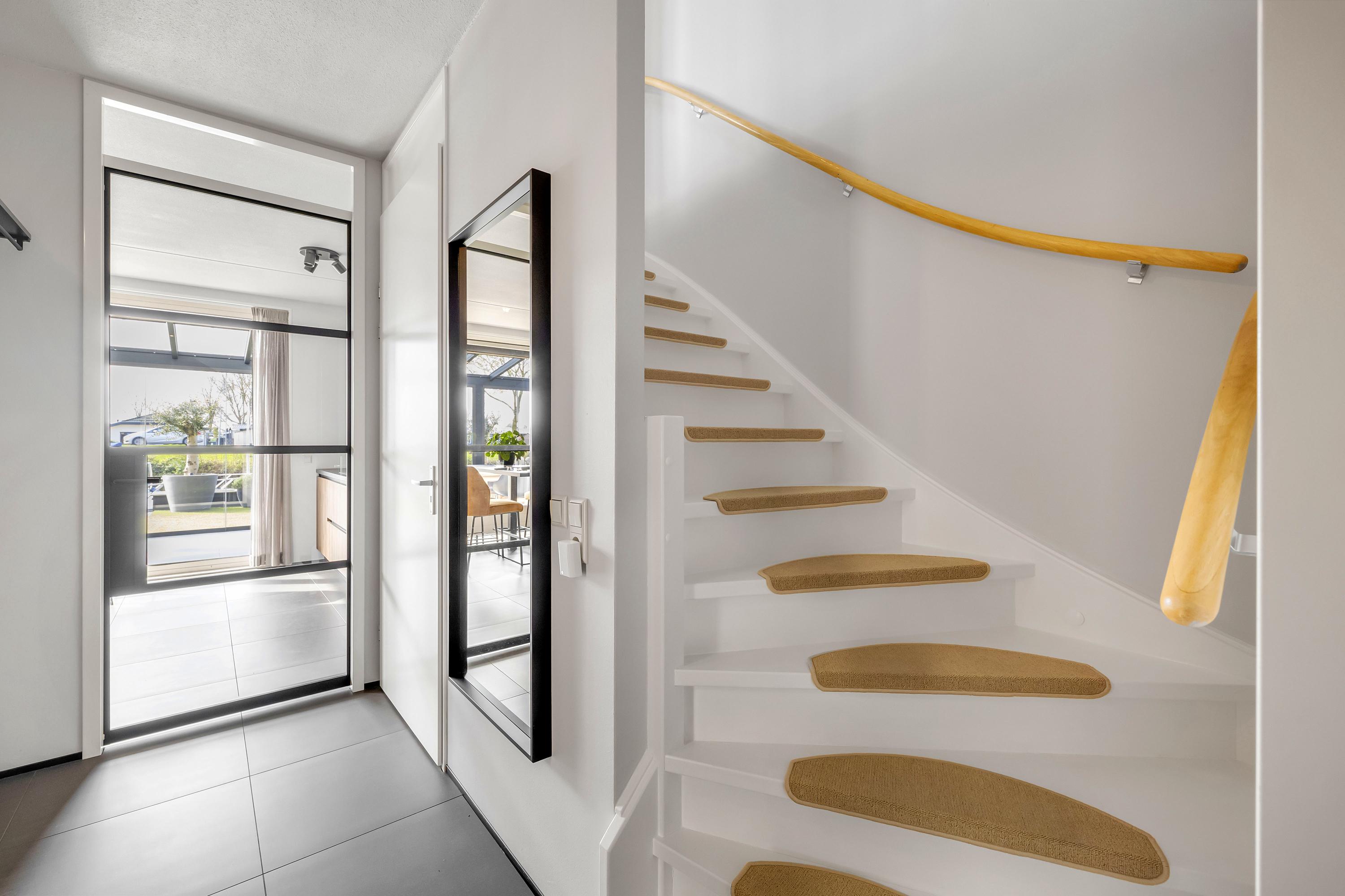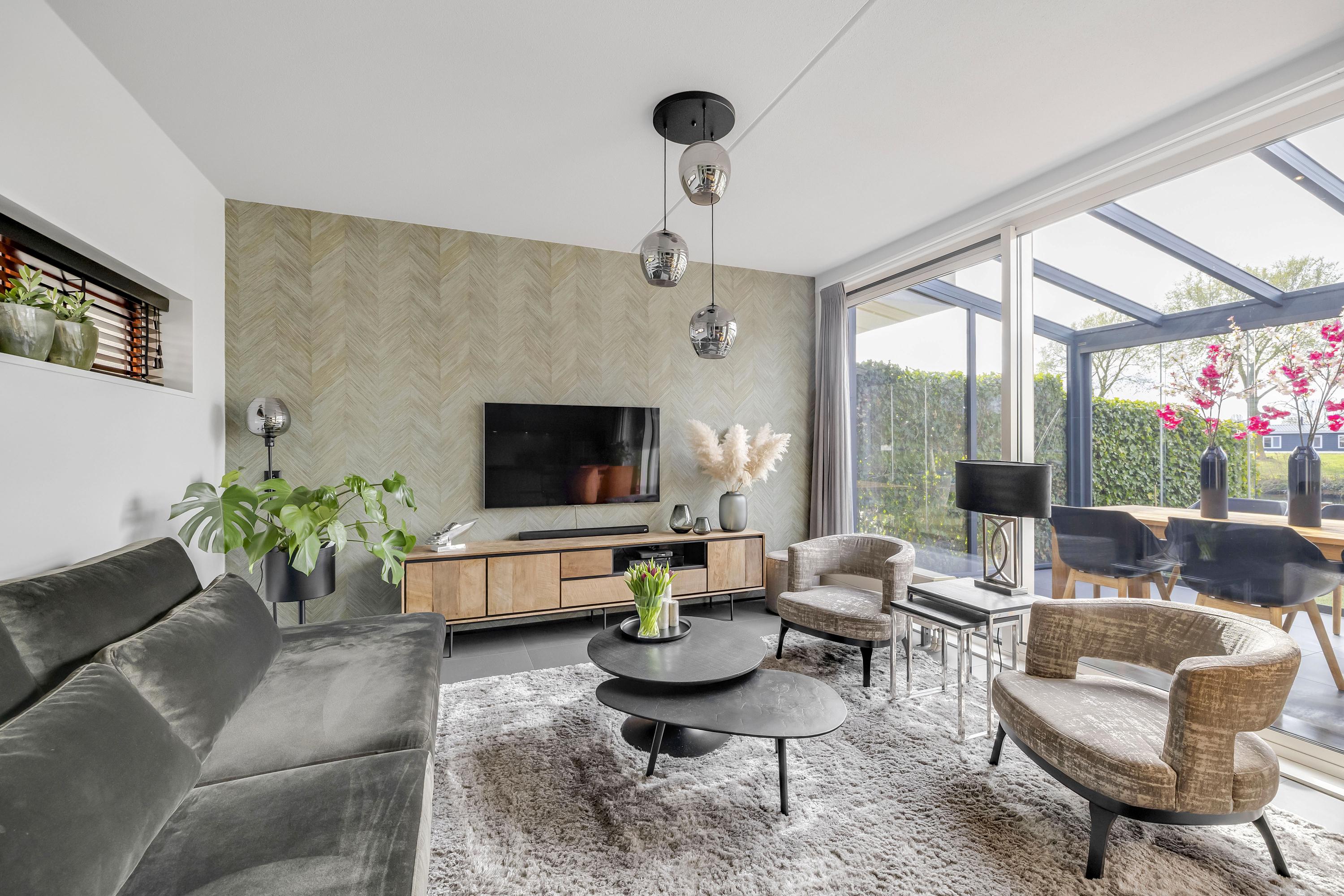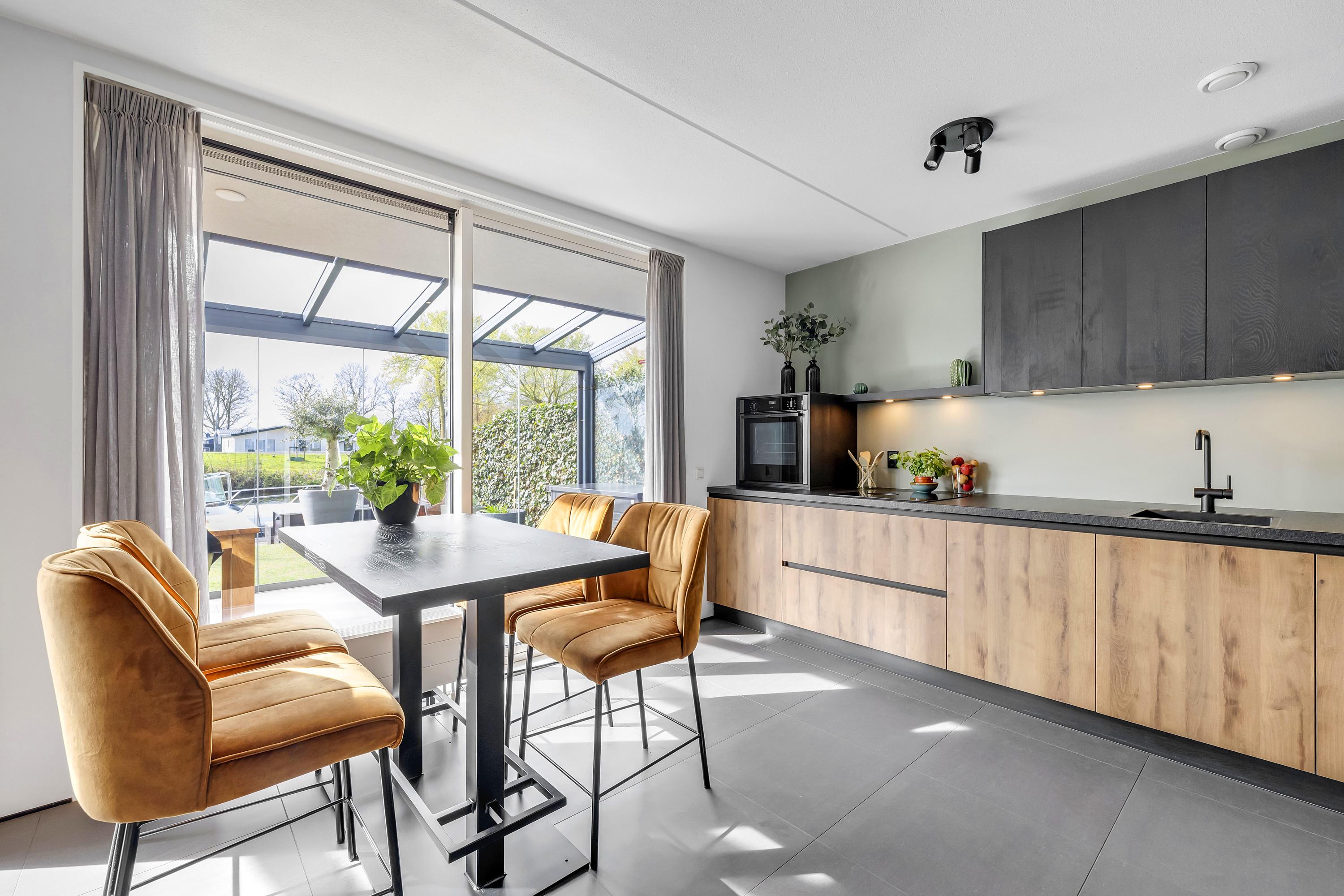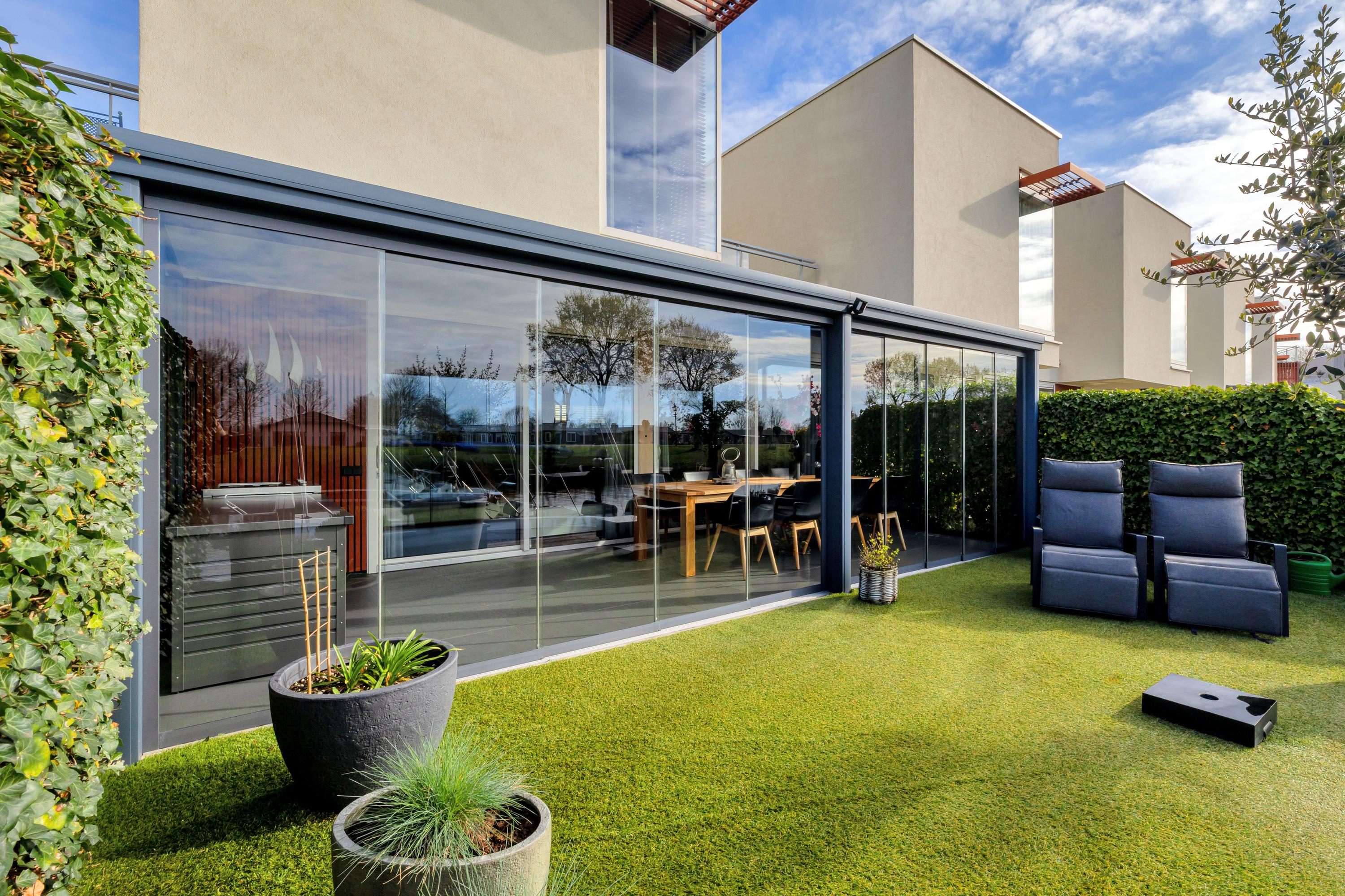 Aan de achterzijde bevindt zich een serre over de volledige breedte van de woning. Deze afsluitbare ruimte is voorzien van inbouwspots en kan worden verduisterd, waardoor je hier het hele jaar door comfortabel kunt zitten. Het aangrenzende zonneterras ligt op het zuiden, direct aan het water en beschikt over een eigen aanlegsteiger. Hier geniet je volop van de zon, het uitzicht en het buitenleven, met de mogelijkheid om zo het water op te varen. Het terras en de serre zijn uitgevoerd met een solide betonvloer onder de tegels.