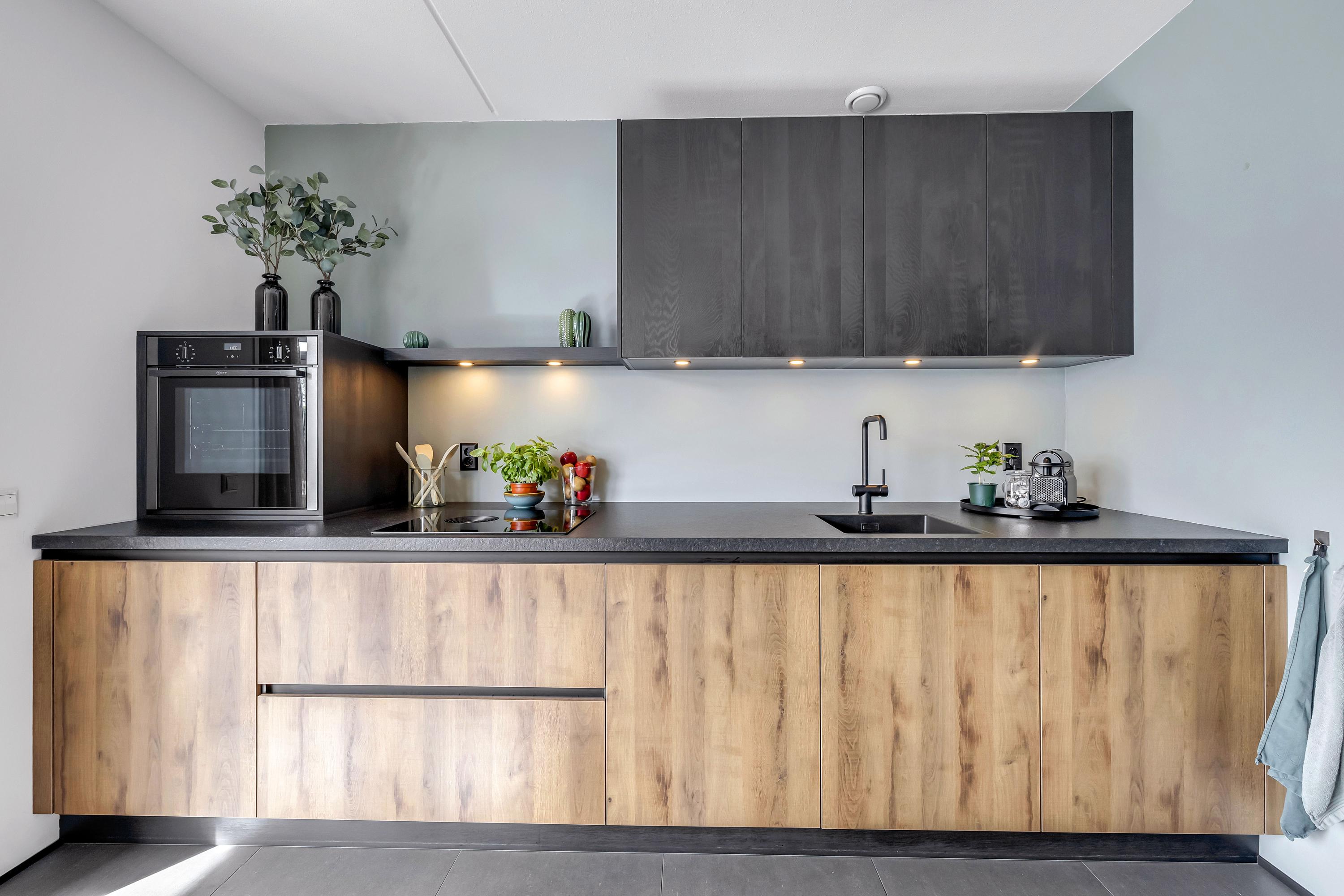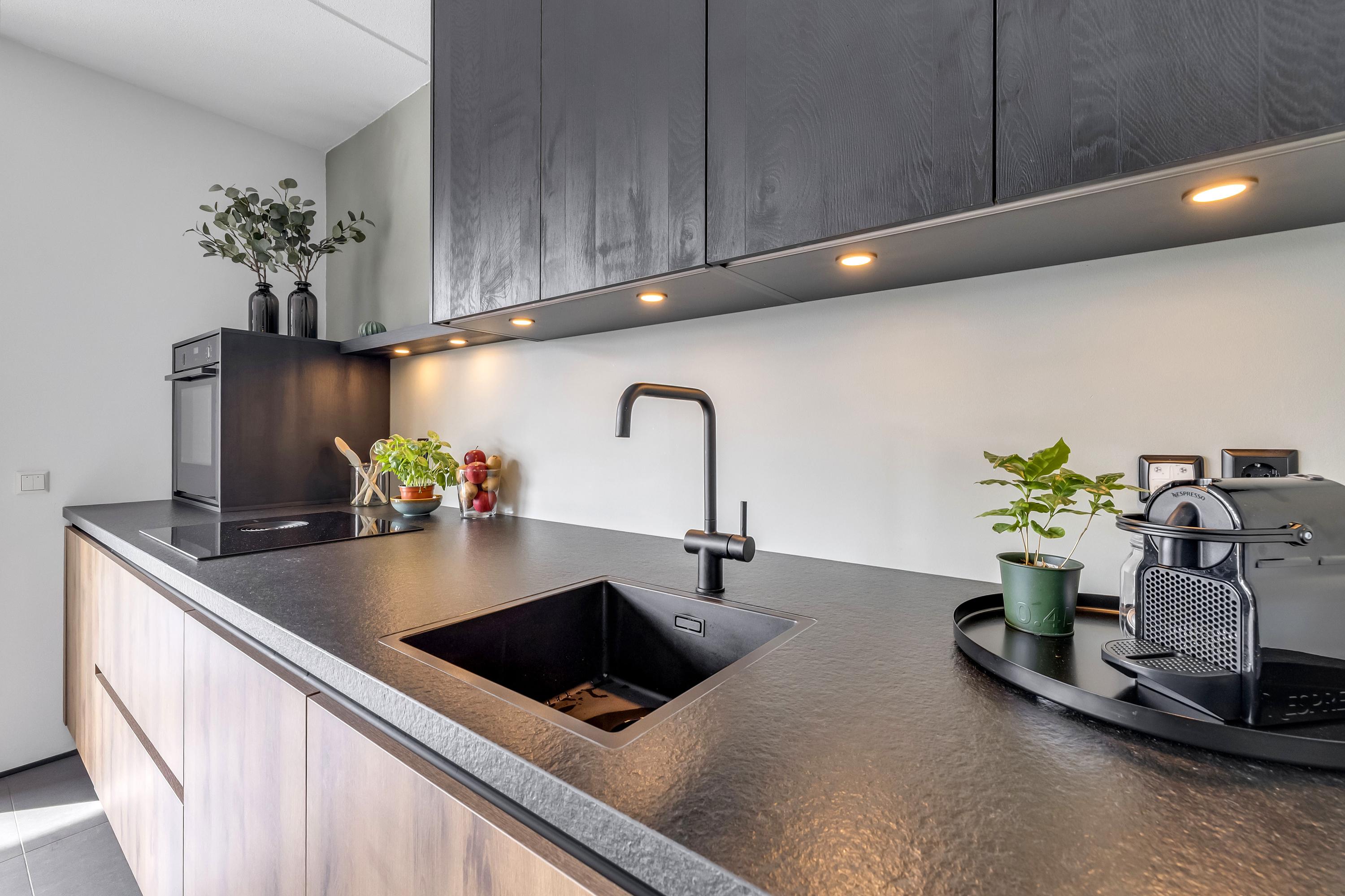 De moderne keuken, vernieuwd in 2024 en uitgevoerd in een strakke wandopstelling, is voorzien van een koelkast, oven, vaatwasser en een Bora inductiekookplaat met geïntegreerde afzuiging. De gehele begane grond is afgewerkt met een plavuizenvloer. Vanuit de hal bereik je tevens de berging/bijkeuken met vaste kastenwand, de opstelling van de cv-combiketel (Intergas, 2011), mechinische-ventilatieunit (2022), waterontharder en de aansluitingen voor de wasmachine en droger. Vanuit deze ruimte is er ook een deur naar buitne die uitkomt aan de voorzijde van de woning.