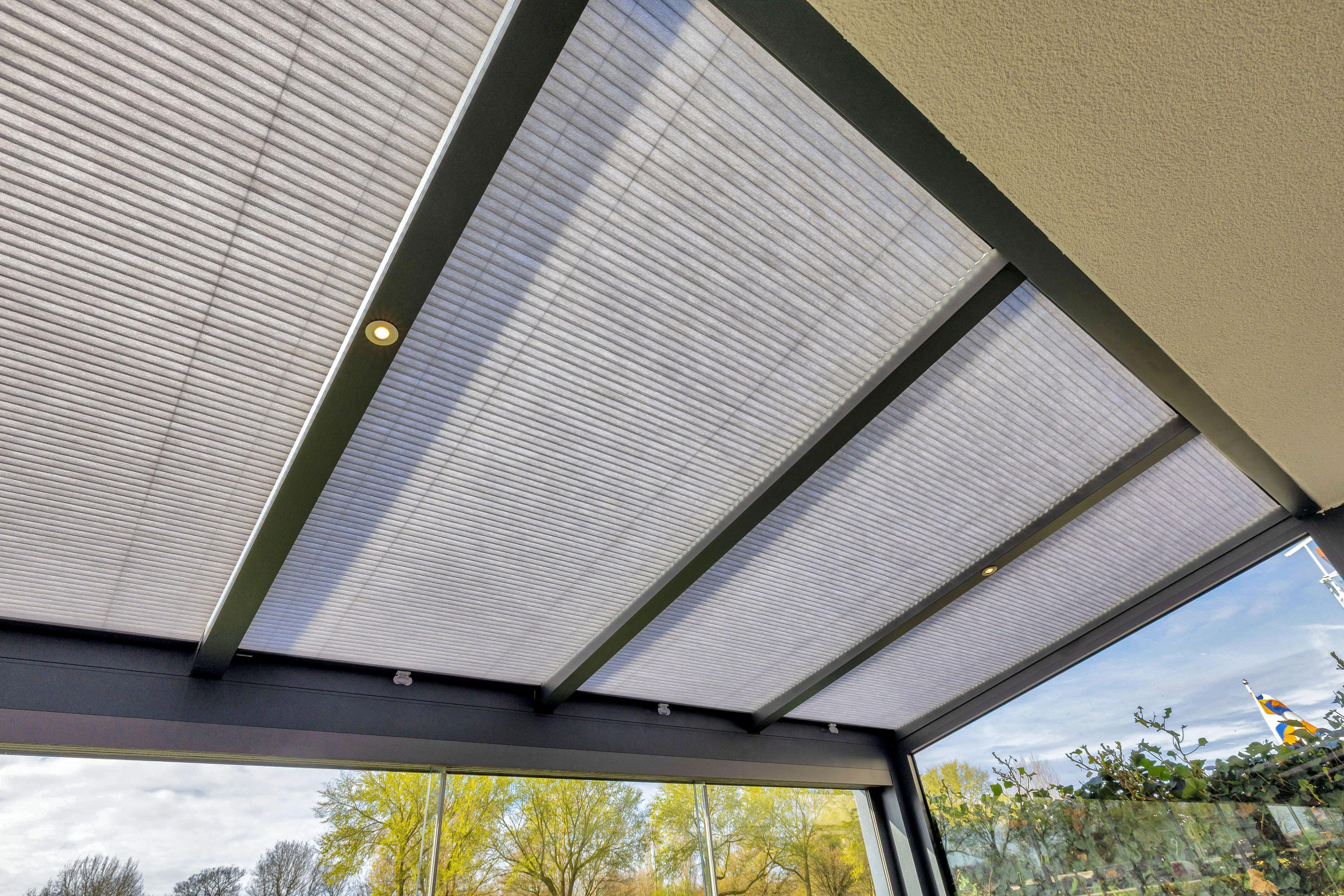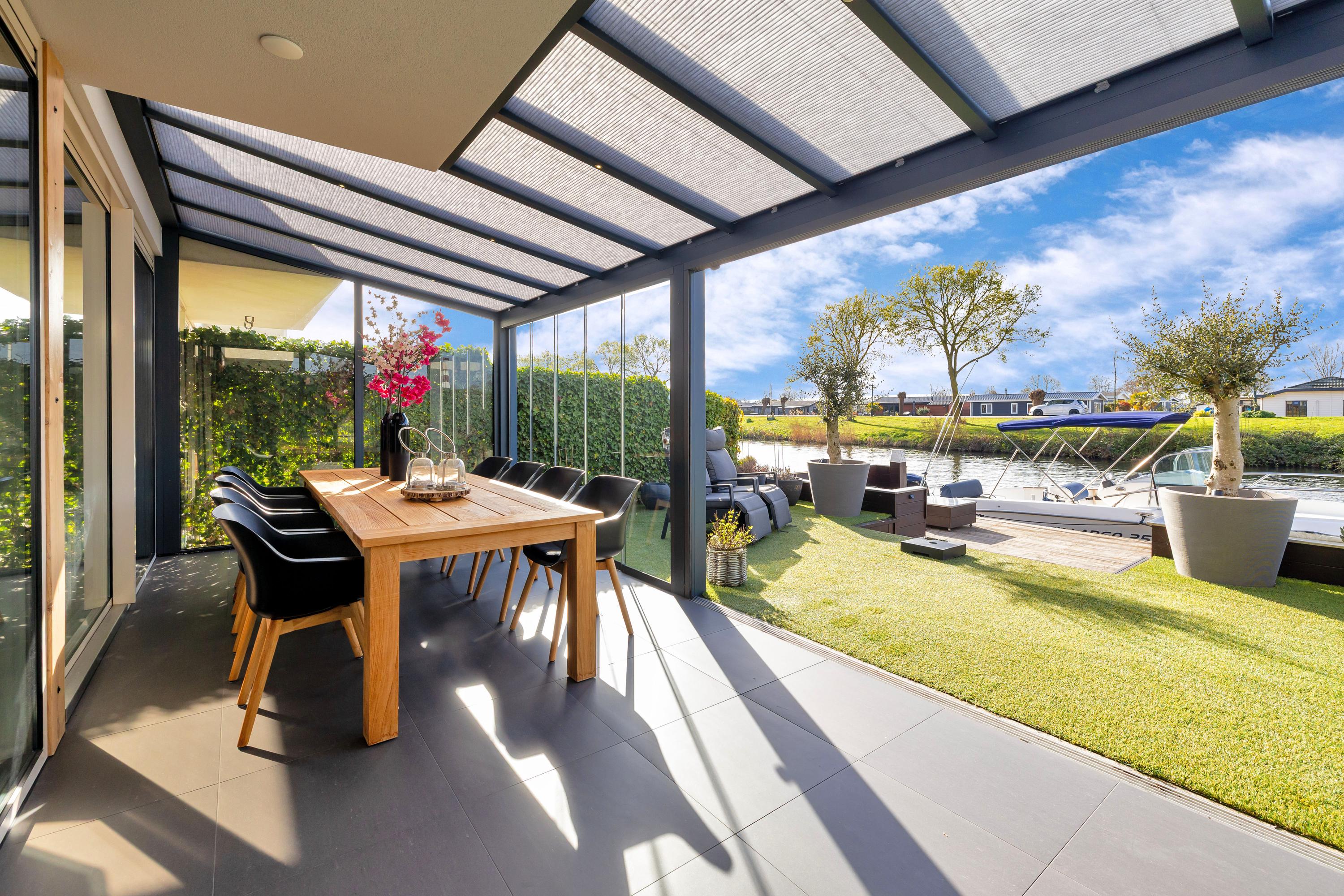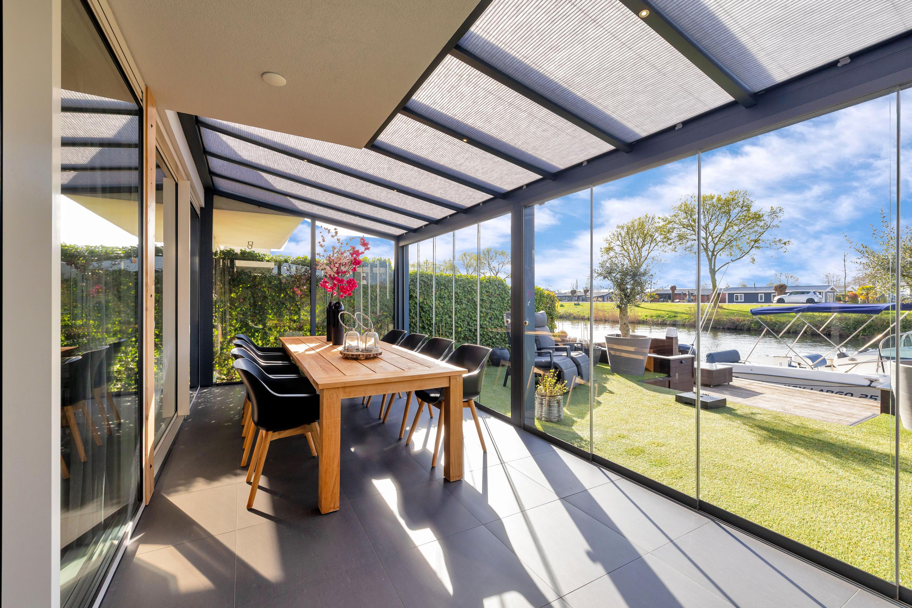 - Luxe serre over de hele breedte van het zonneterras met verlichting en verduistering.