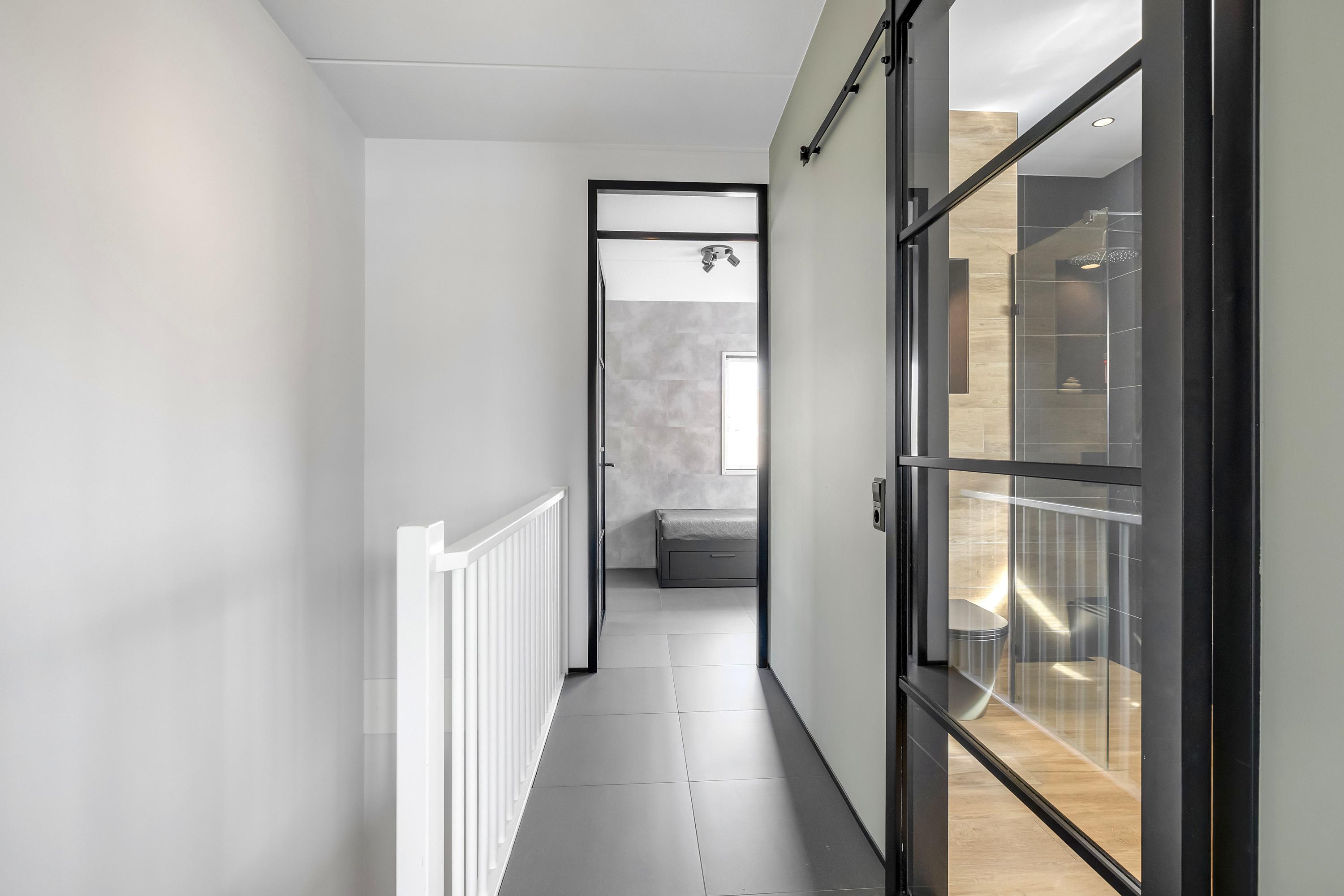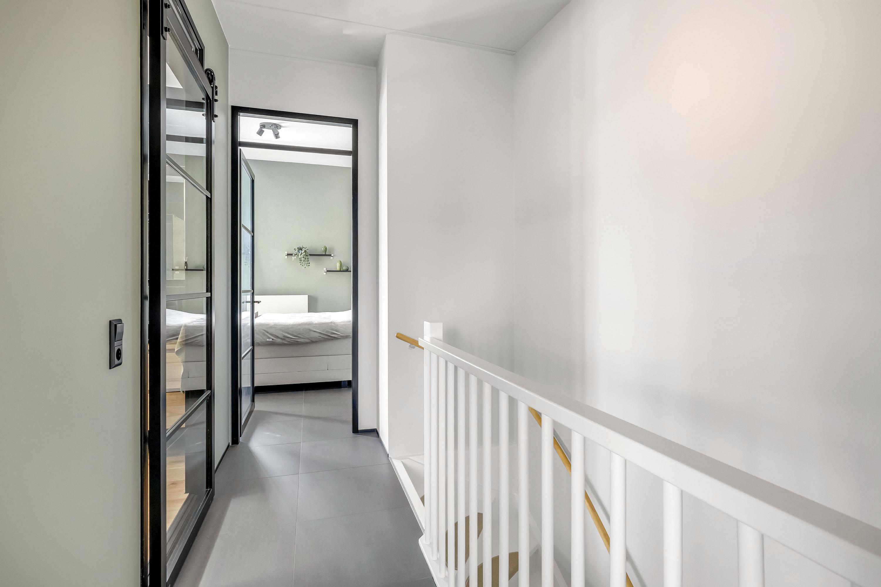 De overloop geeft toegang tot 2 ruime slaapkamers en de luxe badkamer. De royale hoofdslaapkamer aan de achterzijde biedt een prachtig uitzicht over de haven en is voorzien van een vaste kast en airconditioning (2024) en heeft toegang tot het dakterras. De 2e slaapkamer ligt aan de voorzijde van de woning. De moderne badkamer (2022) is voorzien van een inloopdouche, ligbad, wastafelmeubel, designradiator en een hangend closet. Ook deze verdieping is afgewerkt met een nette plavuizenvloer.