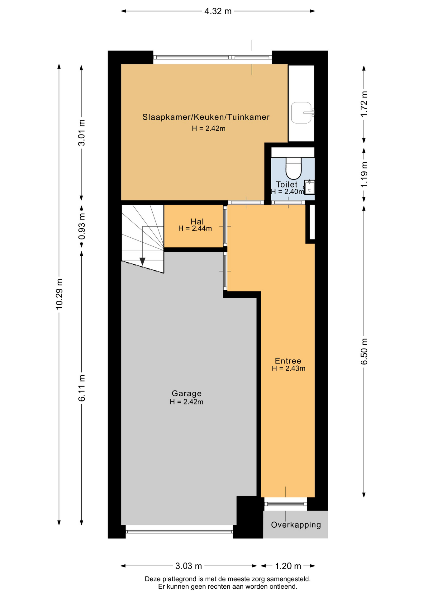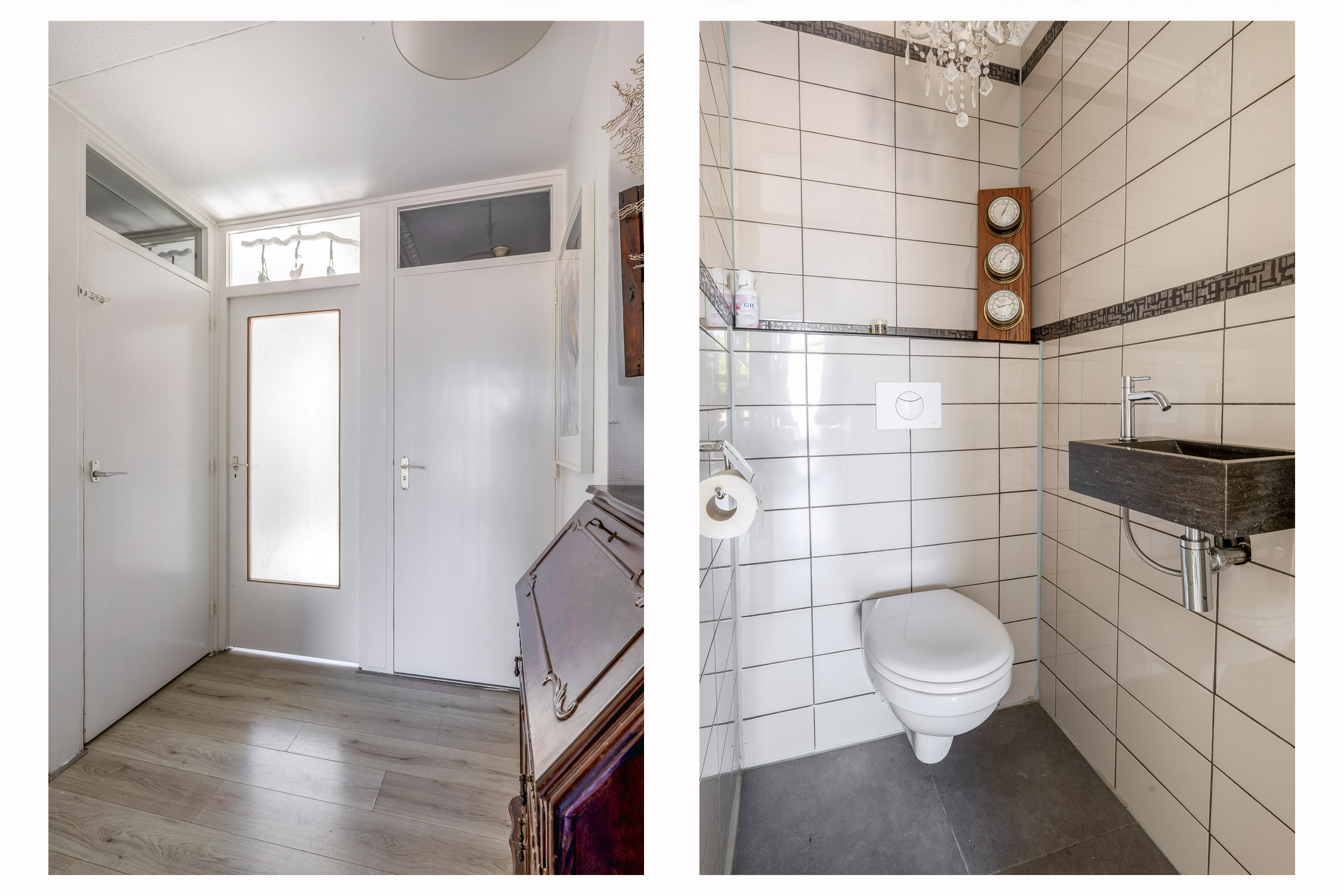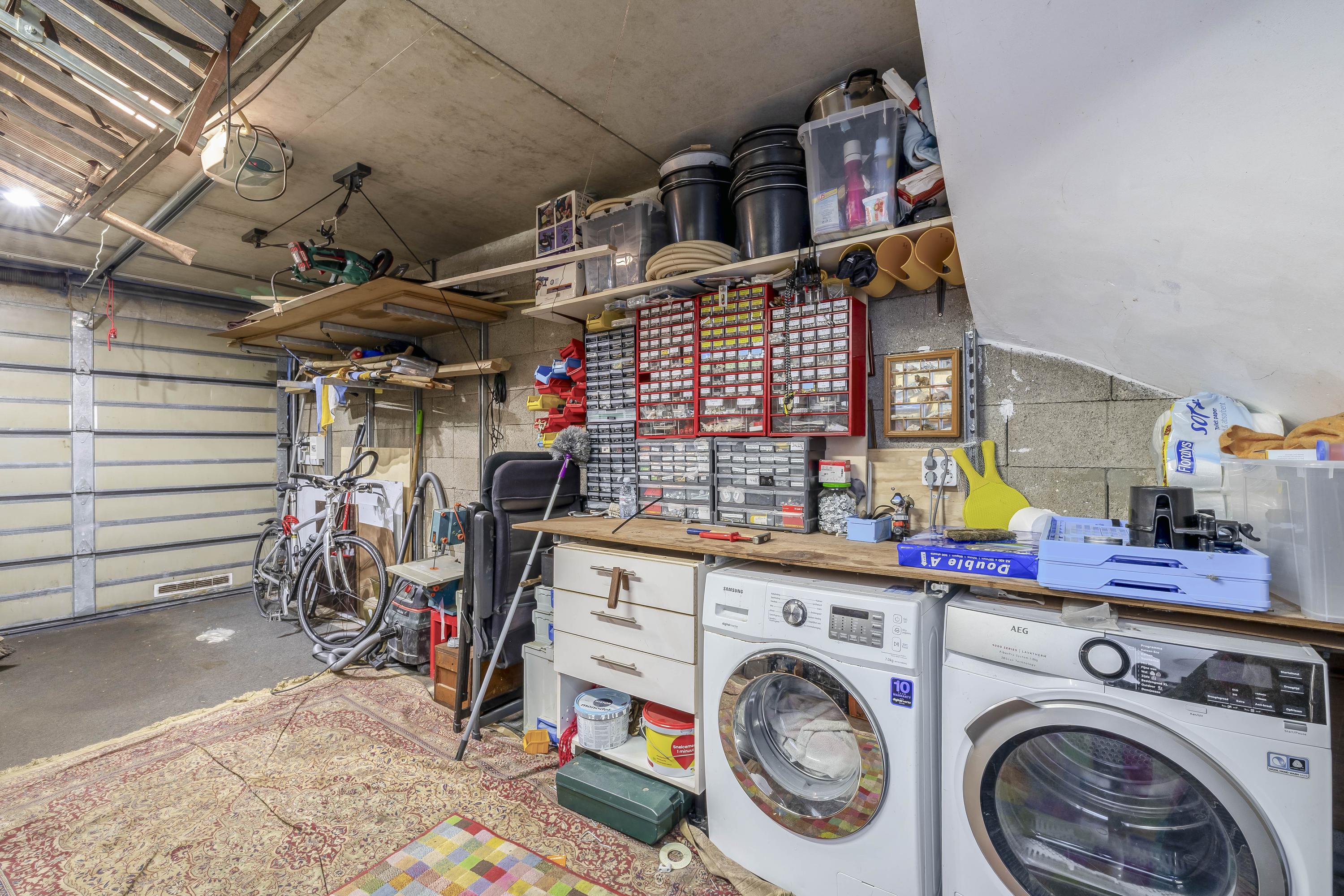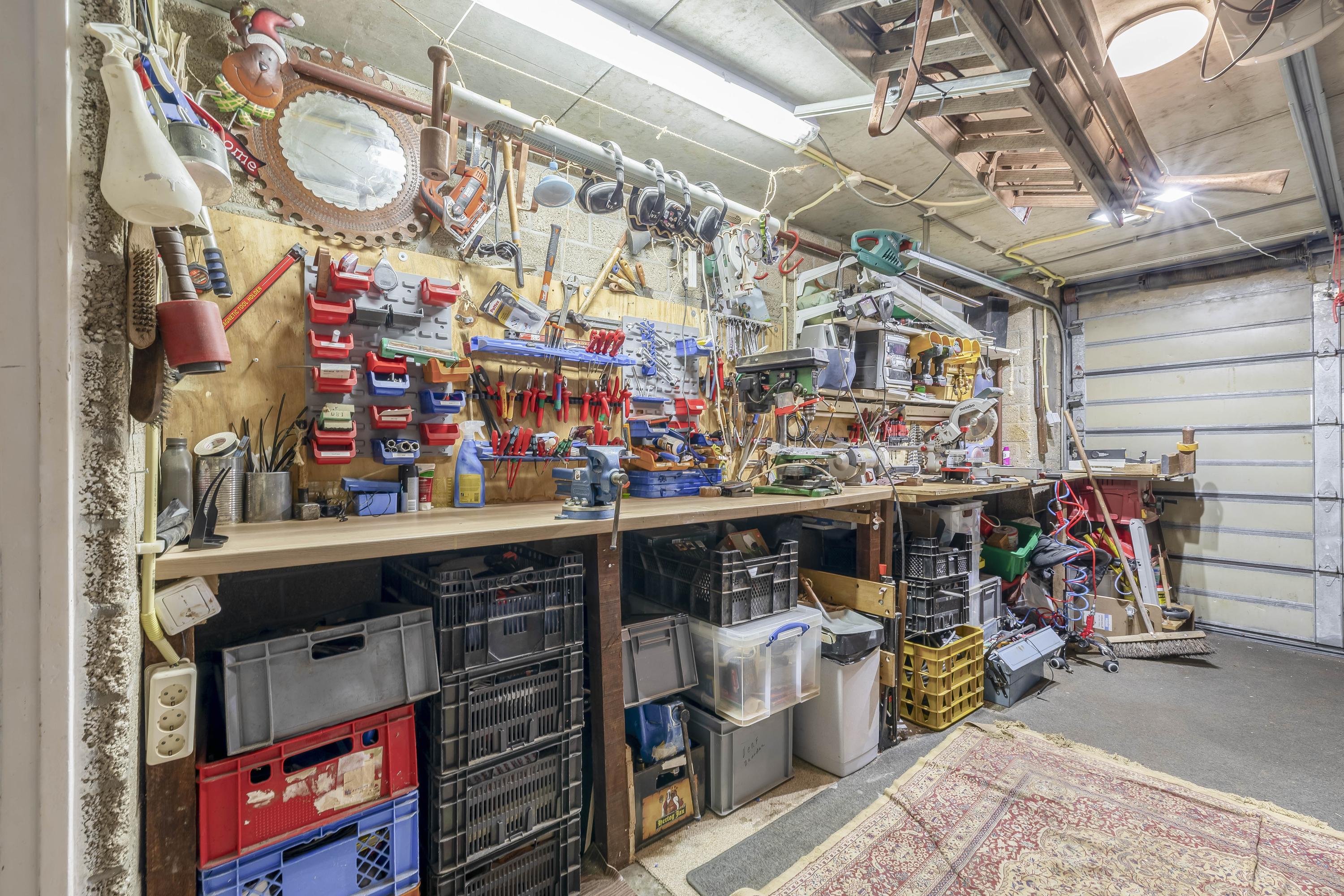 Via de voortuin met eigen oprit stap je de hal binnen via de voordeur. In de hal vind je aan het einde een toilet met fonteintje en direct daarnaast is de tuinkamer te vinden. Deze ruimte is voorzien van een praktisch keukenblok met koelkast, wasbak en boiler. Vanuit de tuinkamer is een deur met toegang tot de achtertuin Vanuit de hal is ook de inpandige garage bereikbaar. Deze ruime garage, voorzien van elektra, water en een elektrische sectionaaldeur, biedt volop mogelijkheden. Aan beide zijden zijn handige werkbanken geplaatst en de aansluitingen voor de wasmachine en droger bevinden zich hier eveneens.