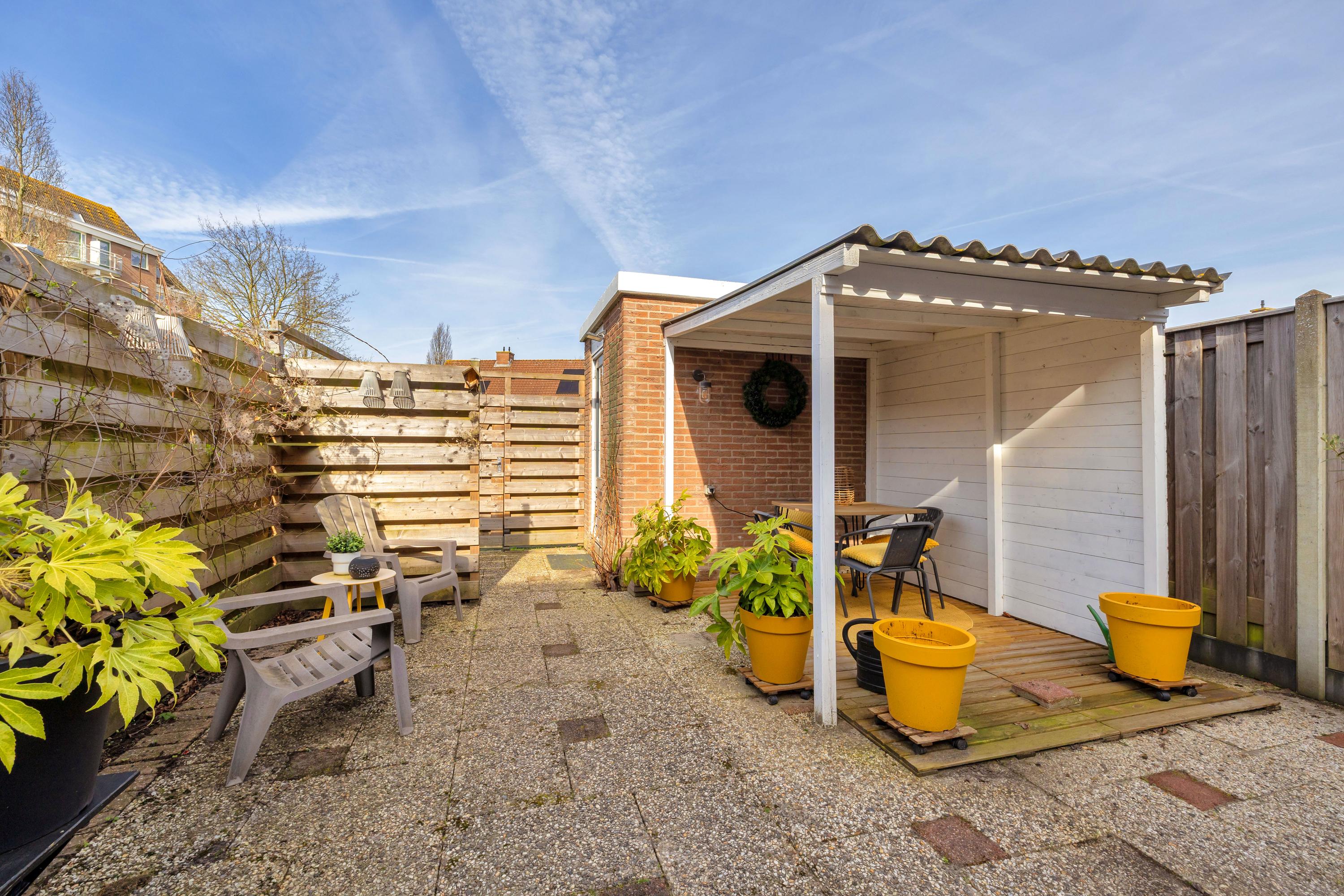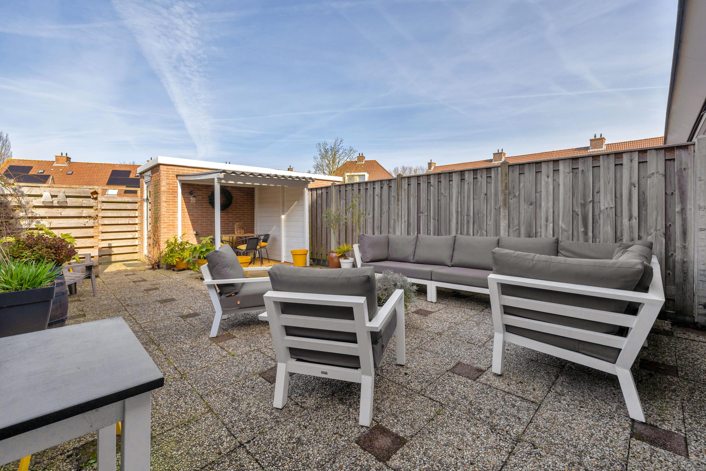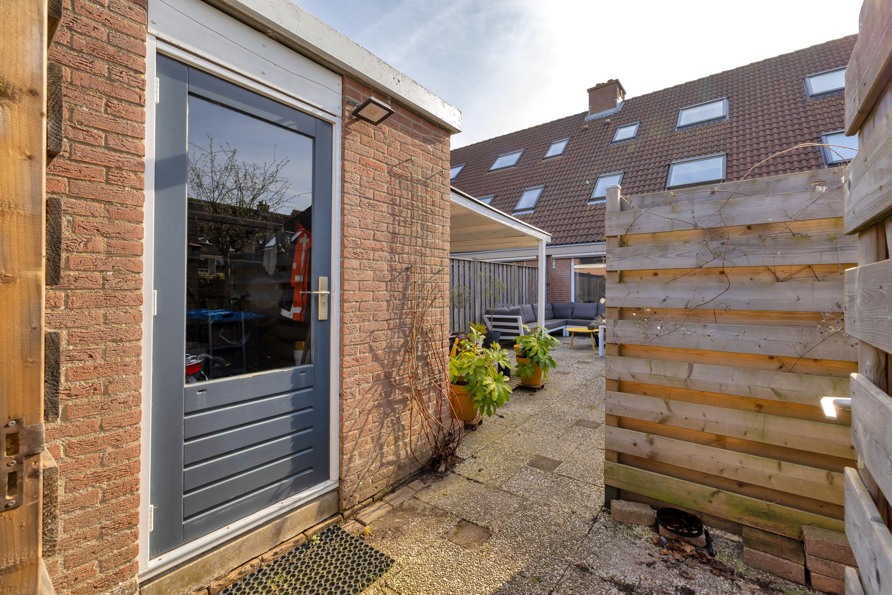 Aan de voorzijde is een ruime oprit met plek voor twee auto’s en er is een buitenkraan. De achtertuin ligt op het noordwesten en is voorzien van verlichting, een buitenkraan, een zonnescherm en is omheind met houten schuttingen. Achterin staat een stenen berging met overkapping en is voorzien elektra. Via de praktische achterom heb je toegang tot het achterliggende pad, direct naast een leuk speeltuintje, wat ideaal is voor gezinnen.